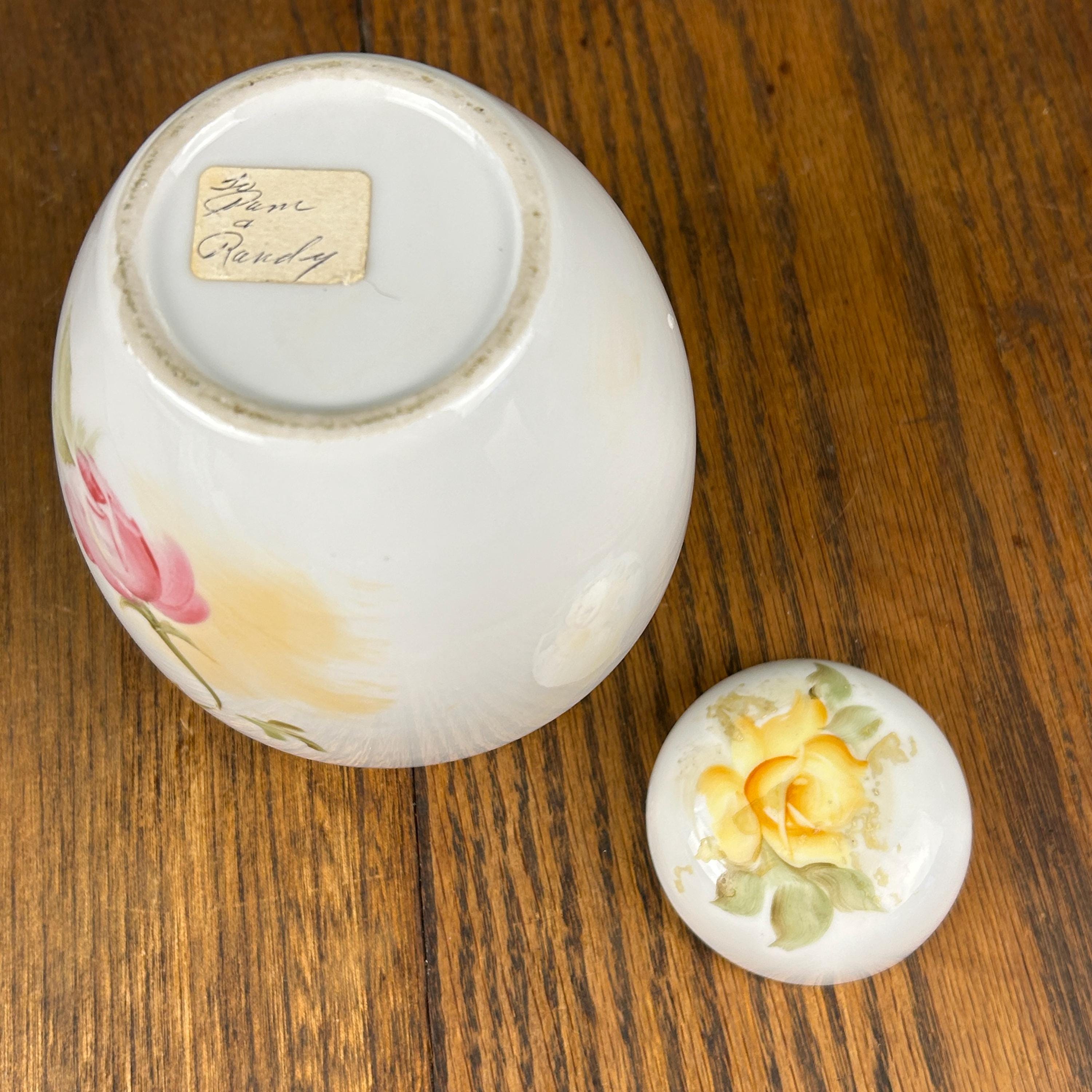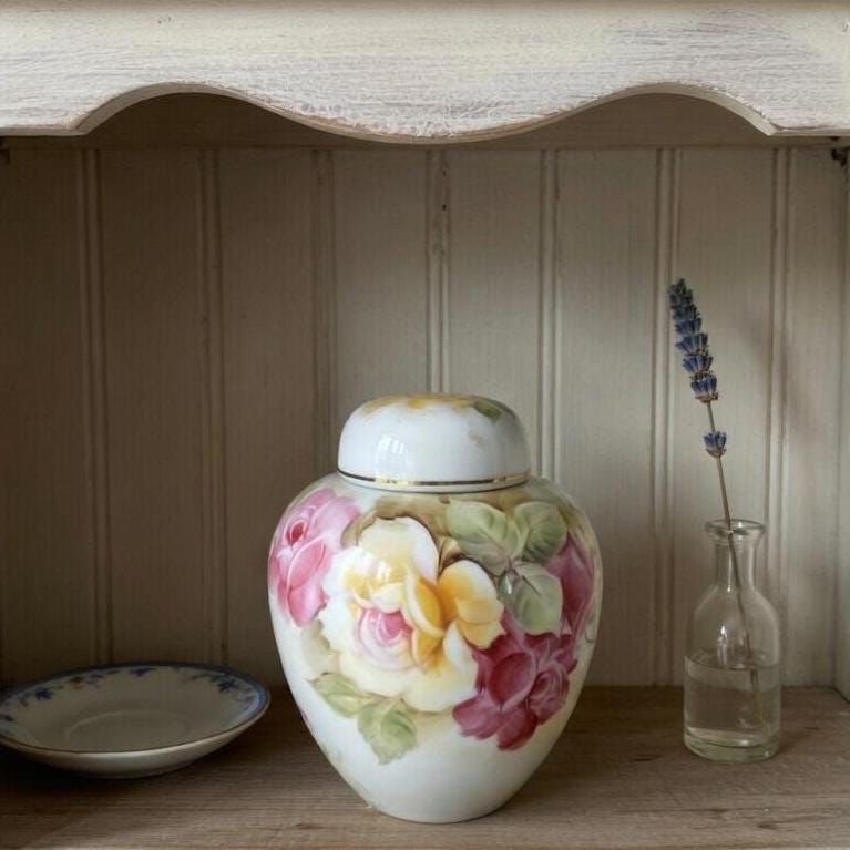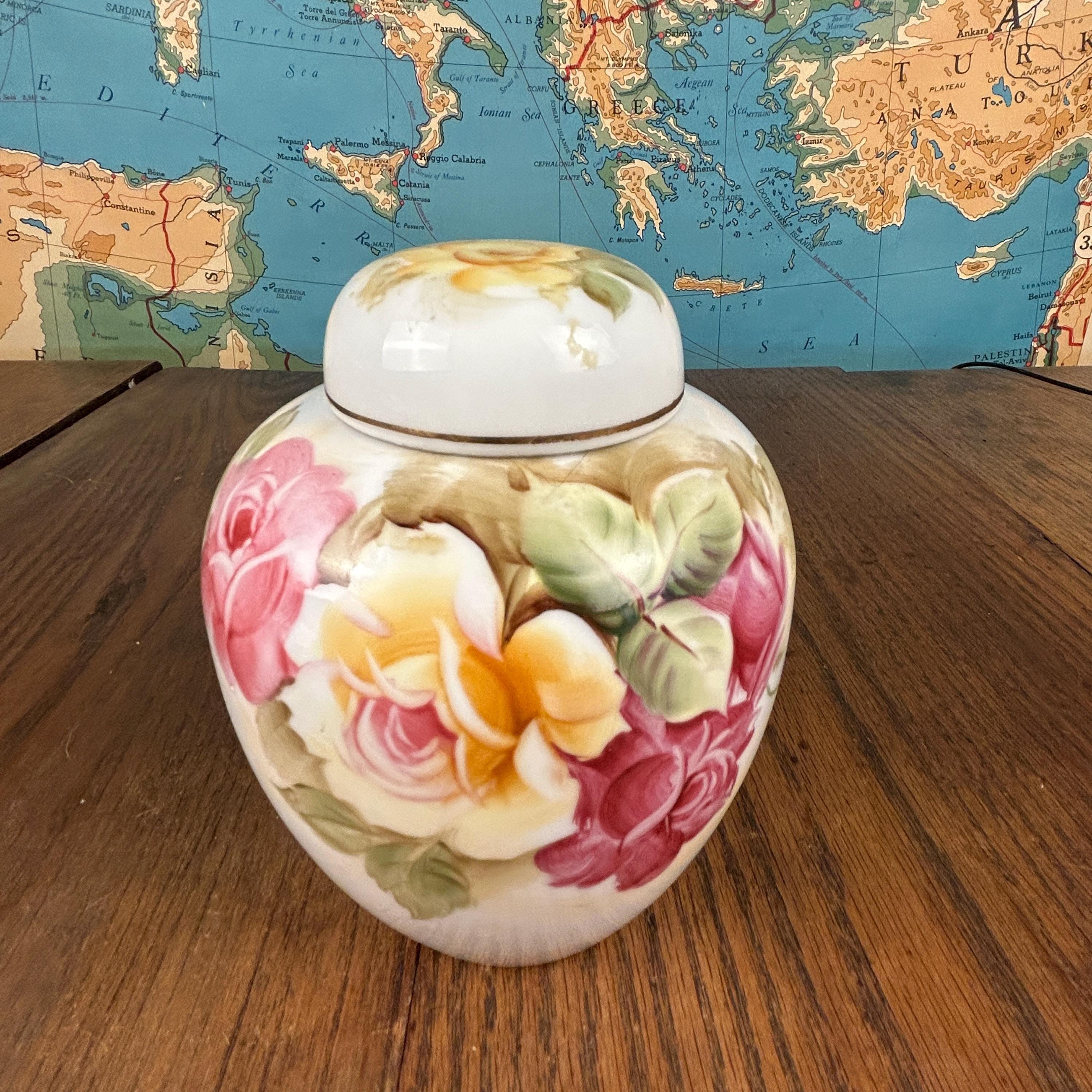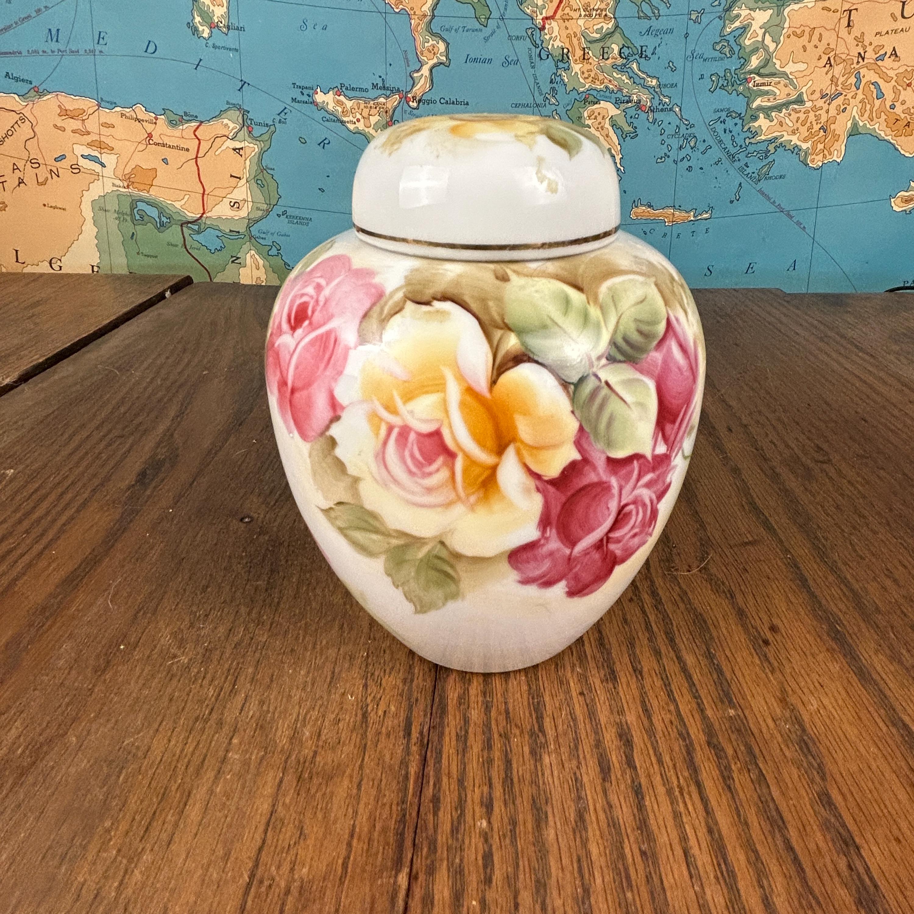 This beautiful vintage floral ginger jar / dresser jar features delicate hand-painted pastel roses in a soft romantic palette. With its classic shape and elegant floral design, this piece reflects the charming decorative style often associated with makers such as Andrea by Sadek, Norcrest, and similar mid-century porcelain producers.
