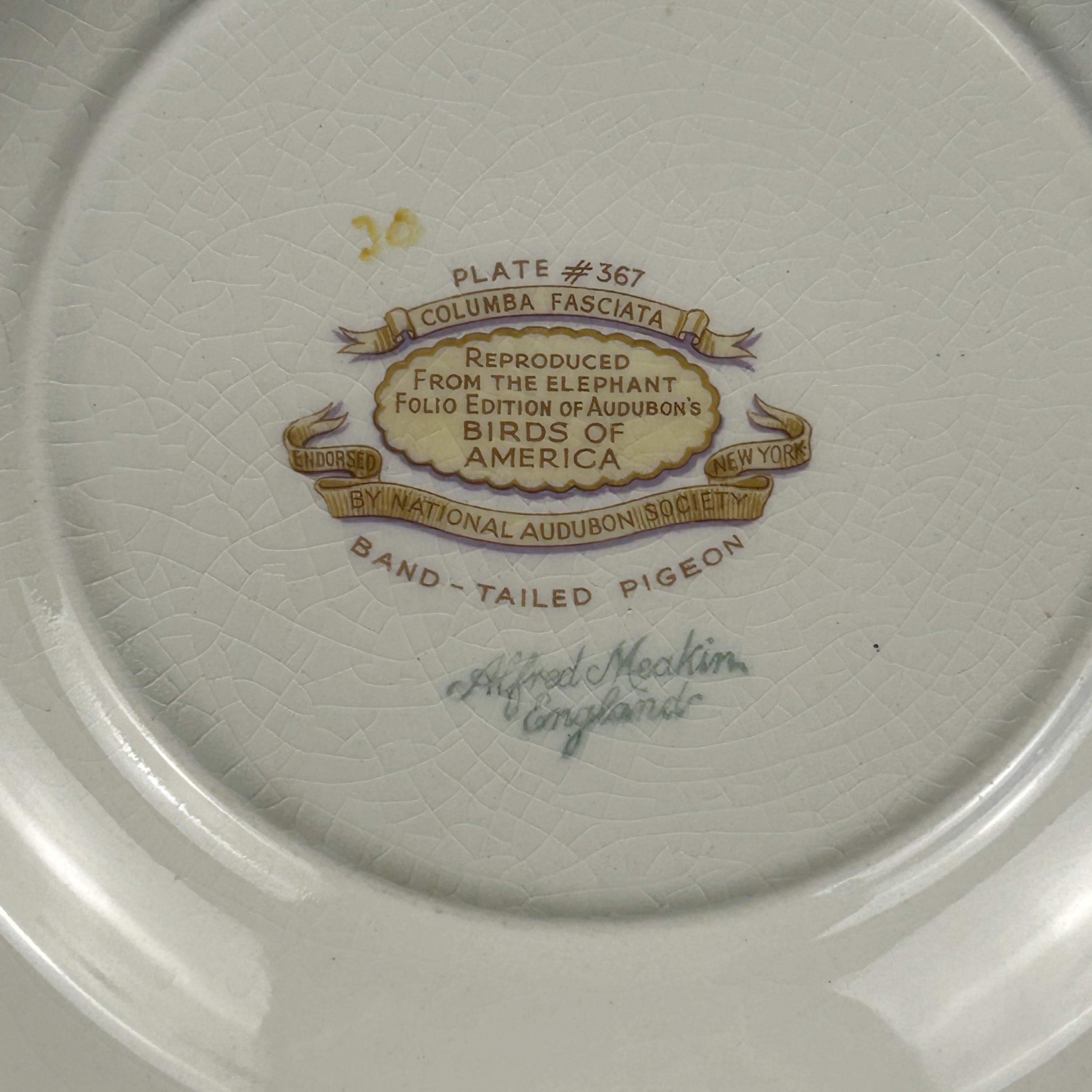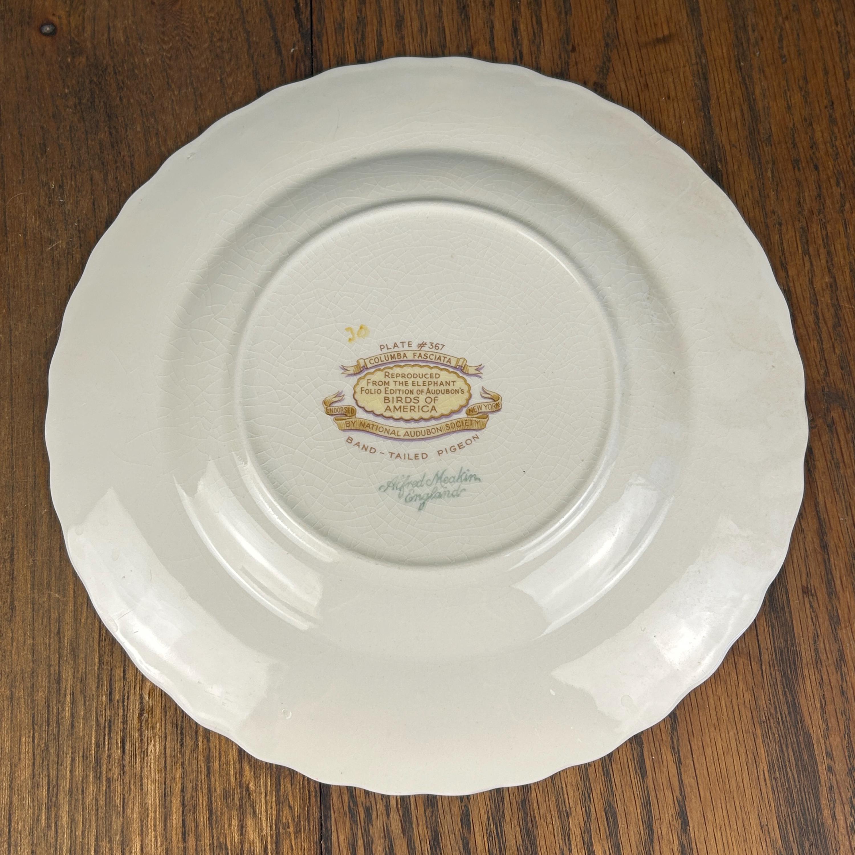 This beautiful vintage Alfred Meakin “Birds of America” plate features the Band Tailed Pigeon, identified as plate #367, and is based on the iconic bird illustrations from John James Audubon’s The Birds of America.