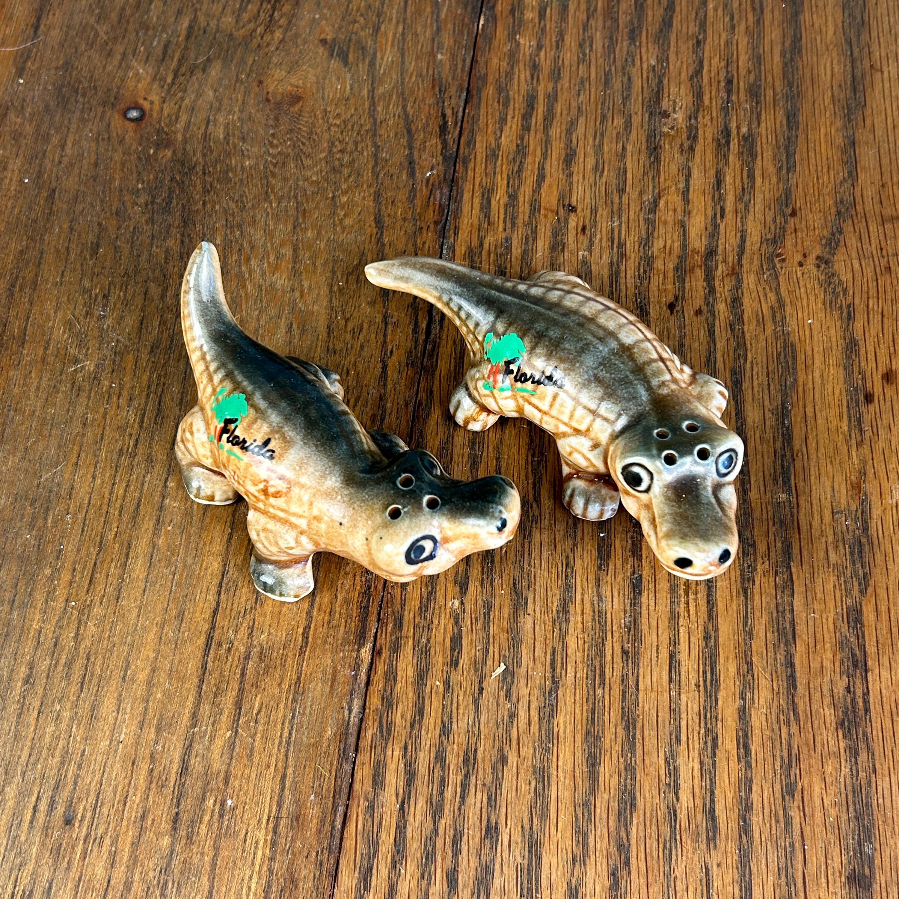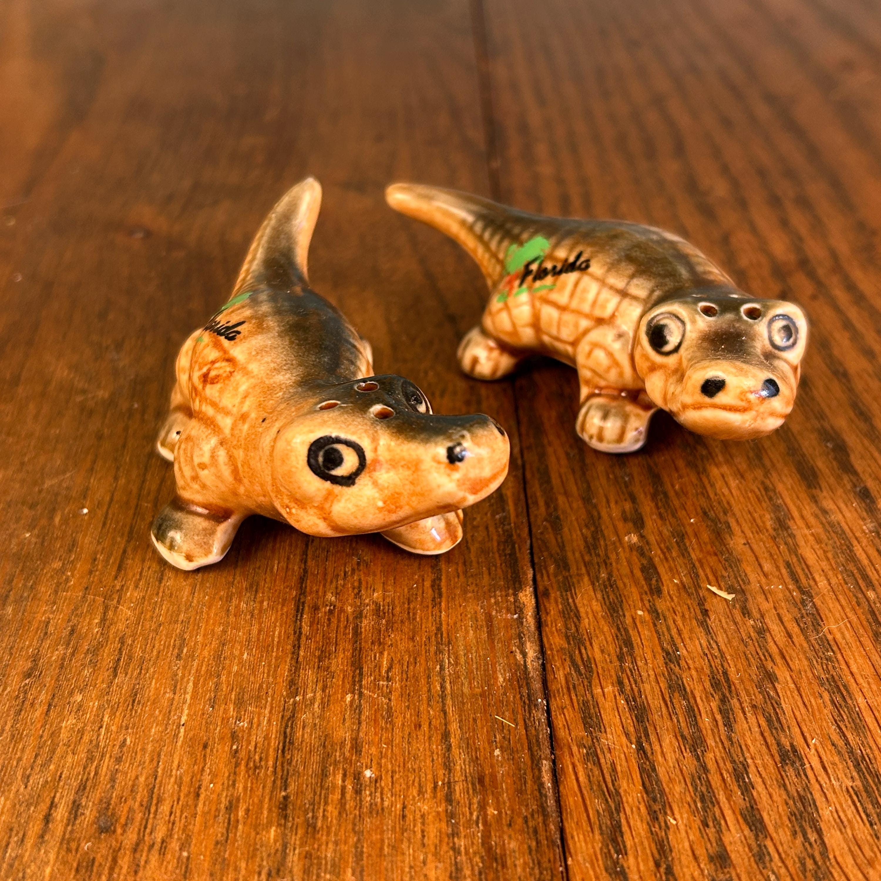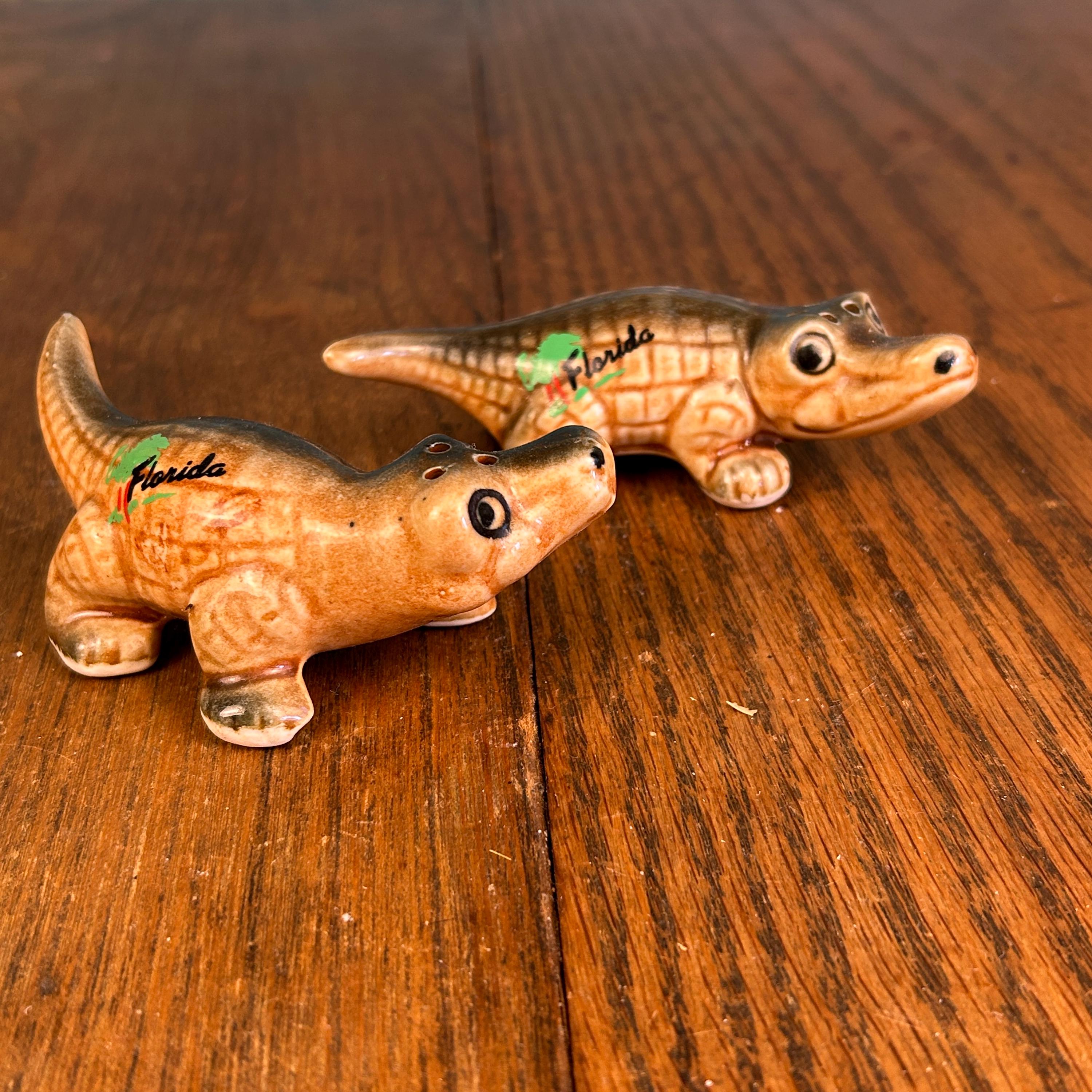 Each shaker is shaped like a small alligator and features hand-painted details, giving the pair a charming and playful character. These souvenir pieces were popular travel keepsakes and are now sought after by collectors of vintage novelty kitchenware and mid-century souvenirs.
