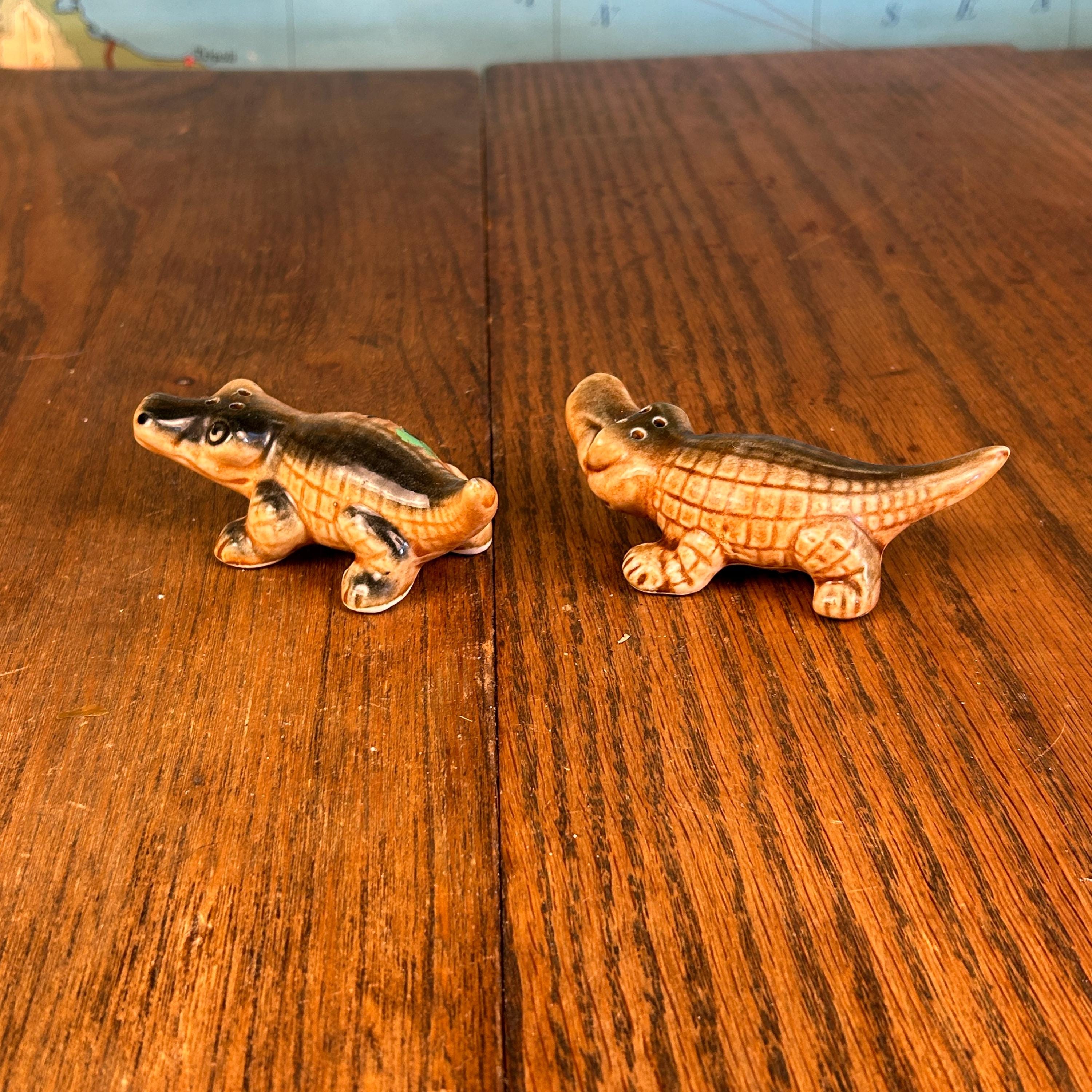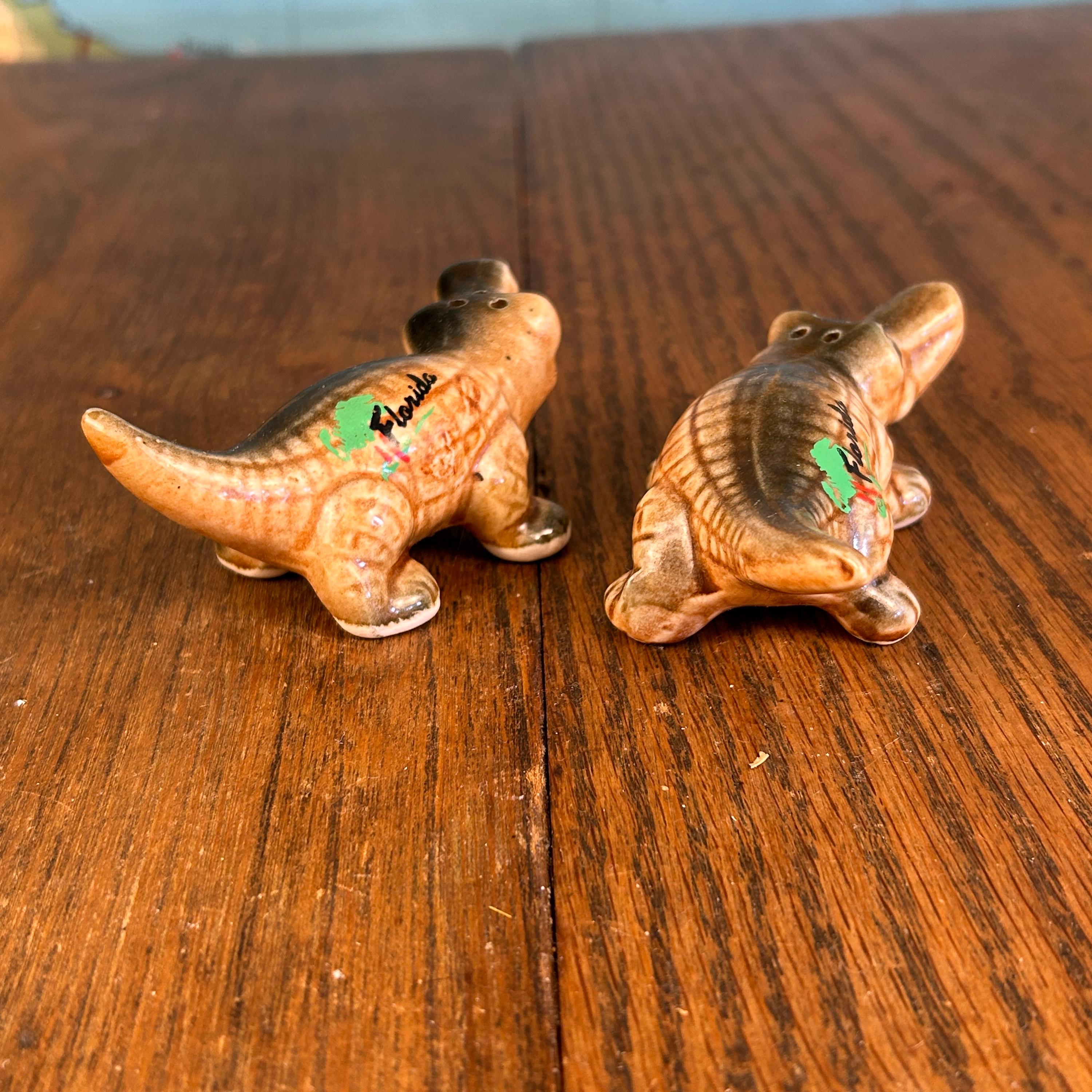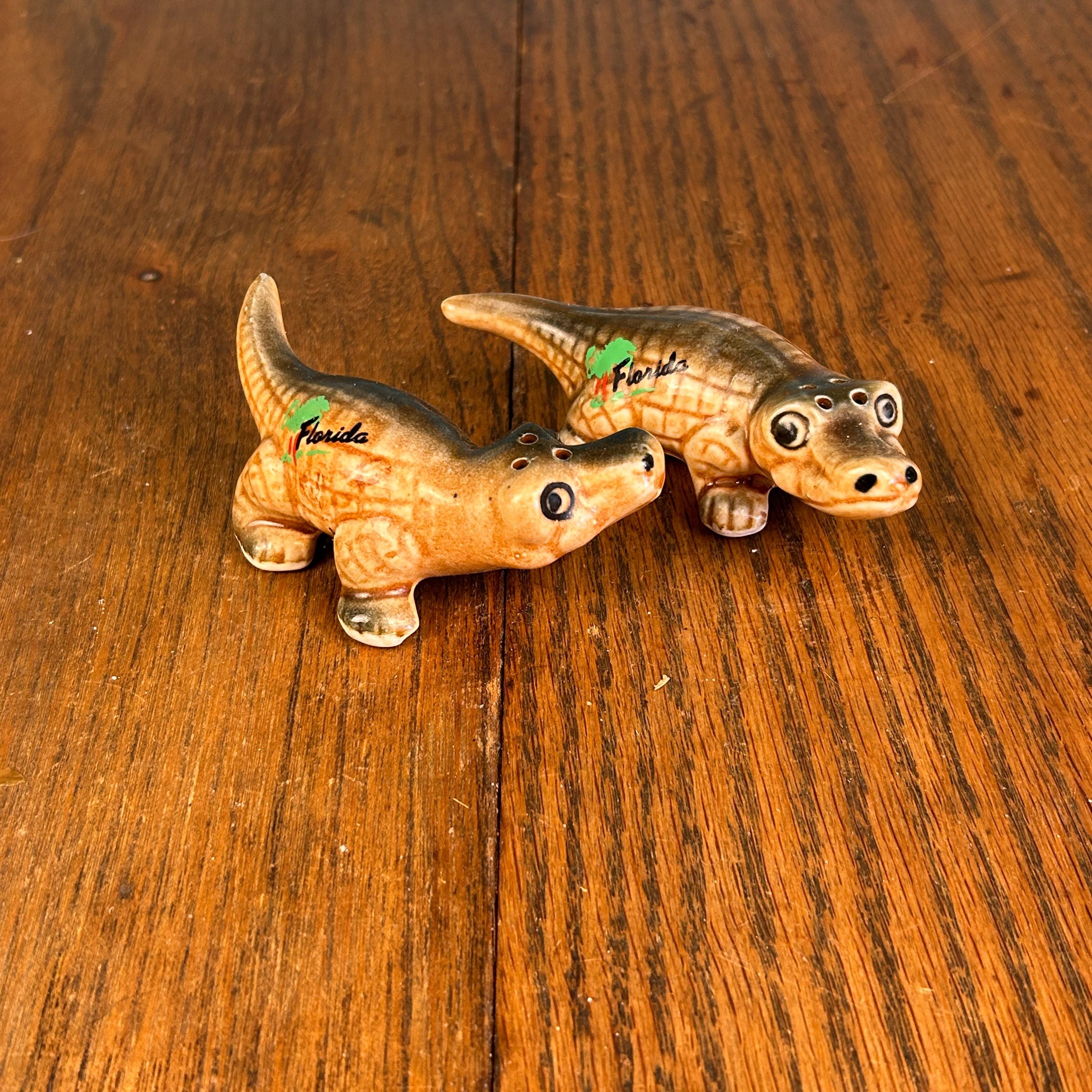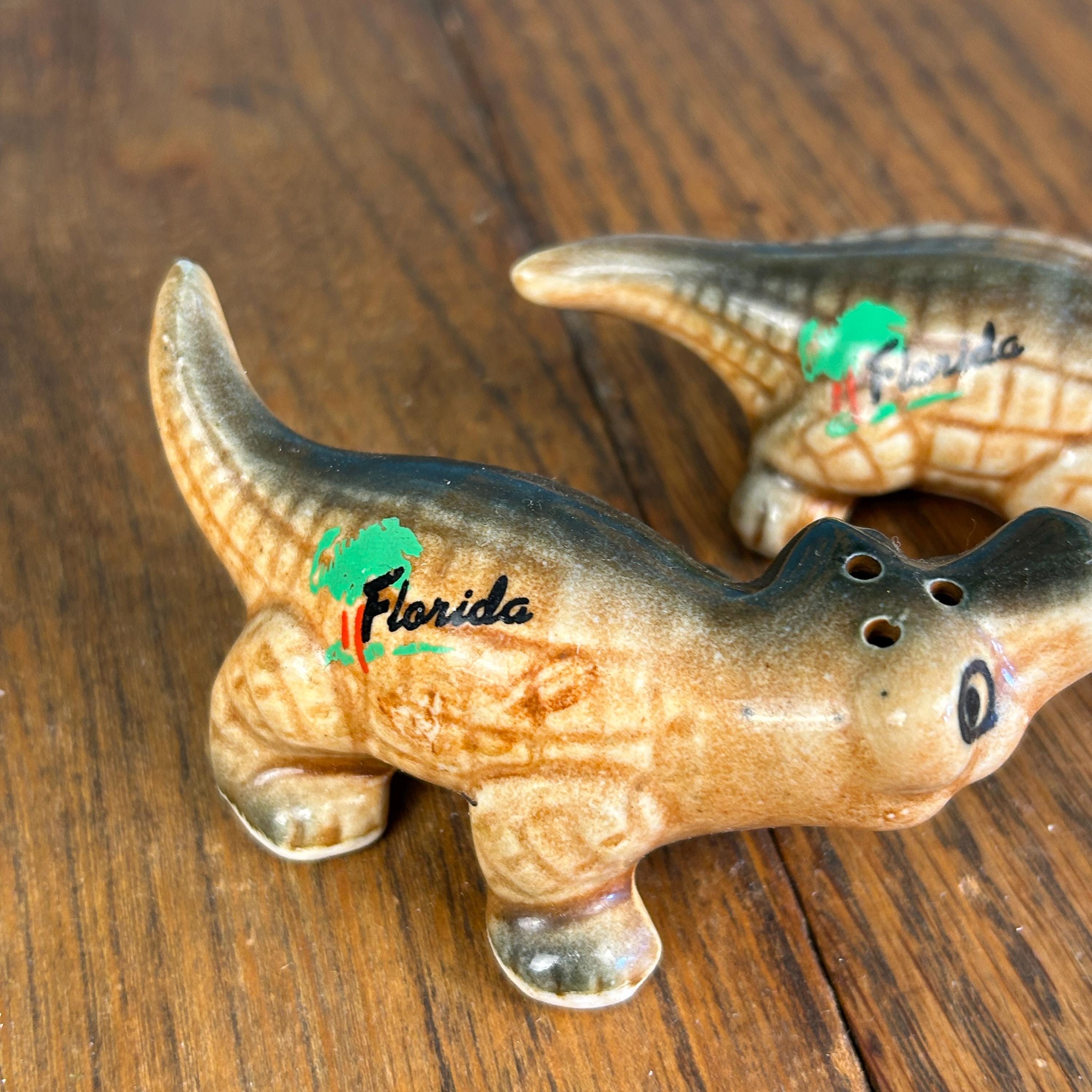Each shaker is shaped like a small alligator and features hand-painted details, giving the pair a charming and playful character. These souvenir pieces were popular travel keepsakes and are now sought after by collectors of vintage novelty kitchenware and mid-century souvenirs.