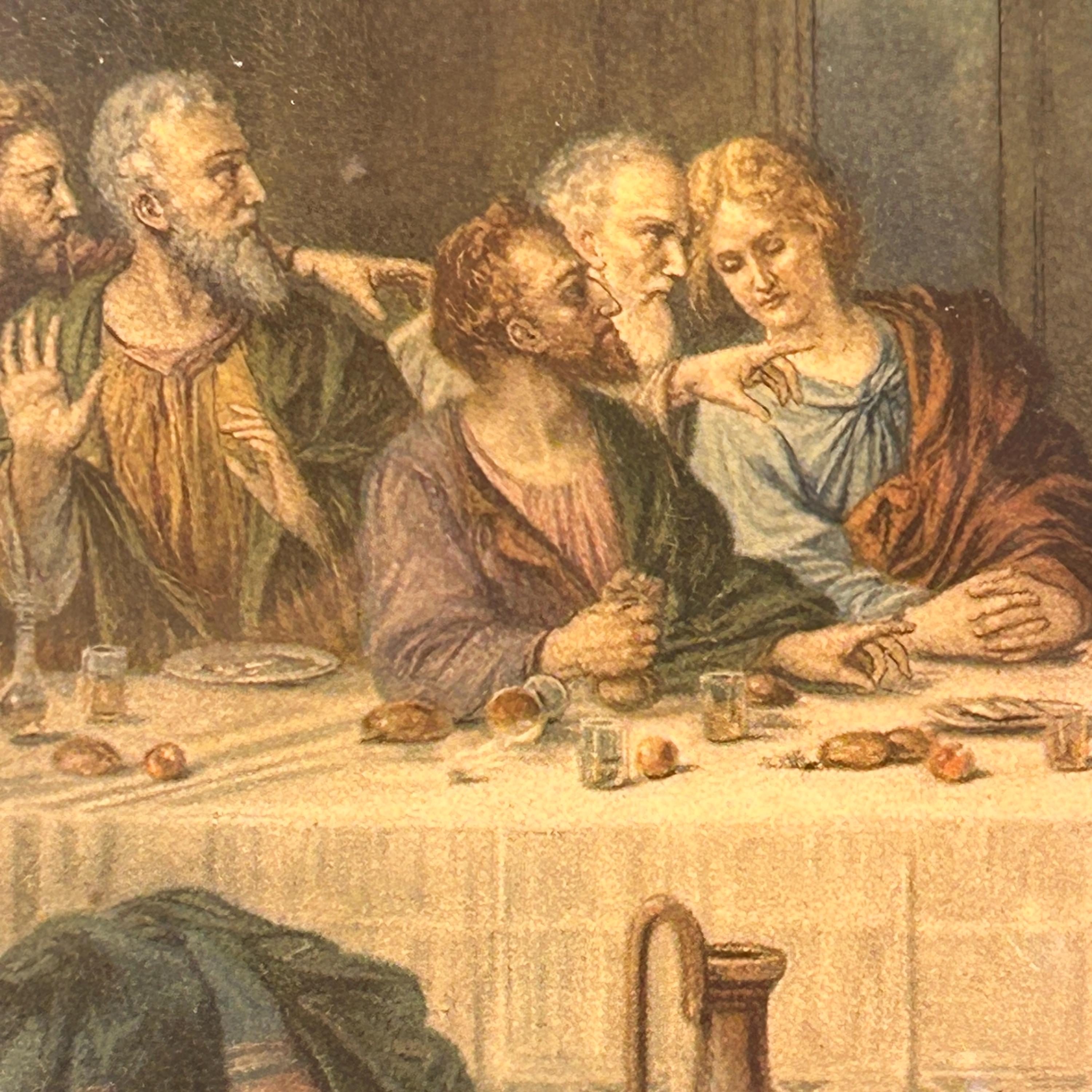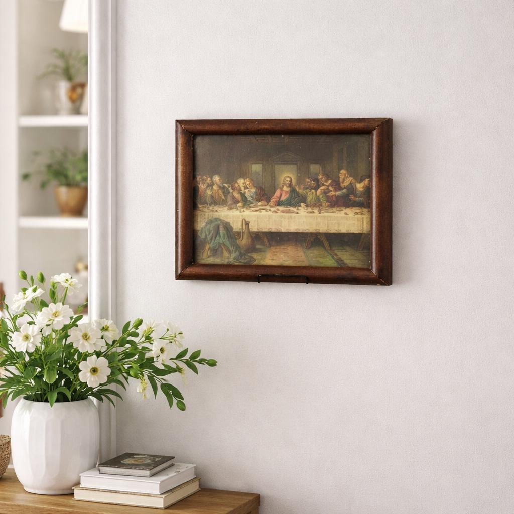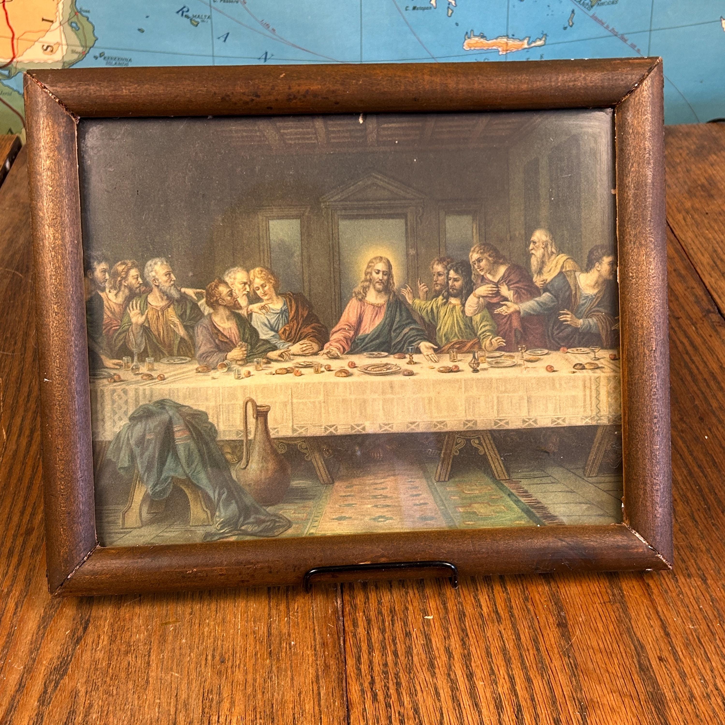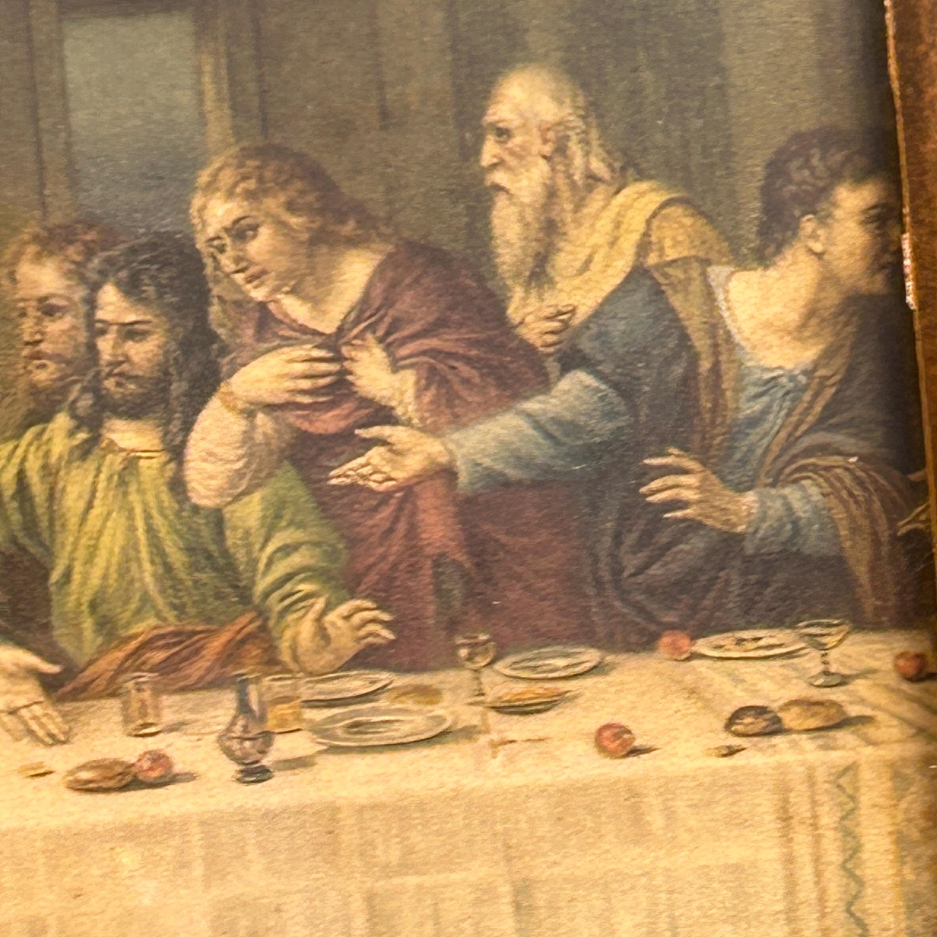 This beautiful antique framed color lithograph features “The Last Supper” after the famous painting by Leonardo da Vinci. The artwork depicts Jesus Christ and the twelve apostles gathered at the table, one of the most recognizable and beloved scenes in Christian art.