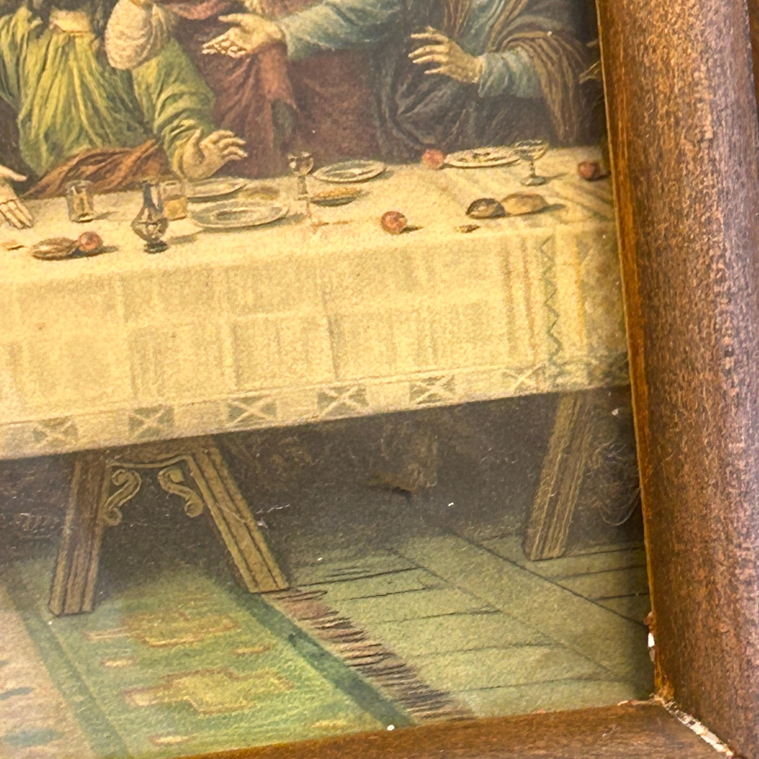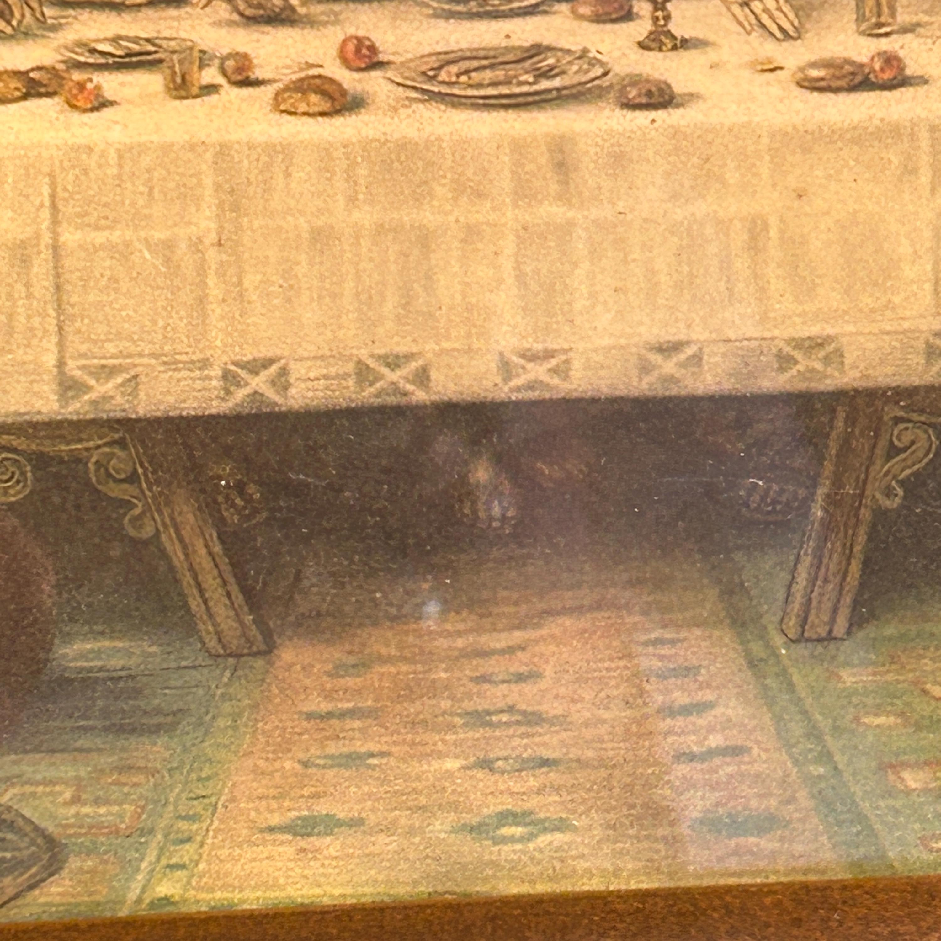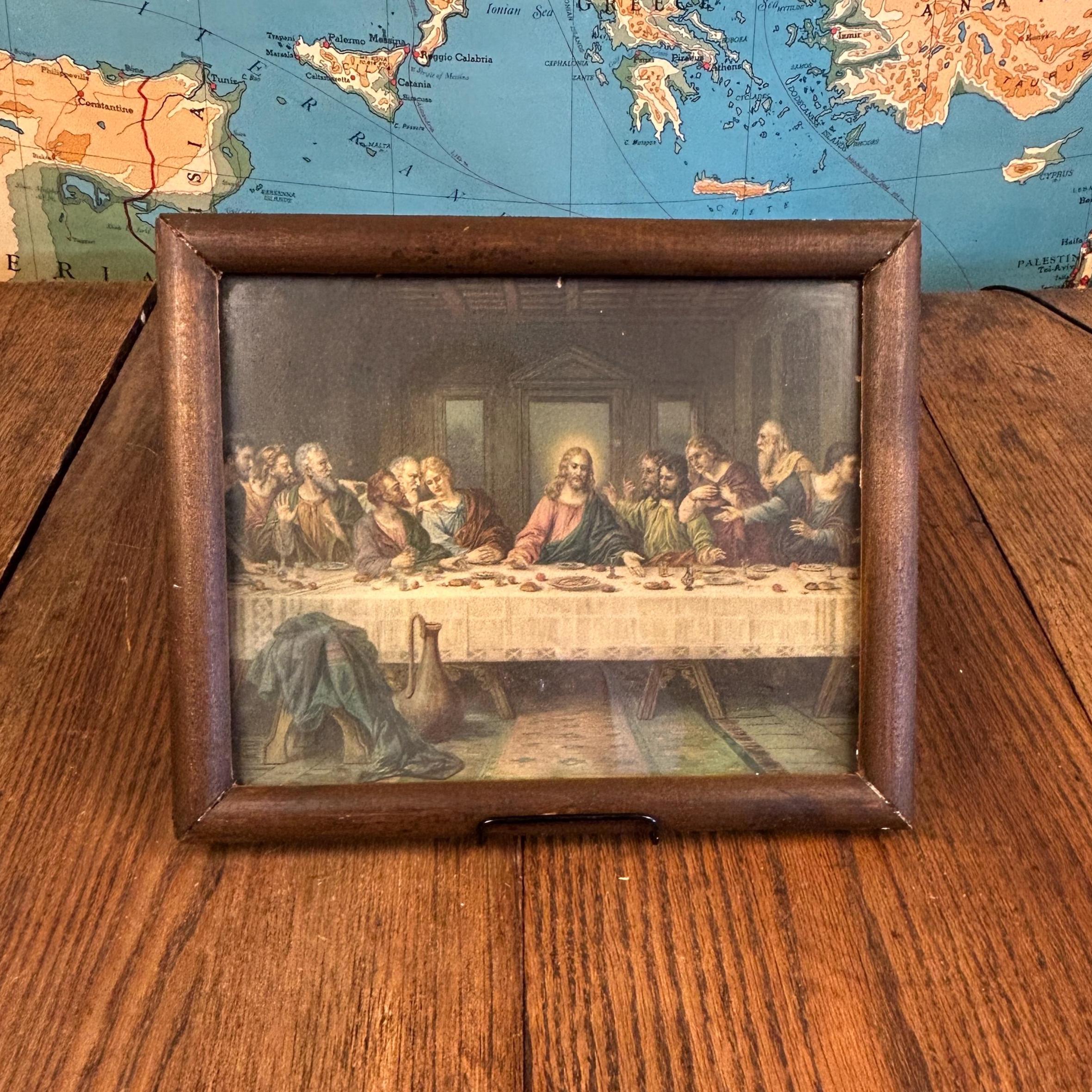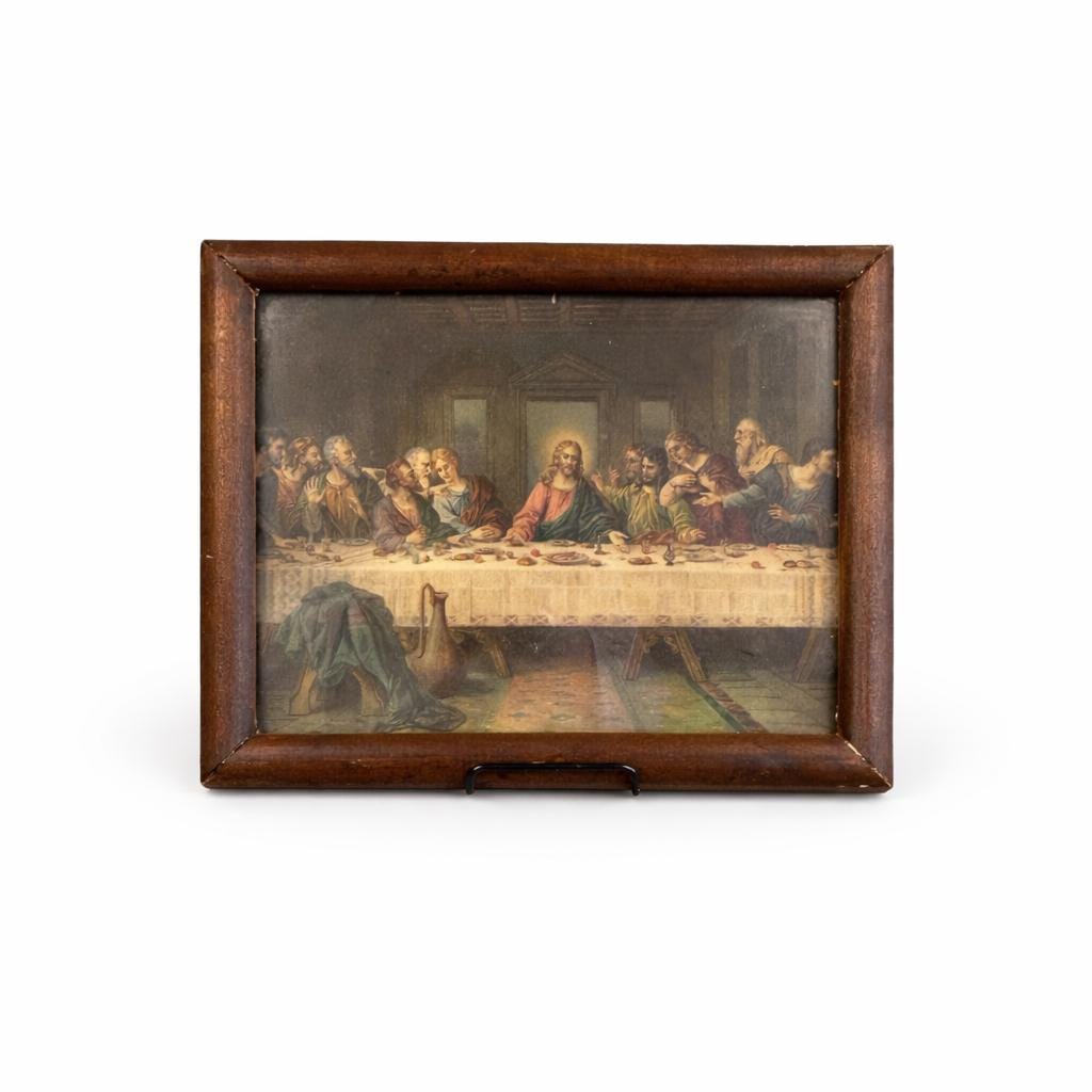 This beautiful antique framed color lithograph features “The Last Supper” after the famous painting by Leonardo da Vinci. The artwork depicts Jesus Christ and the twelve apostles gathered at the table, one of the most recognizable and beloved scenes in Christian art.