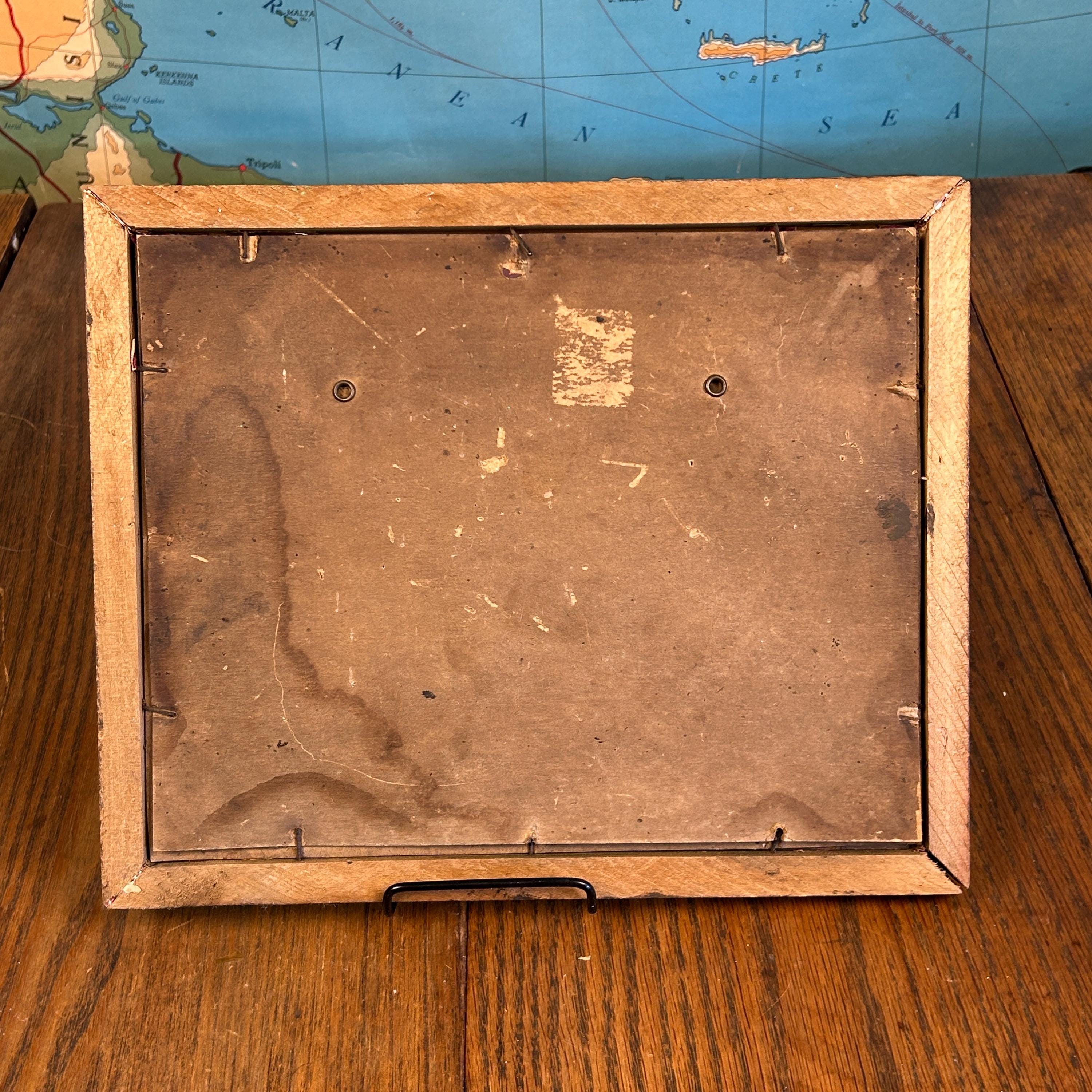 The print is mounted in a simple vintage wooden frame and secured with old nails, adding to its authentic antique character. Pieces like this were commonly displayed in homes as devotional art and remain a timeless addition to religious décor.