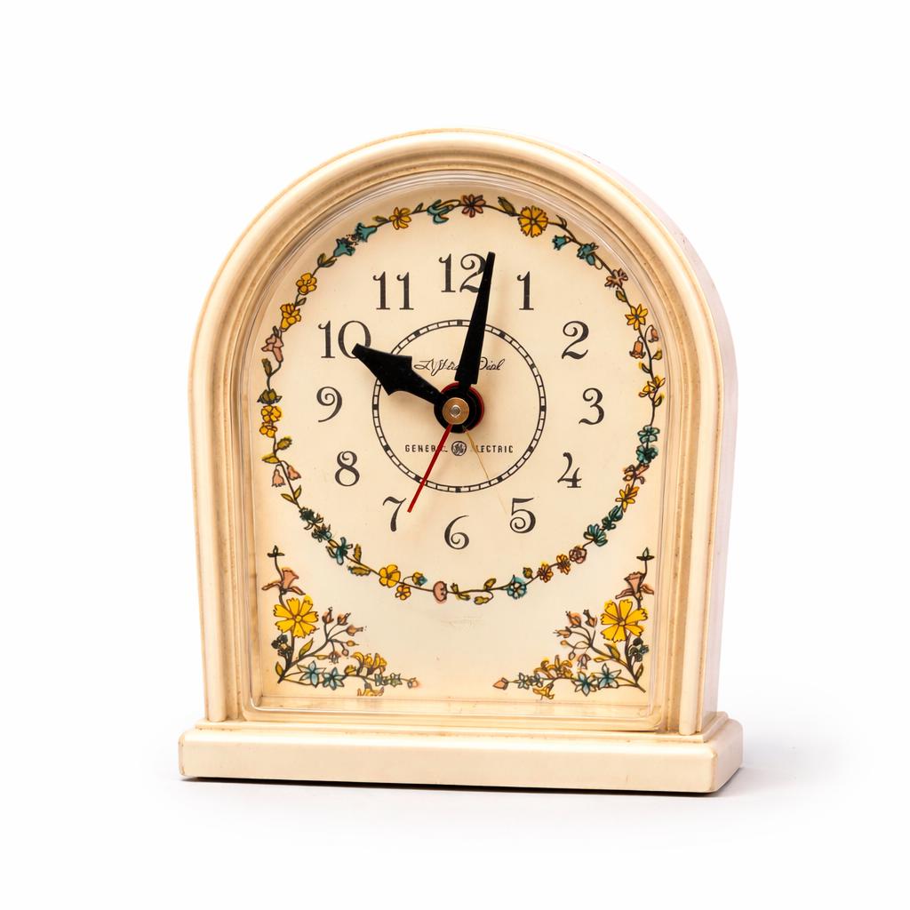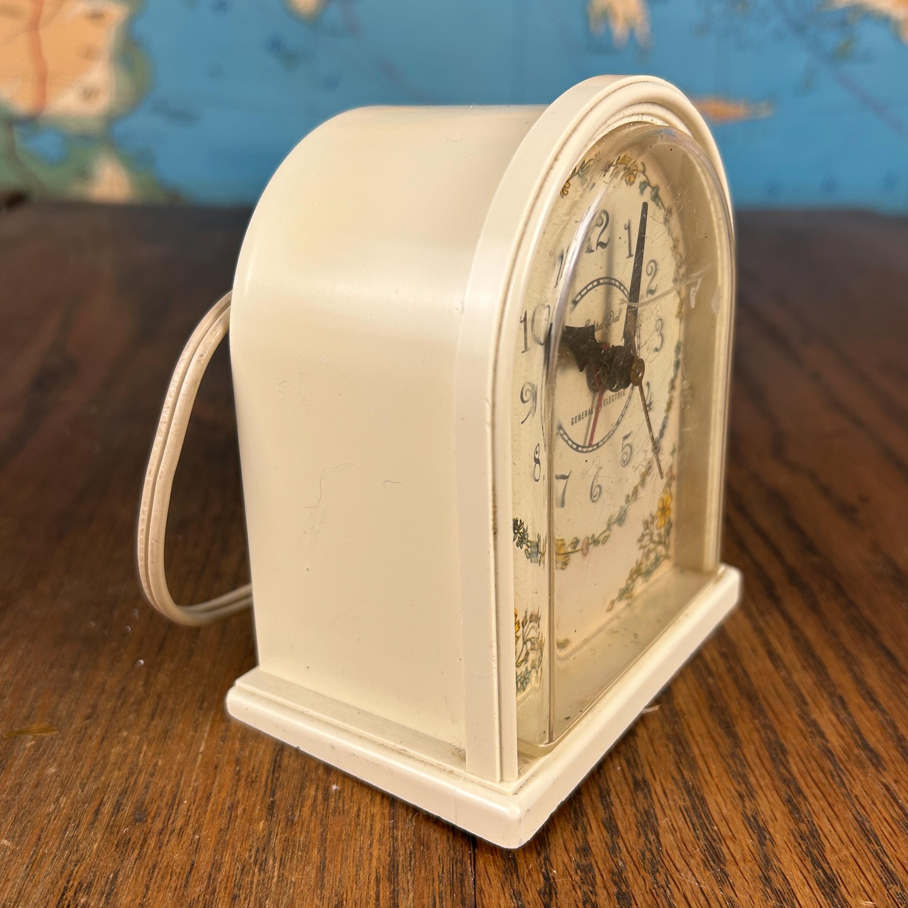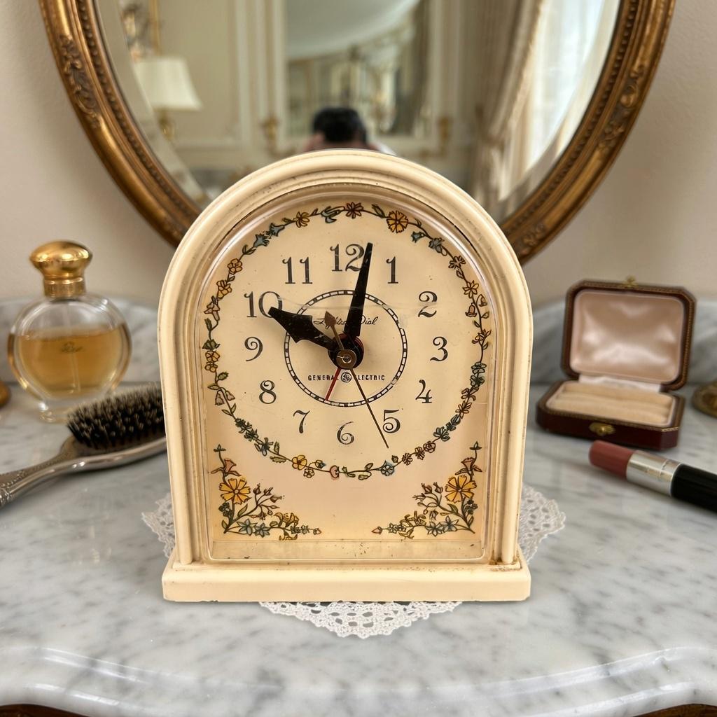 The soft cream tone and floral detailing give the clock a warm vintage character, making it a lovely piece for a bedside table, vanity, or vintage-inspired décor. Produced by General Electric, this style of electric alarm clock was a popular household item in the mid-20th century.