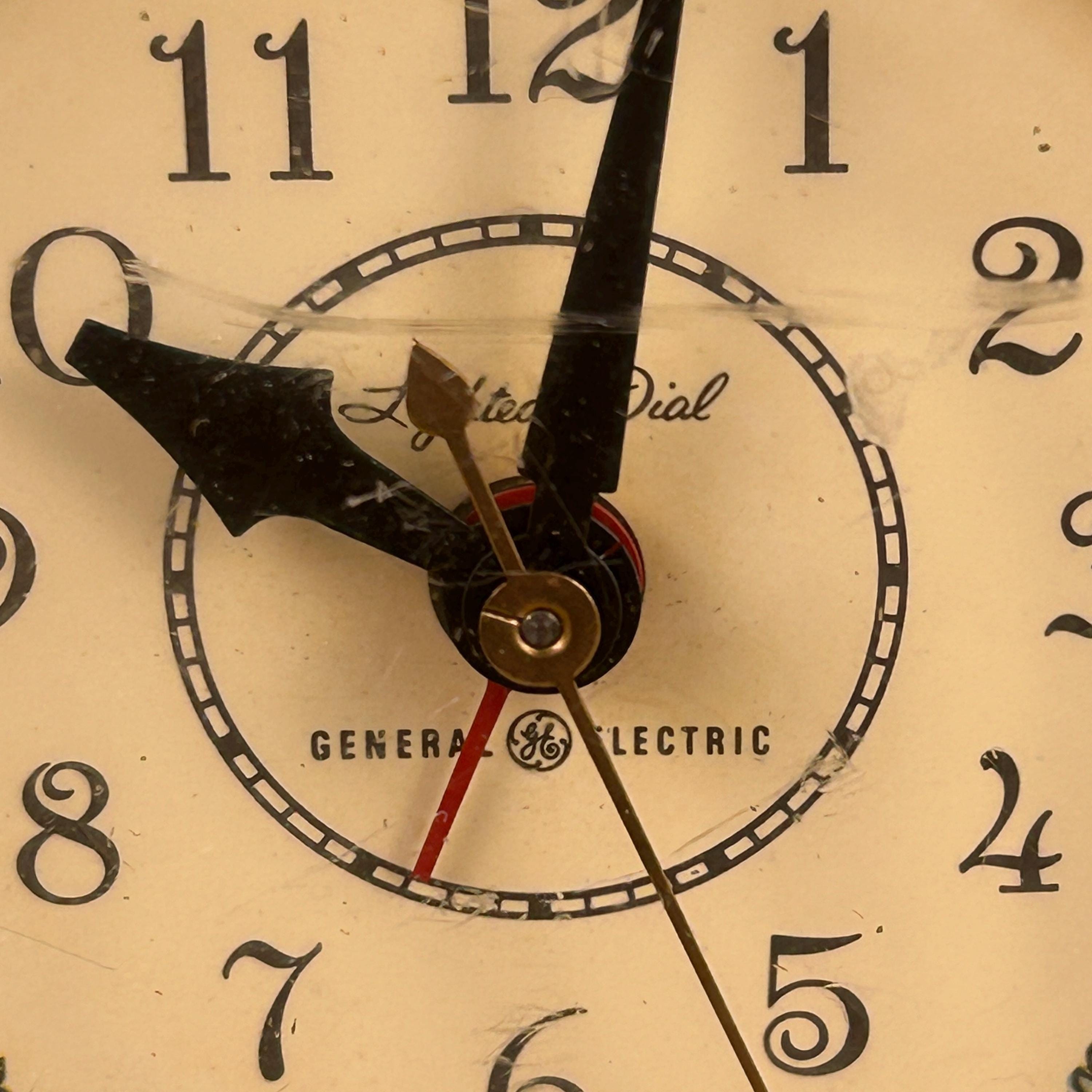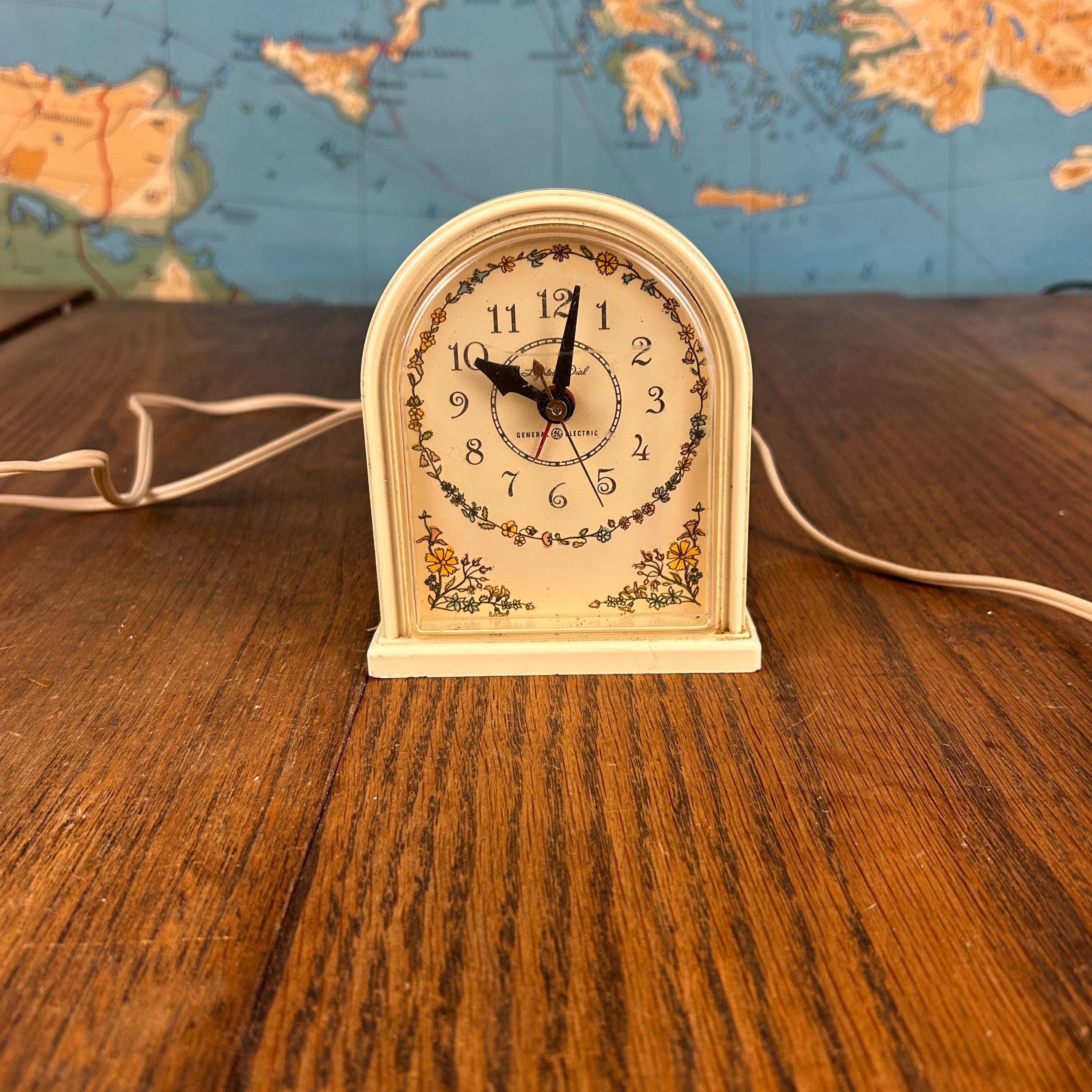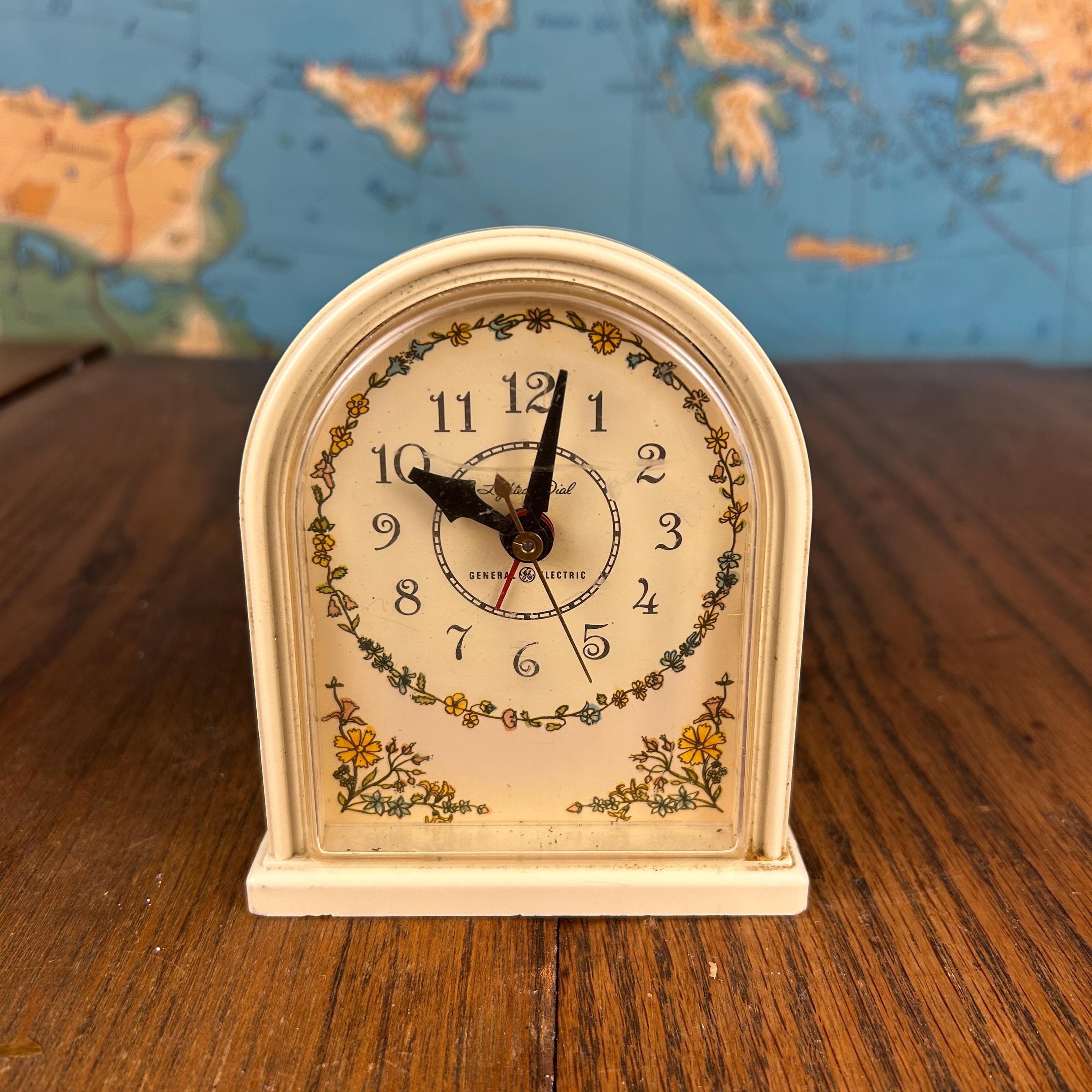 The soft cream tone and floral detailing give the clock a warm vintage character, making it a lovely piece for a bedside table, vanity, or vintage-inspired décor. Produced by General Electric, this style of electric alarm clock was a popular household item in the mid-20th century.