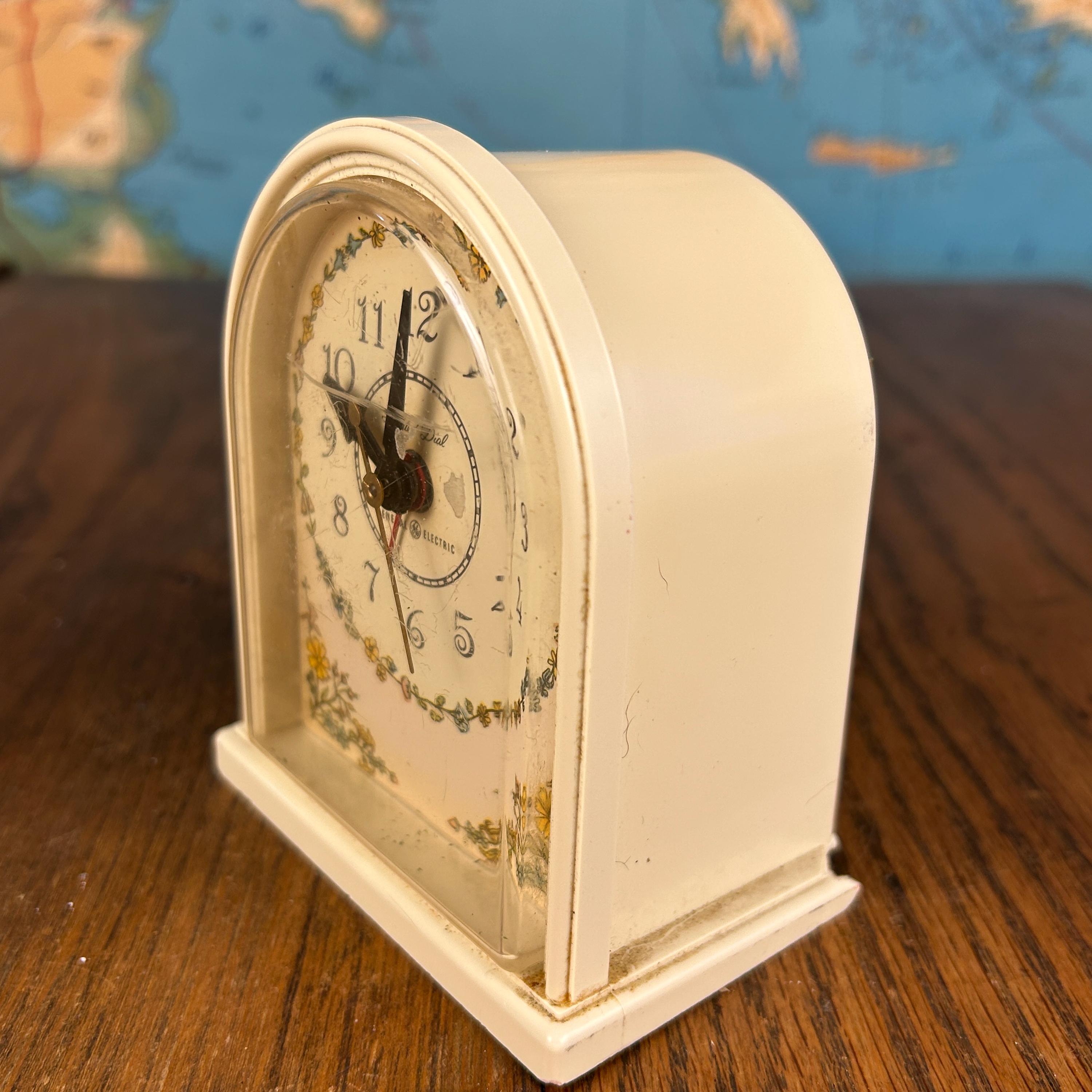 This charming vintage General Electric alarm clock (Model 7404-4A) features a classic arched cream-colored celluloid plastic case and a beautifully decorated dial with a delicate floral border.