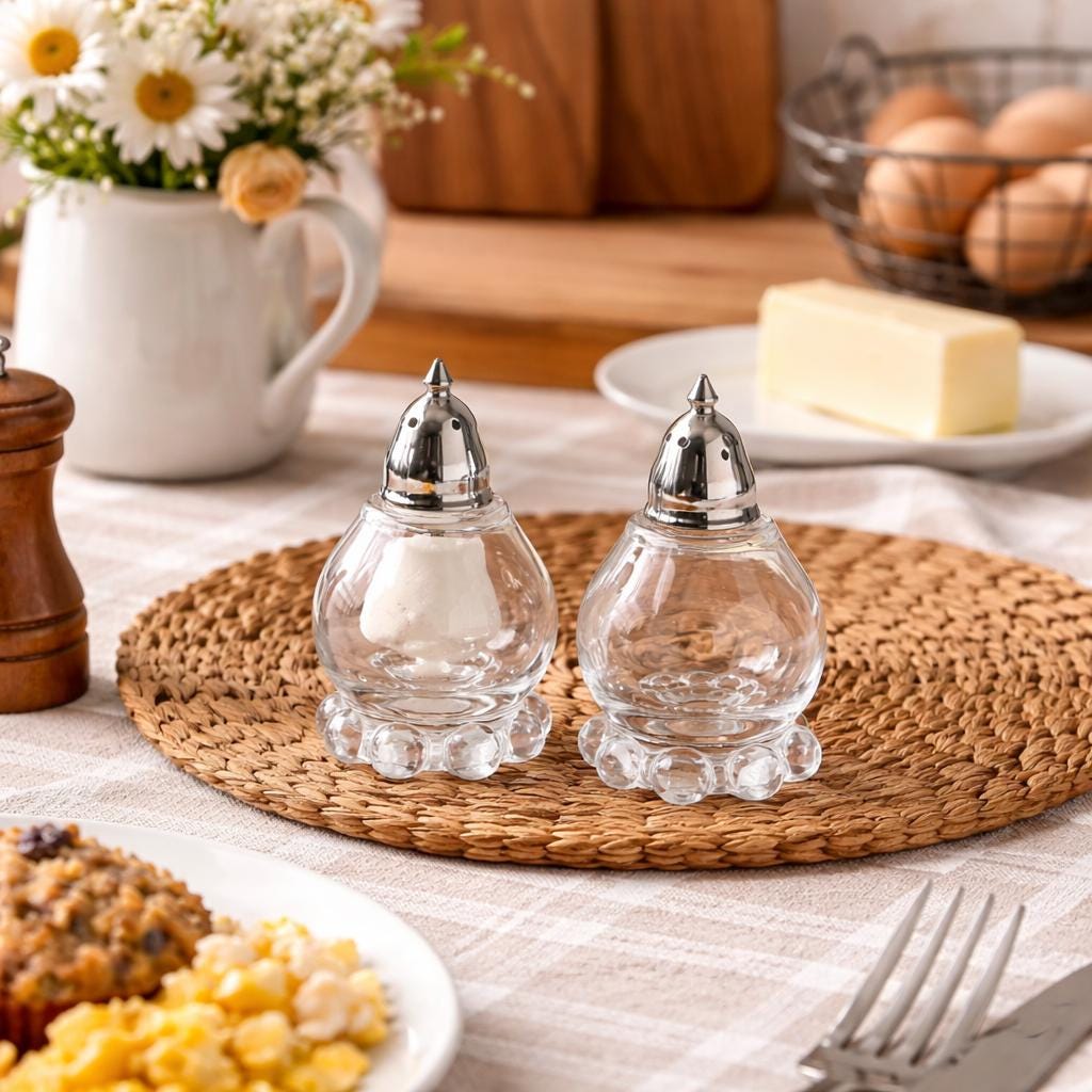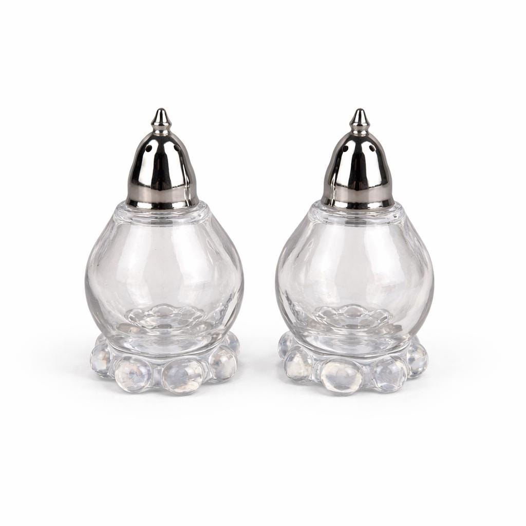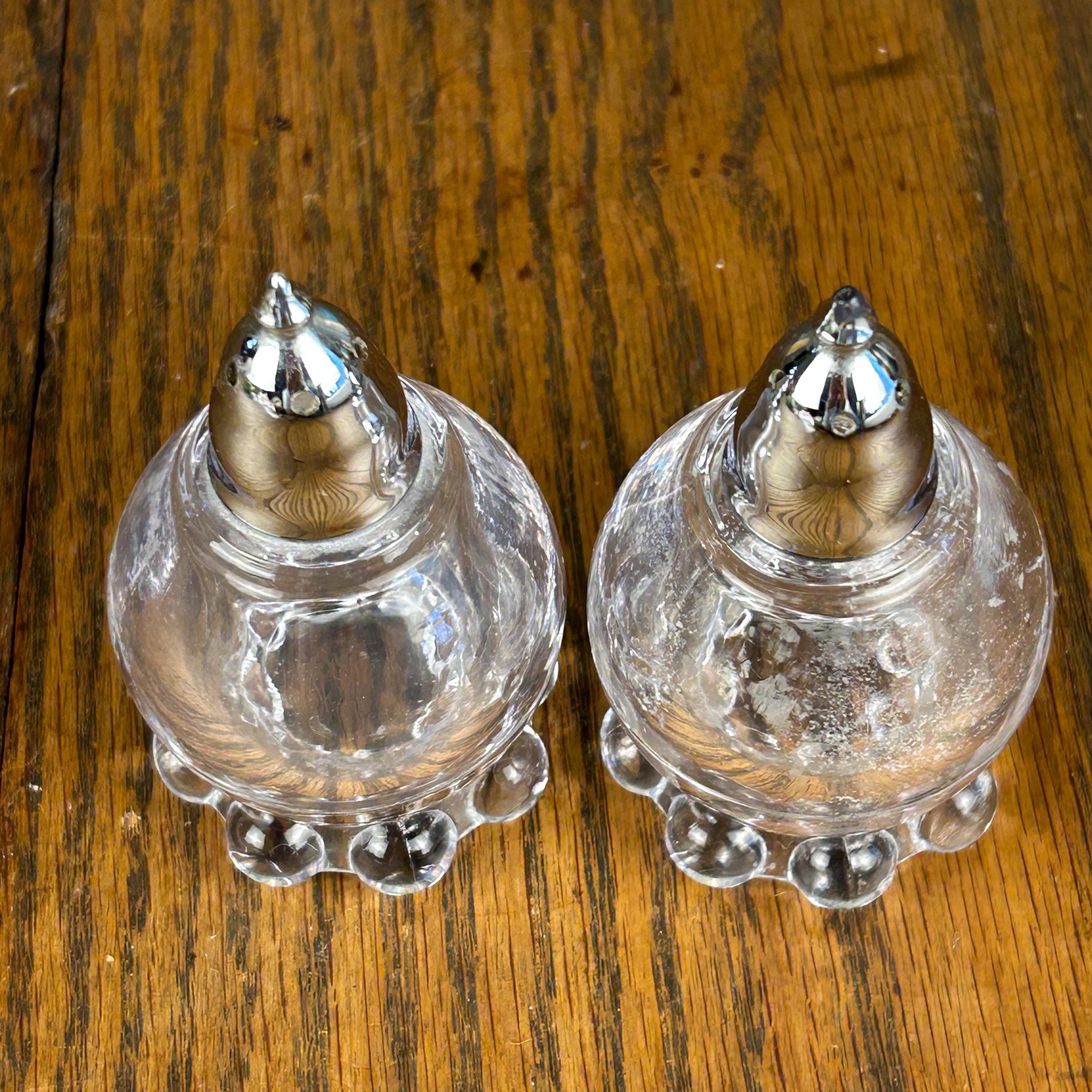 Crafted from clear pressed glass, each shaker displays the distinctive bubble or beaded base that defines the Candlewick pattern. The set is topped with polished chrome shaker lids, creating a beautiful blend of vintage glass and classic tableware styling.