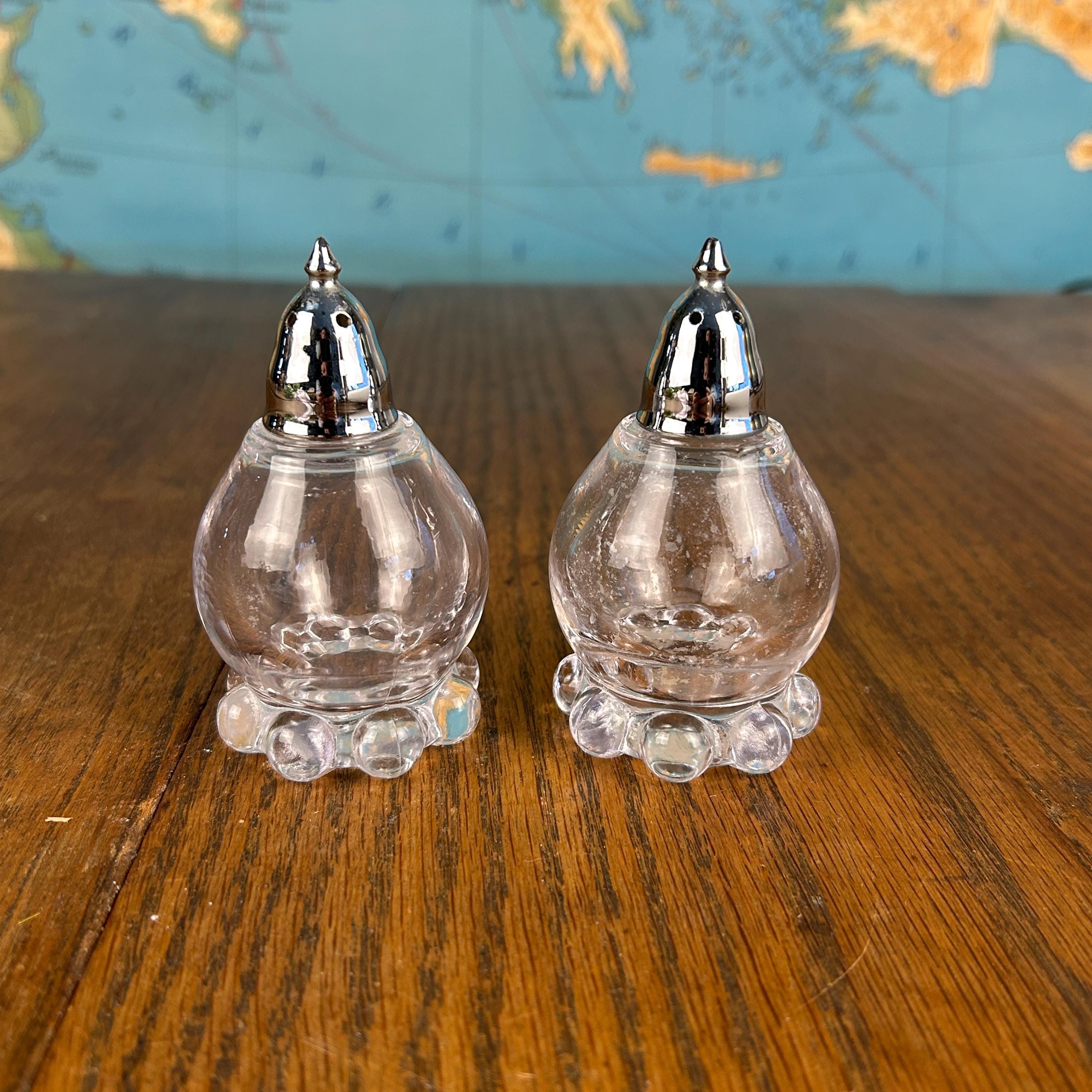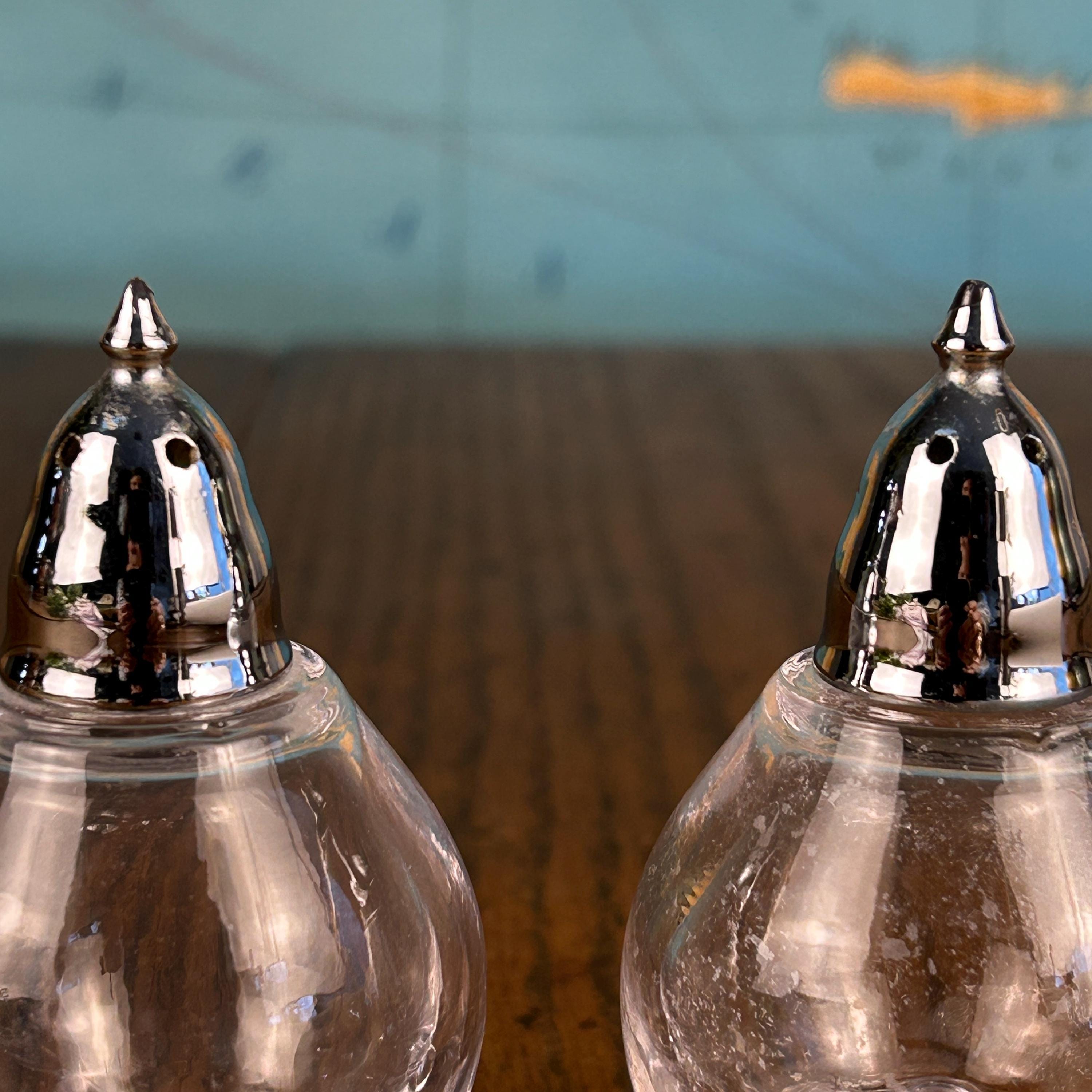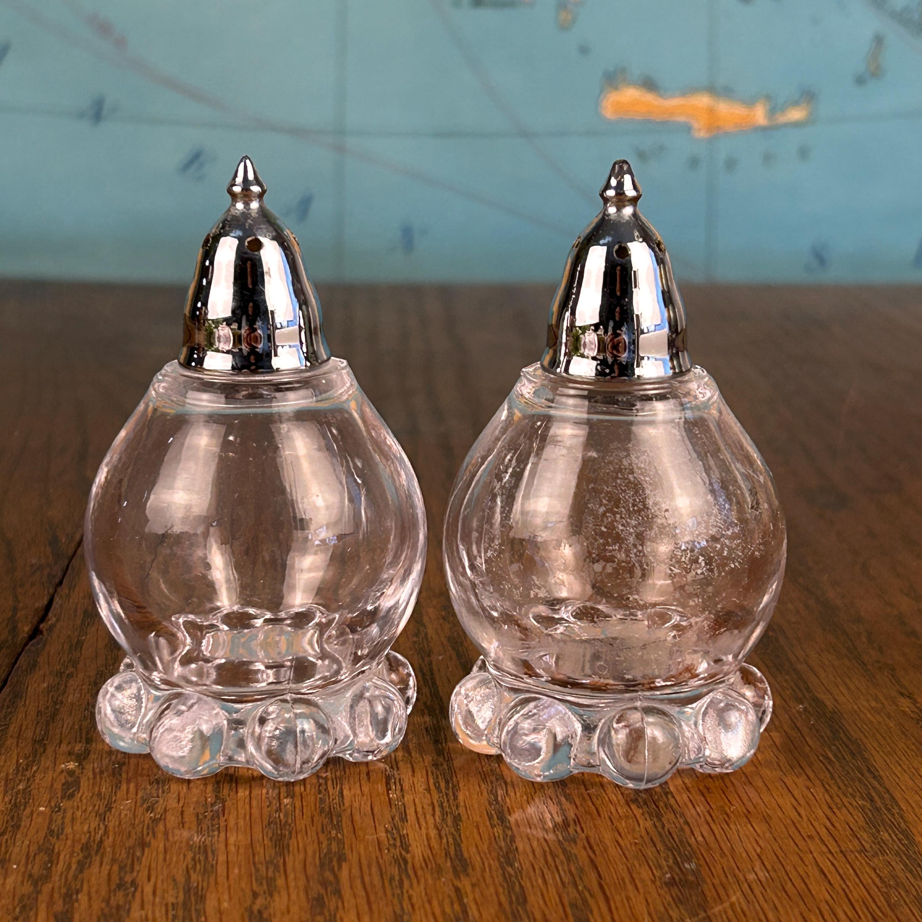 Excellent vintage condition with no chips or cracks. The glass is clear and displays beautifully. There is a small amount of pepper residue remaining in one shaker, but both pieces are very clean overall. Please review photos as they are part of the description.