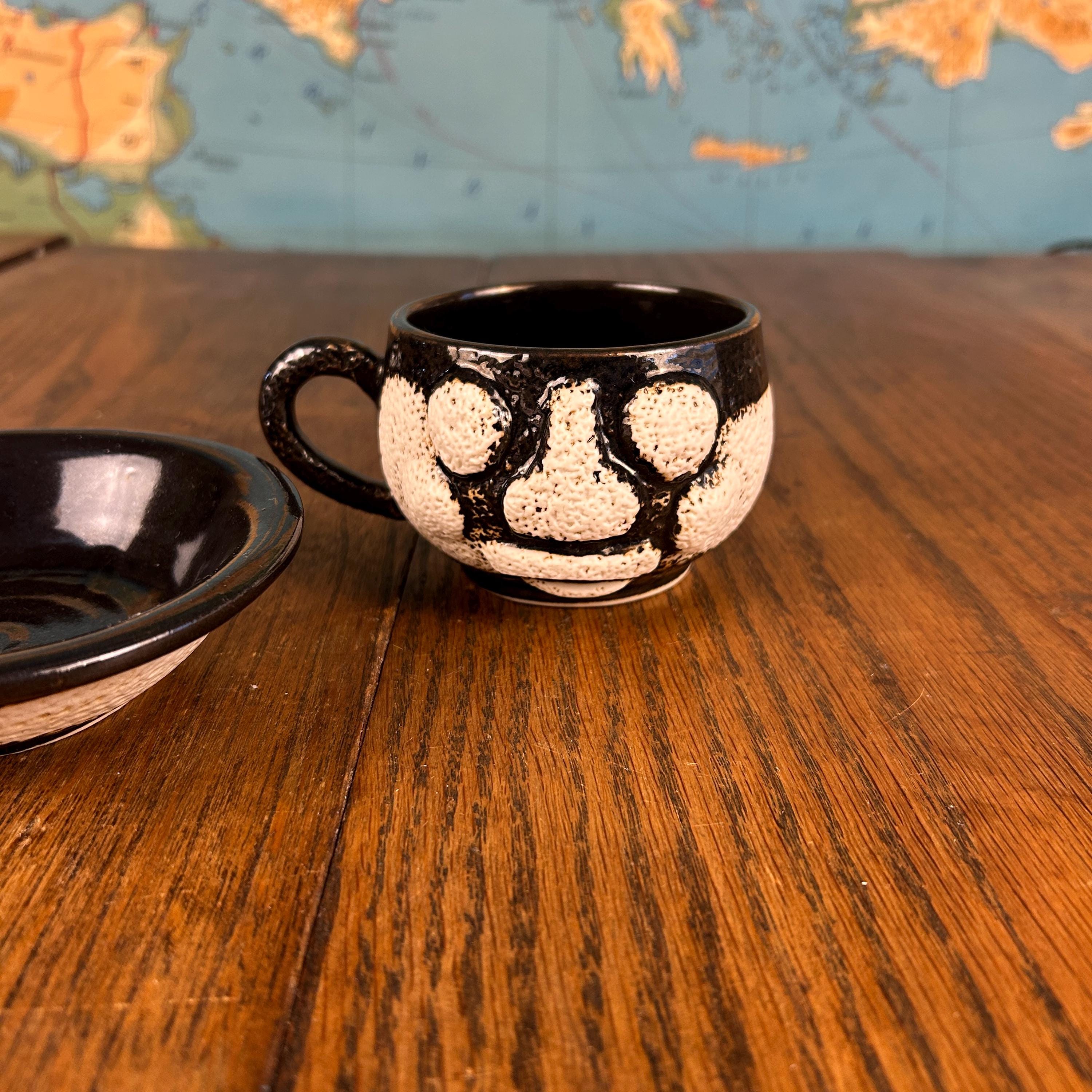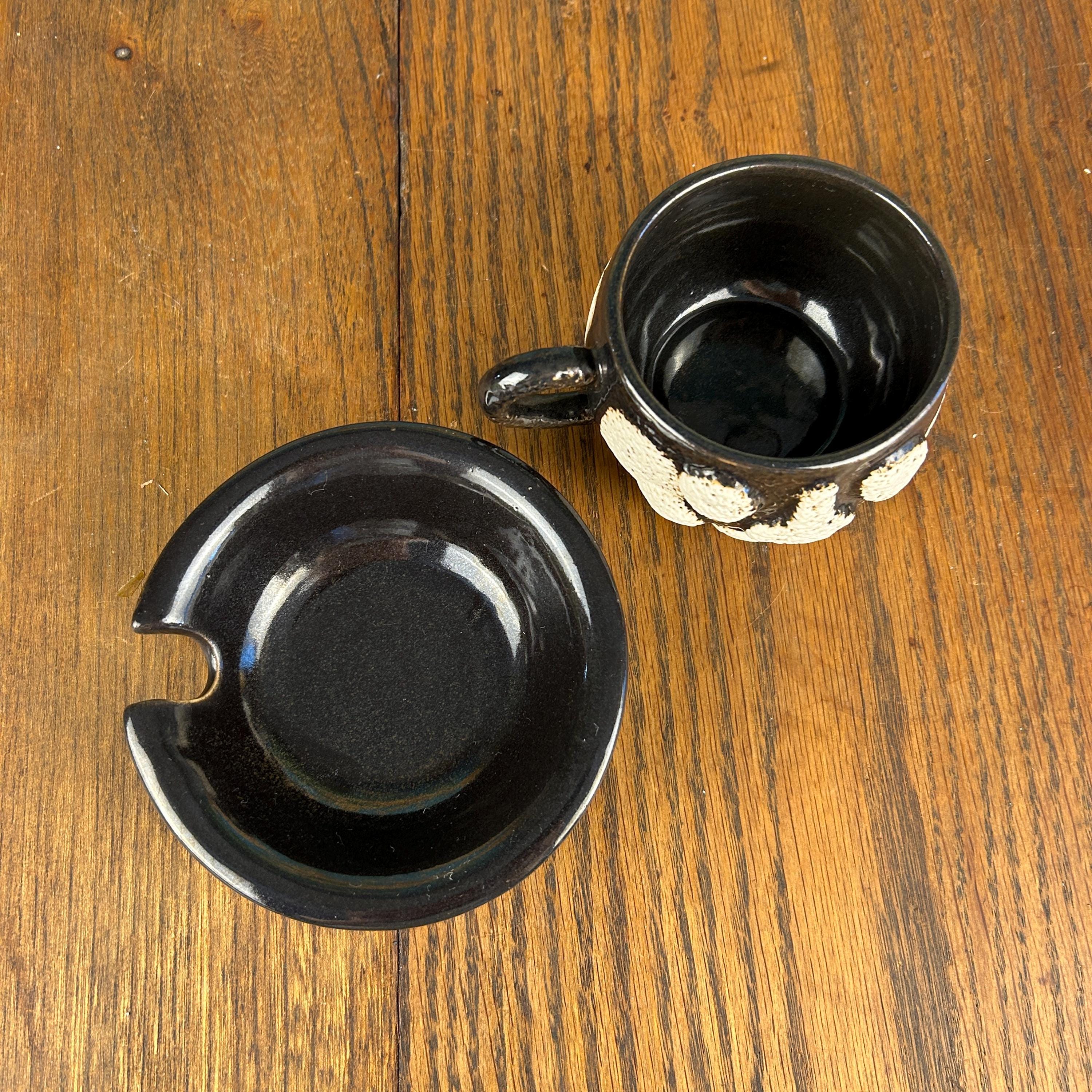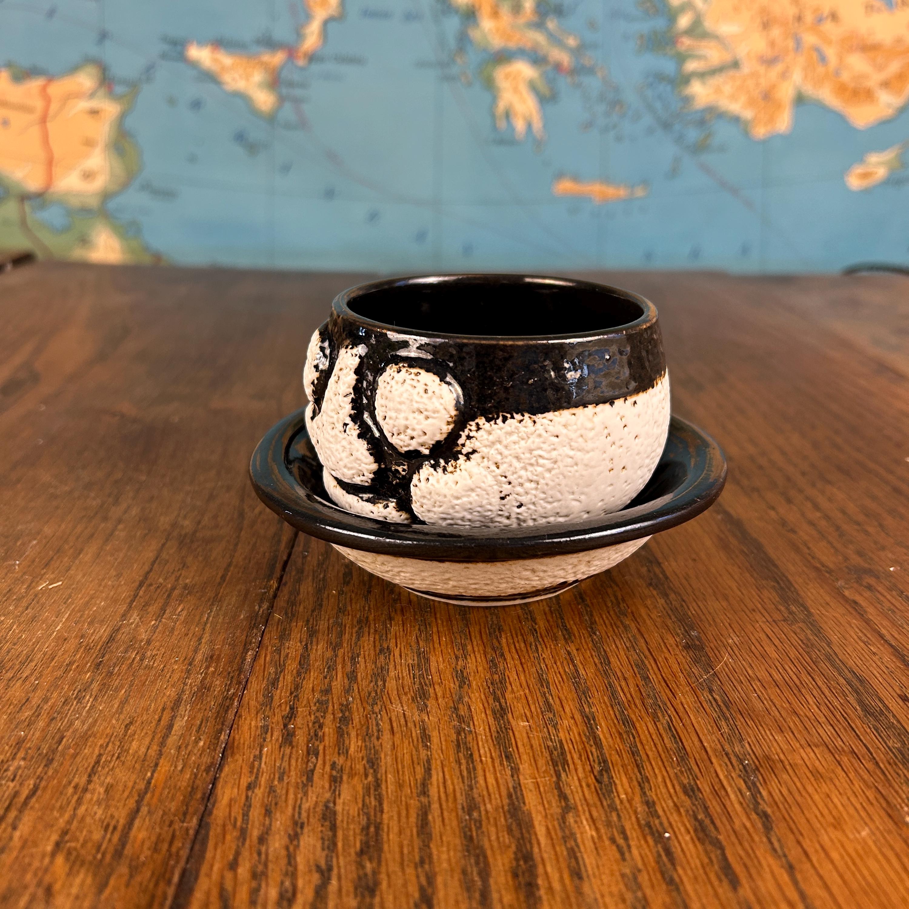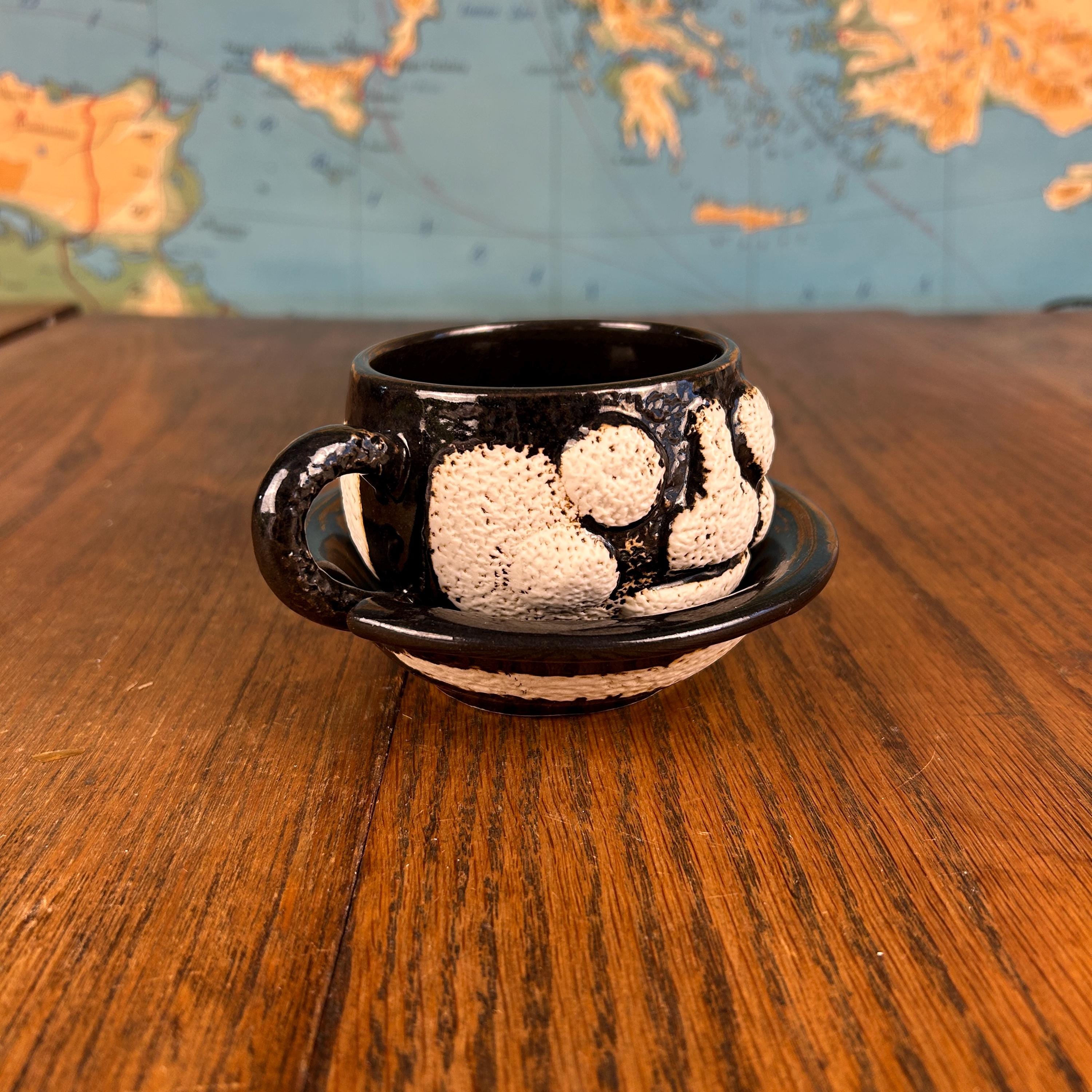 This one-of-a-kind vintage studio pottery mug and saucer set features a wonderfully unique textured face design sculpted into the mug.