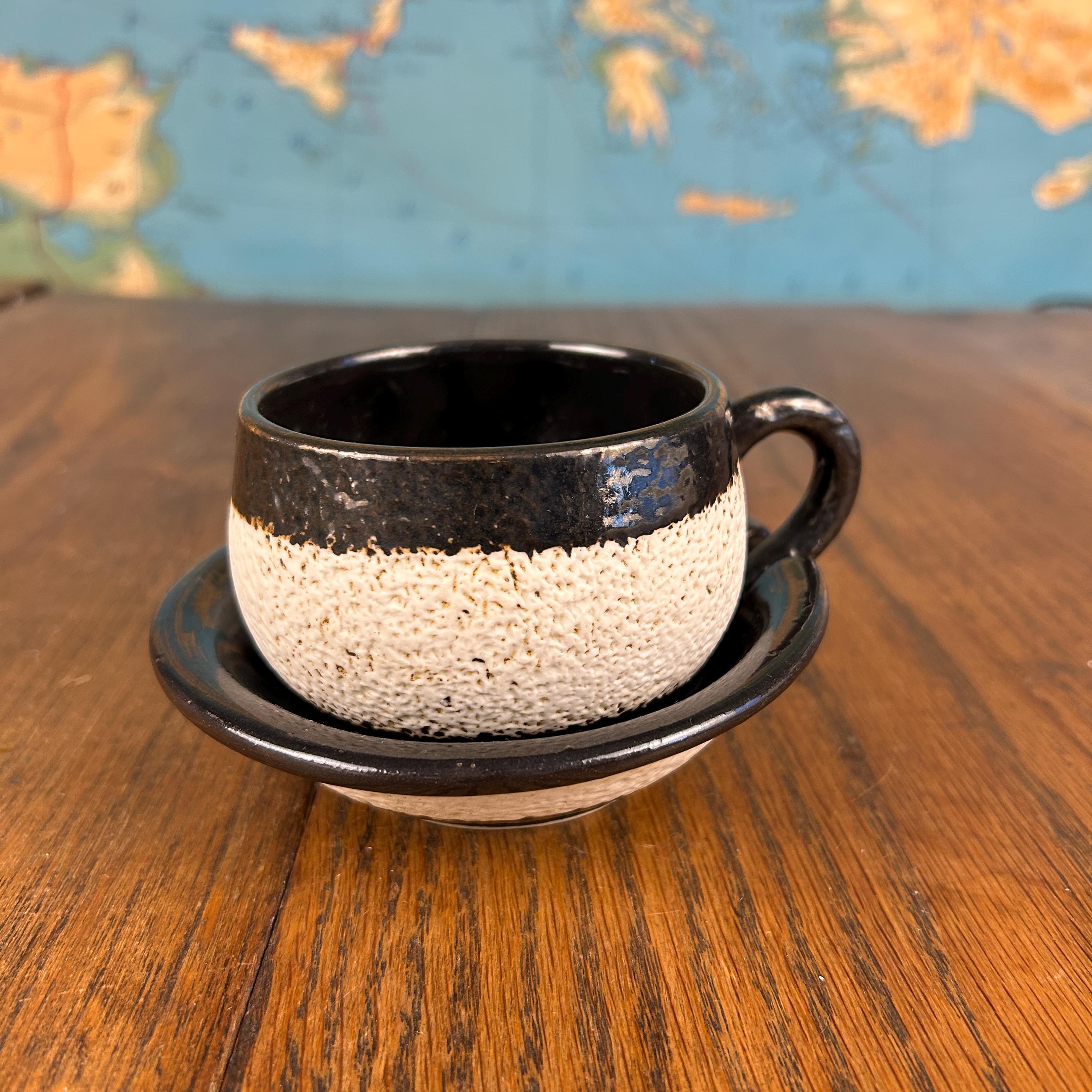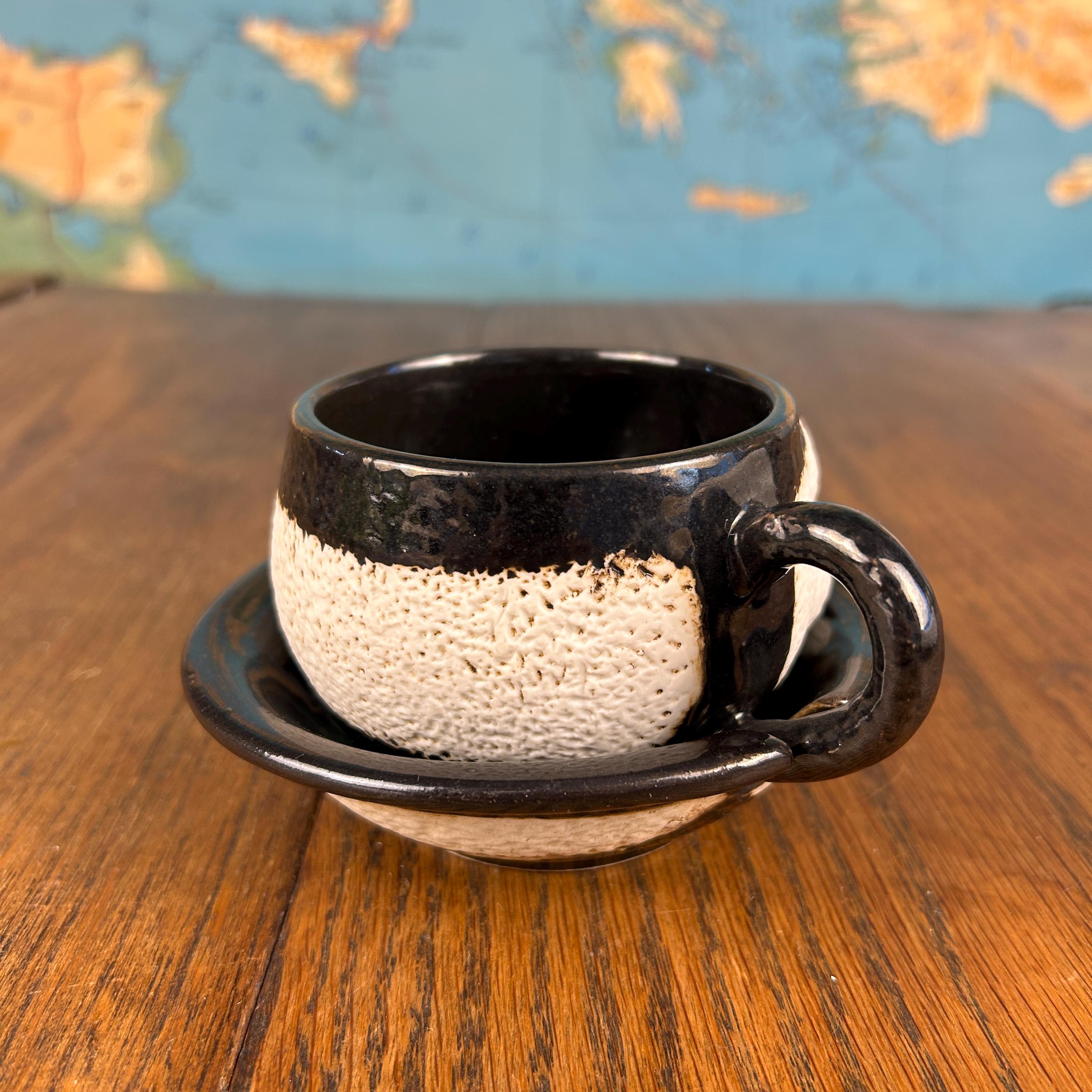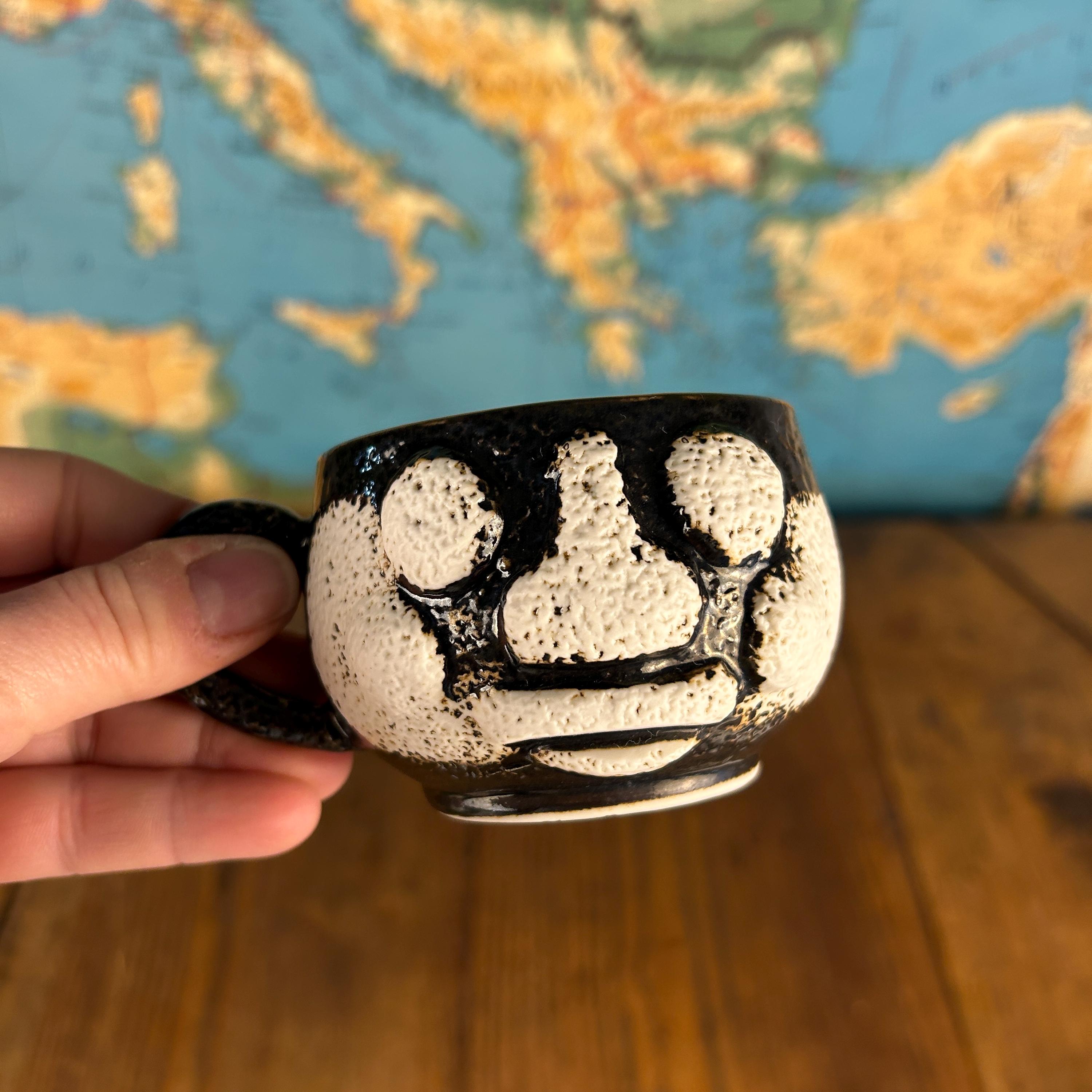 This one-of-a-kind vintage studio pottery mug and saucer set features a wonderfully unique textured face design sculpted into the mug.