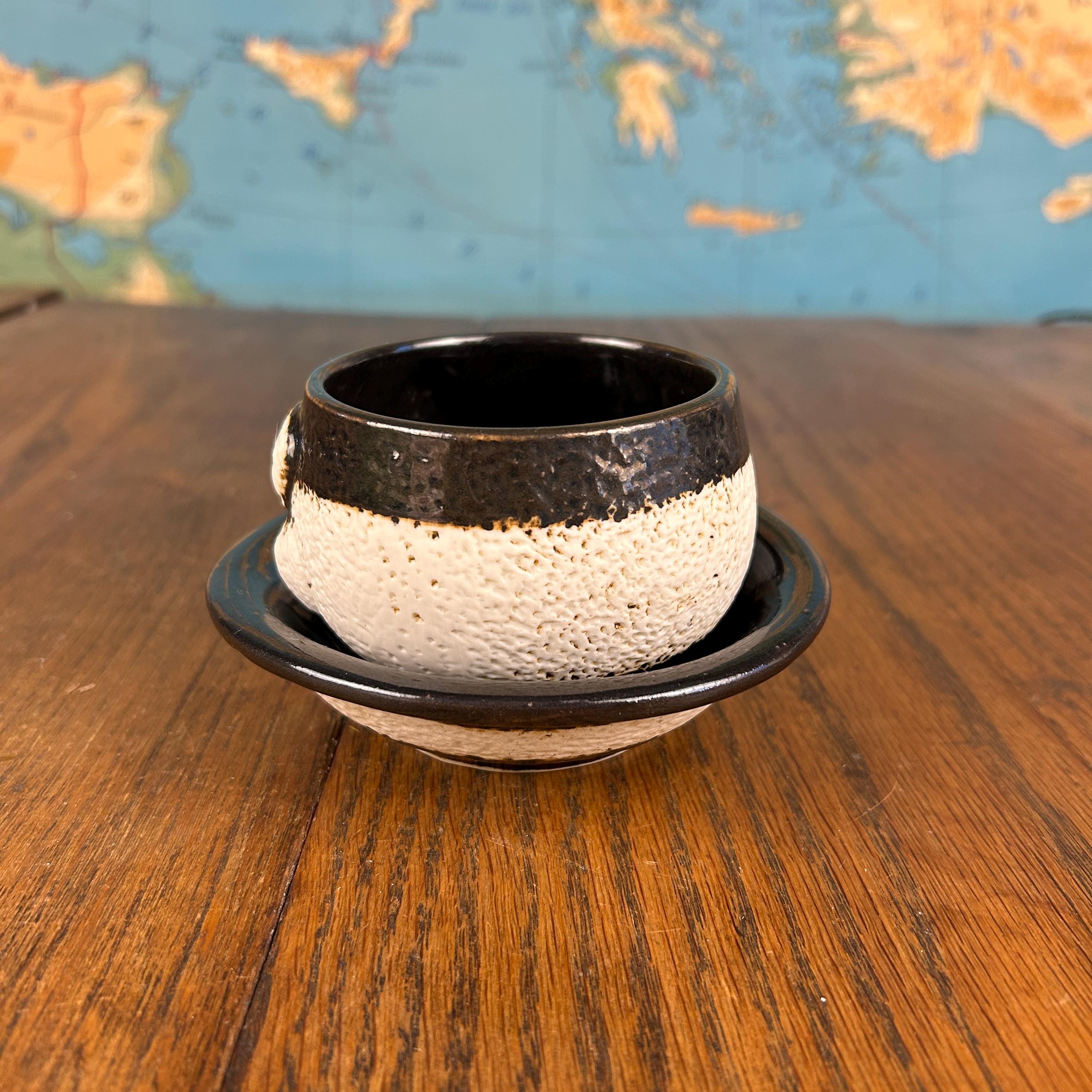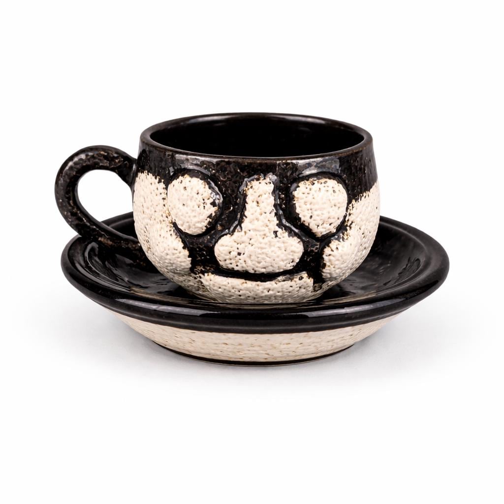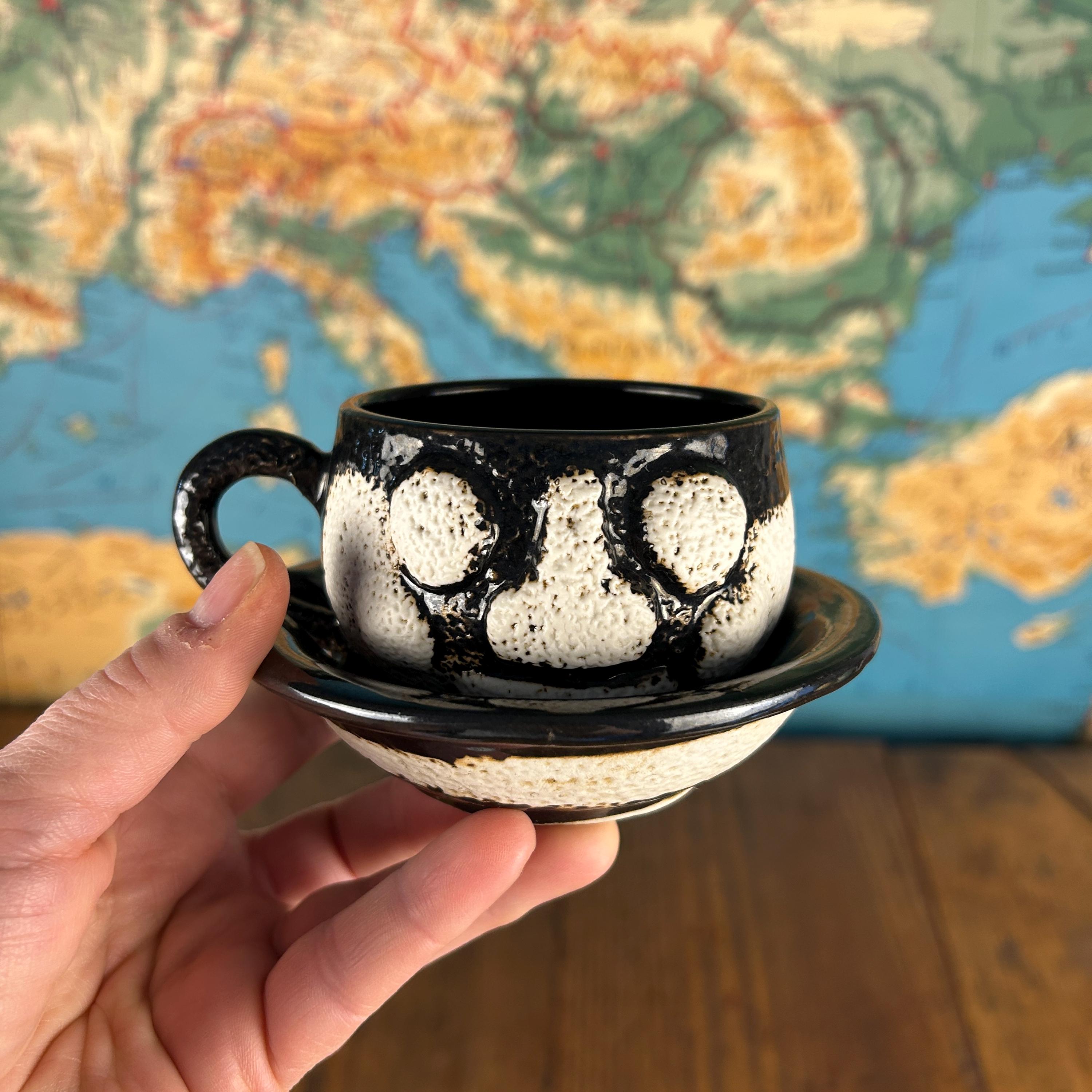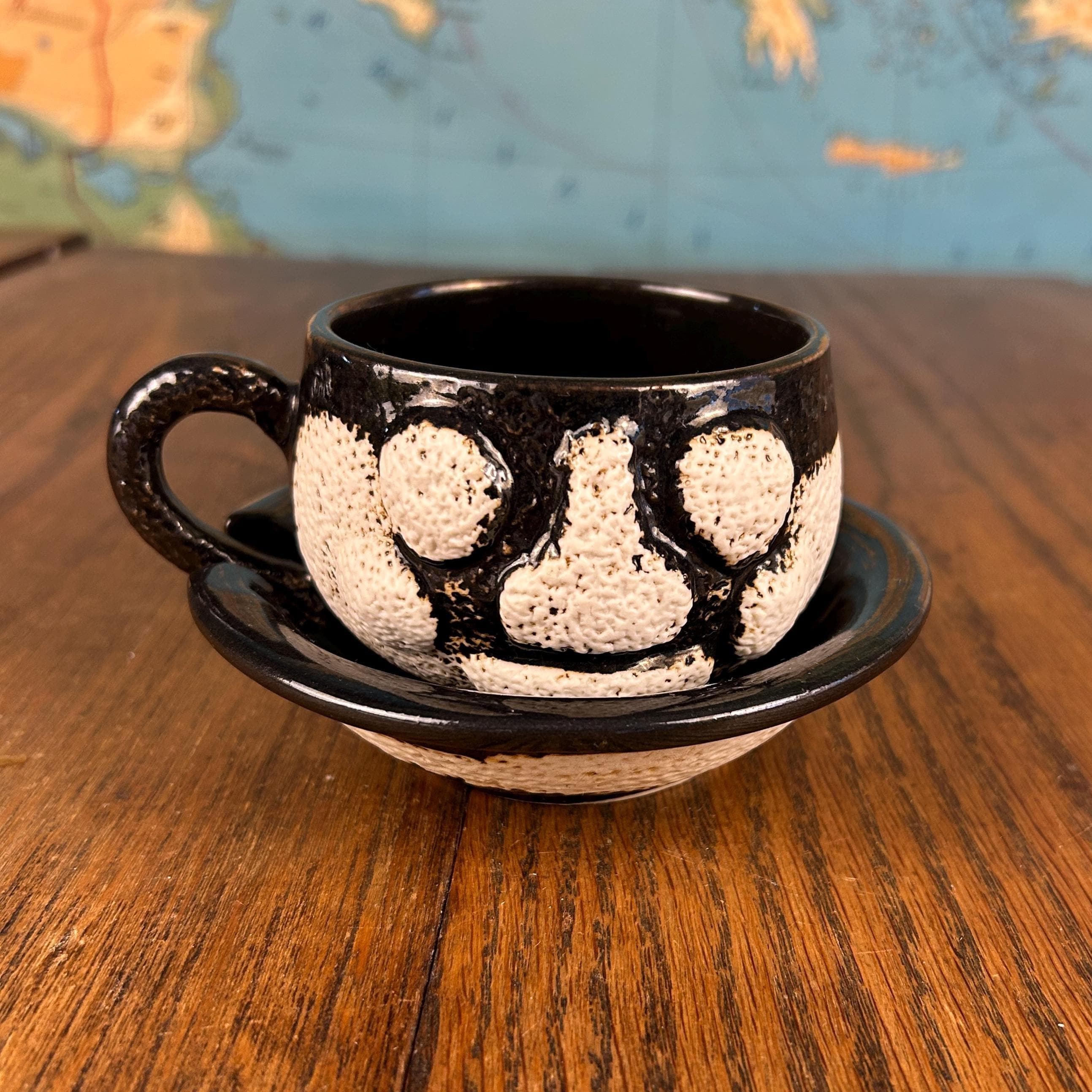 This one-of-a-kind vintage studio pottery mug and saucer set features a wonderfully unique textured face design sculpted into the mug.