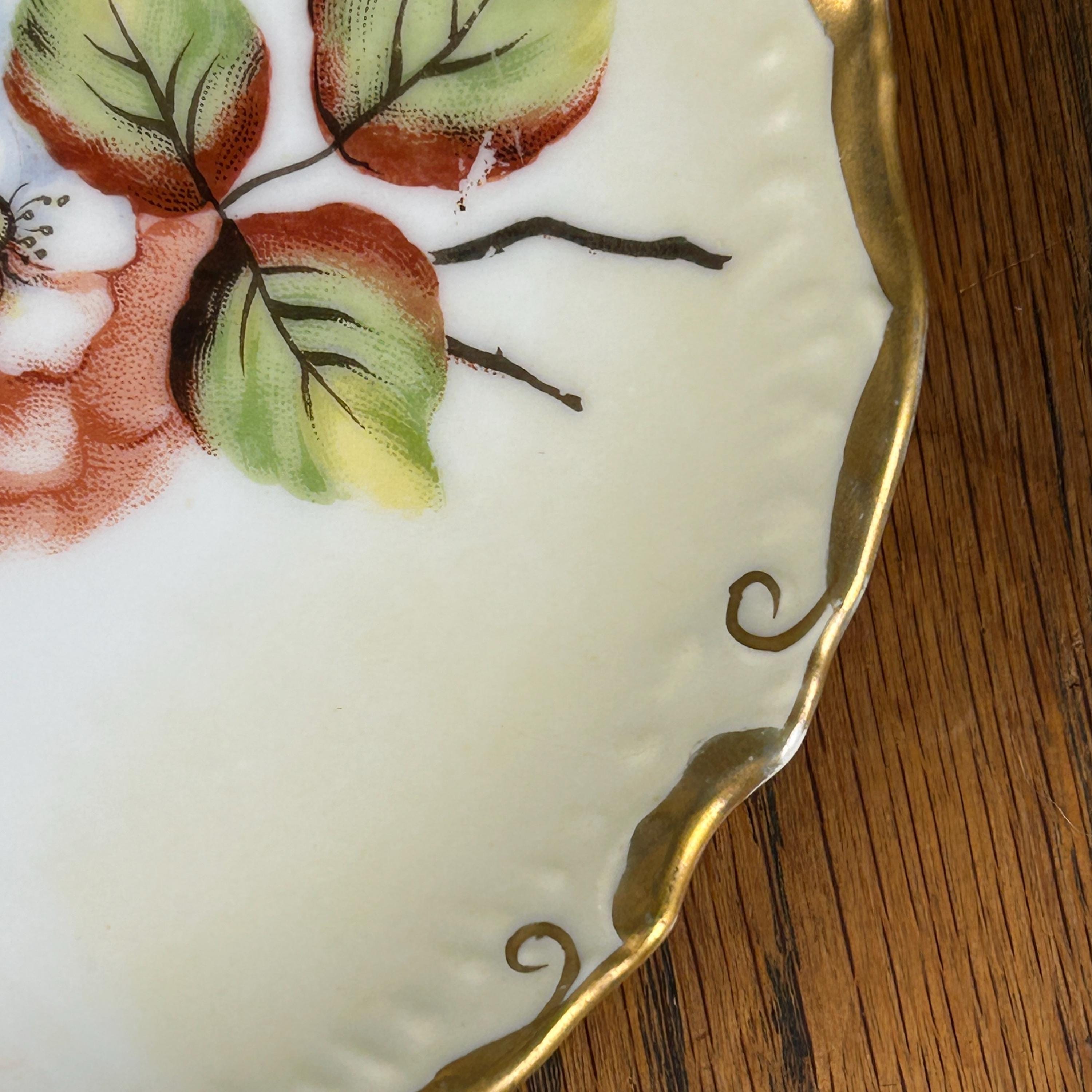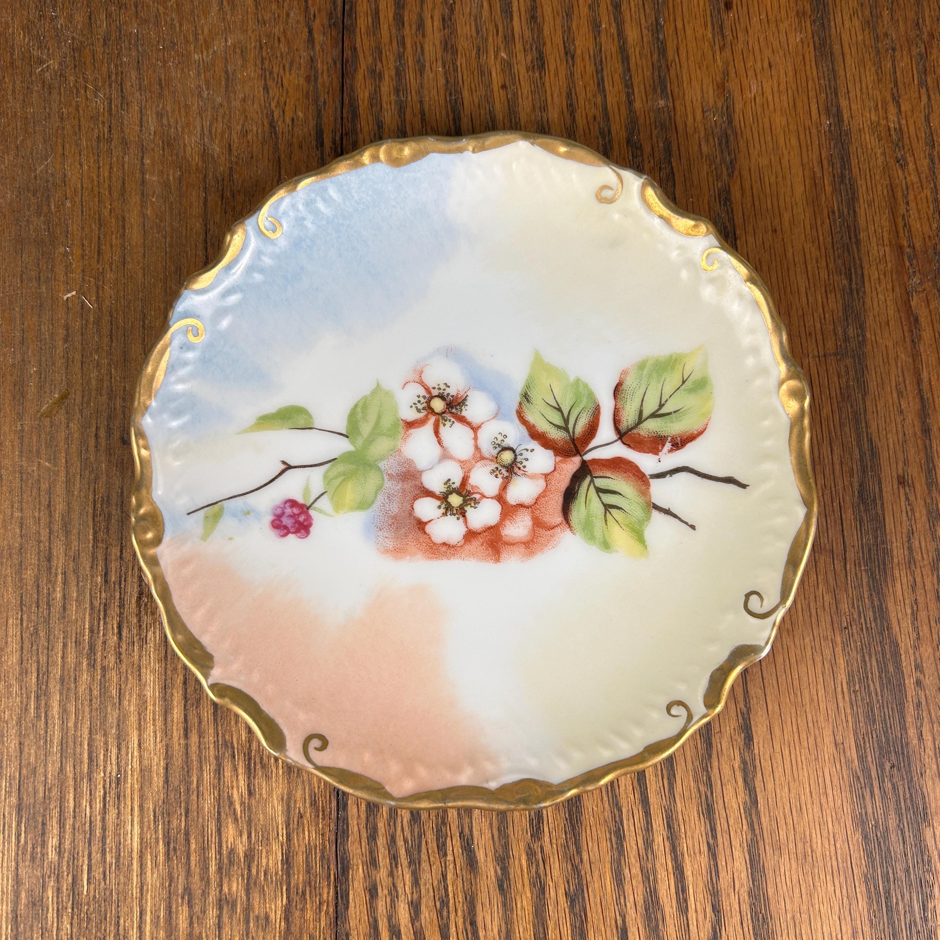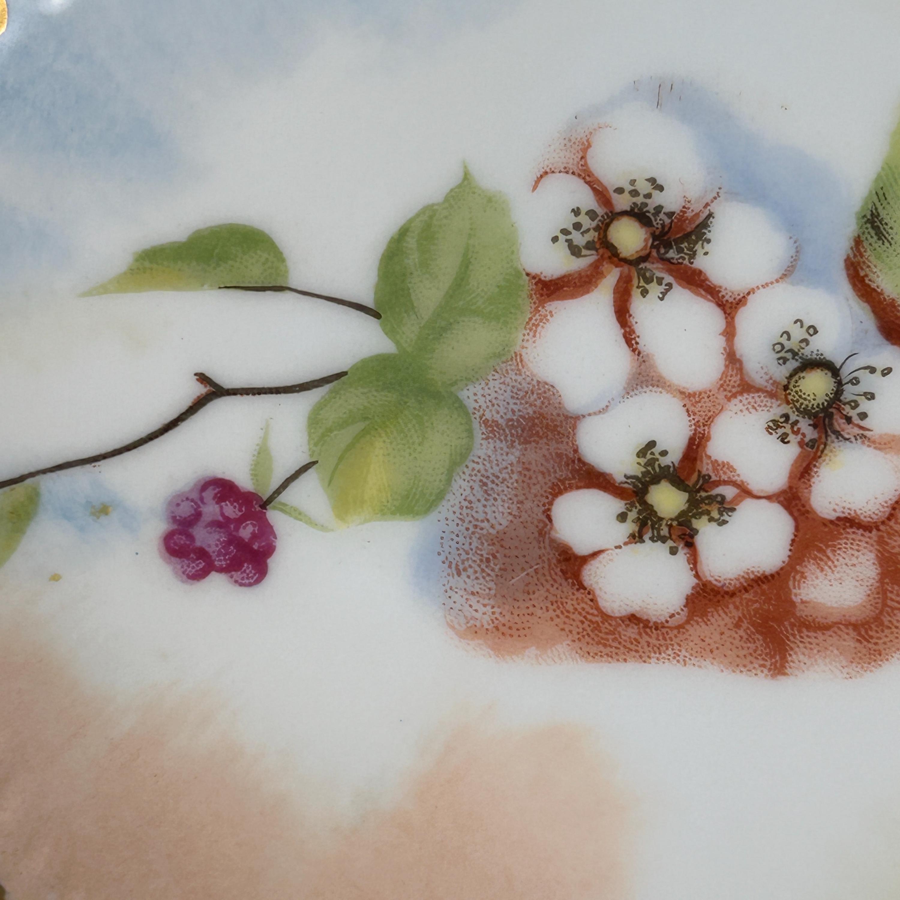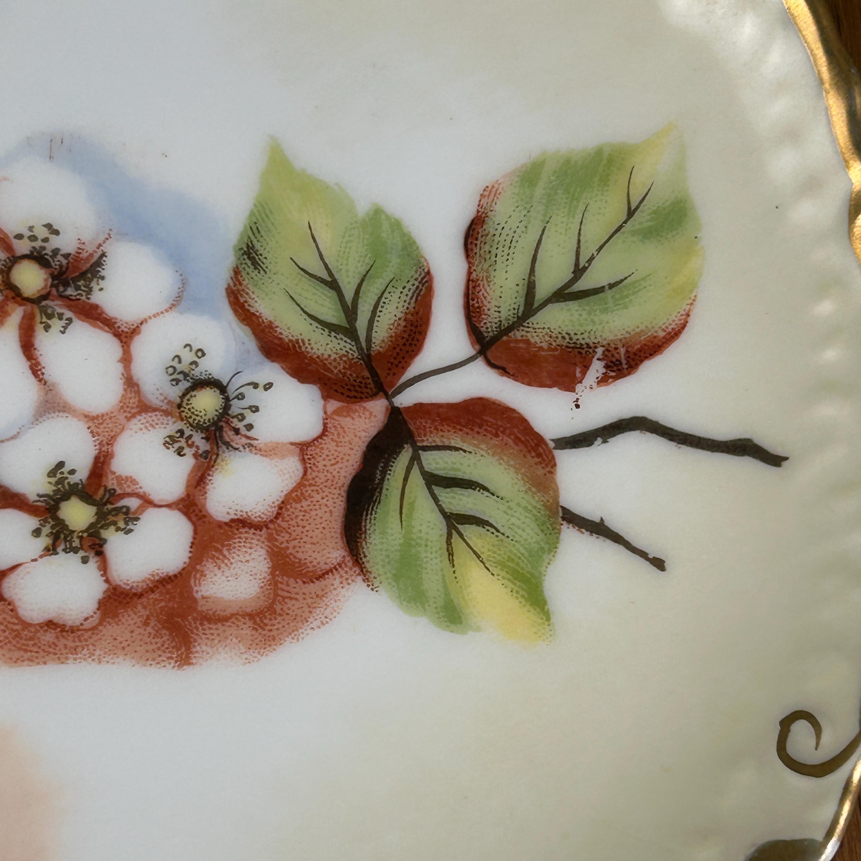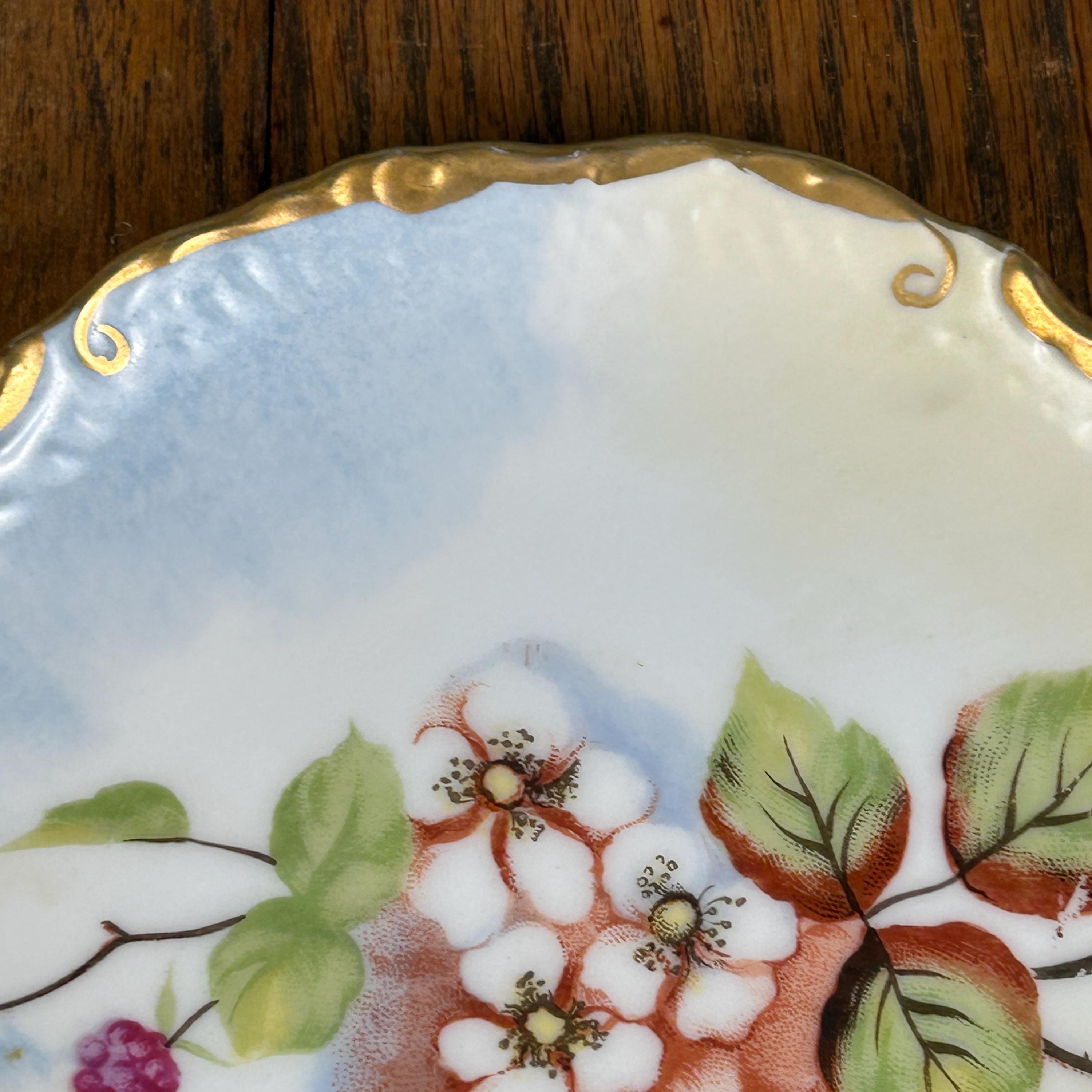 This beautiful antique porcelain plate features a delicate hand-painted blackberry floral design, accented with elegant gold trim along the rim.