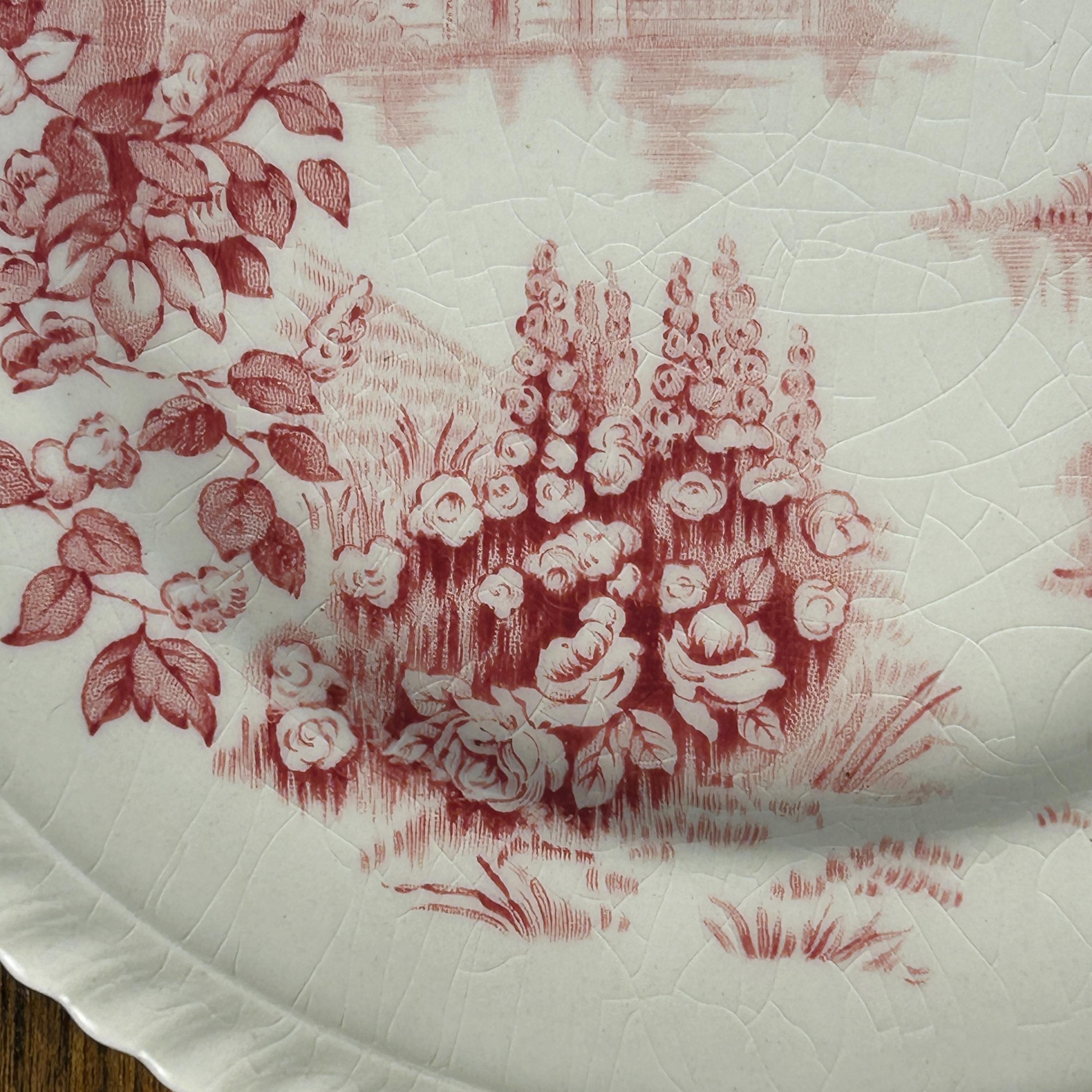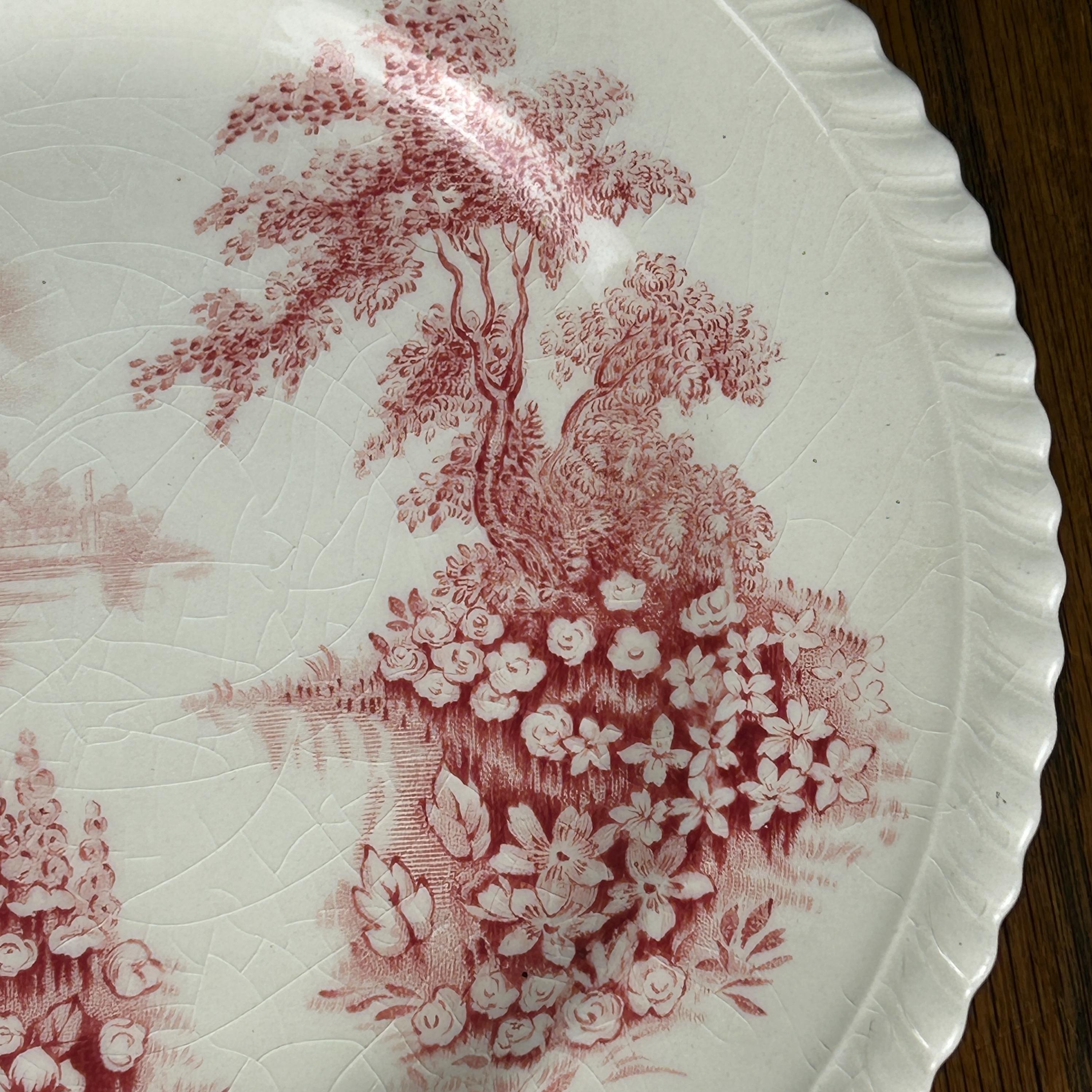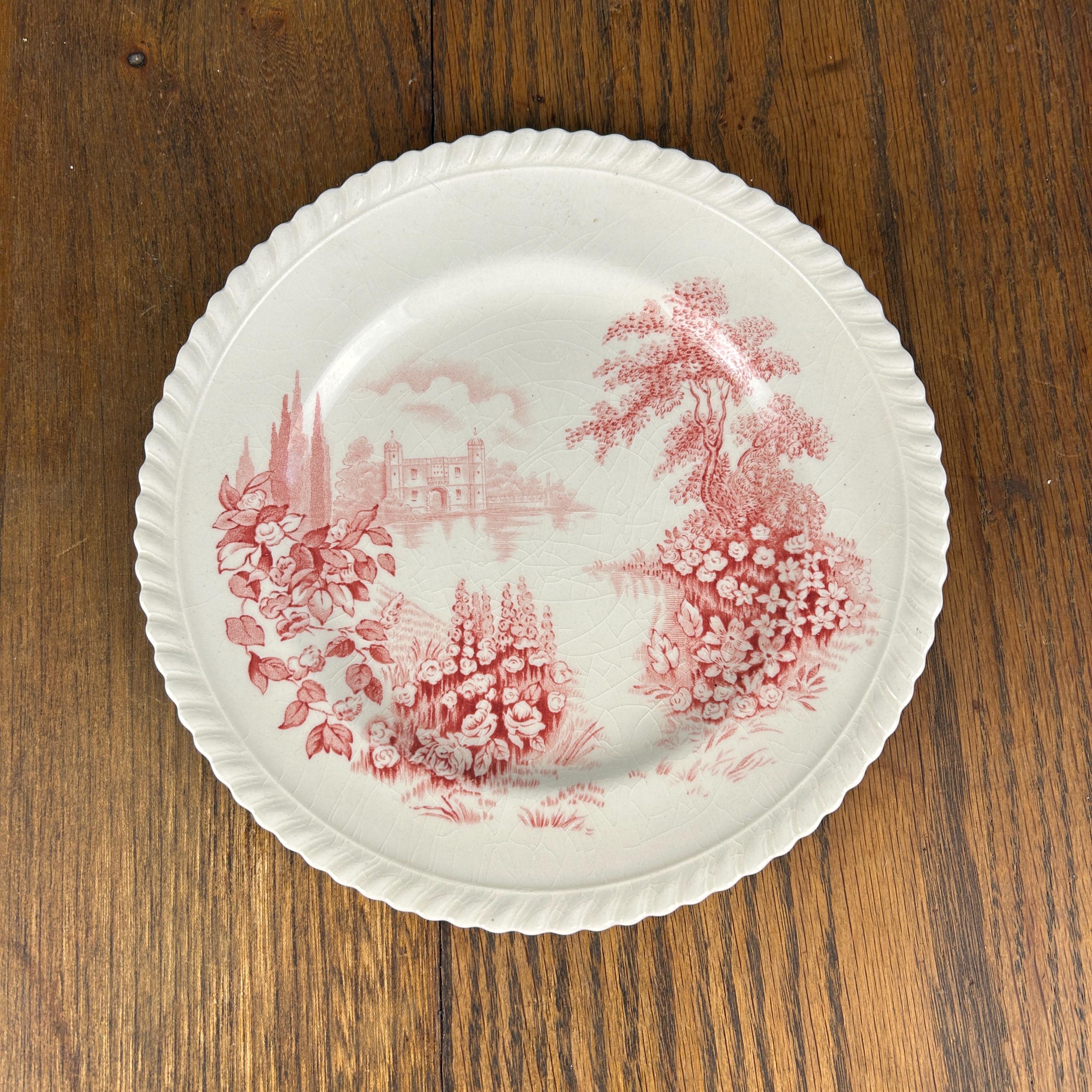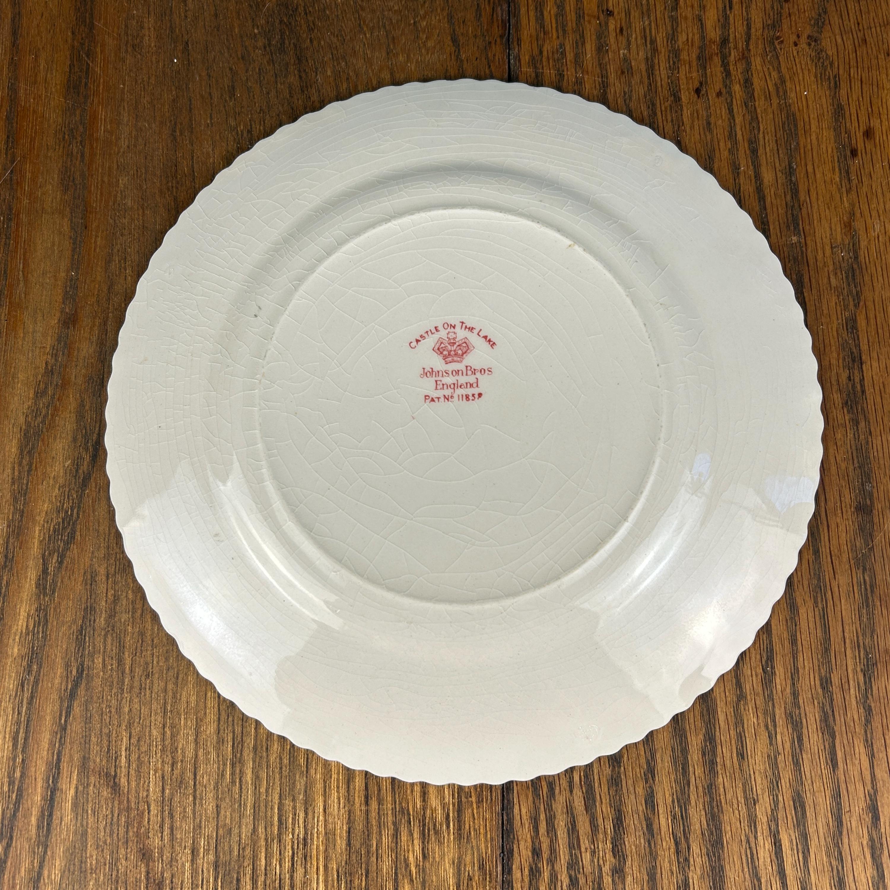 This beautiful vintage Johnson Brothers “Castle on the Lake” plate features a classic red/pink transferware design with a romantic countryside scene.