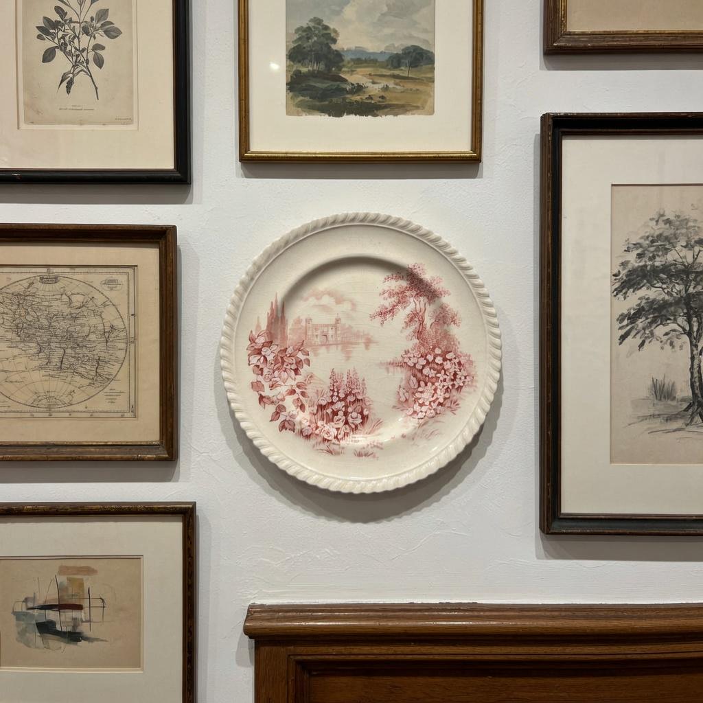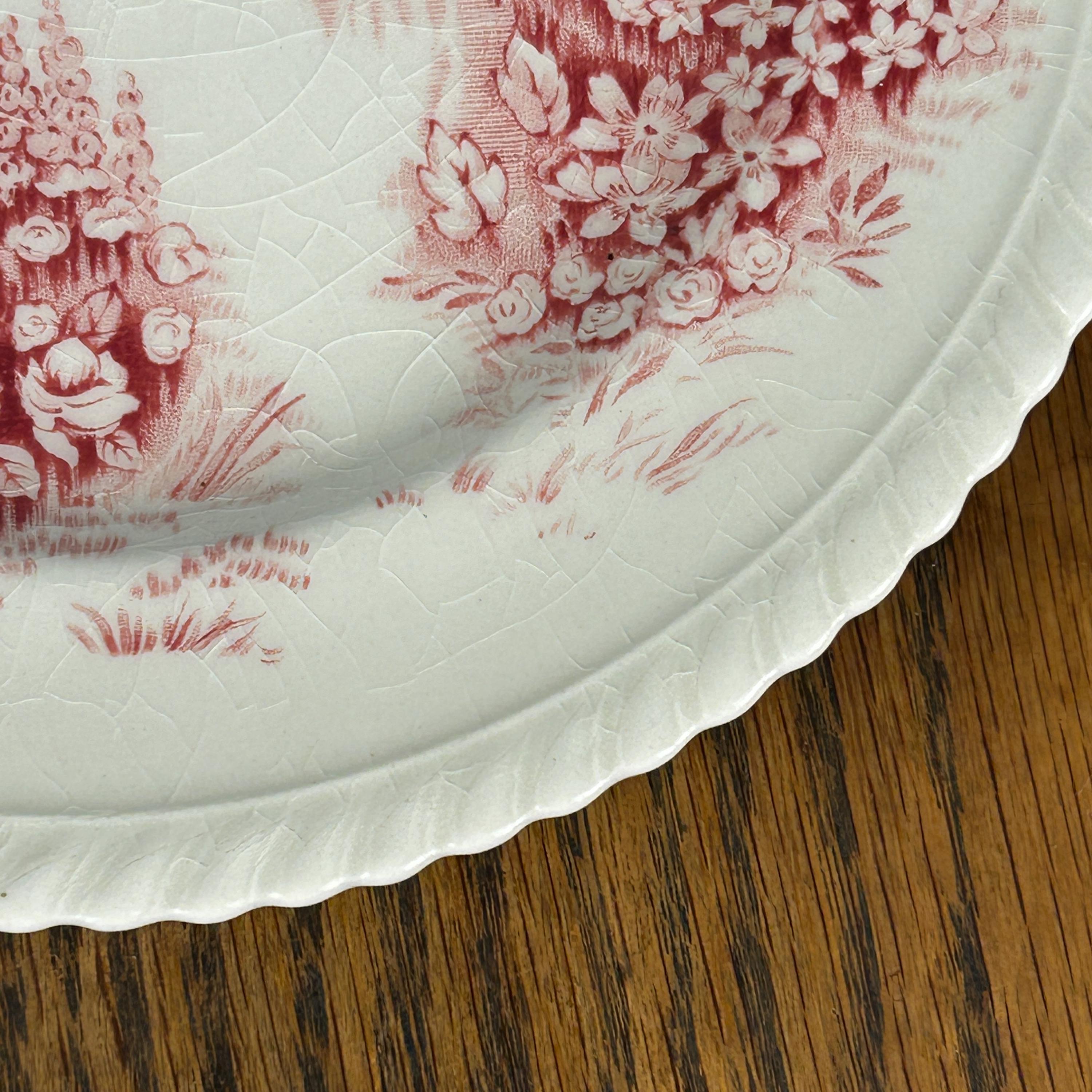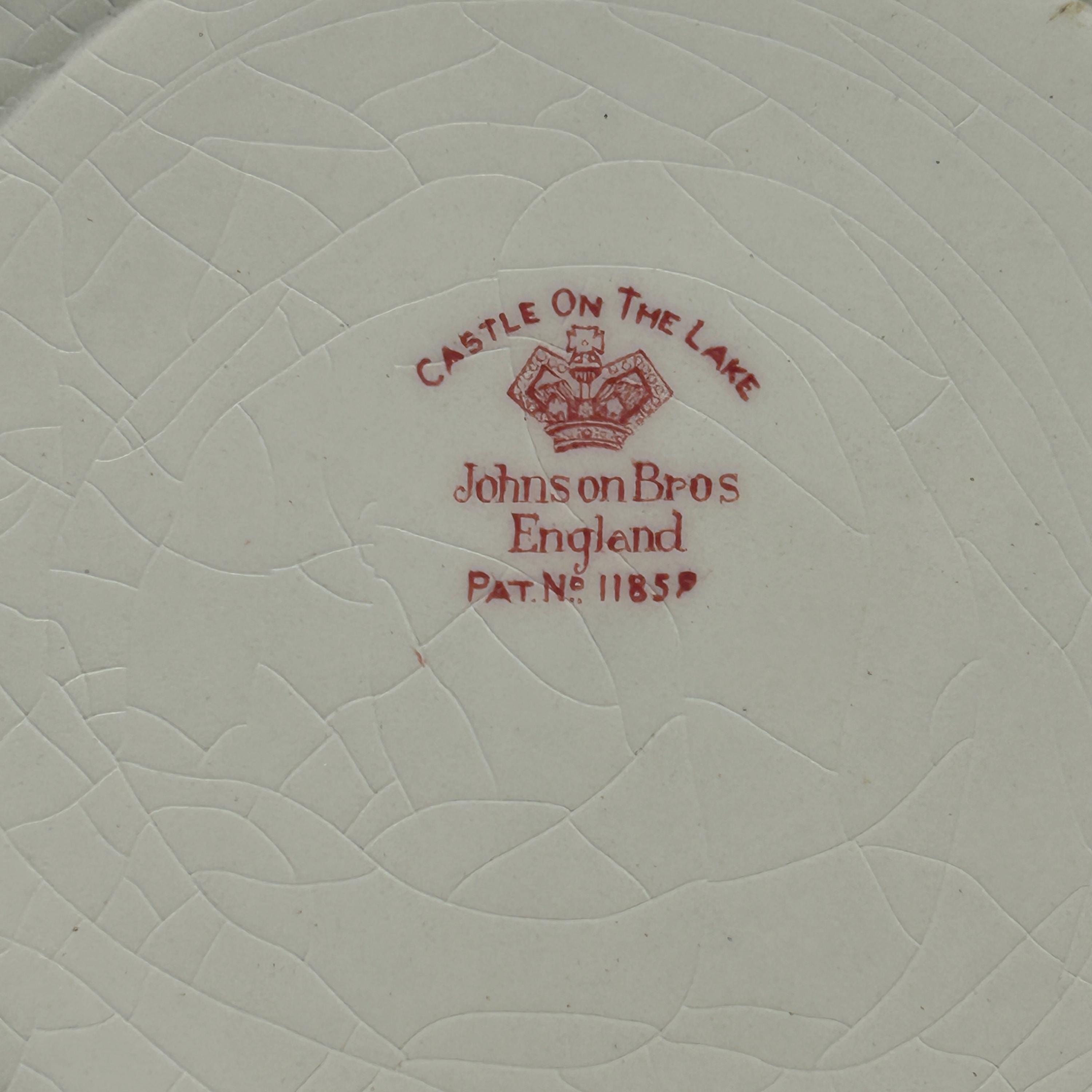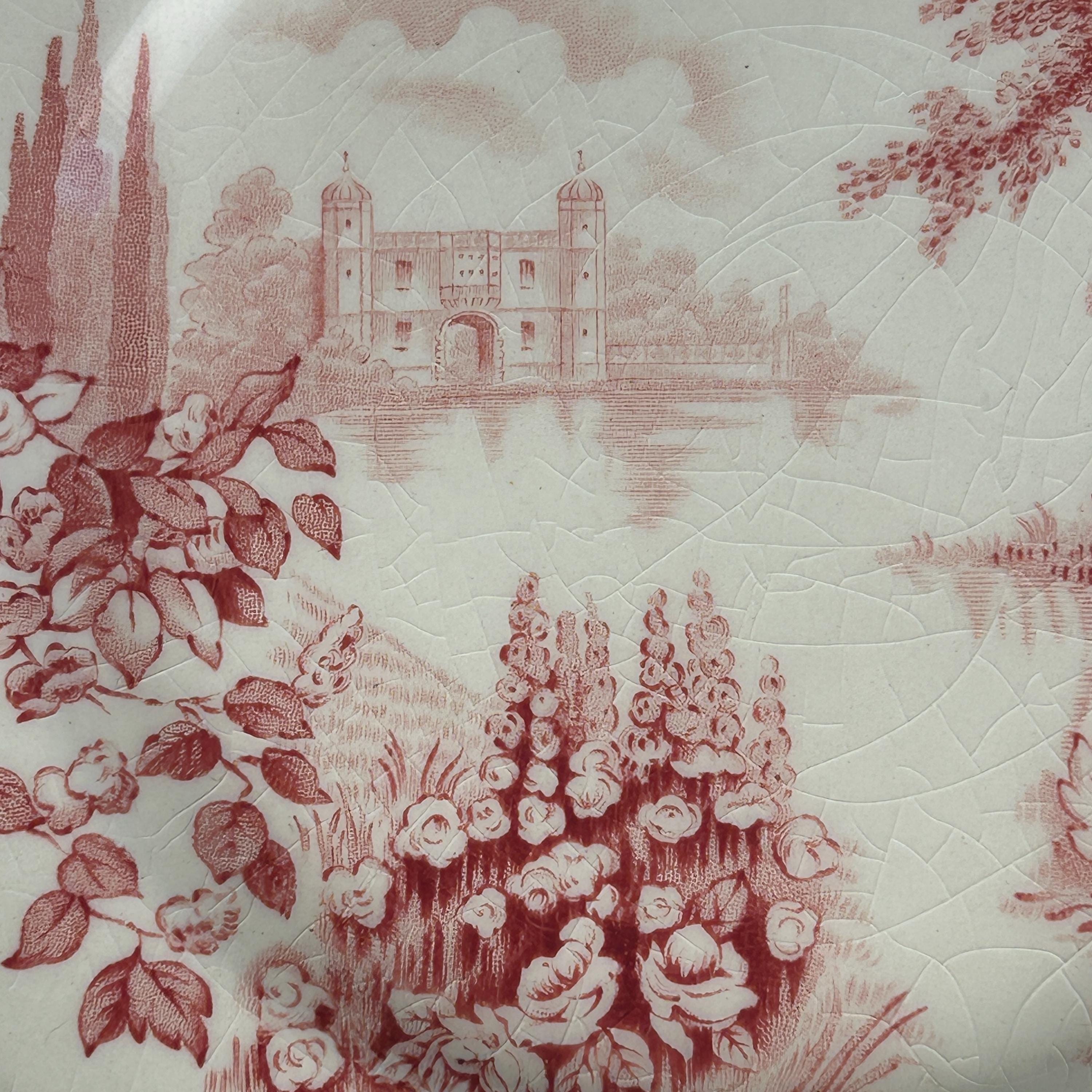 This beautiful vintage Johnson Brothers “Castle on the Lake” plate features a classic red/pink transferware design with a romantic countryside scene.