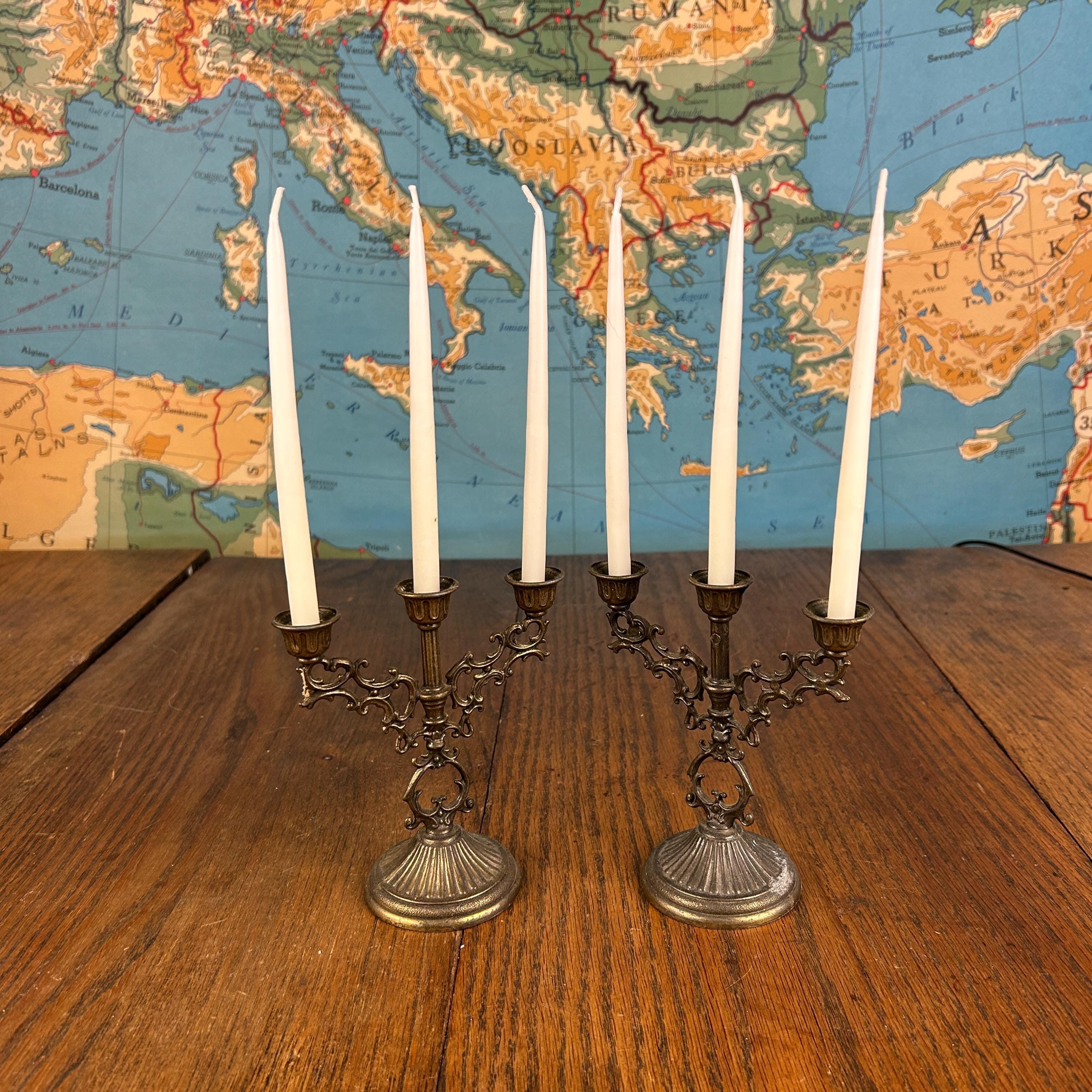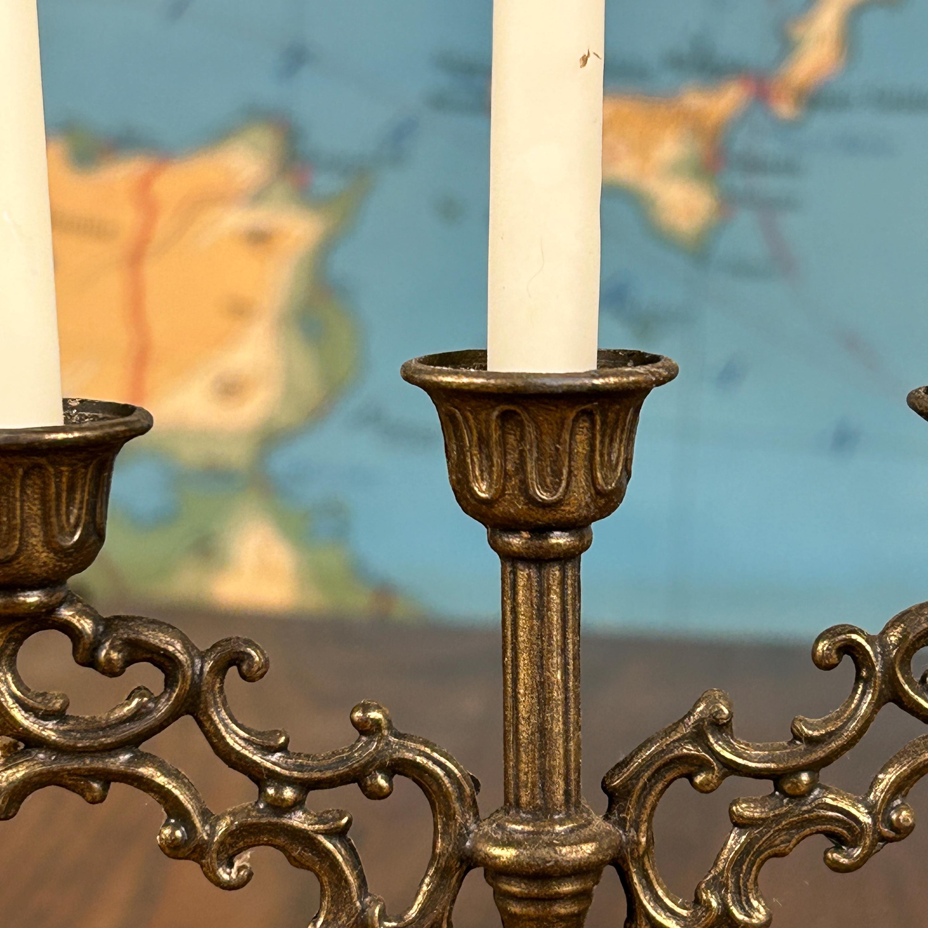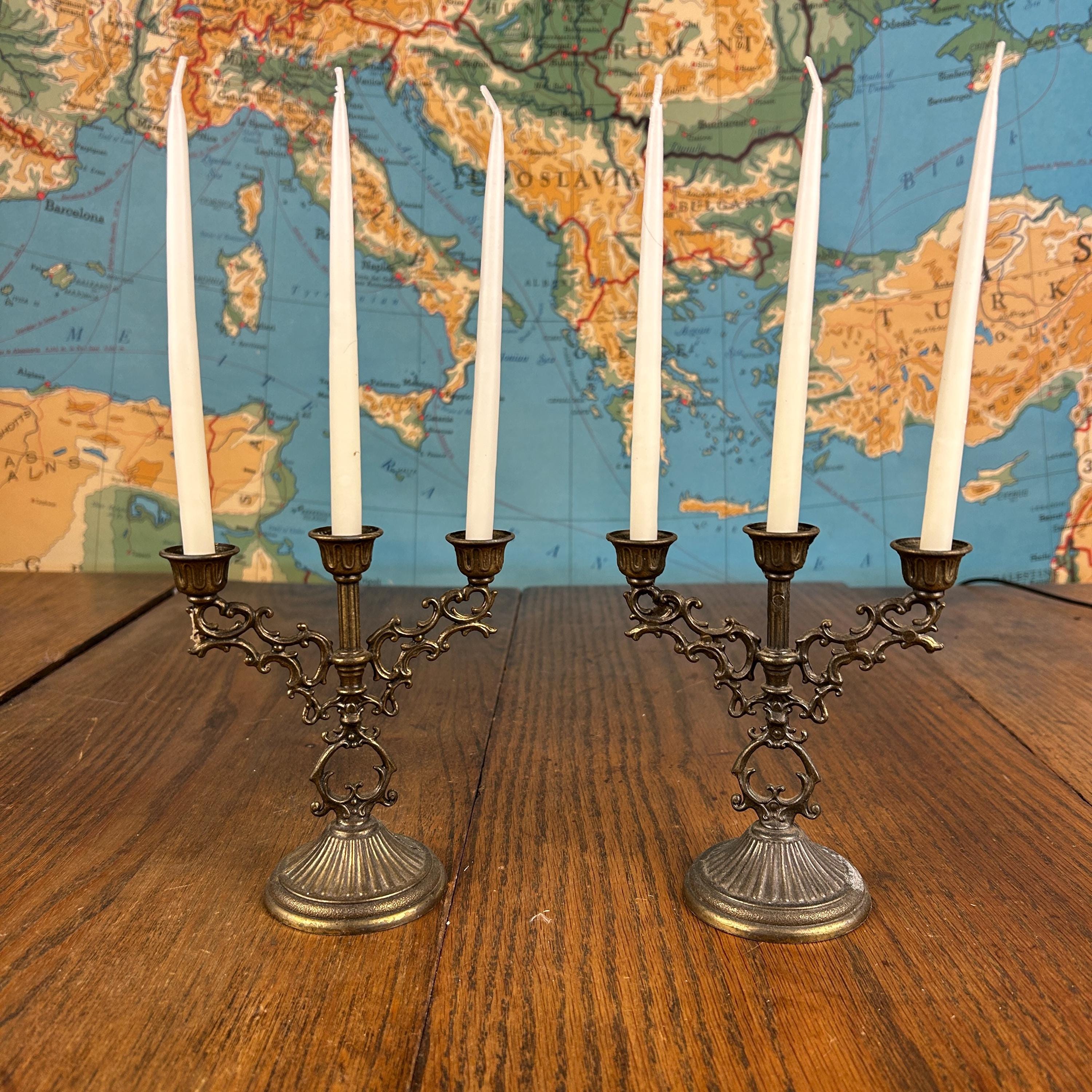 Each candelabrum holds three taper candles, creating a balanced and classic silhouette that works beautifully on a dining table, mantel, or as part of a vintage vignette. The brass has developed a natural aged patina, adding warmth and authentic antique charm.