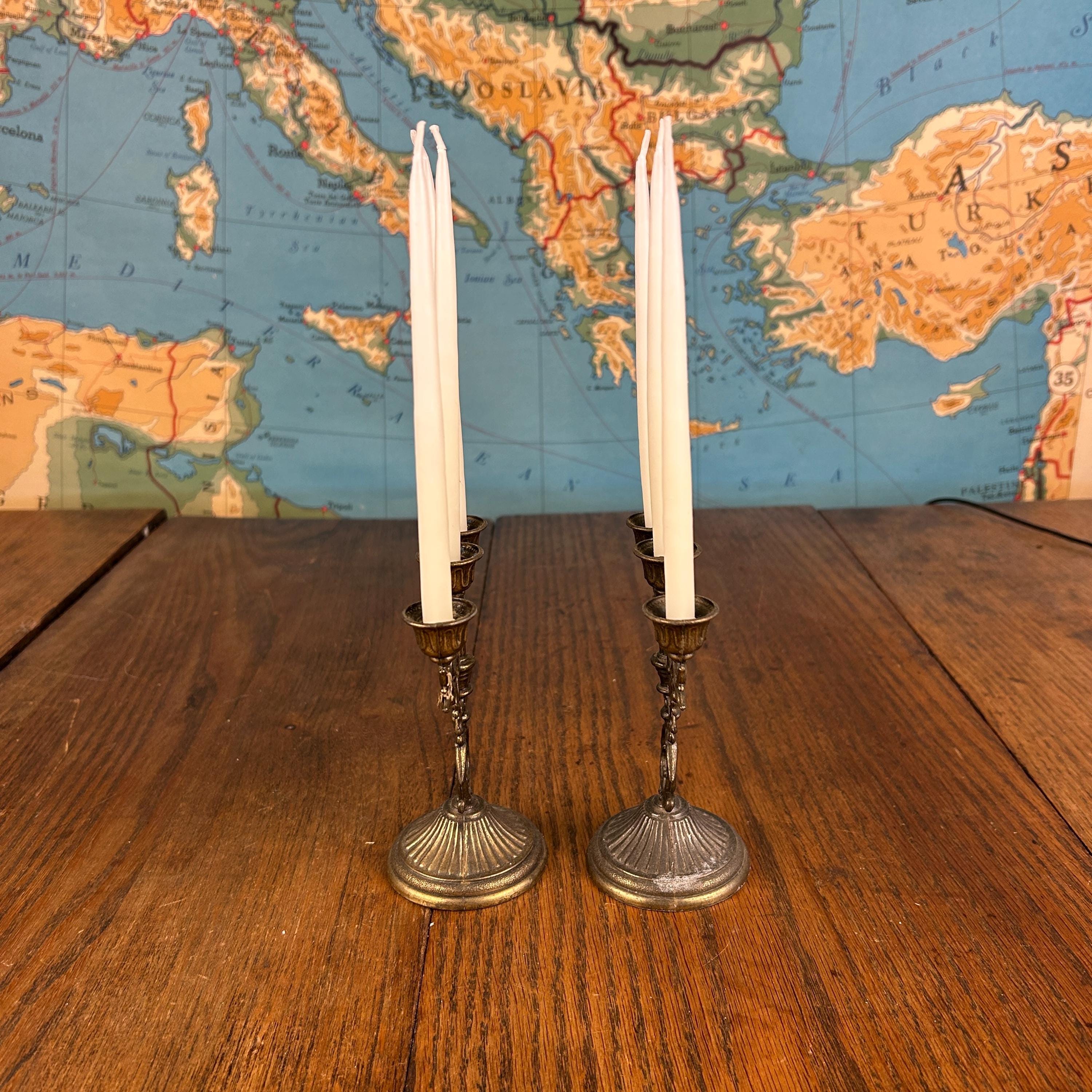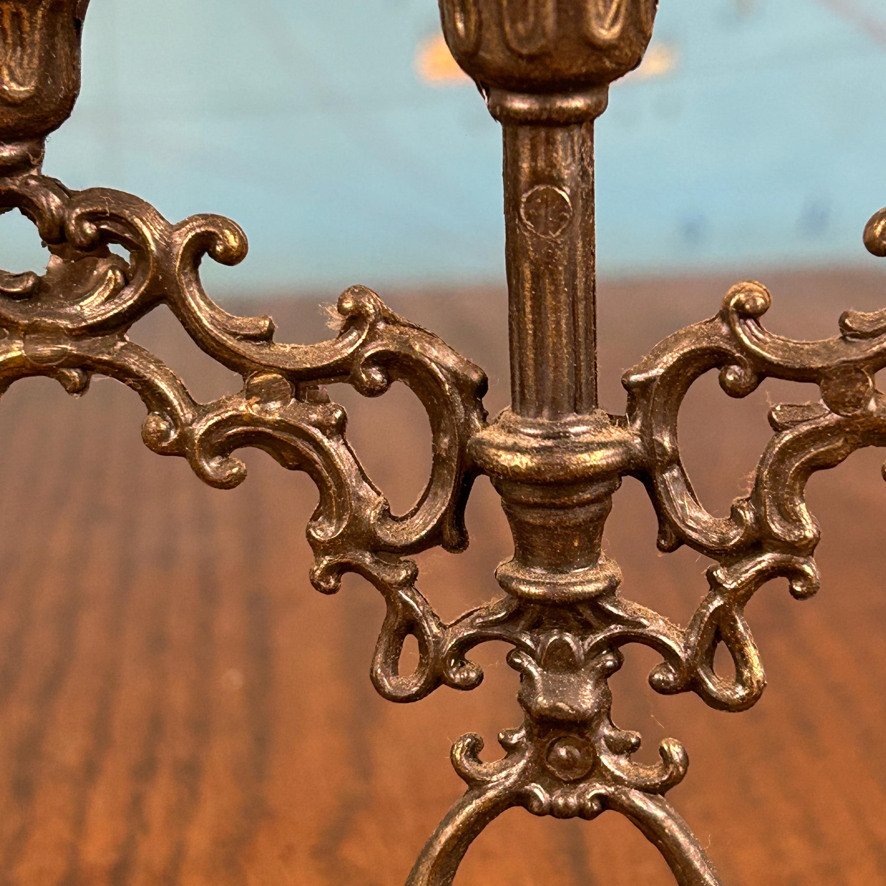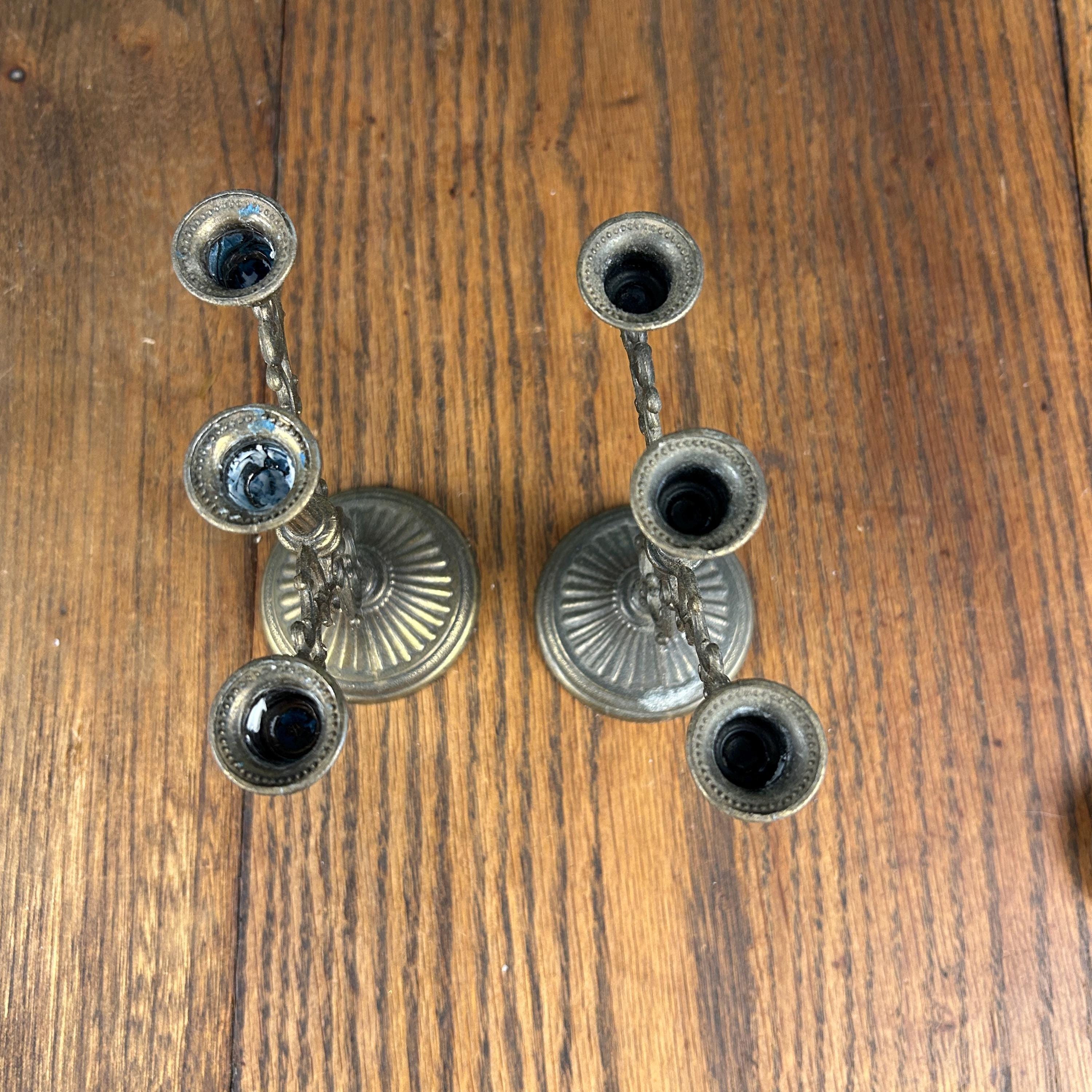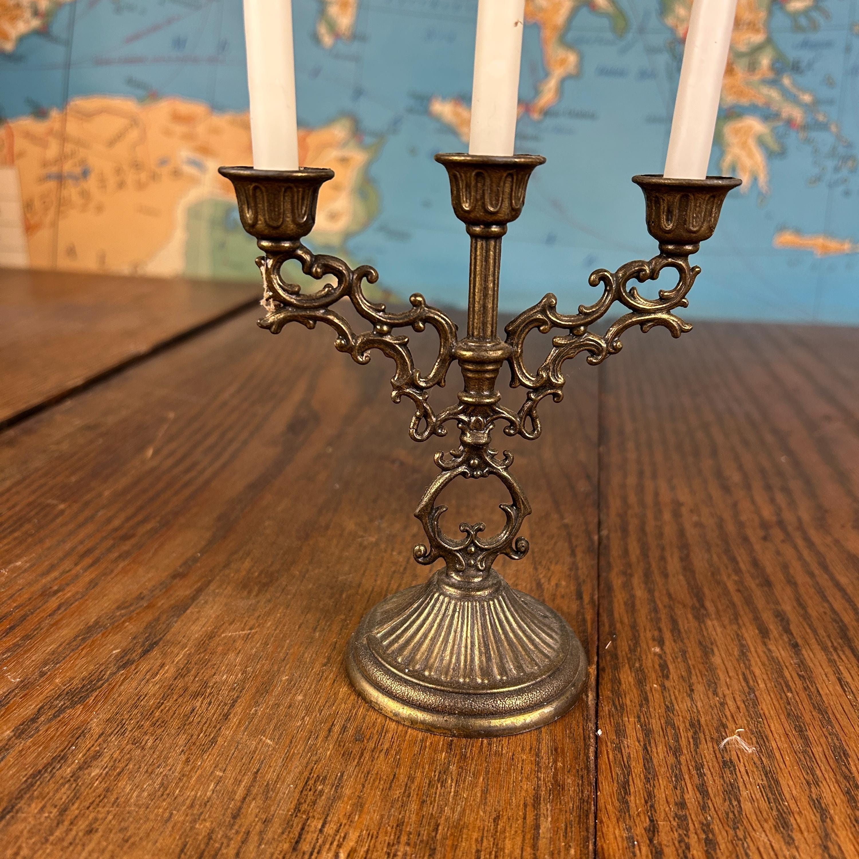 Each candelabrum holds three taper candles, creating a balanced and classic silhouette that works beautifully on a dining table, mantel, or as part of a vintage vignette. The brass has developed a natural aged patina, adding warmth and authentic antique charm.