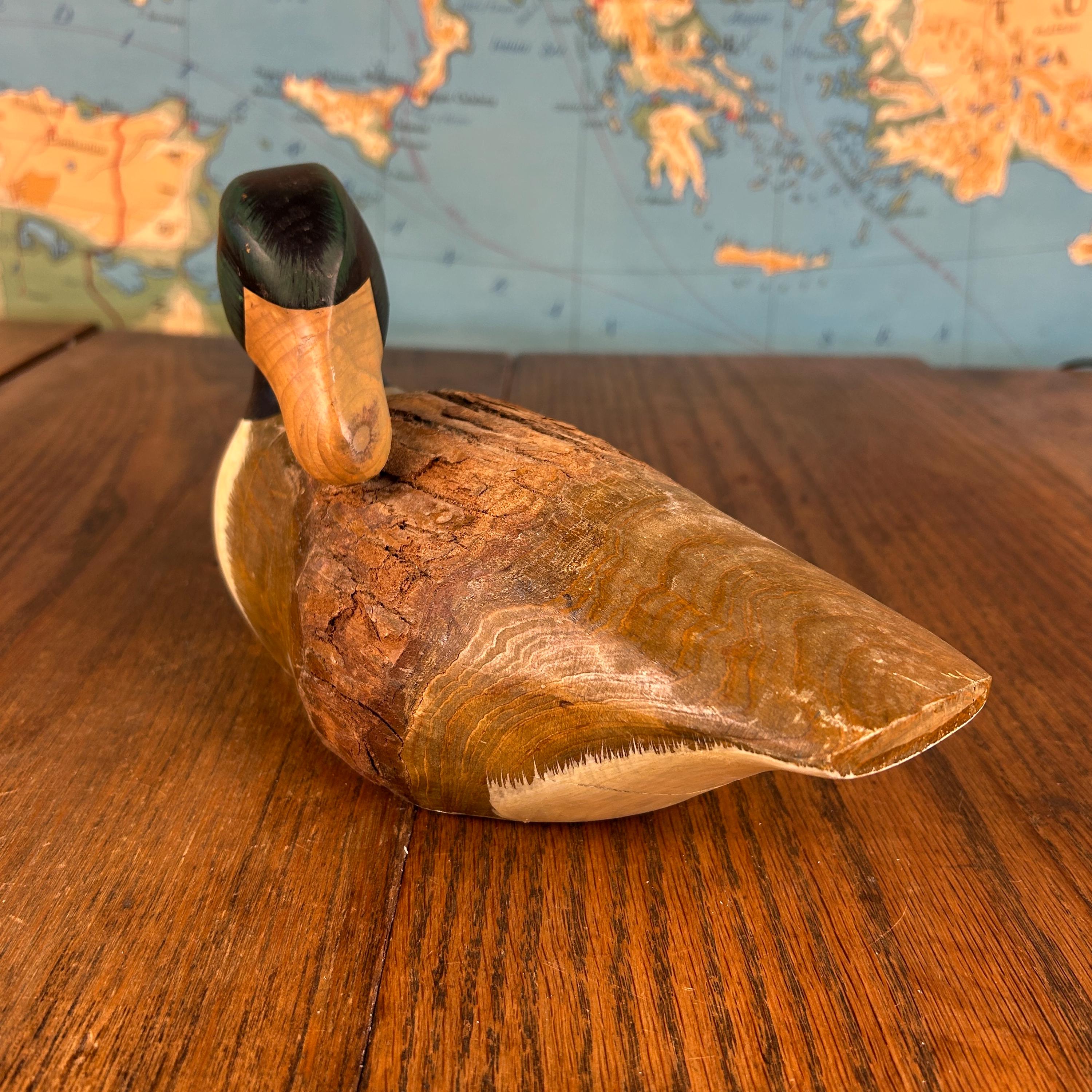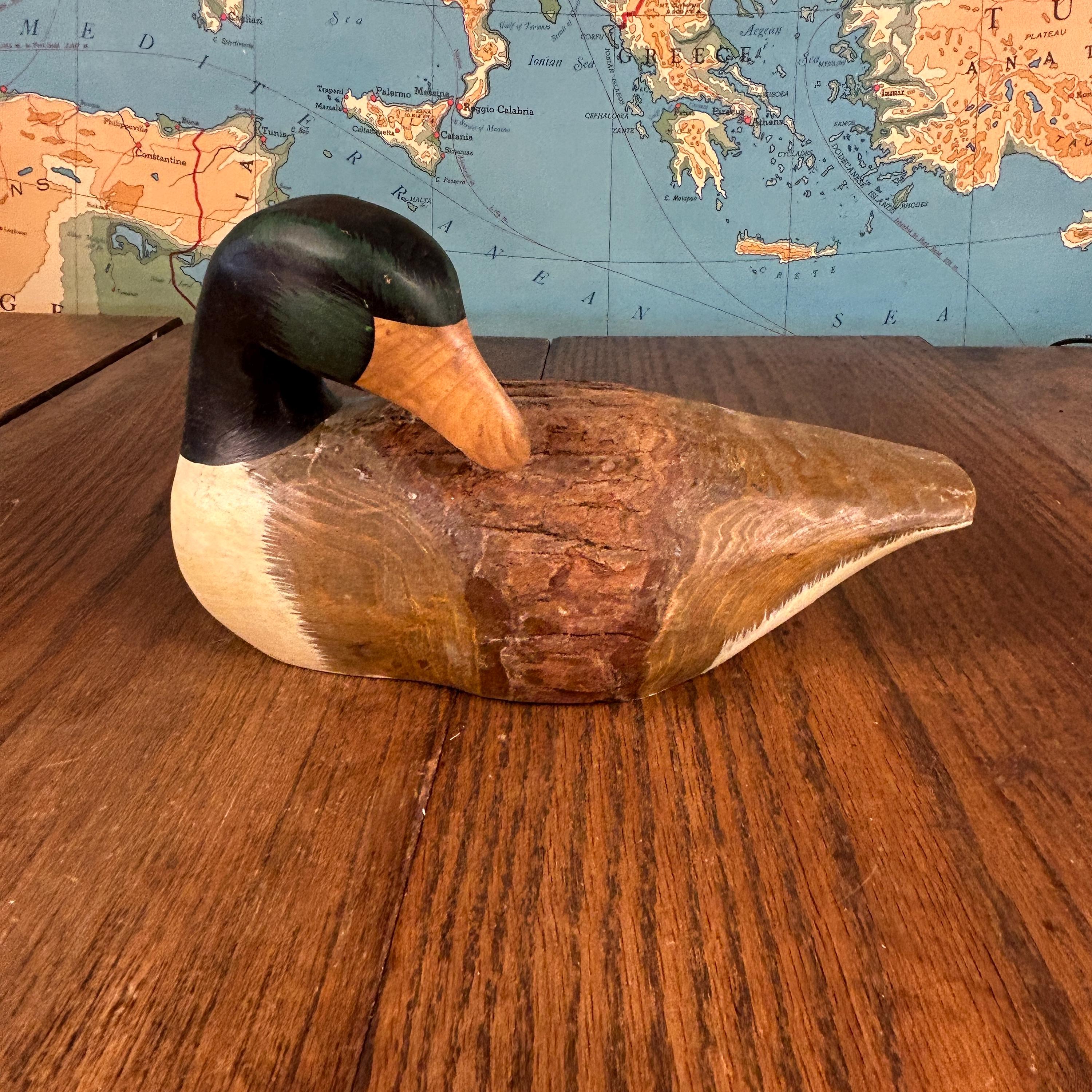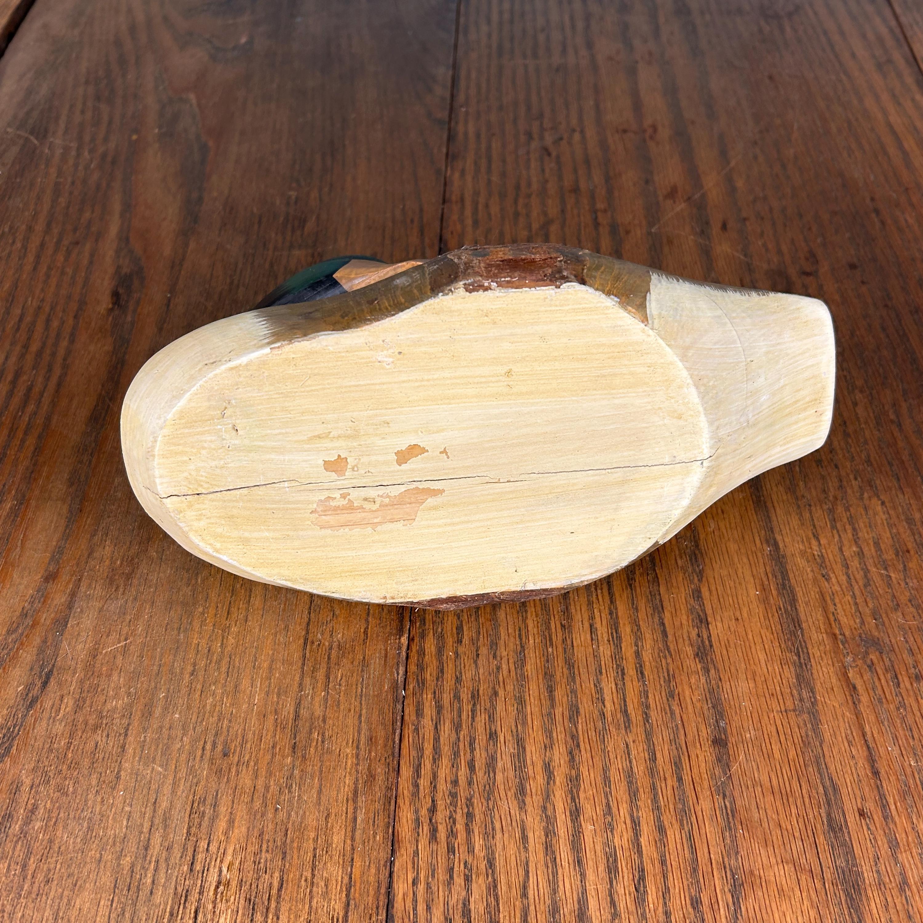 This charming vintage wooden duck decoy is a beautifully hand-carved and painted piece, prized for its rustic character and folk art appeal.