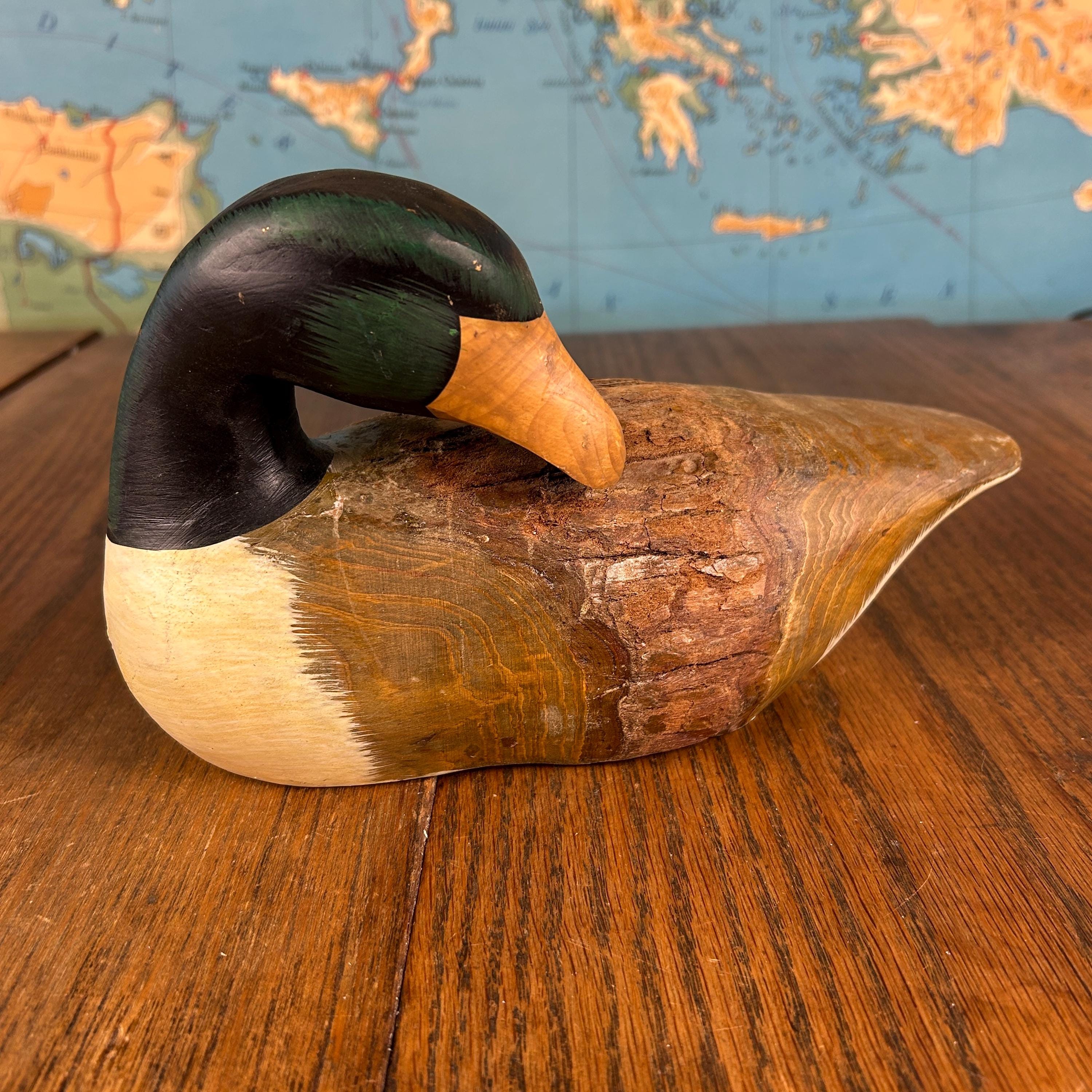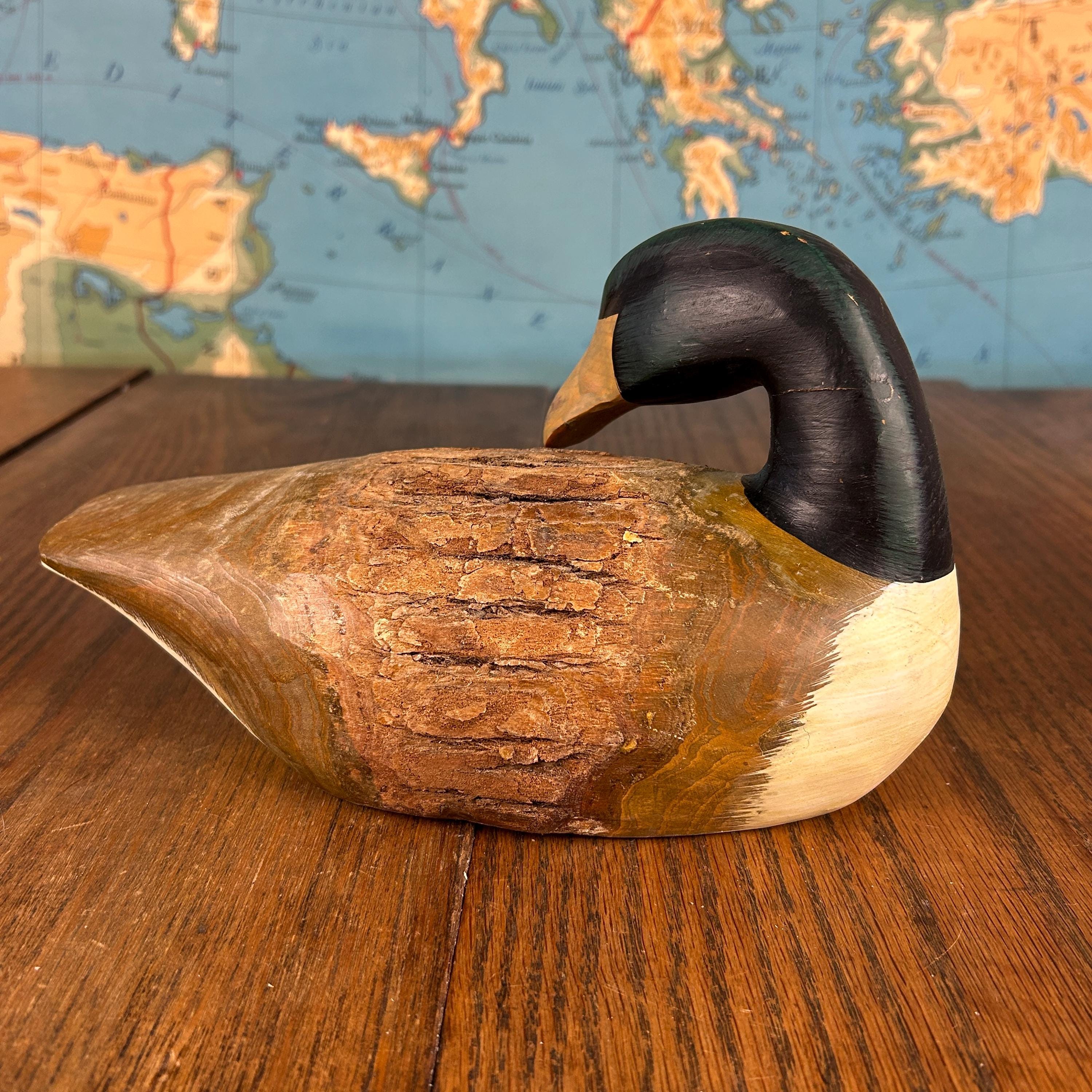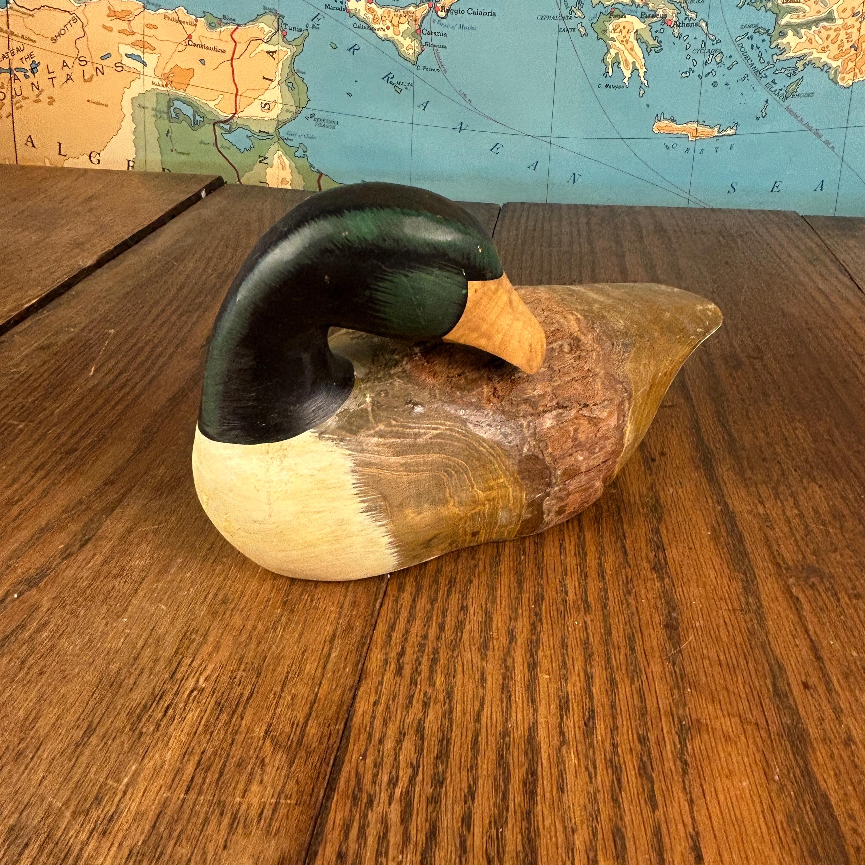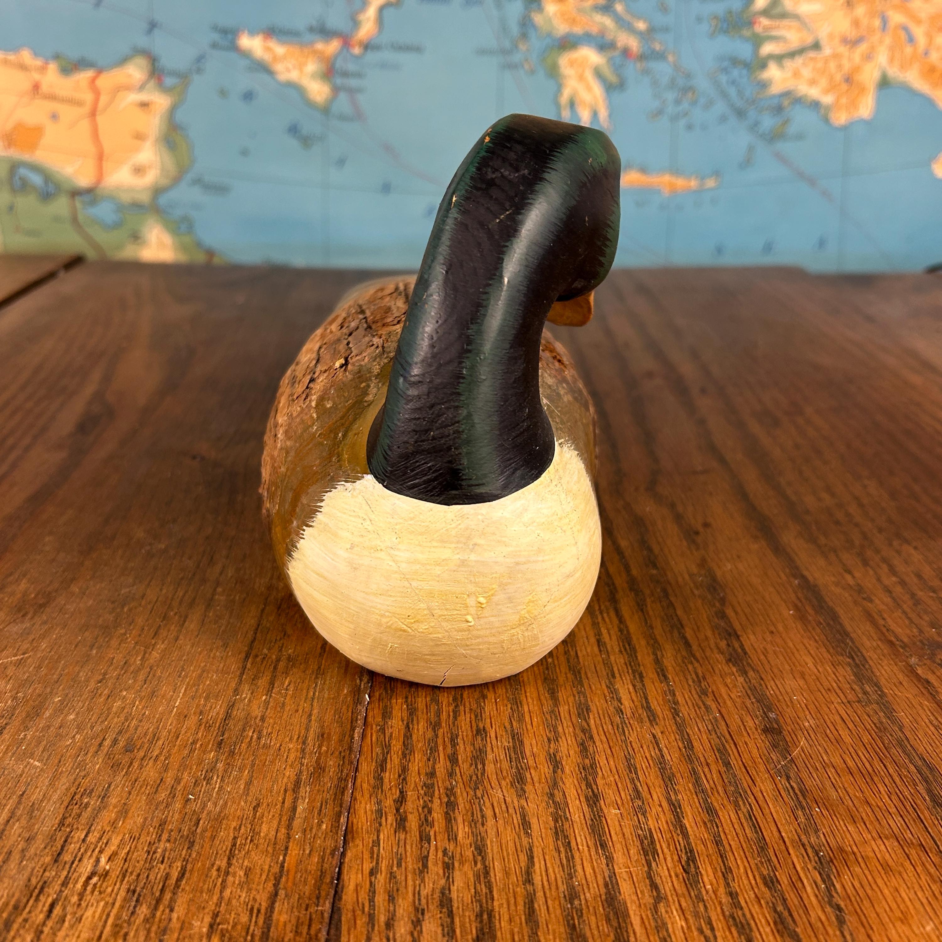 This charming vintage wooden duck decoy is a beautifully hand-carved and painted piece, prized for its rustic character and folk art appeal.