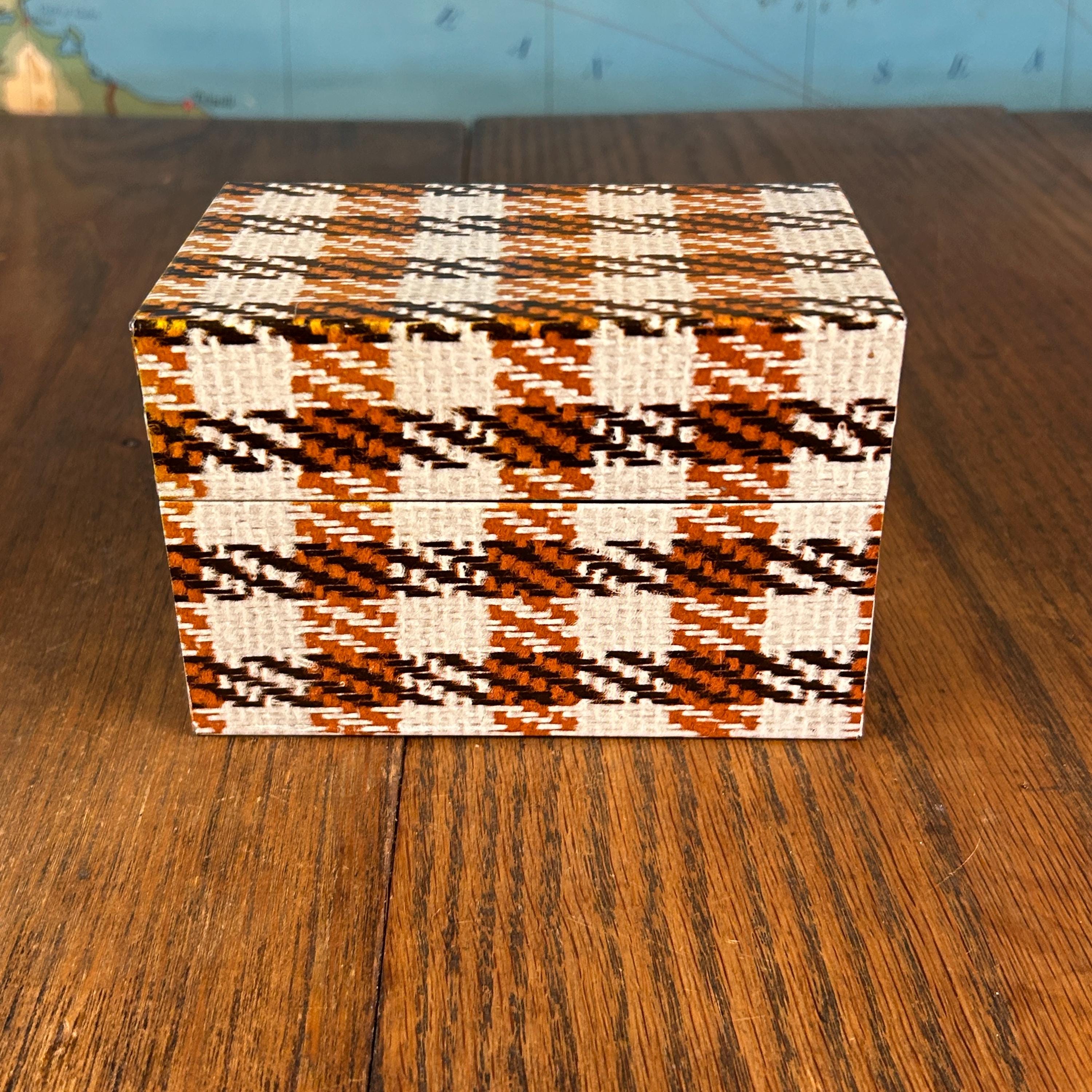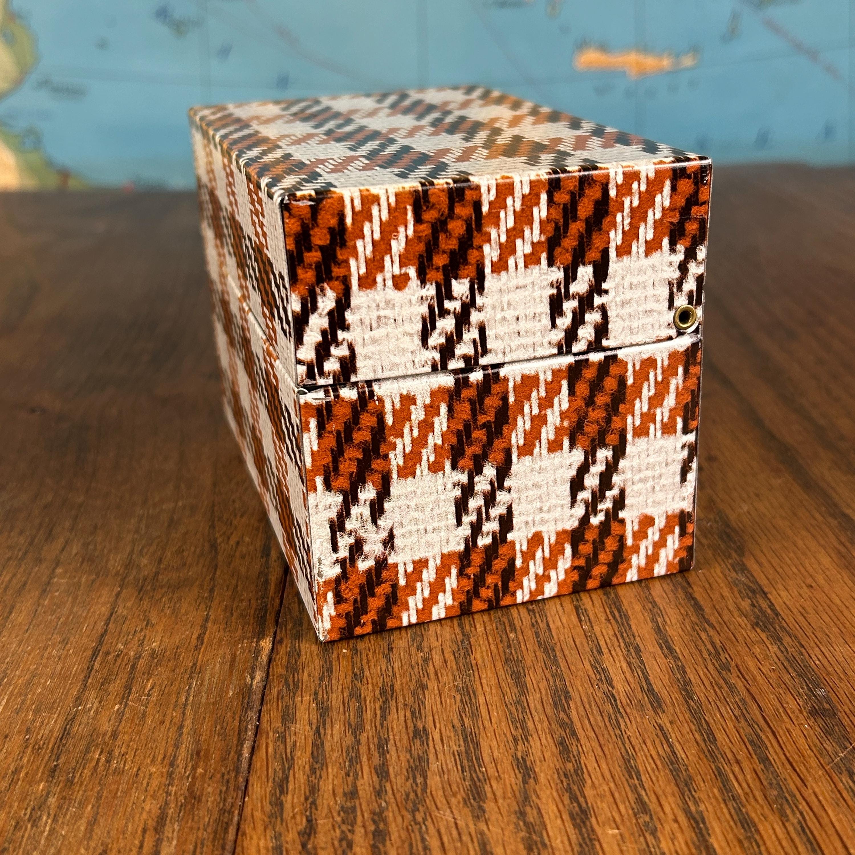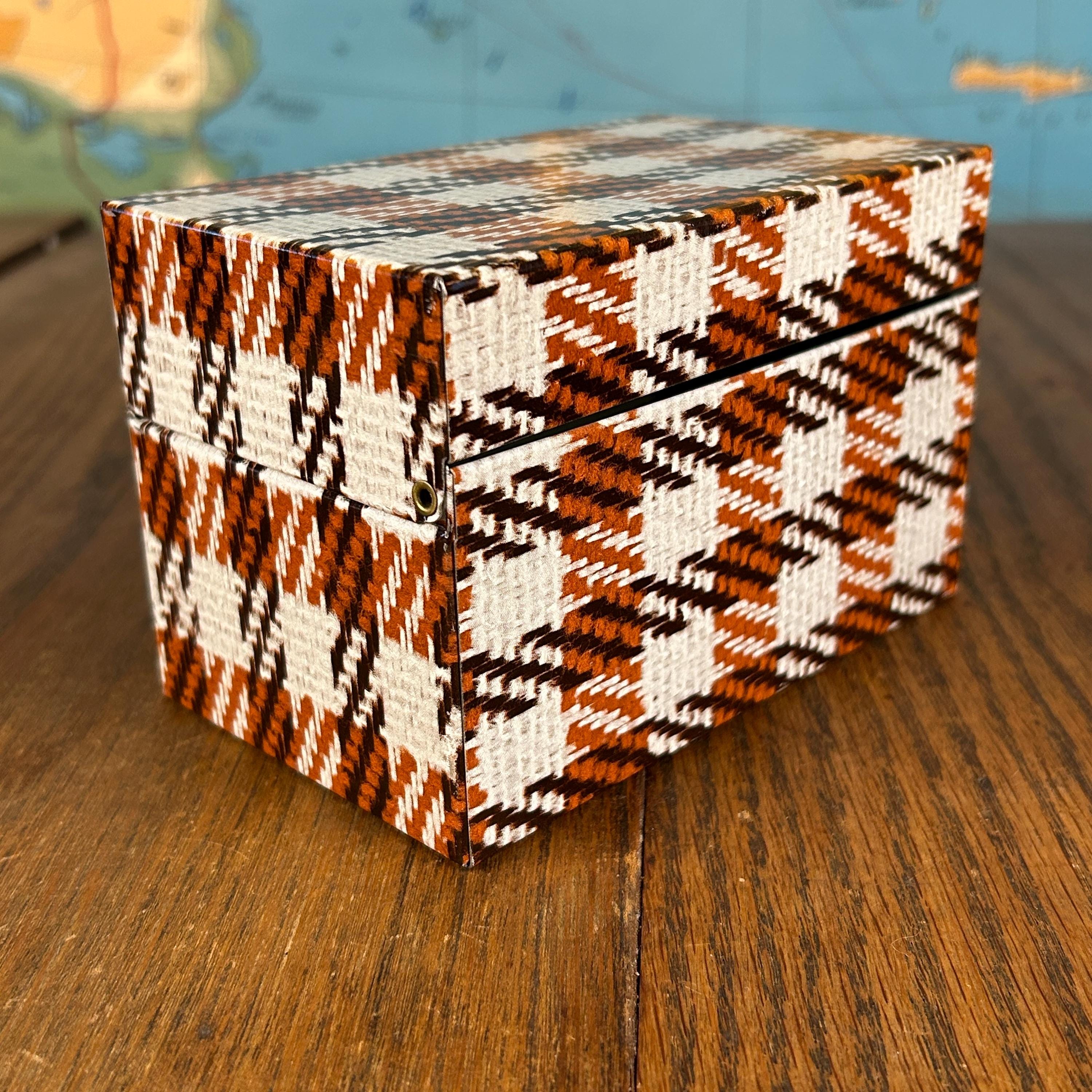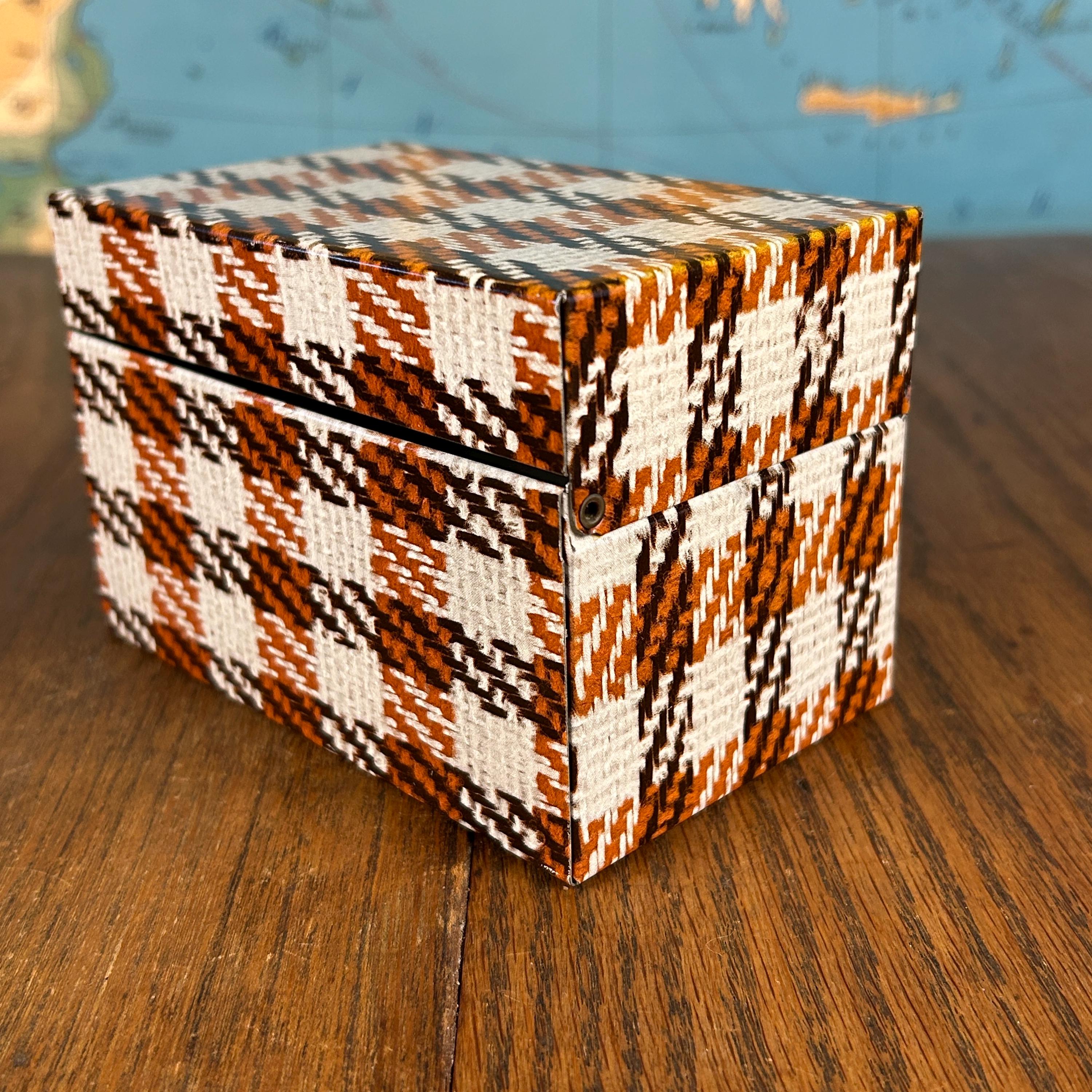 This charming vintage Syndicate Manufacturing Company recipe box features a classic brown and white houndstooth plaid pattern, perfect for adding retro style to your kitchen.