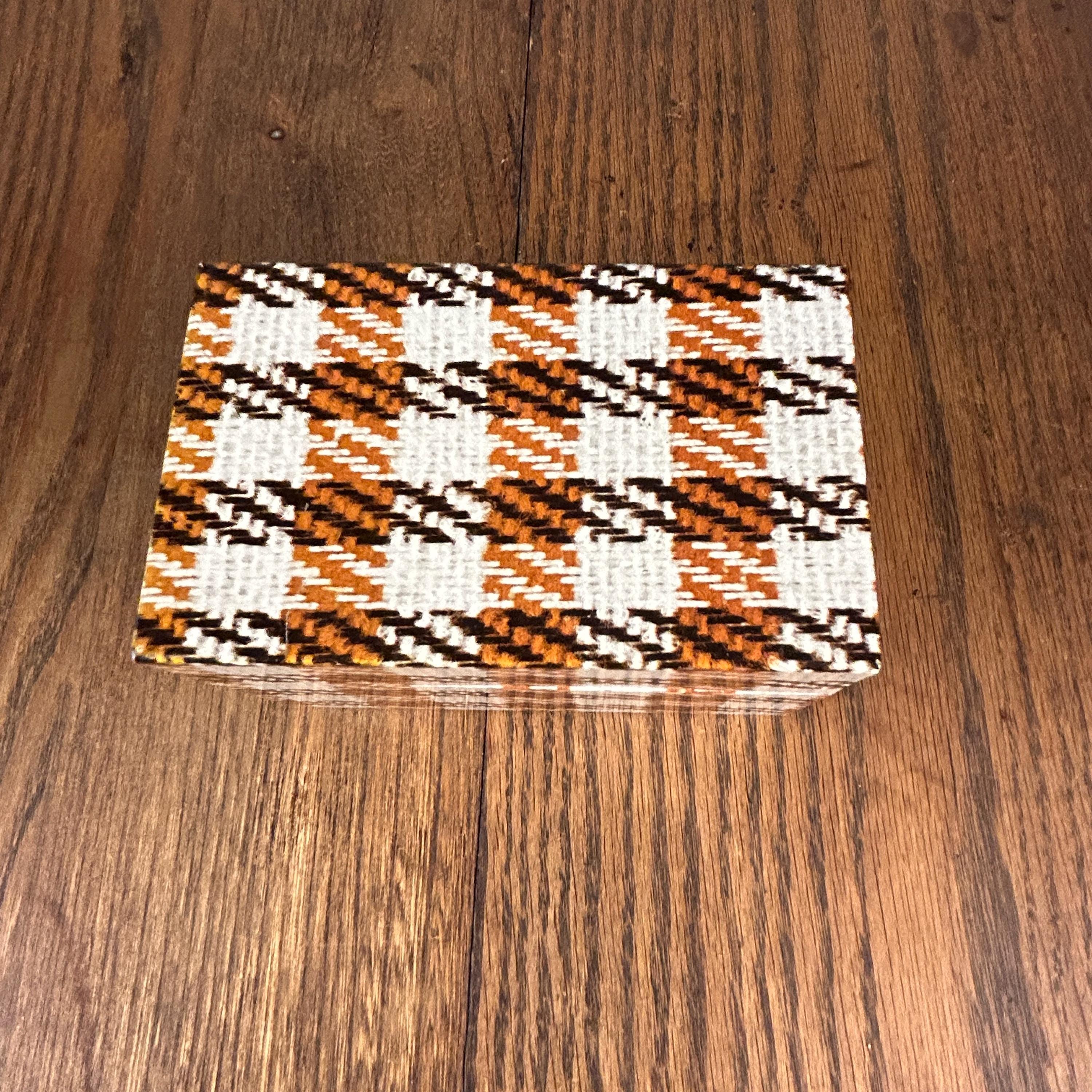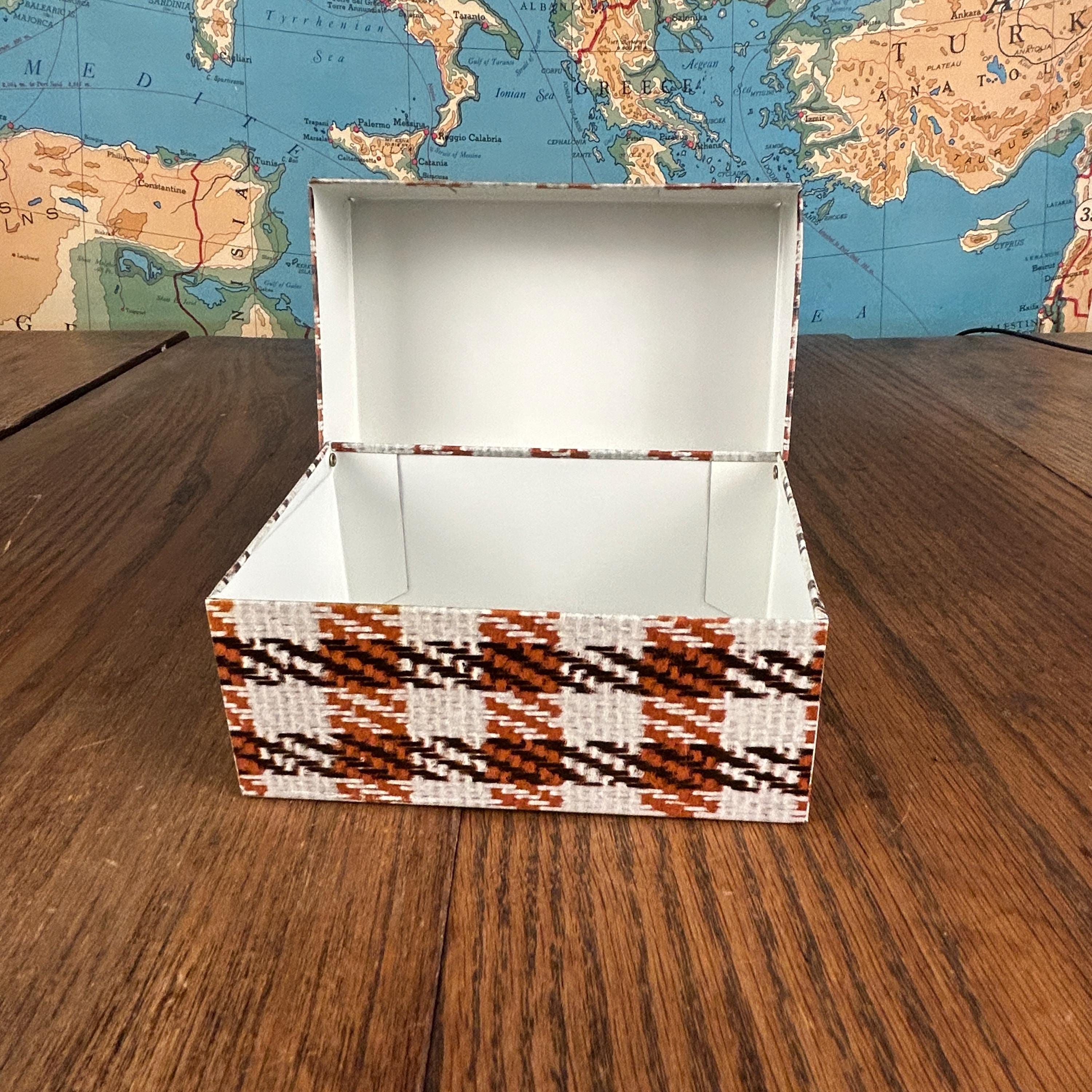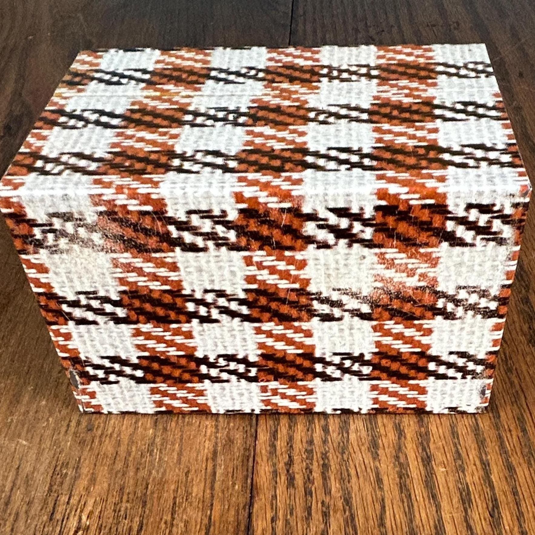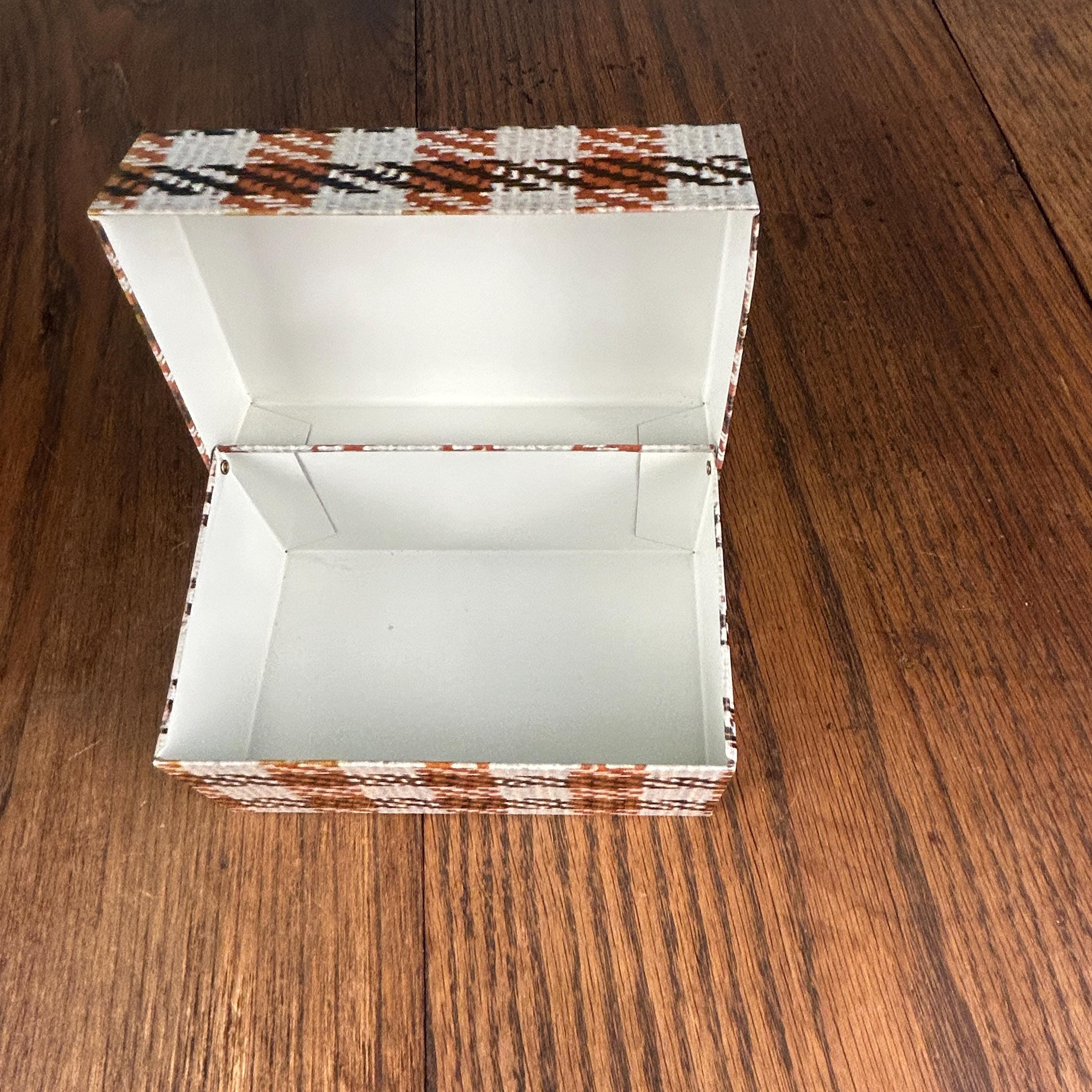 This charming vintage Syndicate Manufacturing Company recipe box features a classic brown and white houndstooth plaid pattern, perfect for adding retro style to your kitchen.