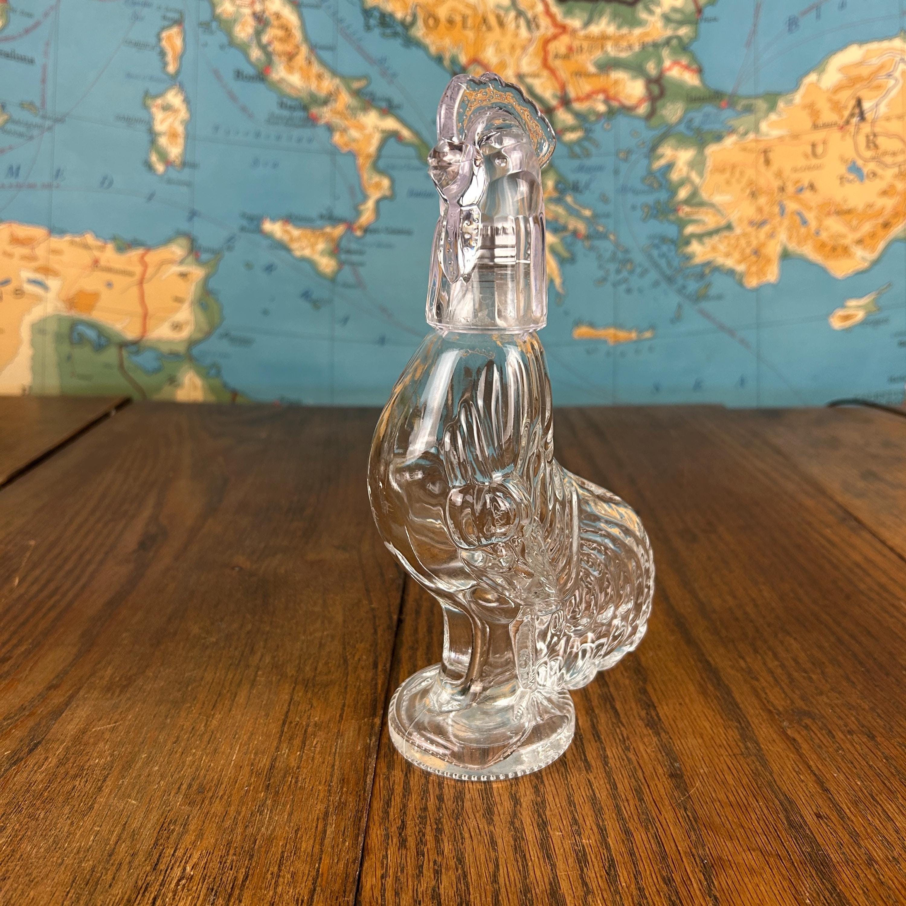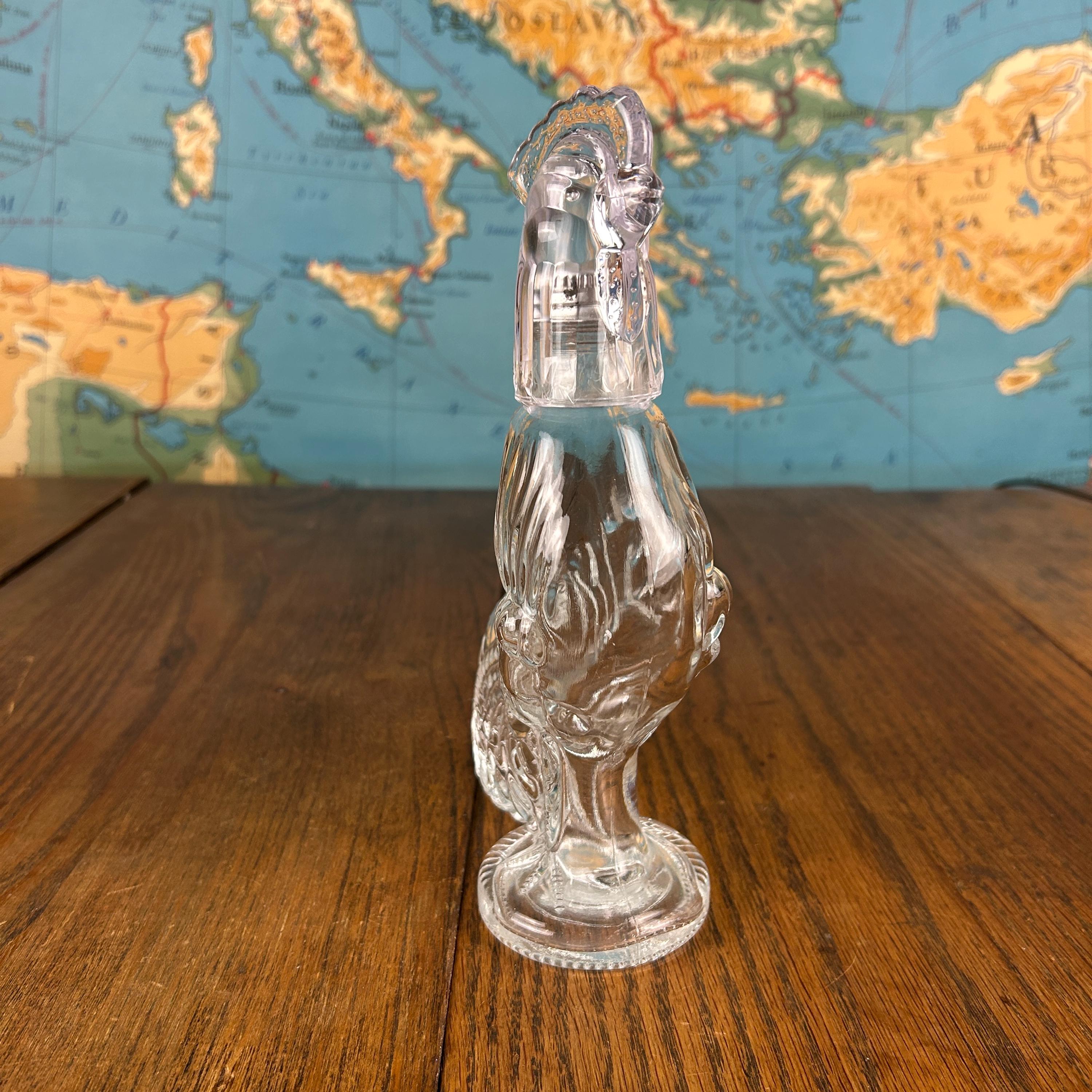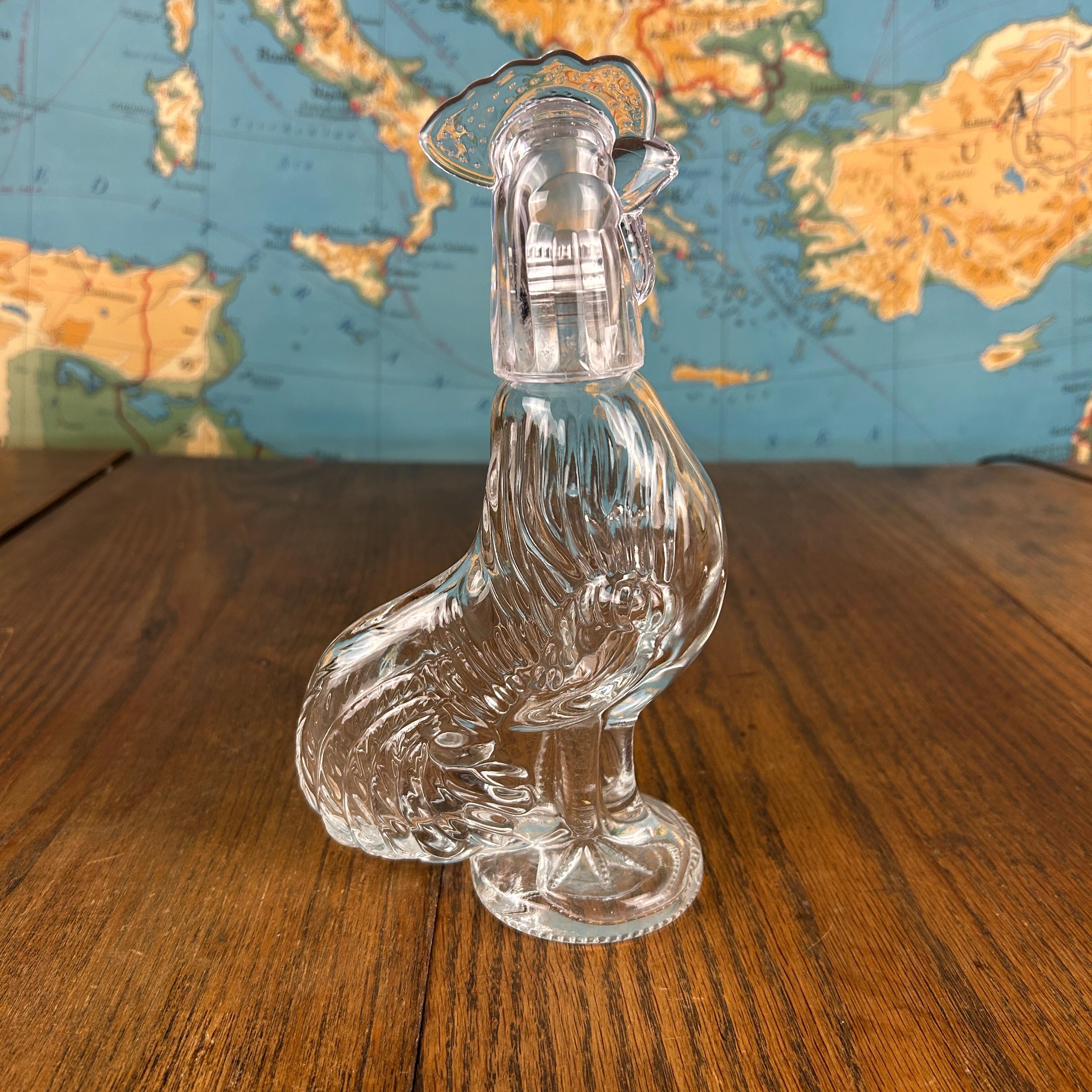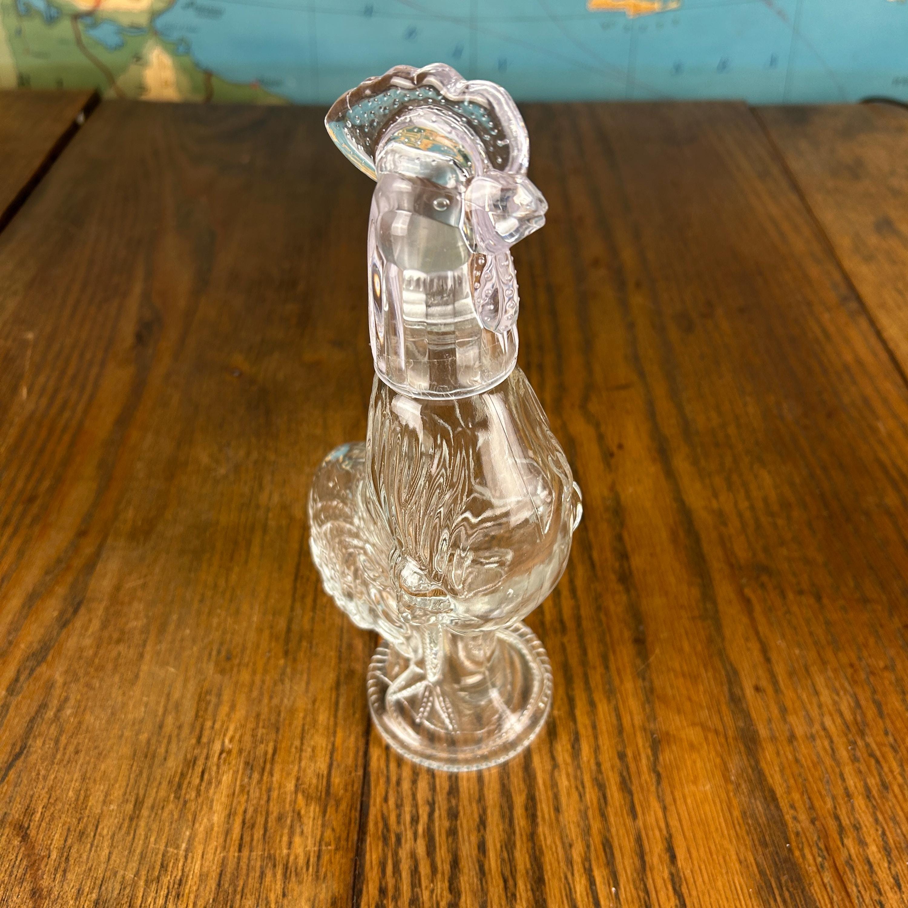 The body is made of clear molded glass, while the removable stopper forms the rooster’s head and comb, adding character and charm. Originally used for storing and pouring liquor, this piece also works beautifully as a decorative accent in a kitchen, bar area, or country-style home.