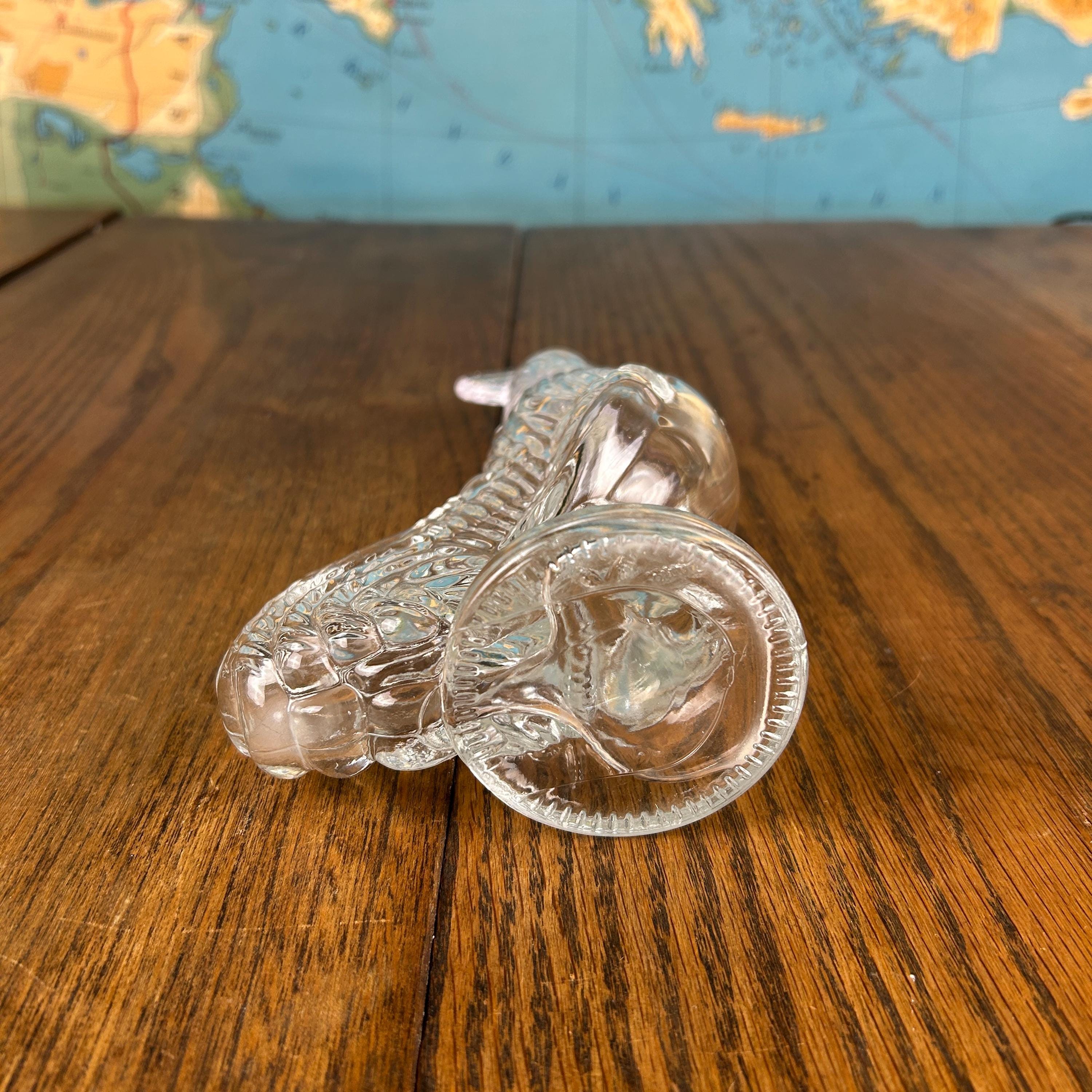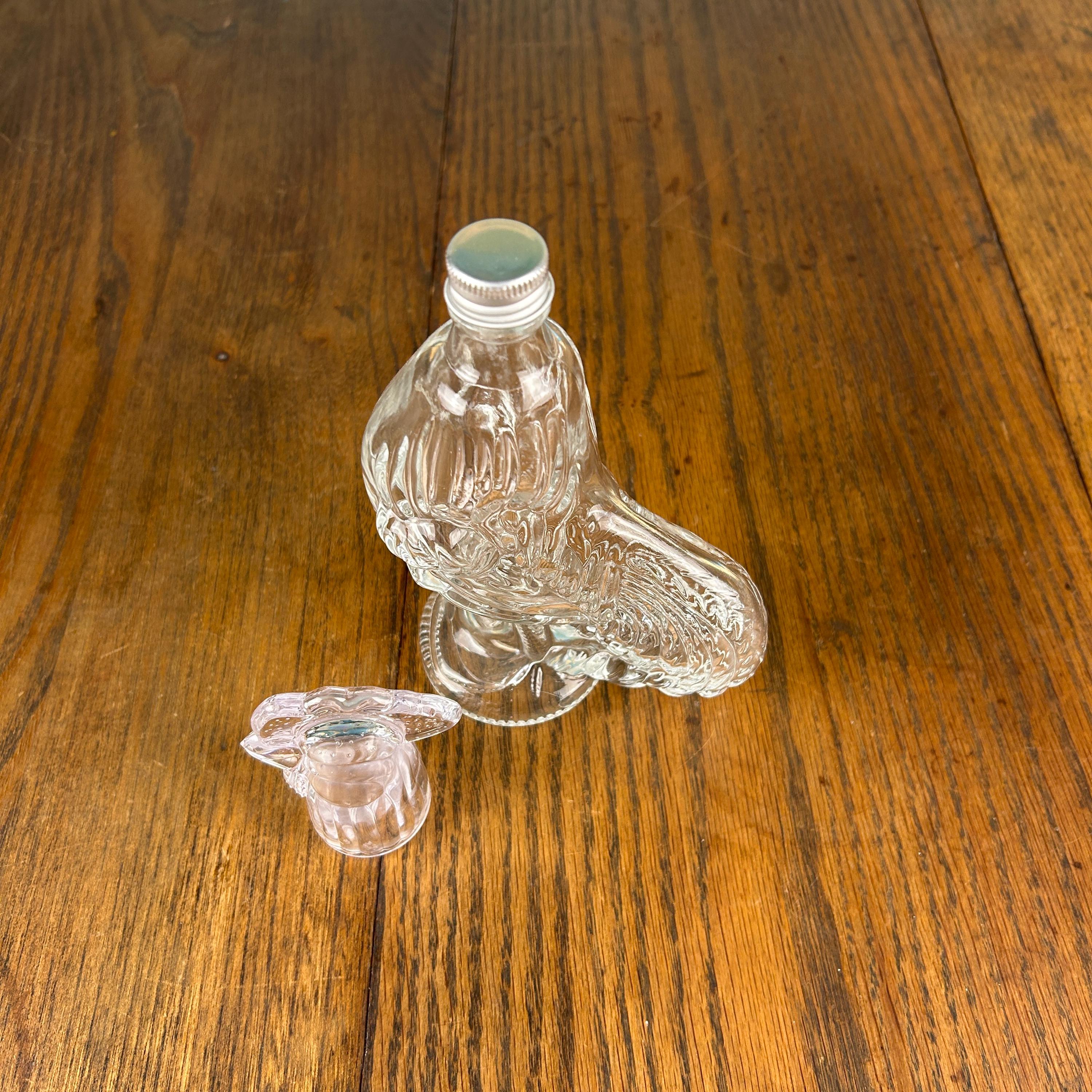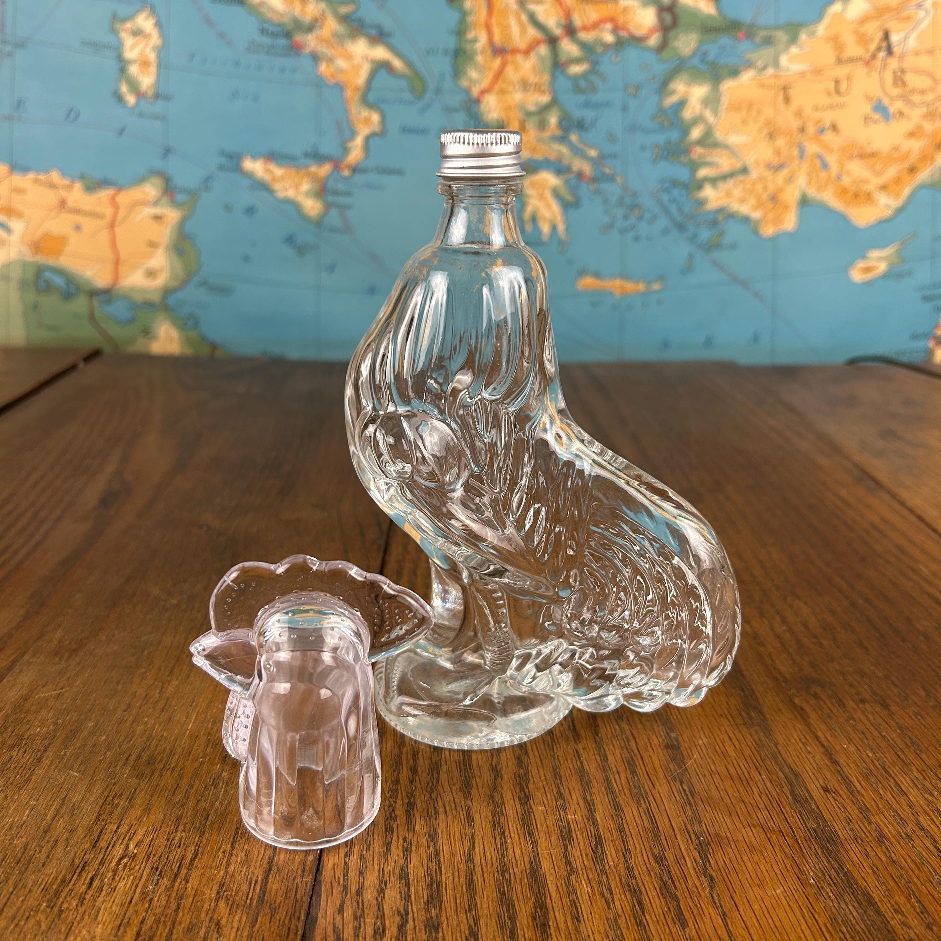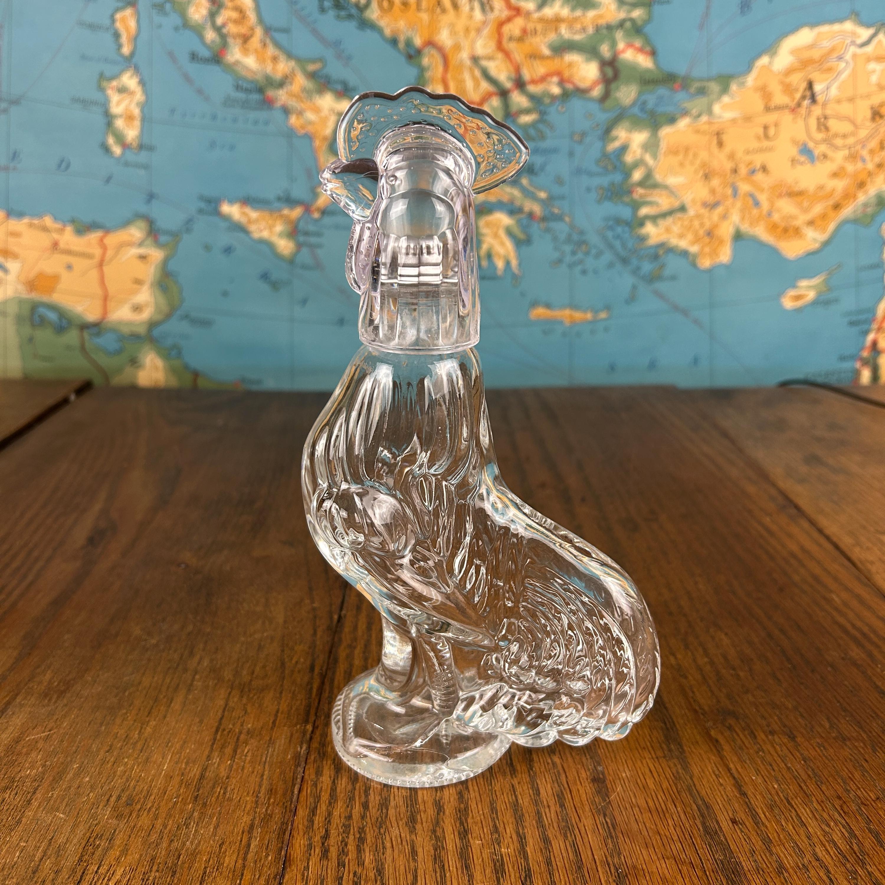 The body is made of clear molded glass, while the removable stopper forms the rooster’s head and comb, adding character and charm. Originally used for storing and pouring liquor, this piece also works beautifully as a decorative accent in a kitchen, bar area, or country-style home.