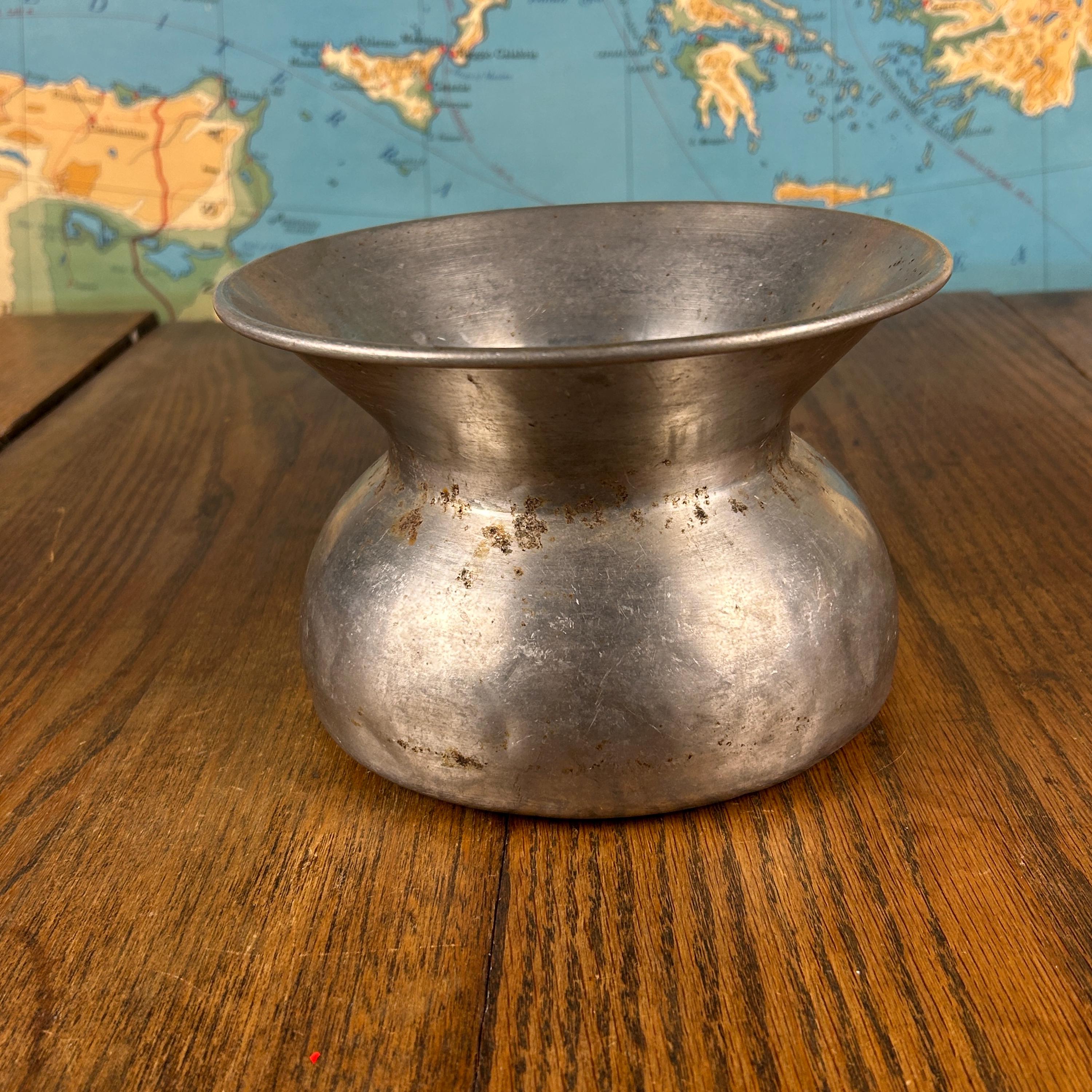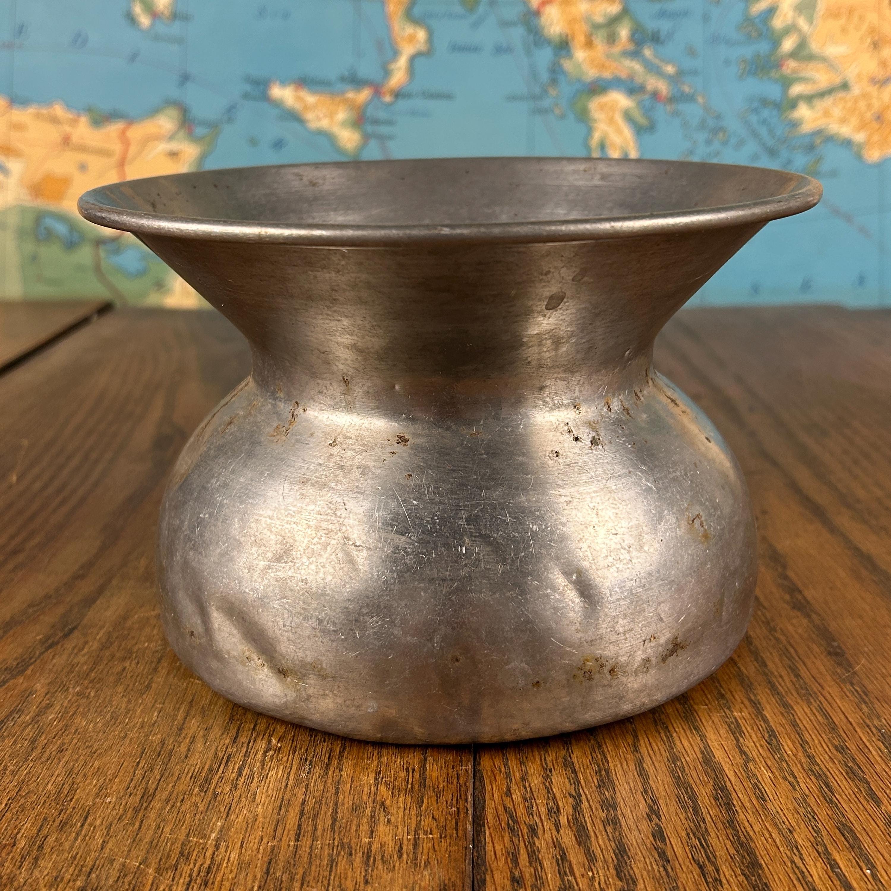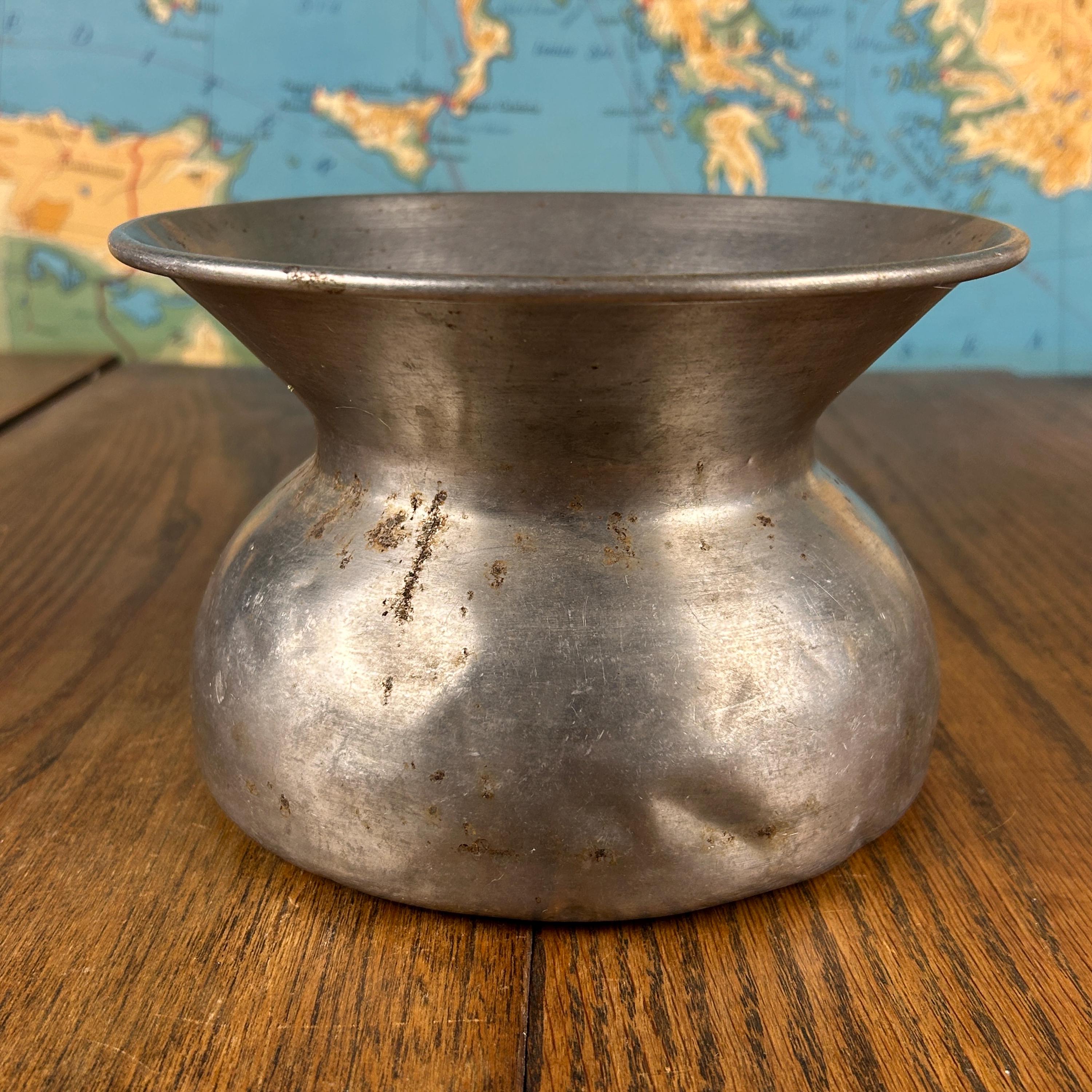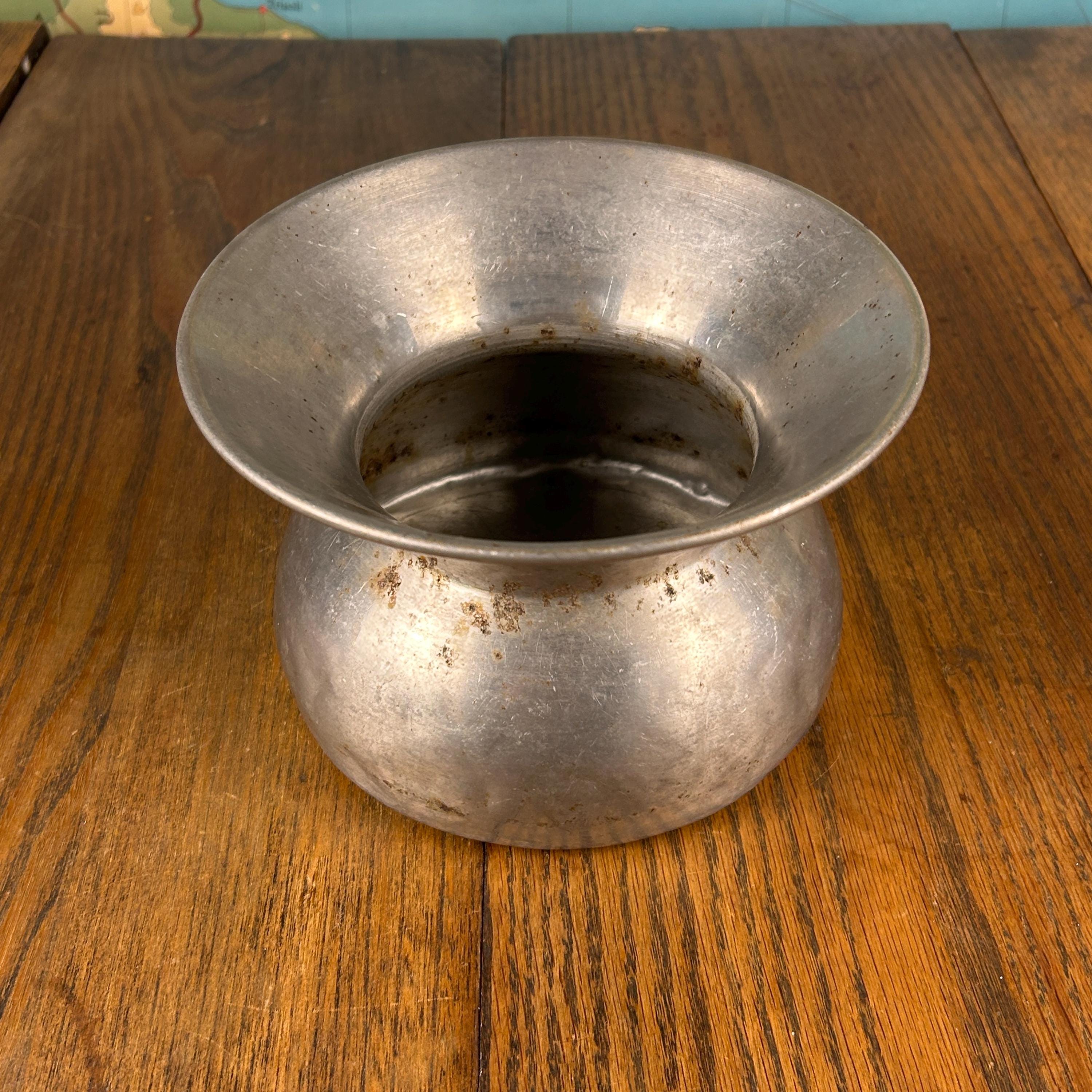 Originally used as a tobacco spittoon (cuspidor), pieces like this are now often repurposed as decorative containers, planters, or farmhouse accents. The lightweight aluminum construction features a classic rounded form with a wide opening and flared rim.