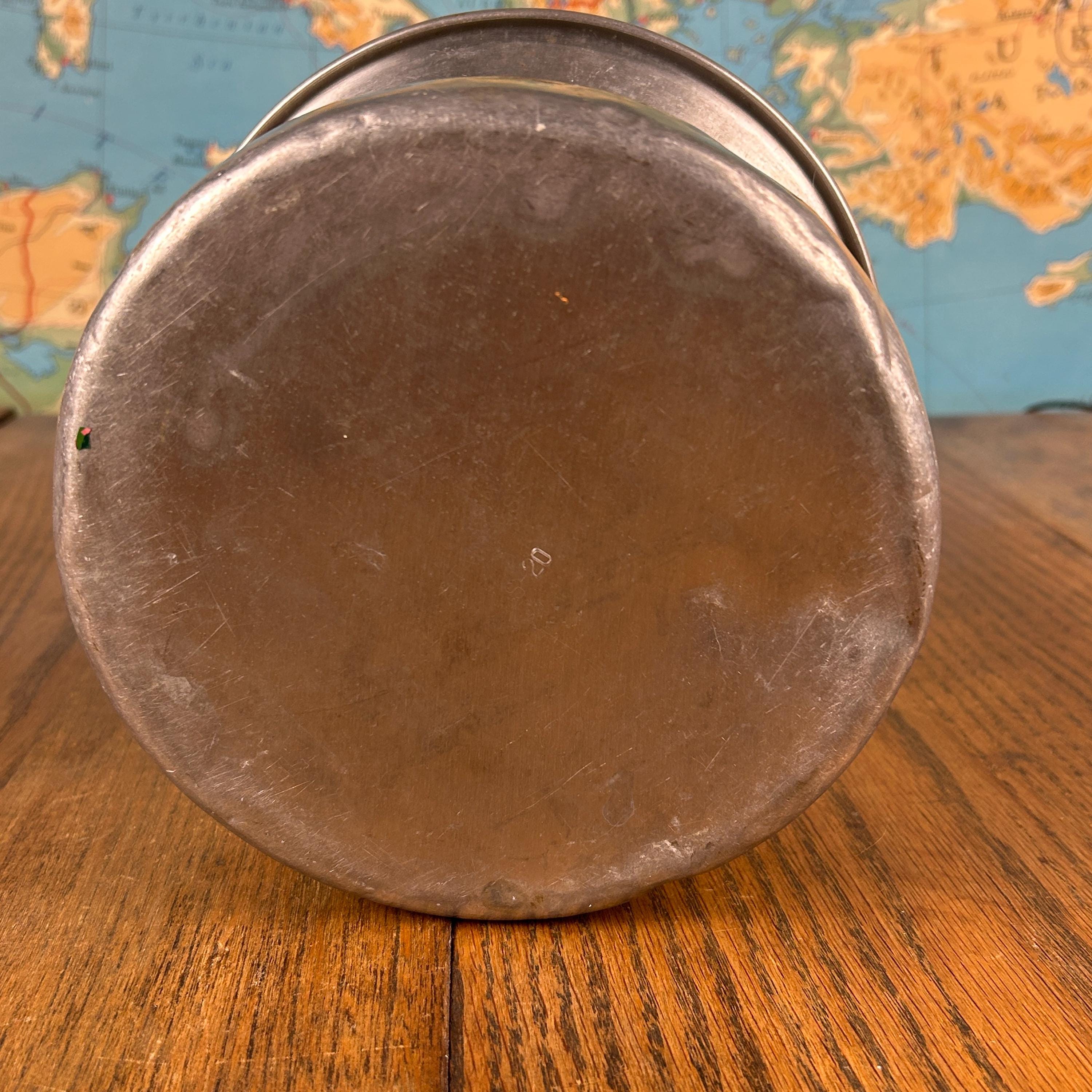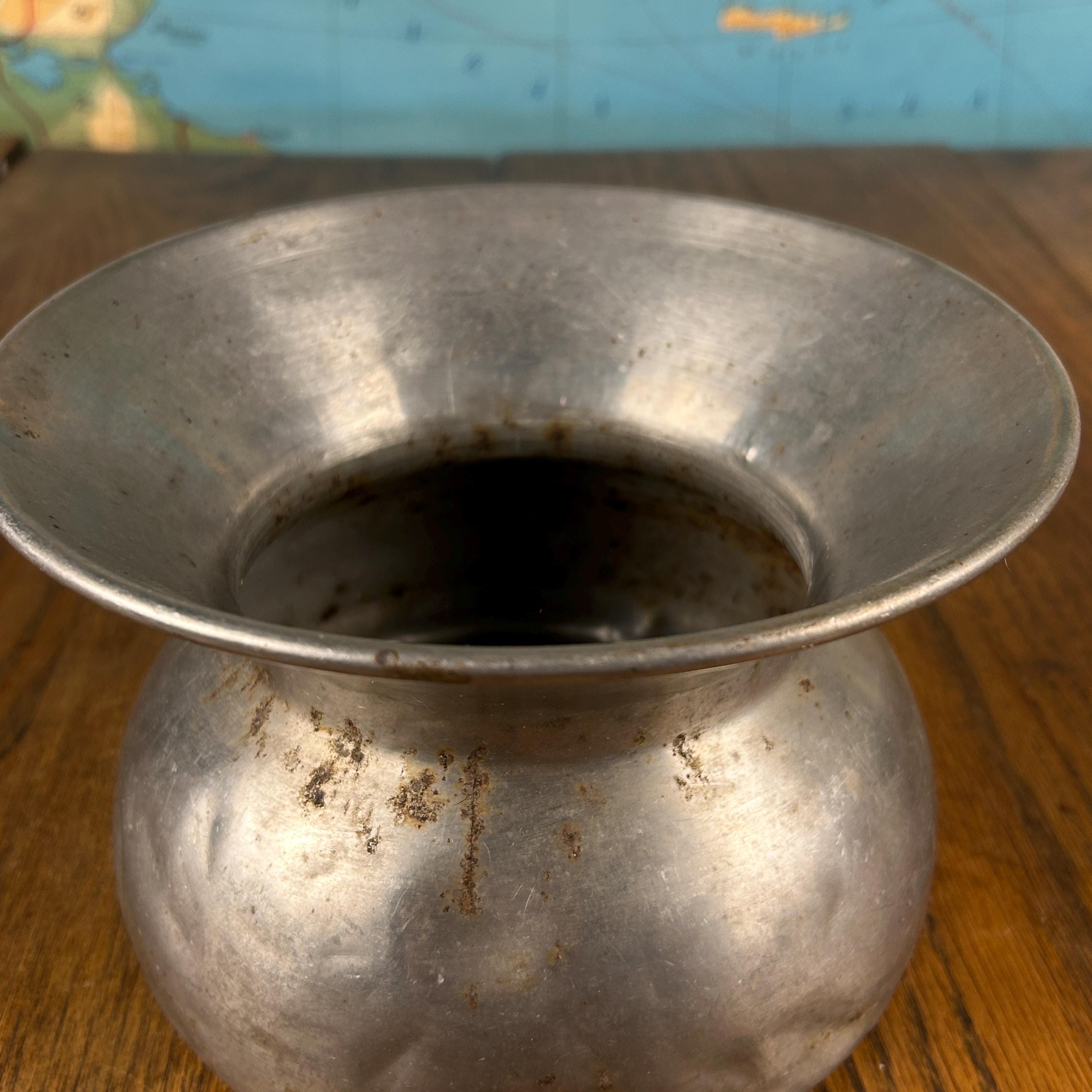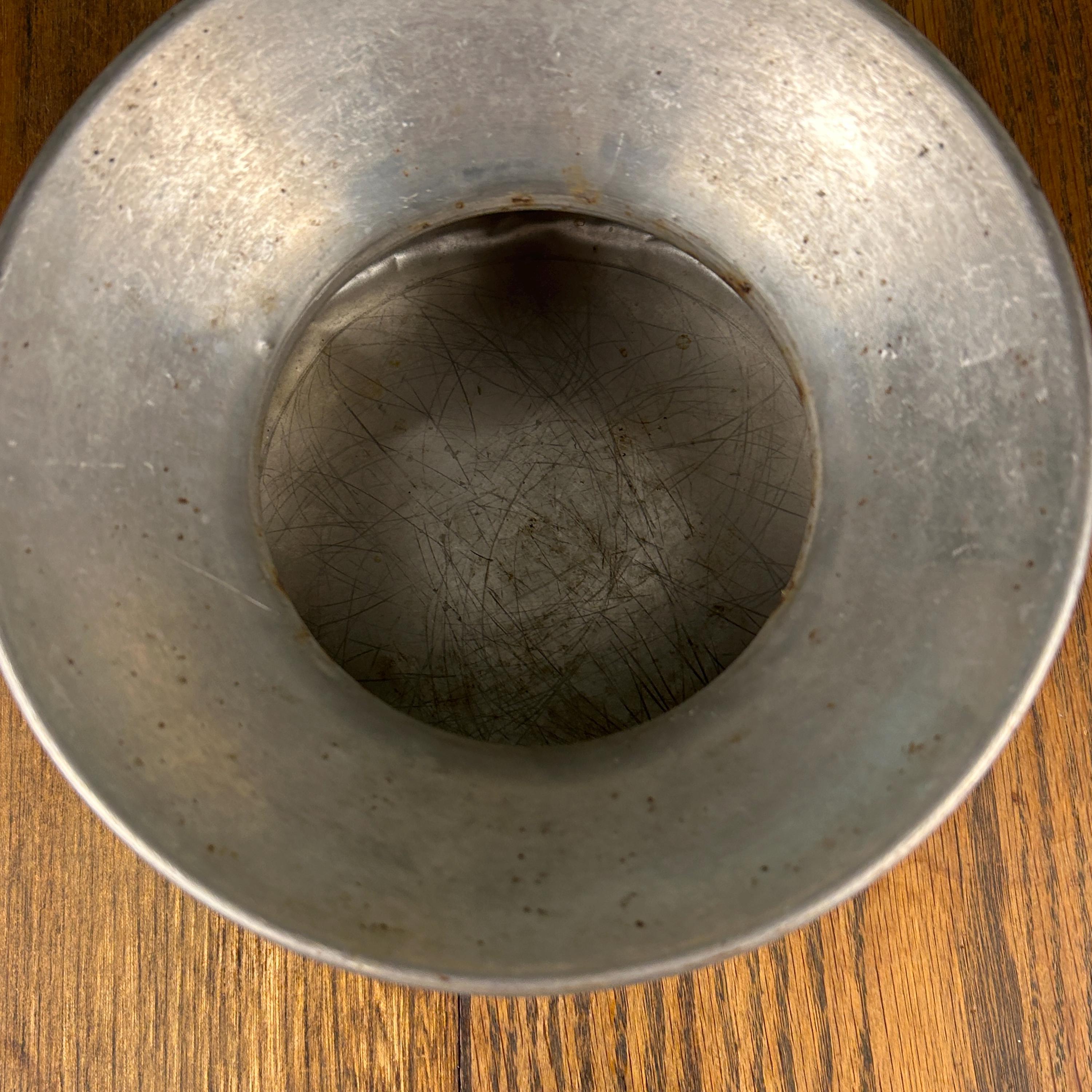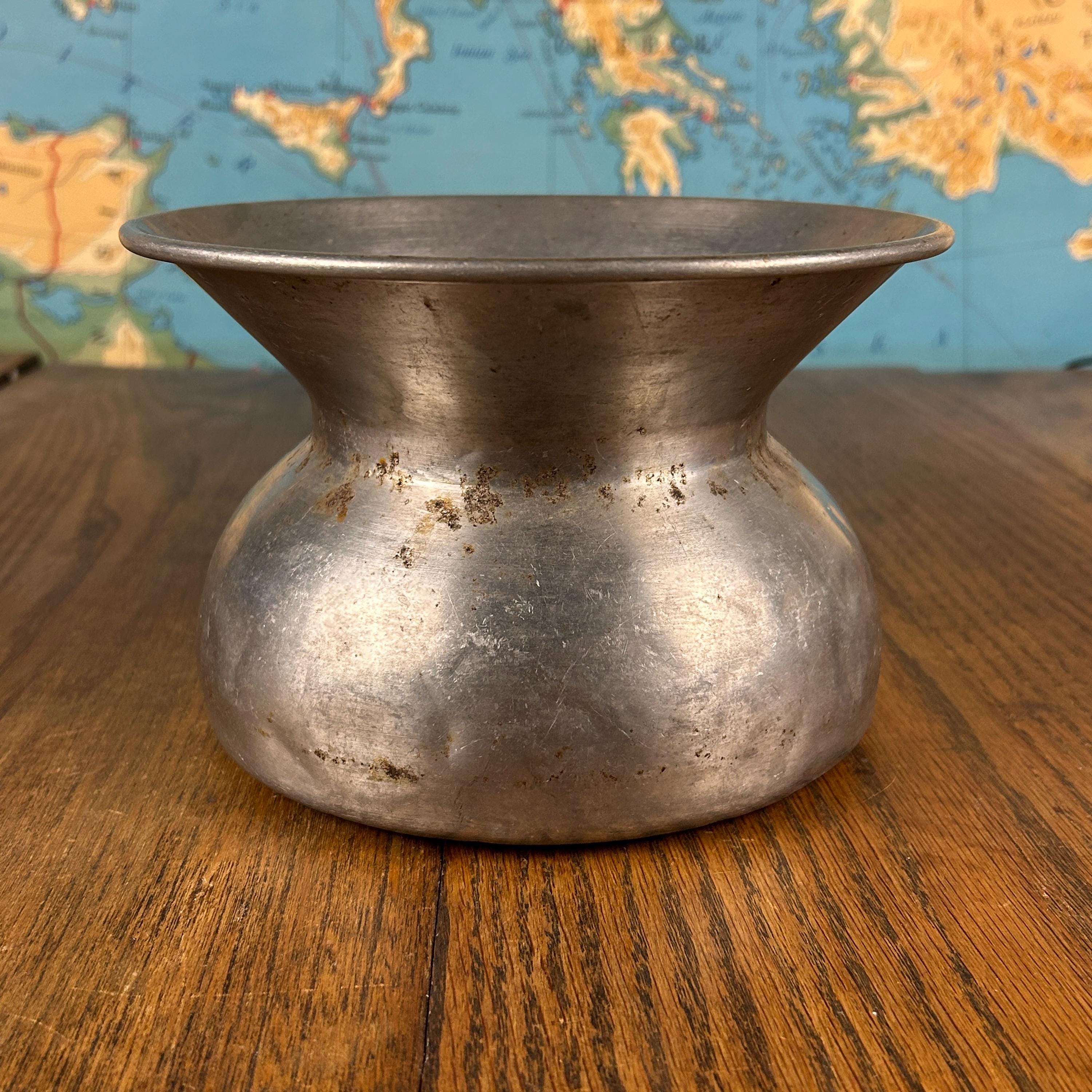 Originally used as a tobacco spittoon (cuspidor), pieces like this are now often repurposed as decorative containers, planters, or farmhouse accents. The lightweight aluminum construction features a classic rounded form with a wide opening and flared rim.