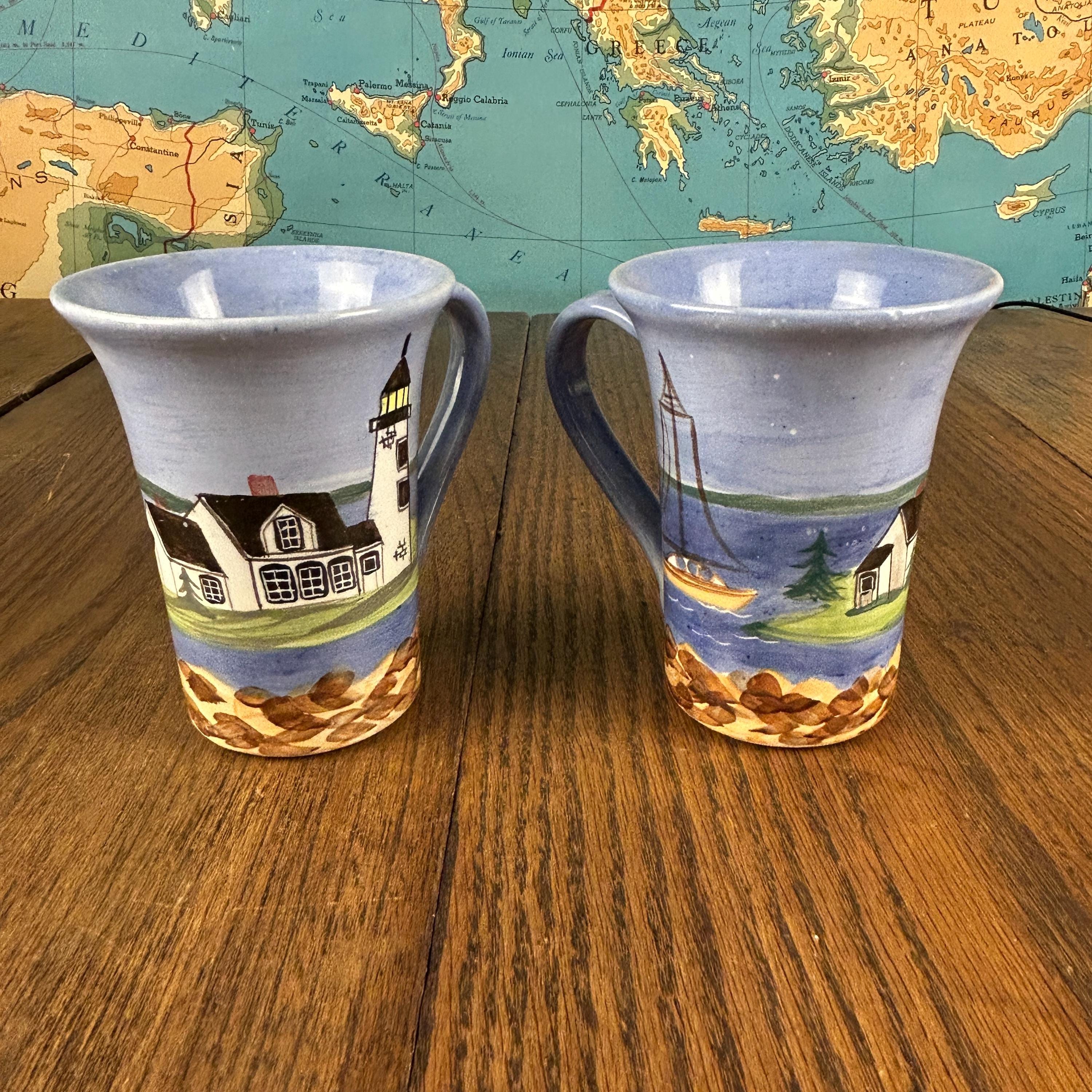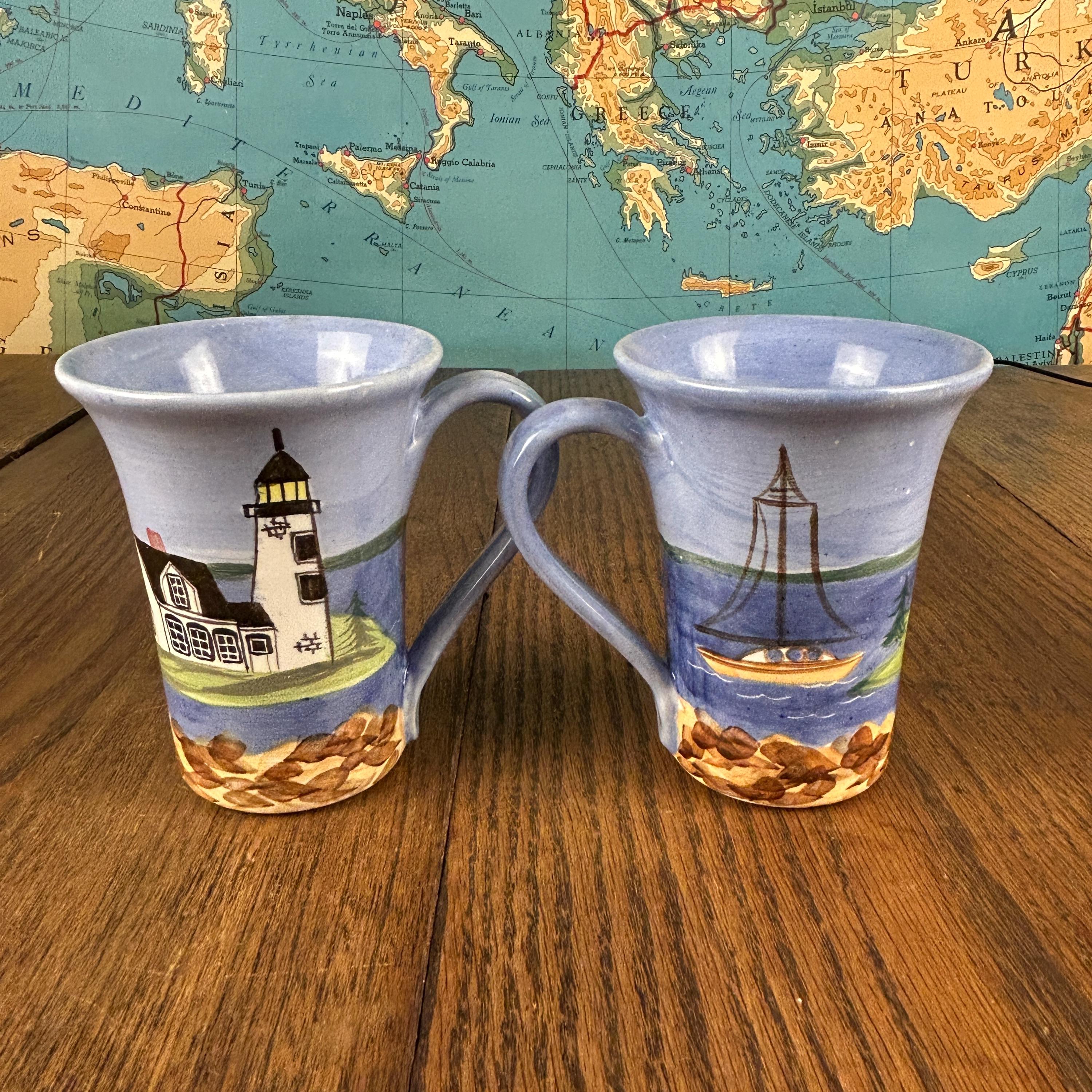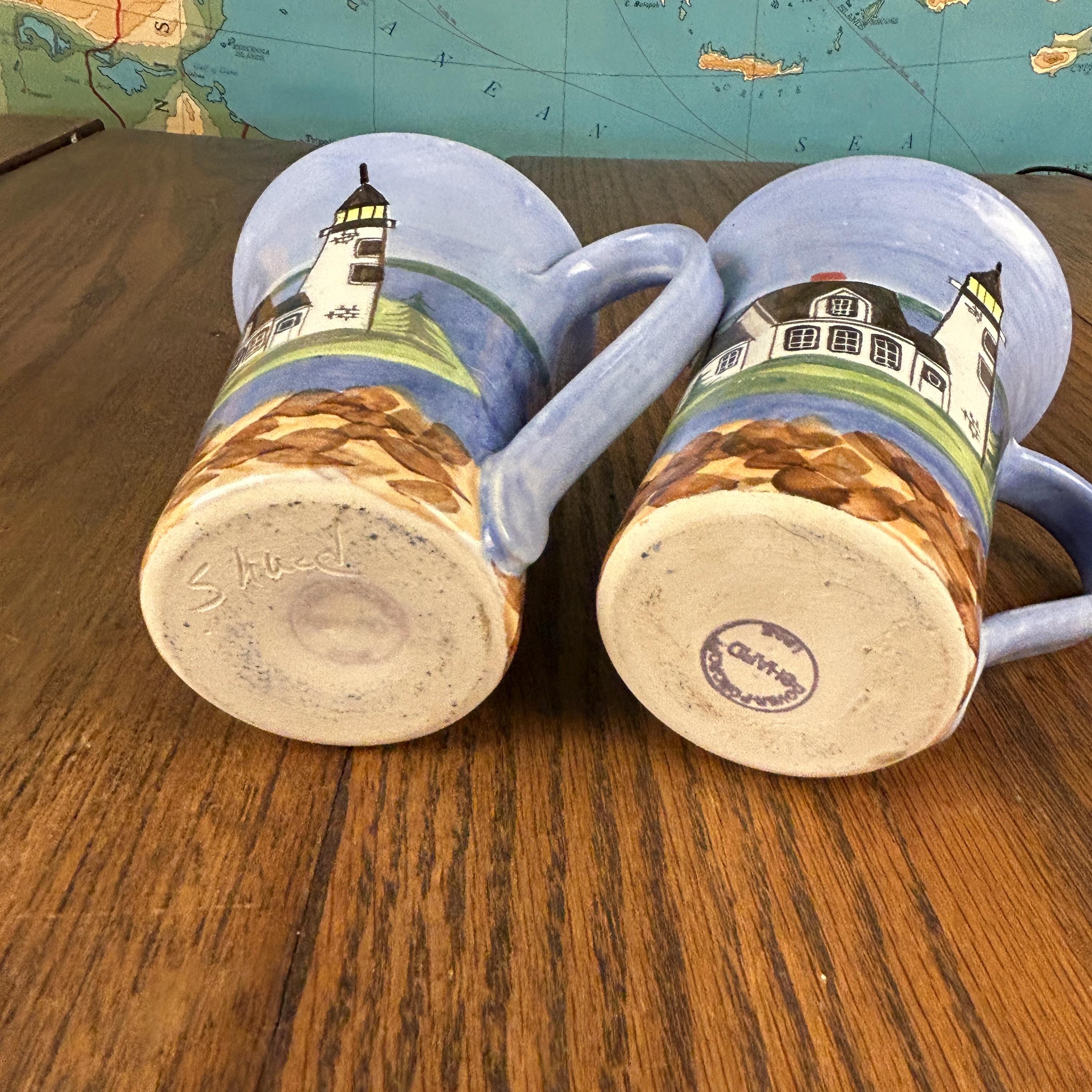 These collectible Shard Pottery mugs from Maine feature charming hand-painted coastal lighthouse scenes, capturing the beauty and character of New England seaside life.