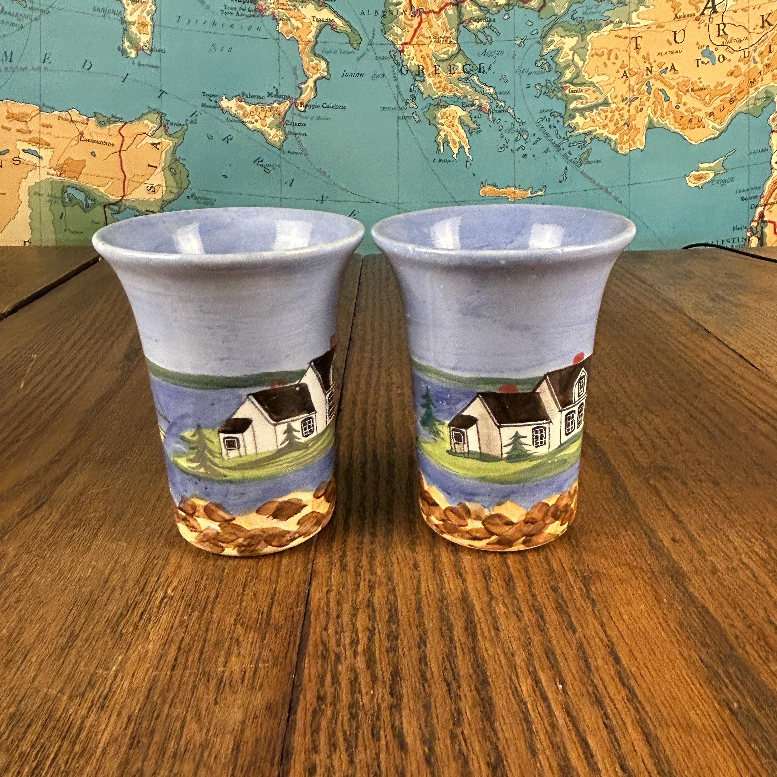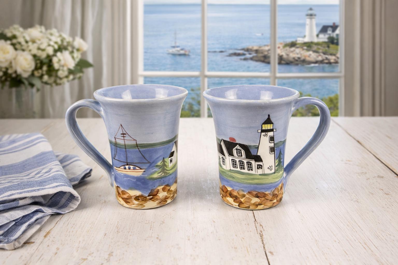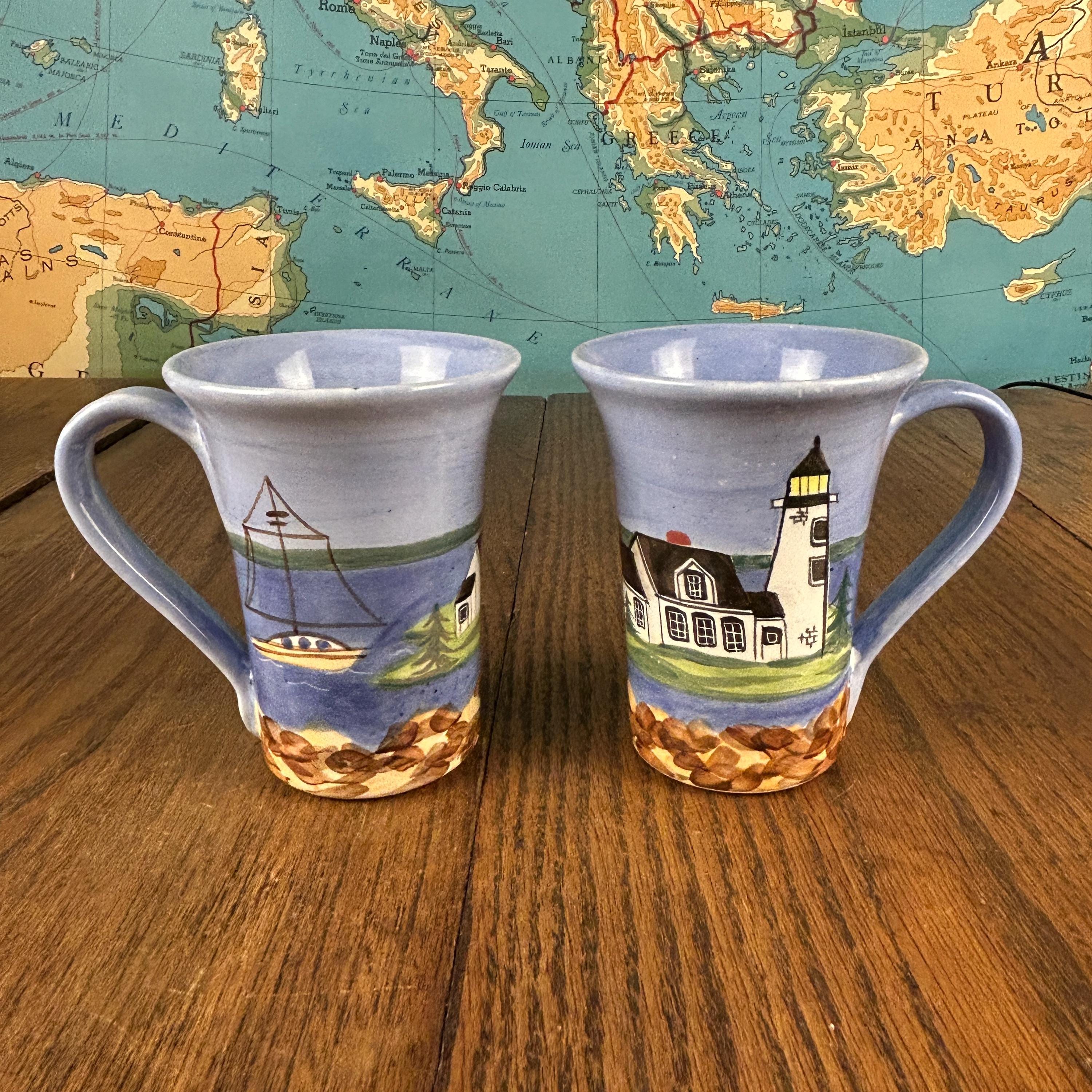 These collectible Shard Pottery mugs from Maine feature charming hand-painted coastal lighthouse scenes, capturing the beauty and character of New England seaside life.