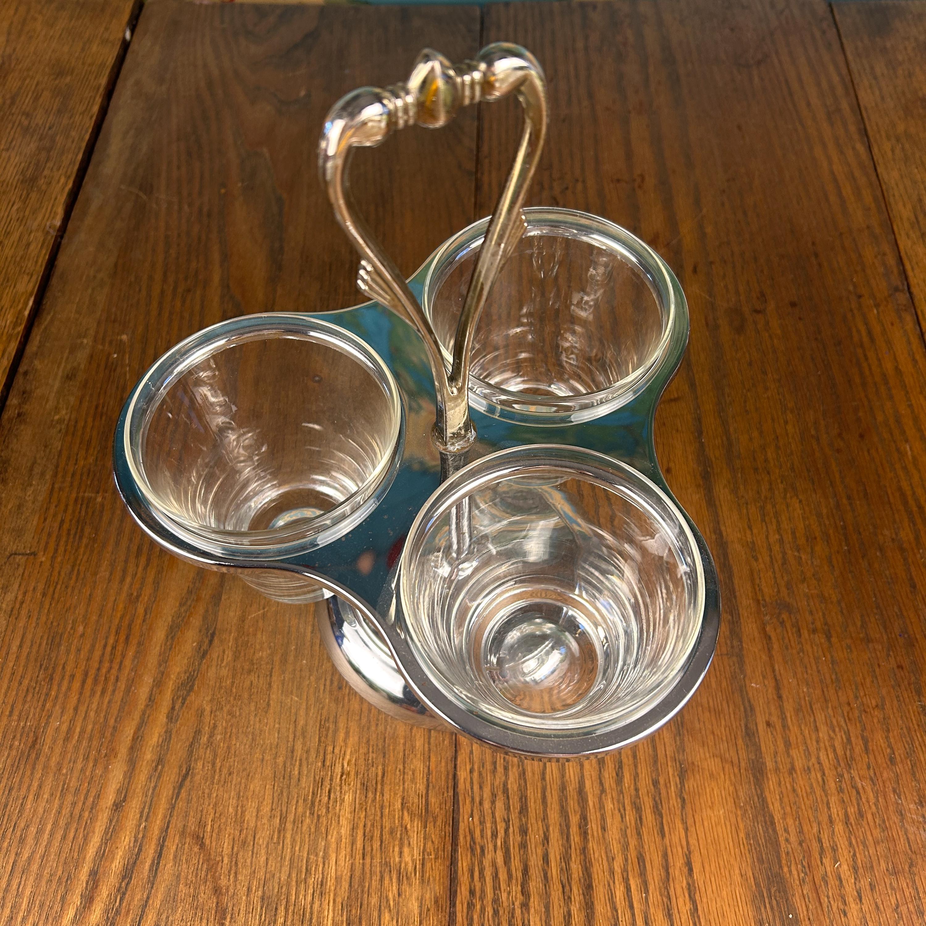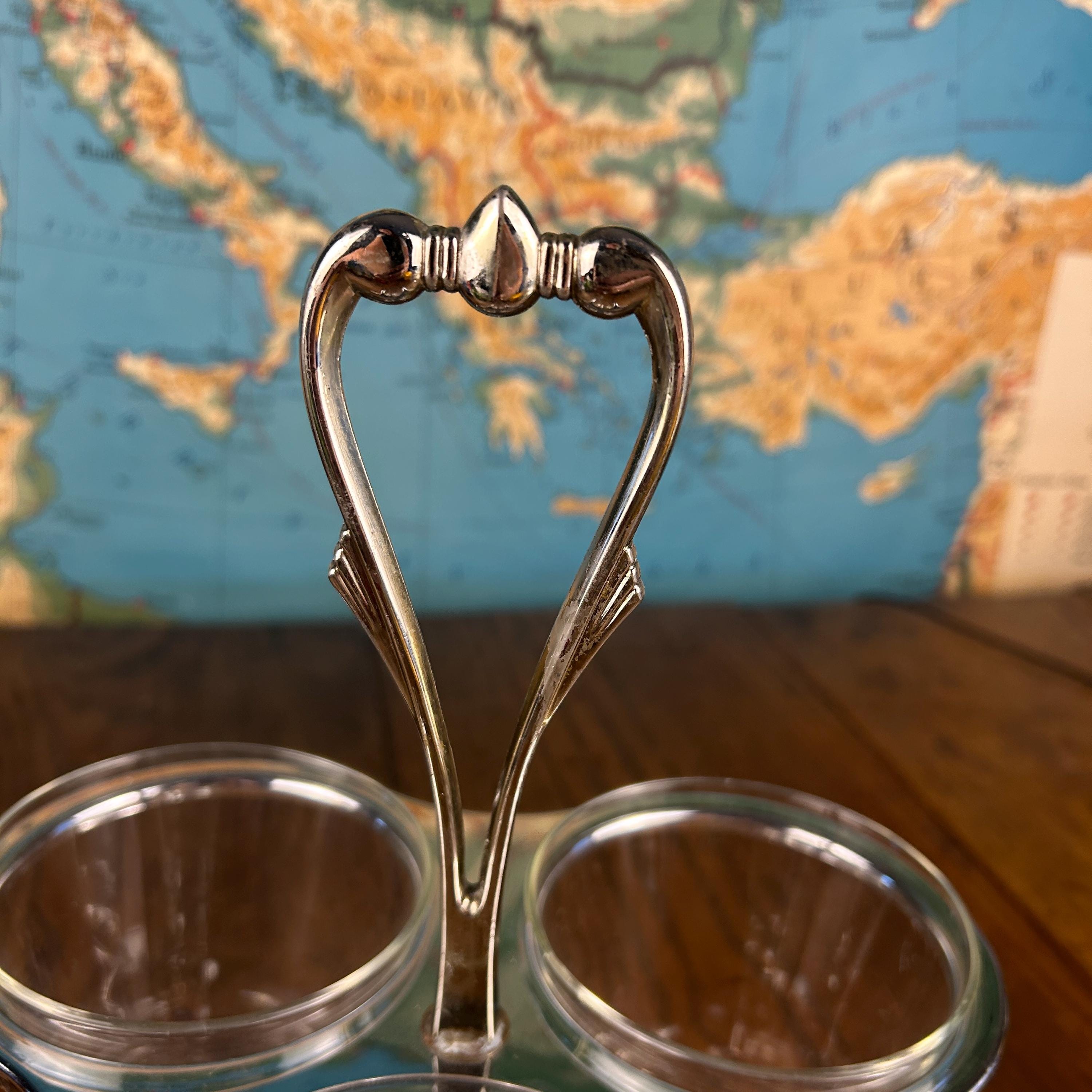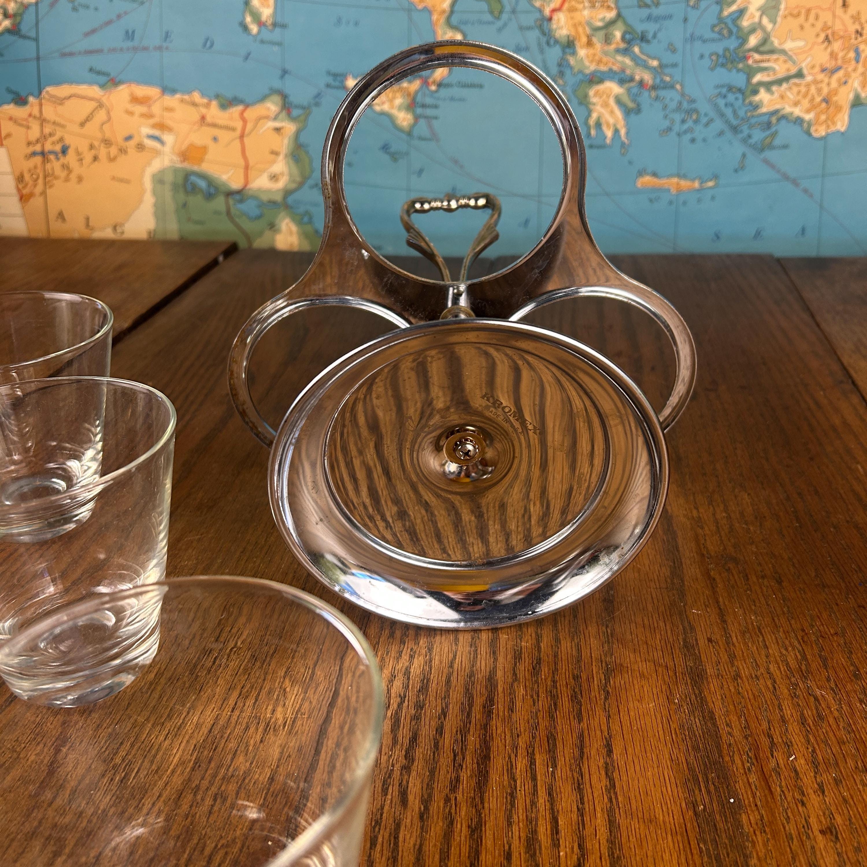 Designed as a rotating lazy Susan, the base spins smoothly, making it easy to serve condiments, dips, nuts, or candy while entertaining. The combination of chrome and clear glass gives it a timeless retro look that fits beautifully in both vintage and modern settings.
