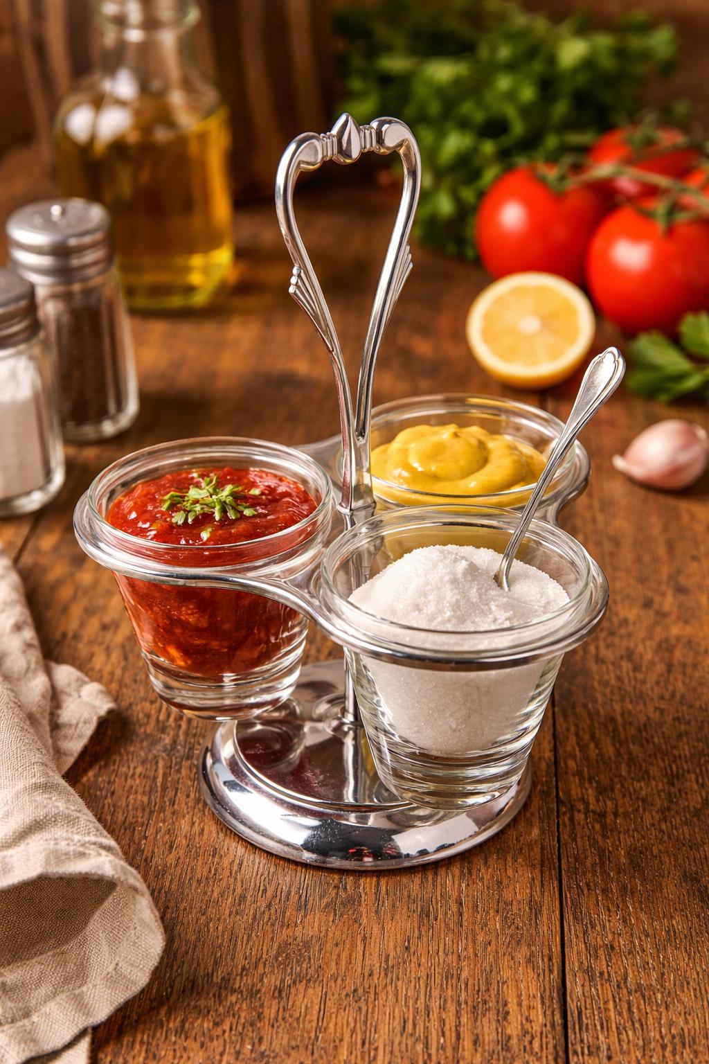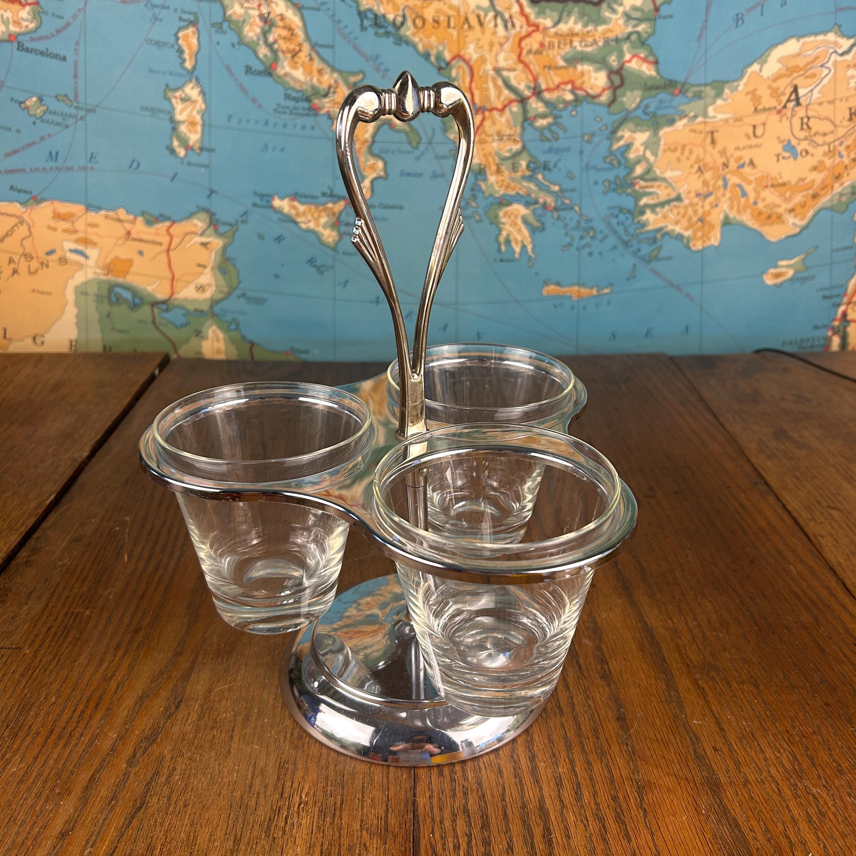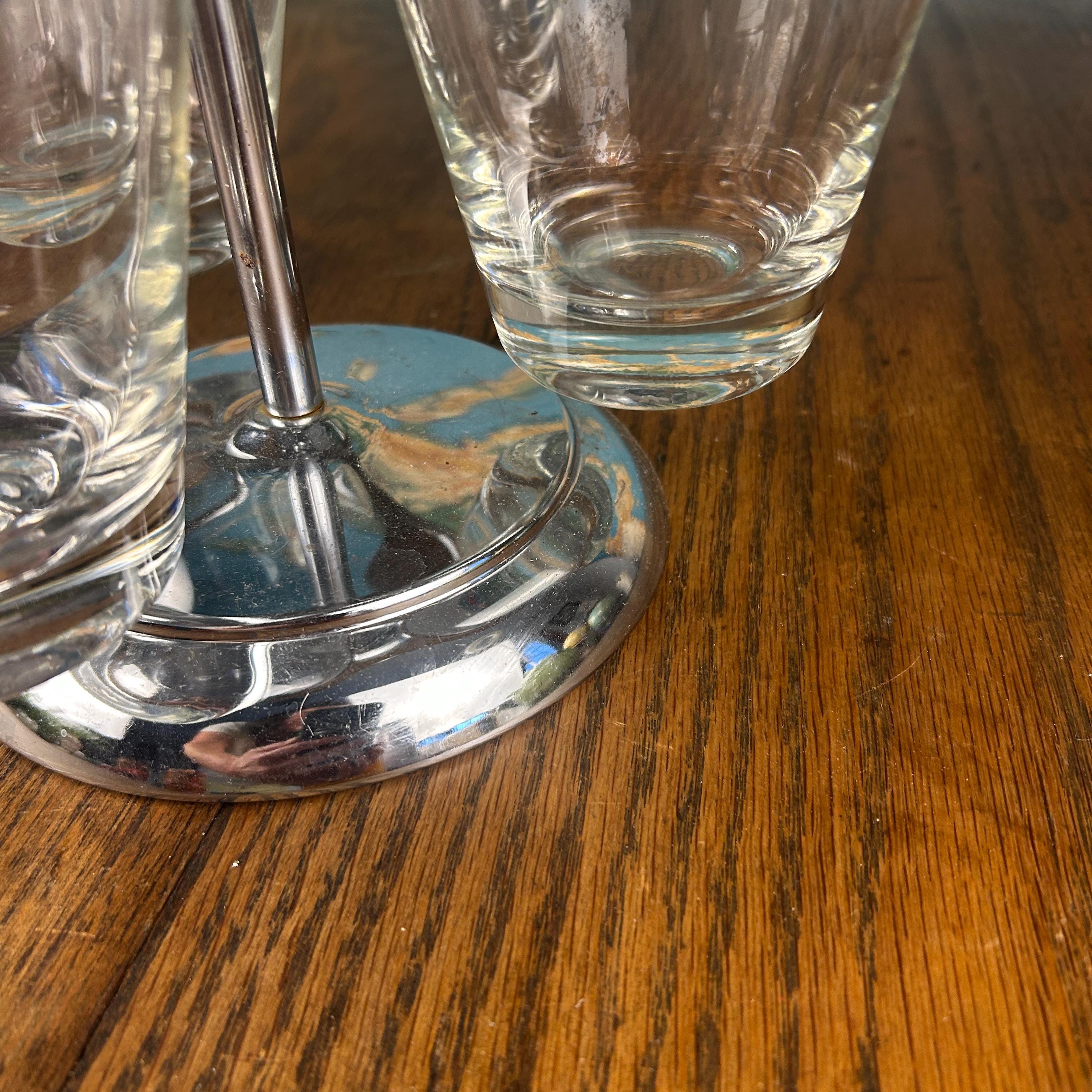 Designed as a rotating lazy Susan, the base spins smoothly, making it easy to serve condiments, dips, nuts, or candy while entertaining. The combination of chrome and clear glass gives it a timeless retro look that fits beautifully in both vintage and modern settings.