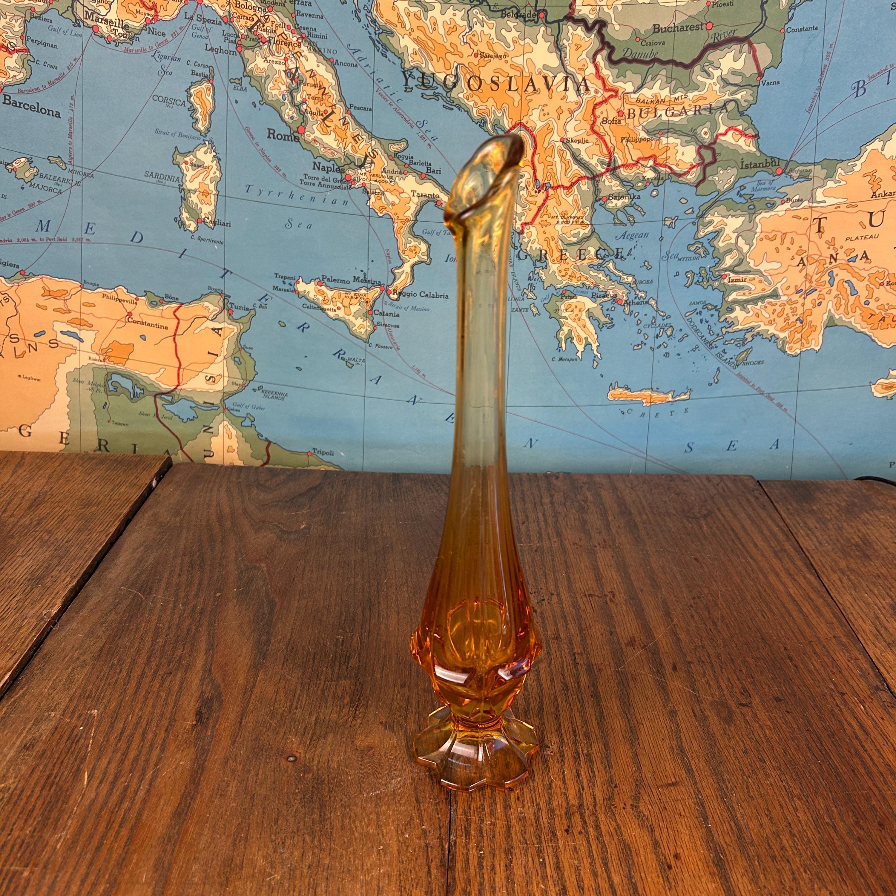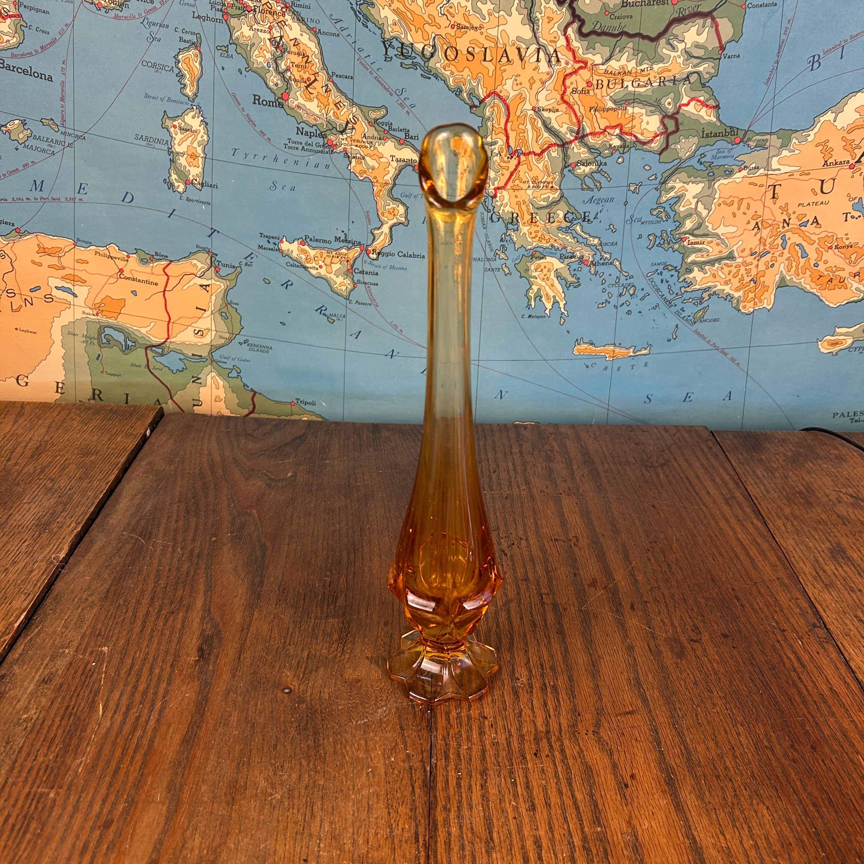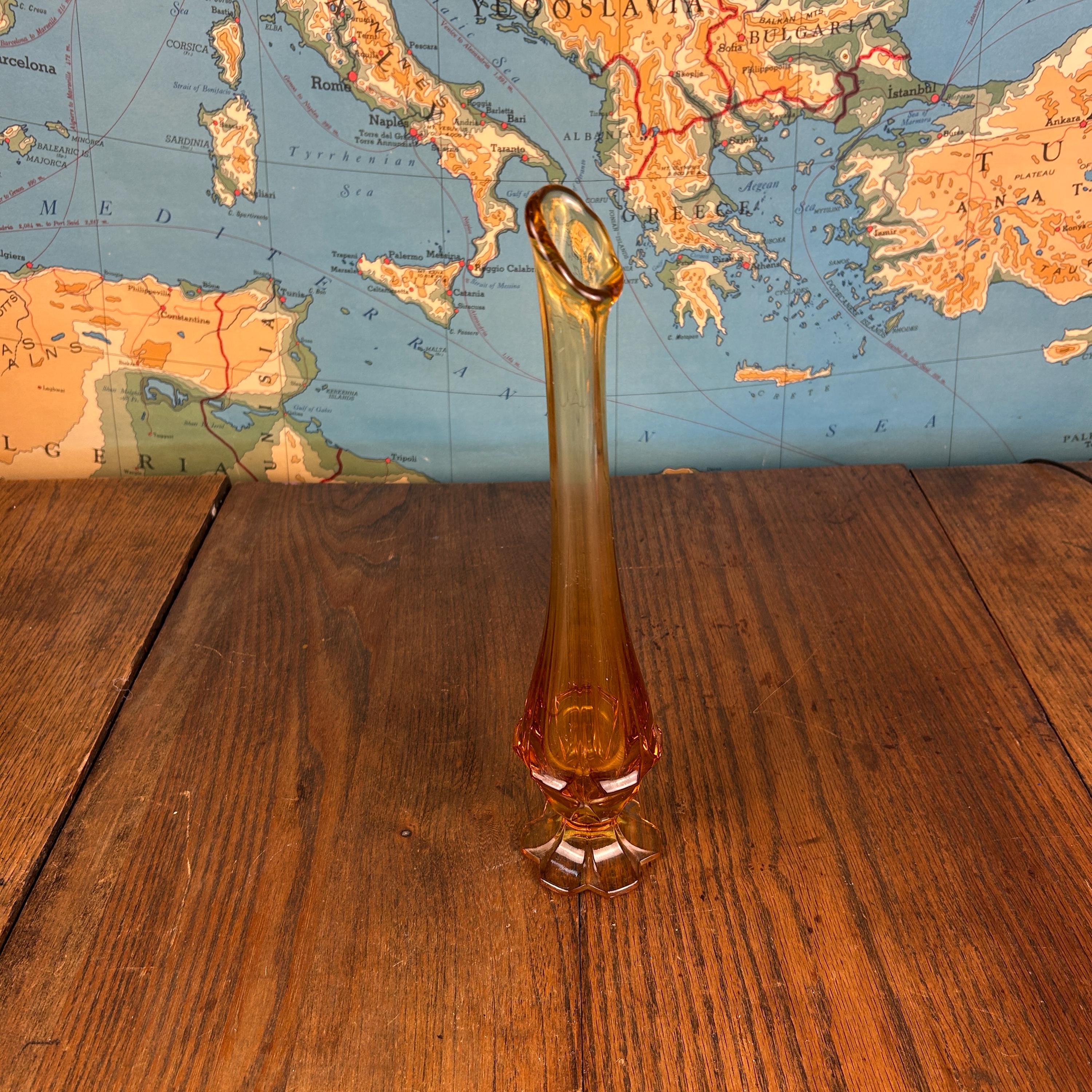 Crafted by the Fenton Art Glass Company in the 1960s, this piece features the iconic Valencia pattern, with a rounded bulbous base and a tall, gracefully stretched neck. The vase’s beautiful honey amber color glows warmly in the light, making it a standout decorative piece.