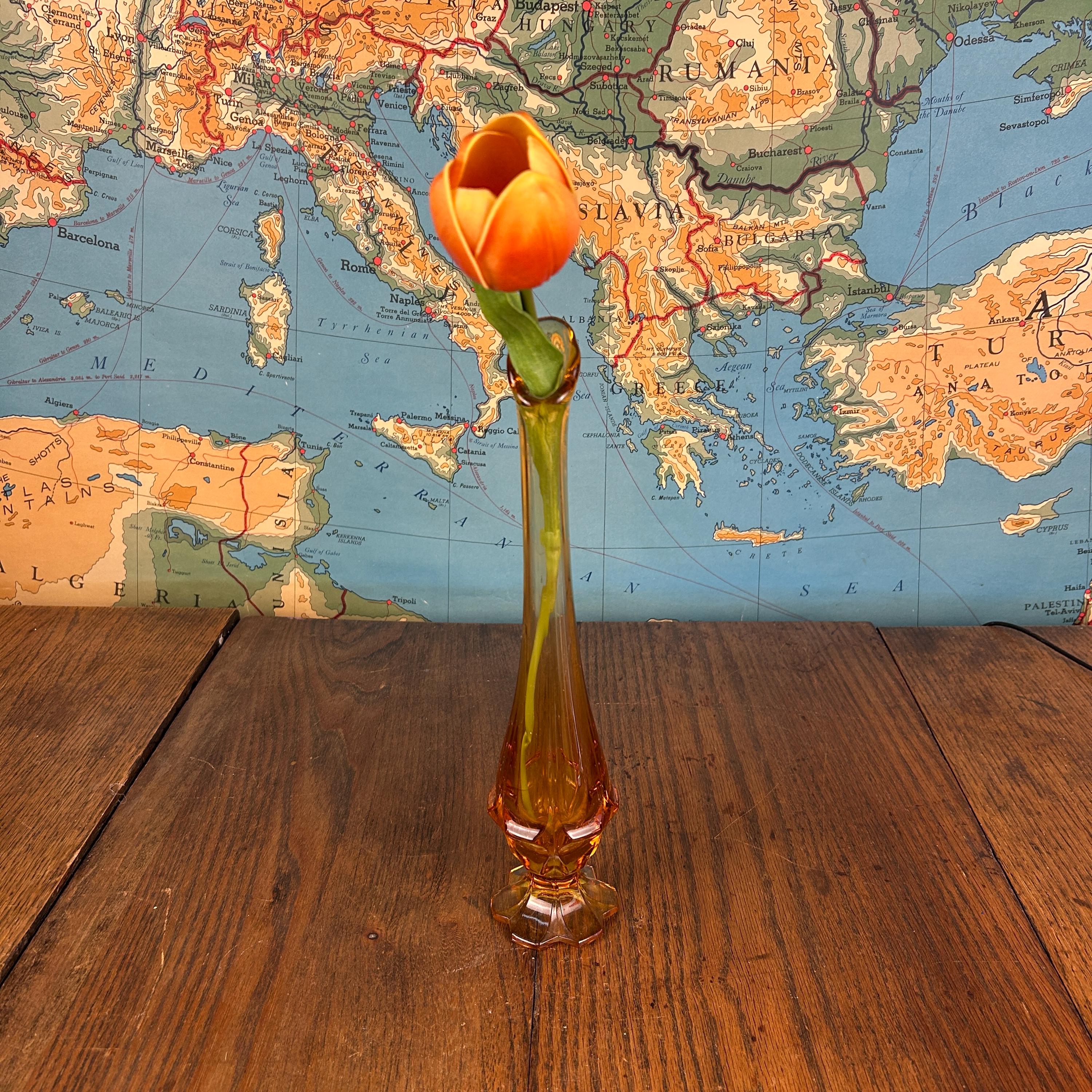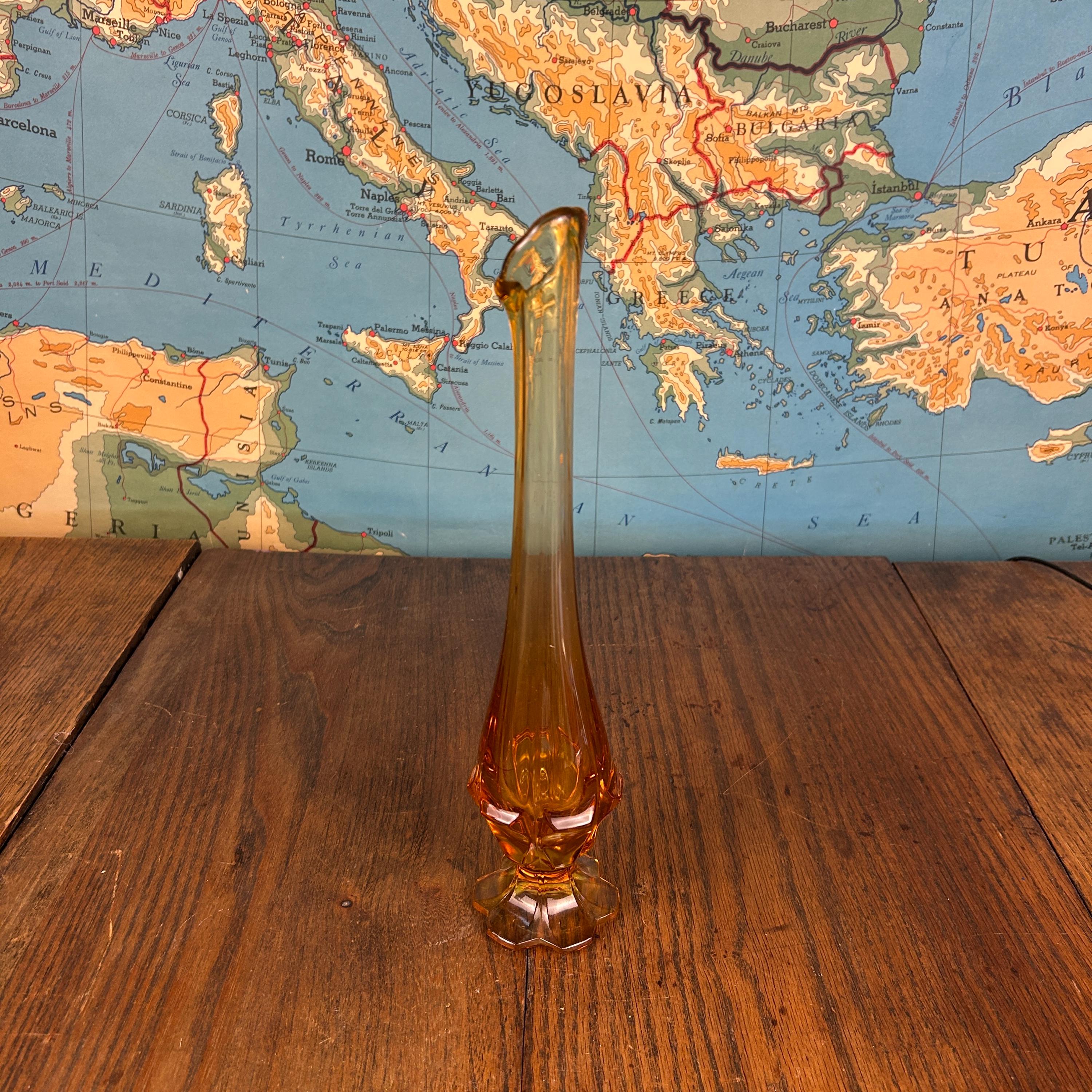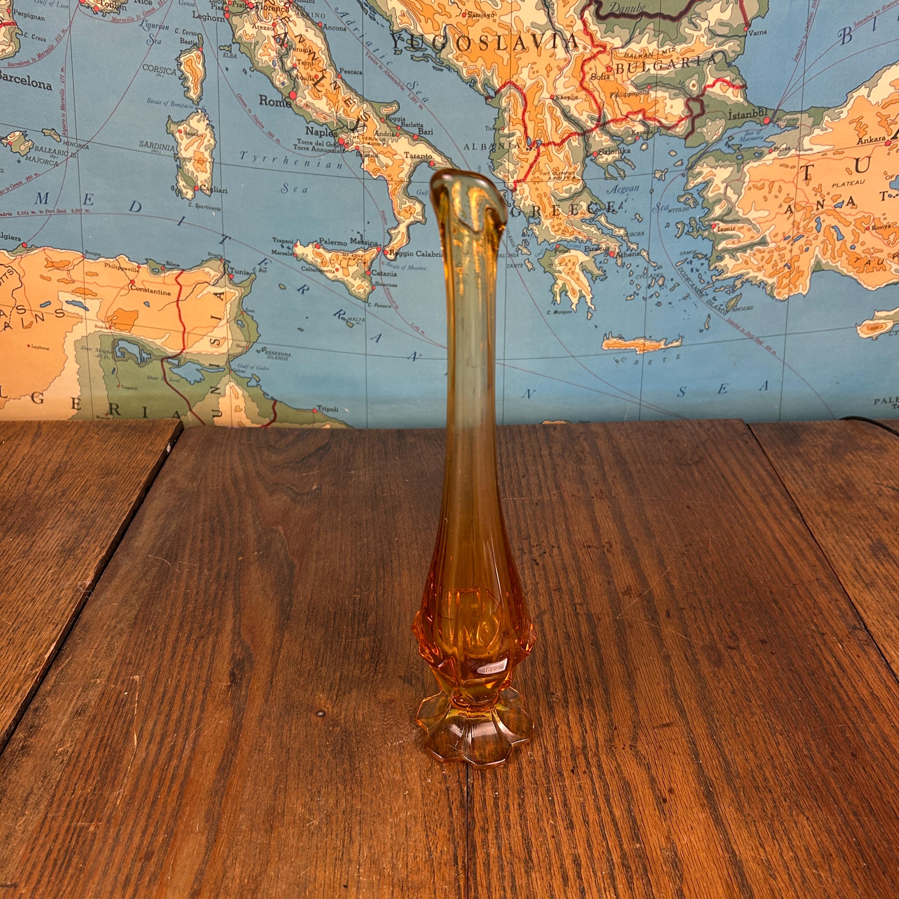 Crafted by the Fenton Art Glass Company in the 1960s, this piece features the iconic Valencia pattern, with a rounded bulbous base and a tall, gracefully stretched neck. The vase’s beautiful honey amber color glows warmly in the light, making it a standout decorative piece.