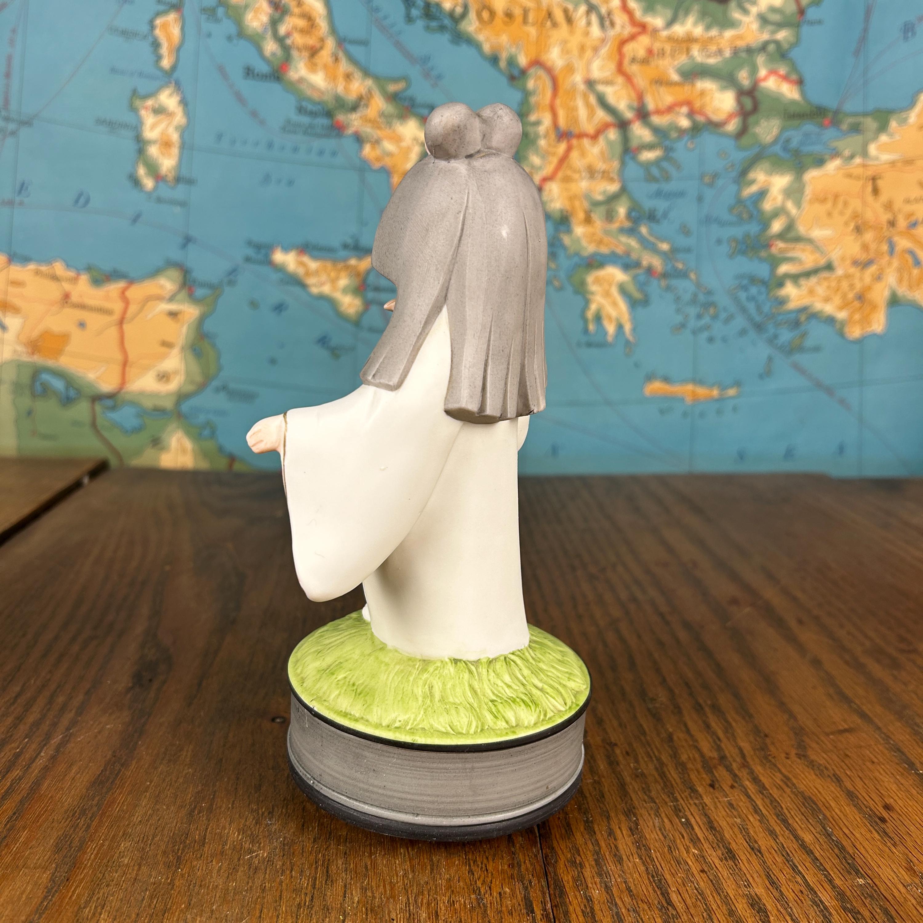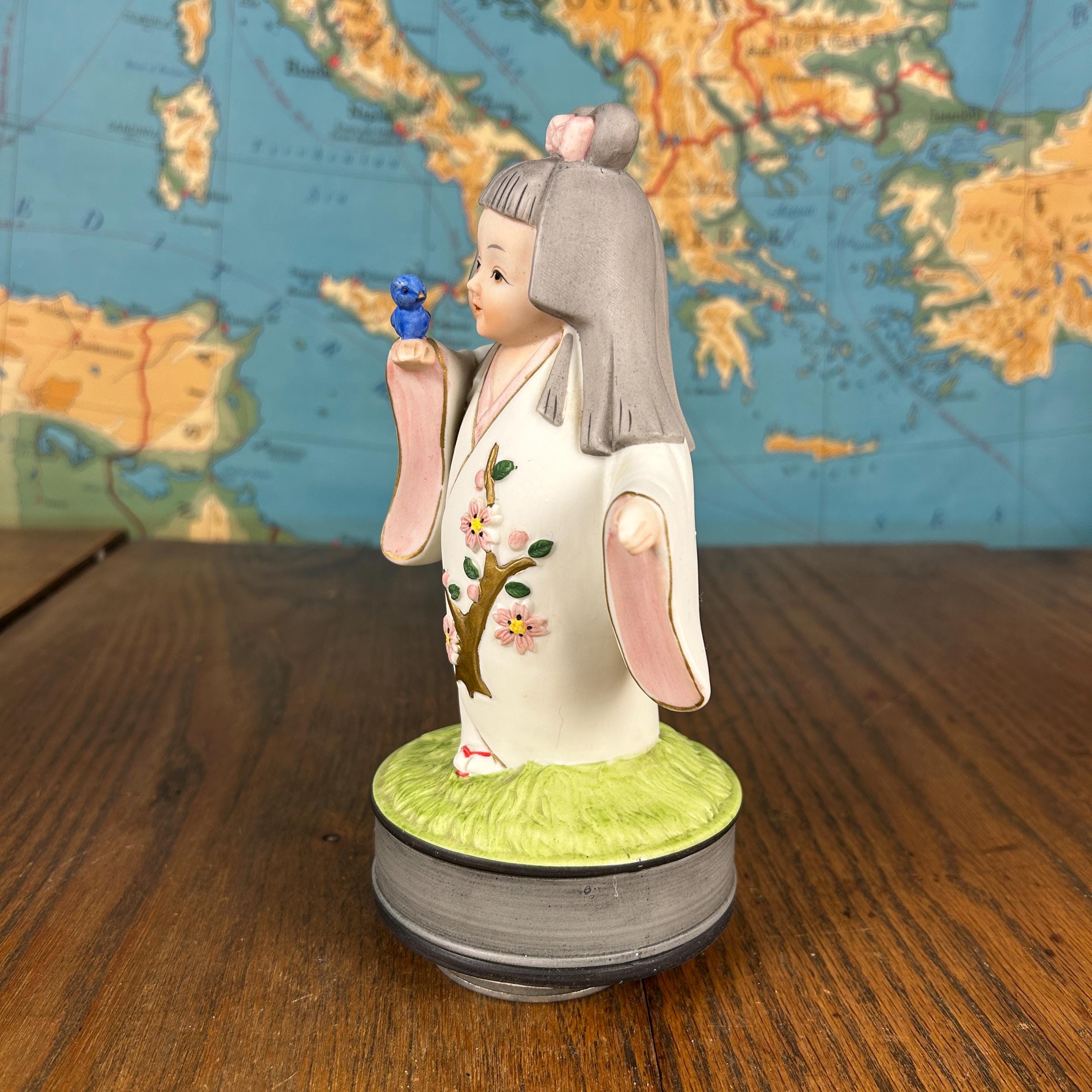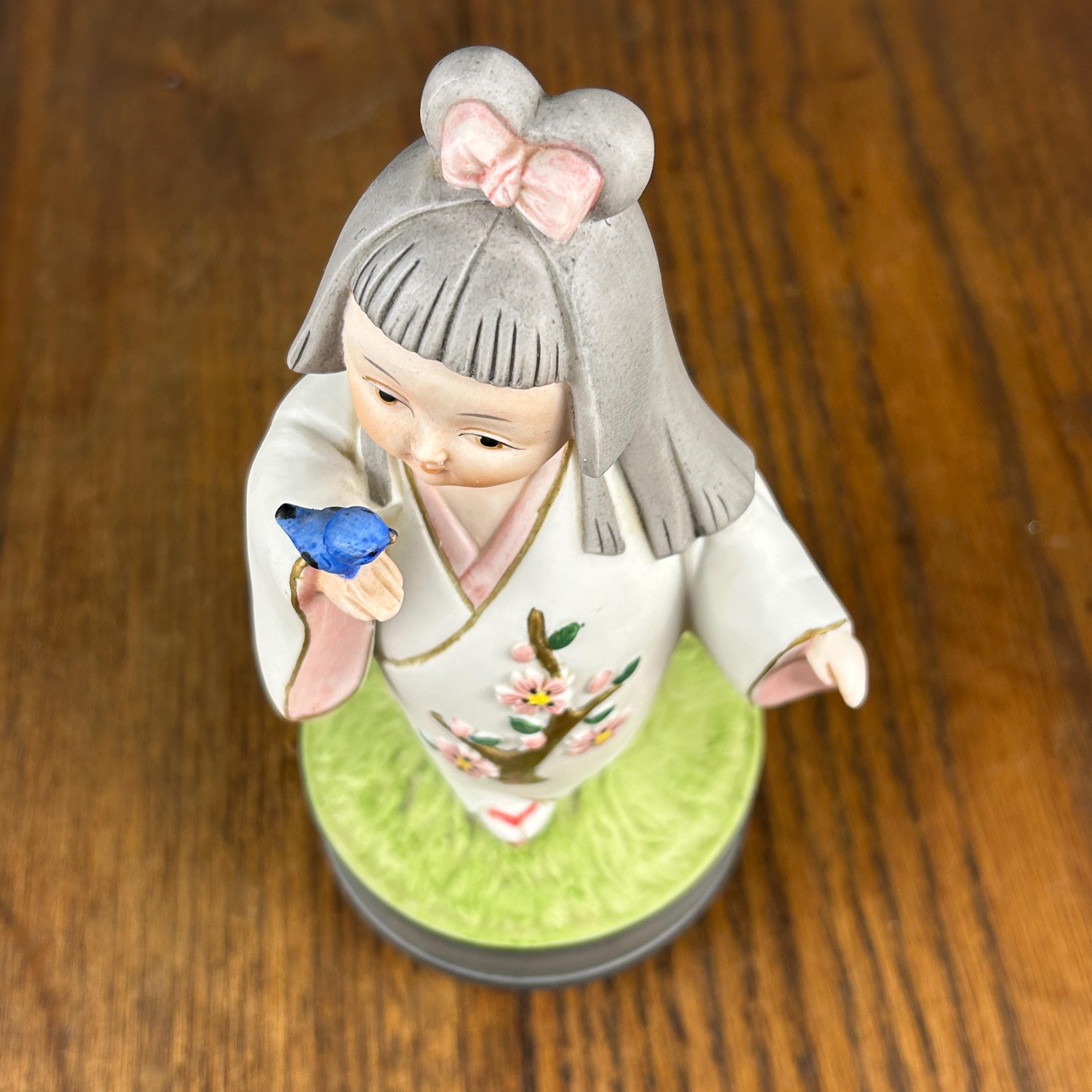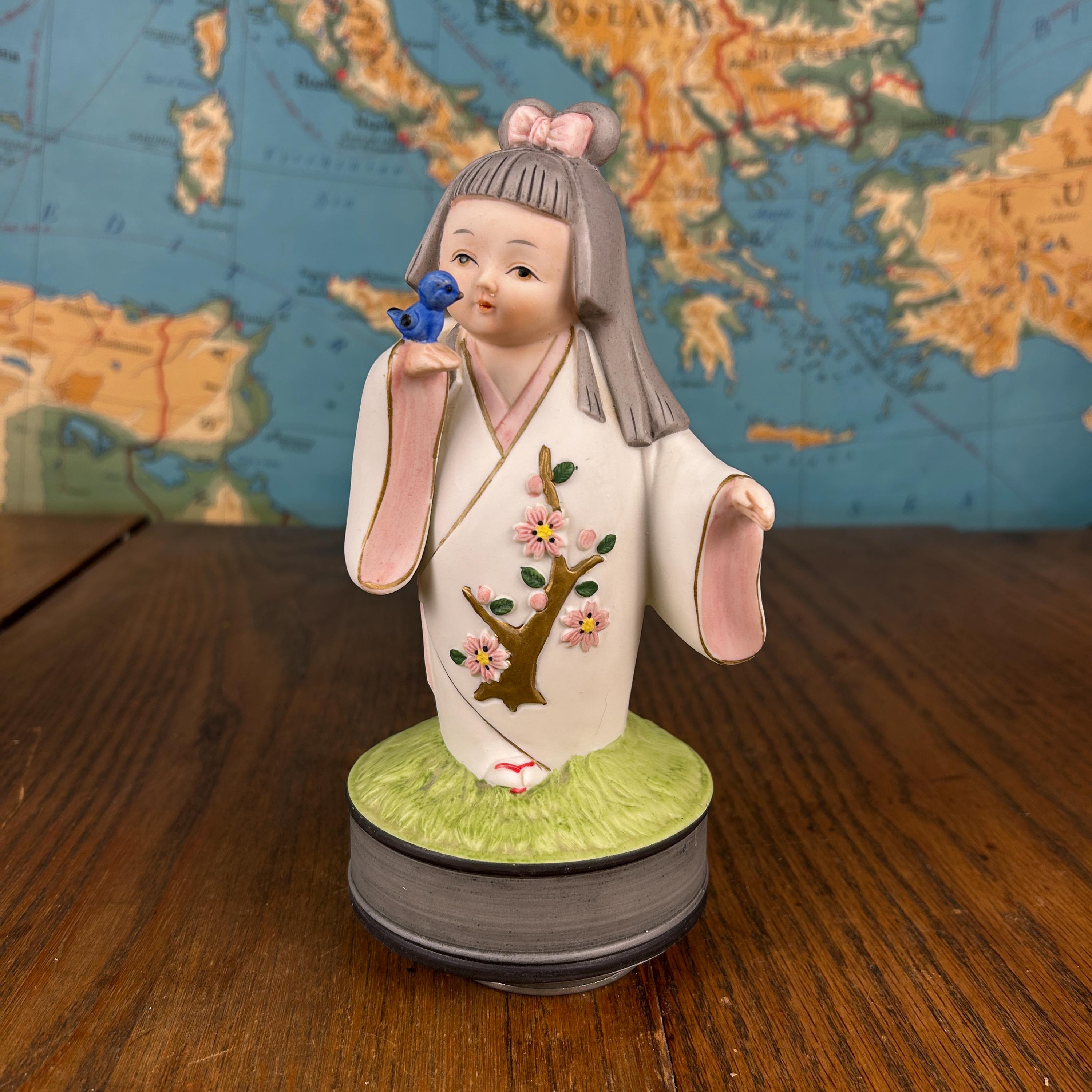This beautiful vintage Japanese Hakata ceramic musical figurine features a delicate girl dressed in a traditional kimono, gently holding a bluebird—a symbol of happiness and hope.