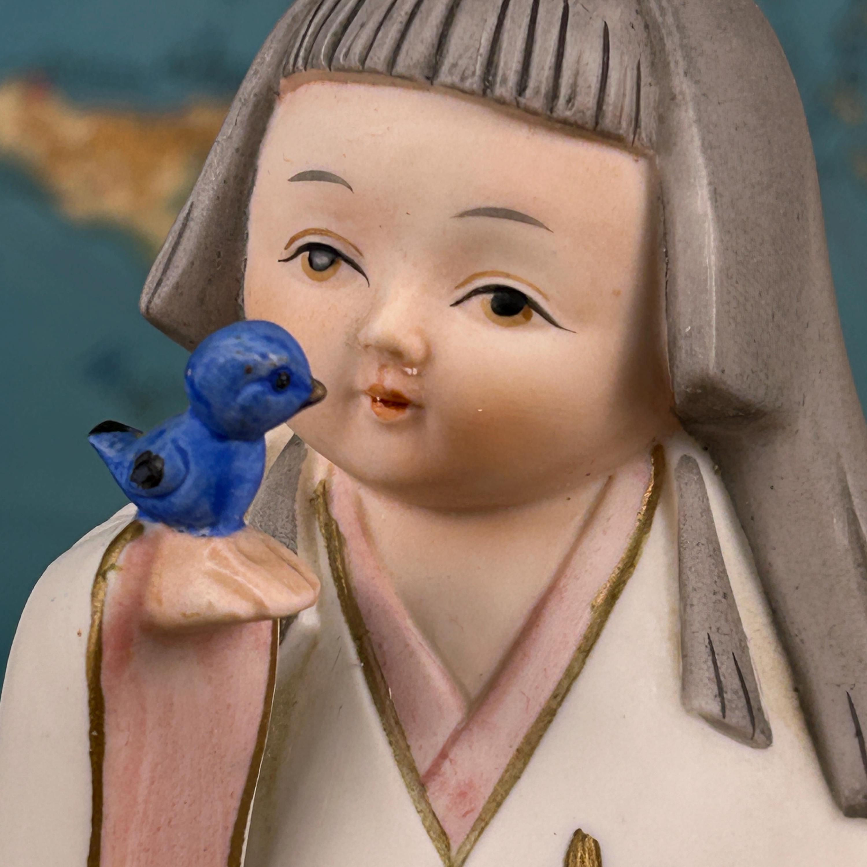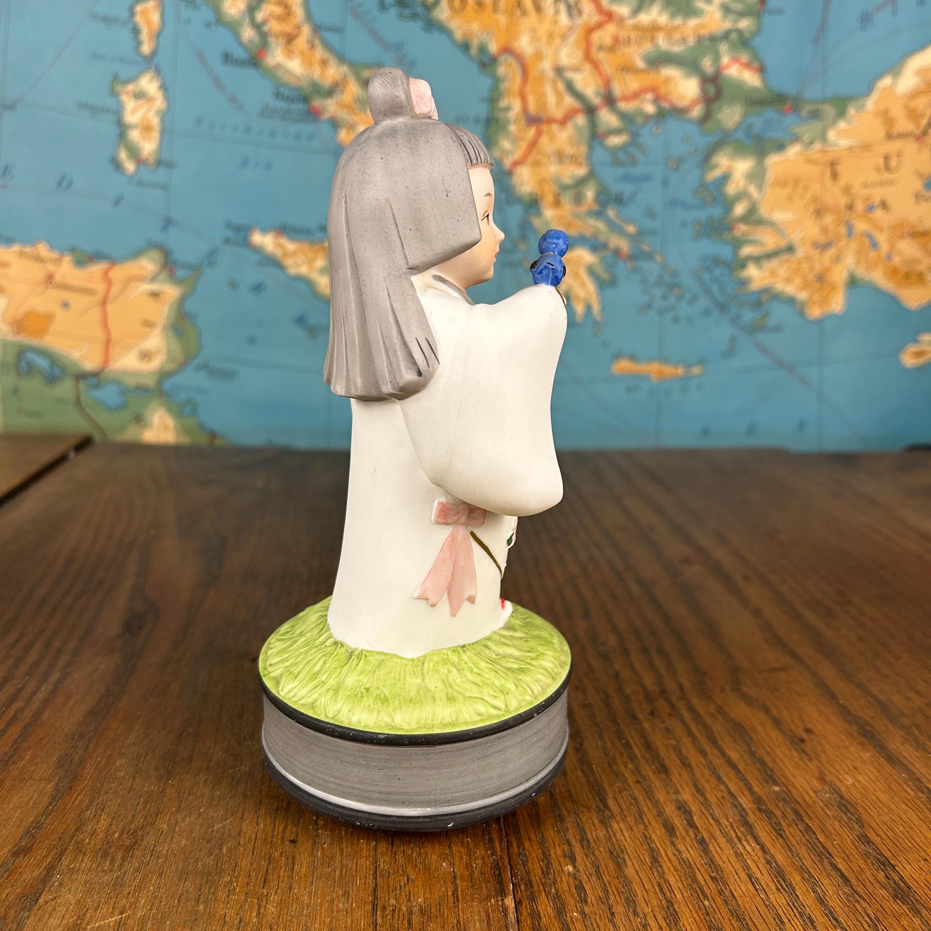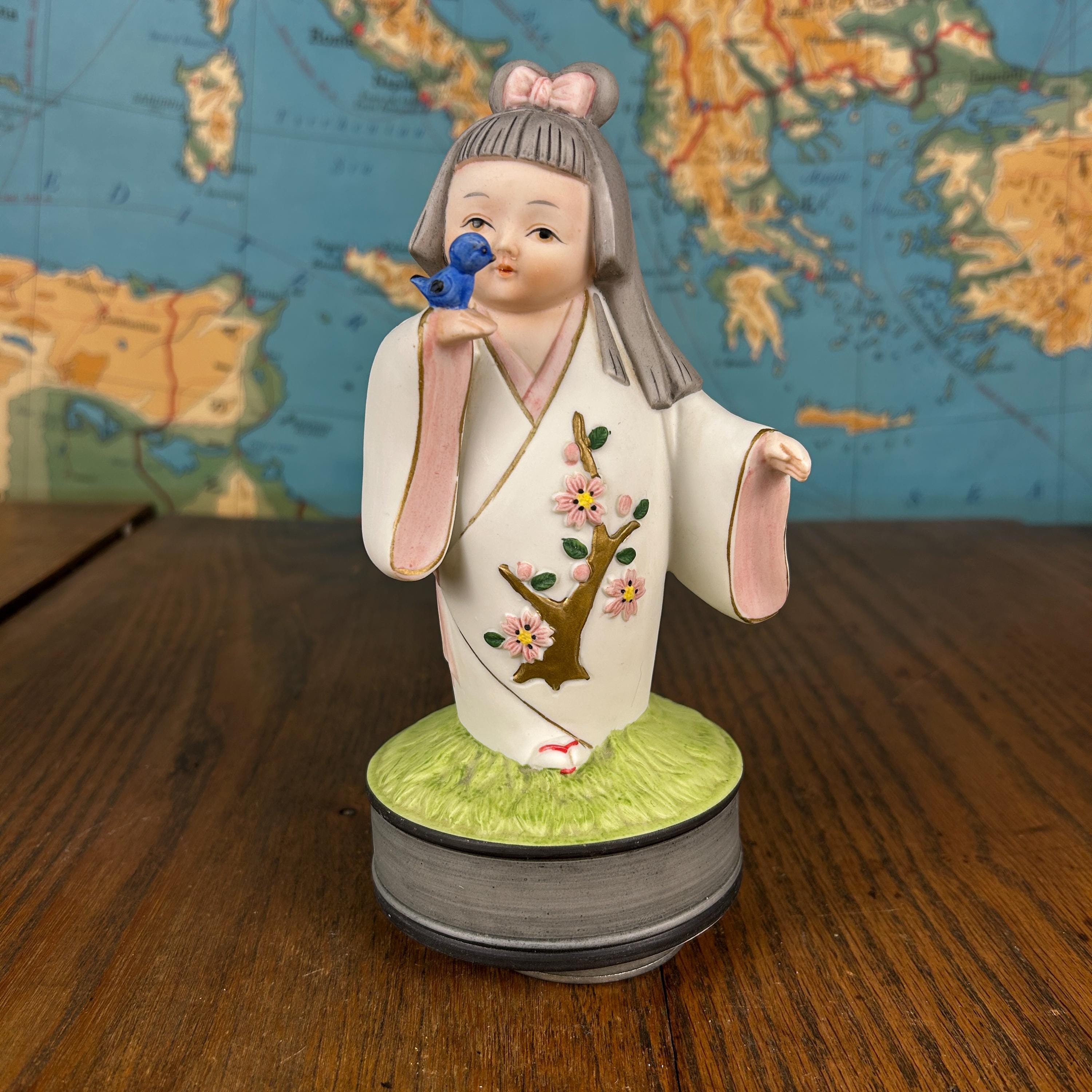 This beautiful vintage Japanese Hakata ceramic musical figurine features a delicate girl dressed in a traditional kimono, gently holding a bluebird—a symbol of happiness and hope.