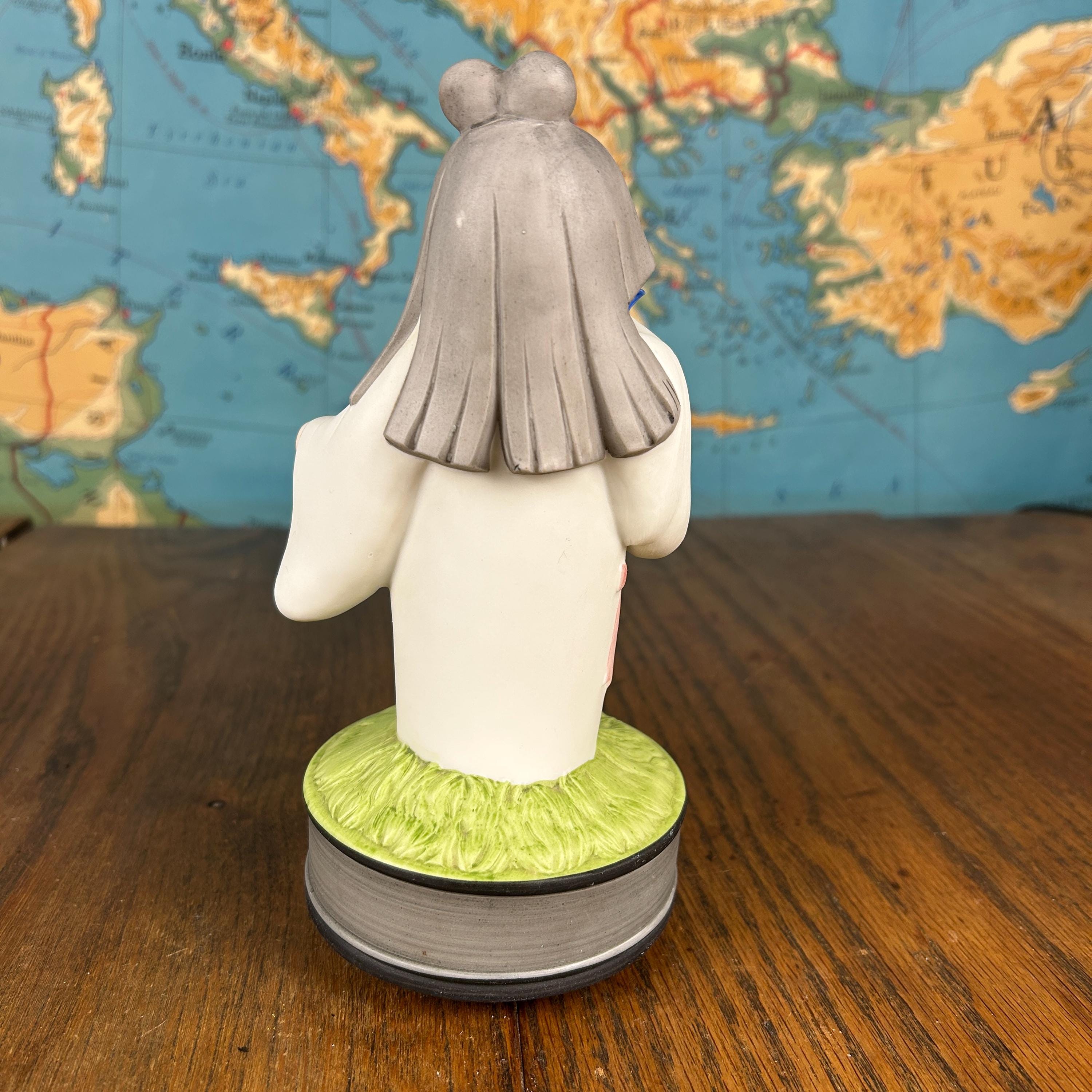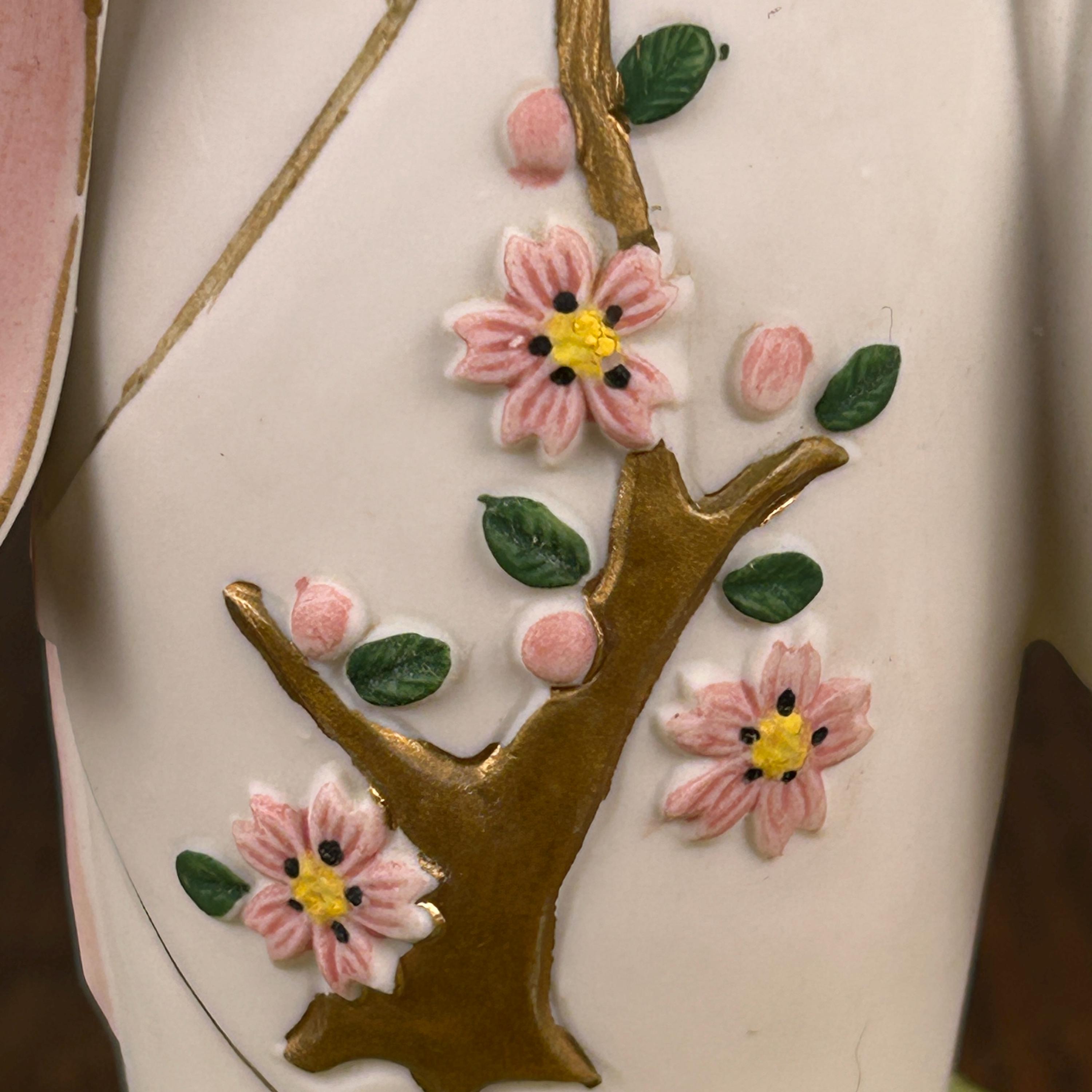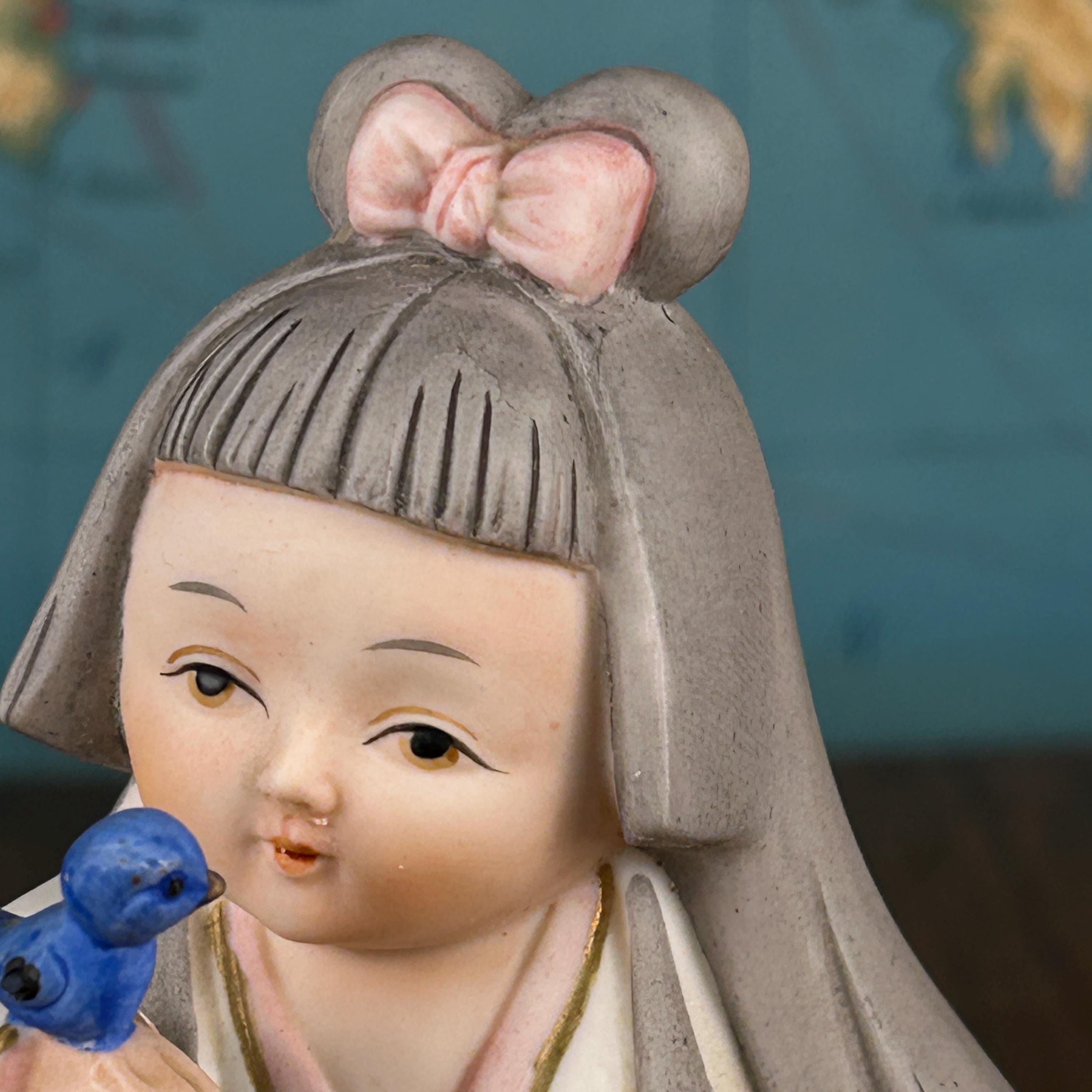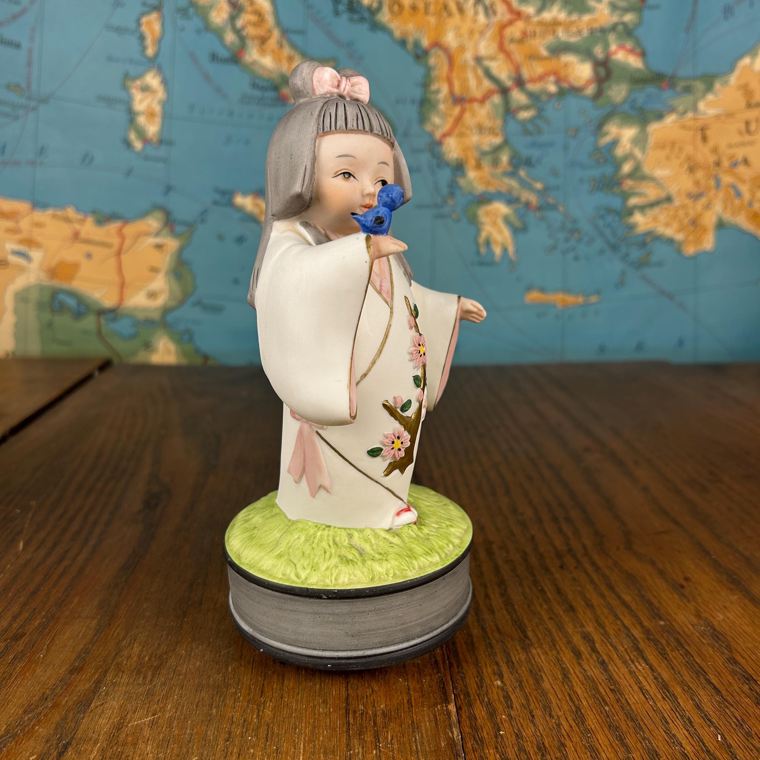 This beautiful vintage Japanese Hakata ceramic musical figurine features a delicate girl dressed in a traditional kimono, gently holding a bluebird—a symbol of happiness and hope.
