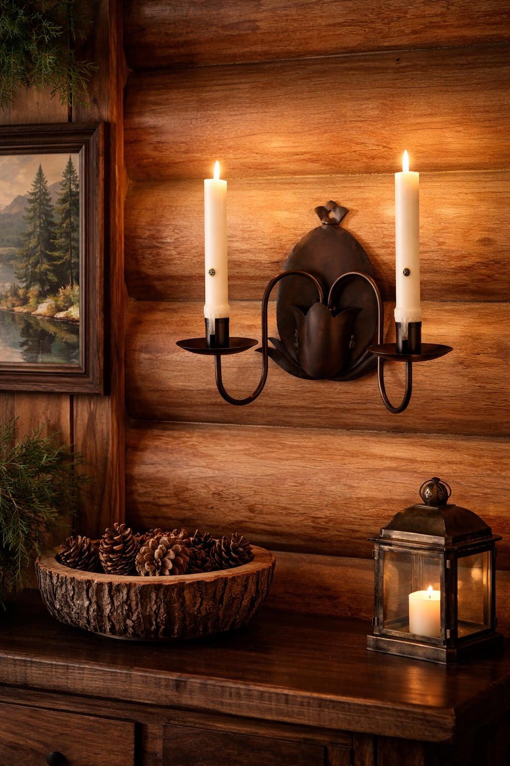 Featuring a classic pineapple motif—a historic symbol of hospitality—paired with a graceful tulip form and two candelabra arms, this sconce brings warmth and old-world charm to any space. The rich iron finish and sculptural silhouette make it a perfect statement piece for rustic, Spanish Revival, or traditional interiors.