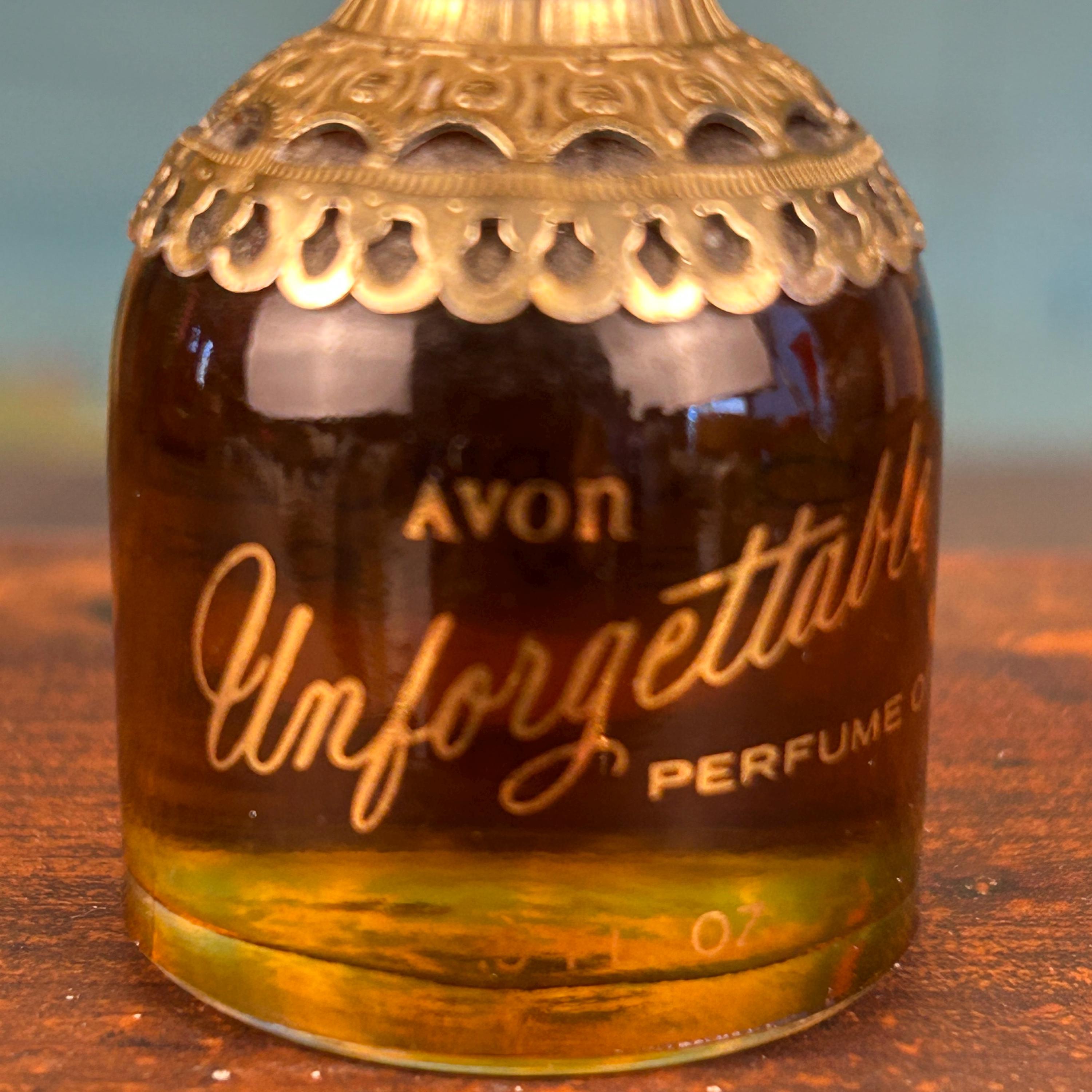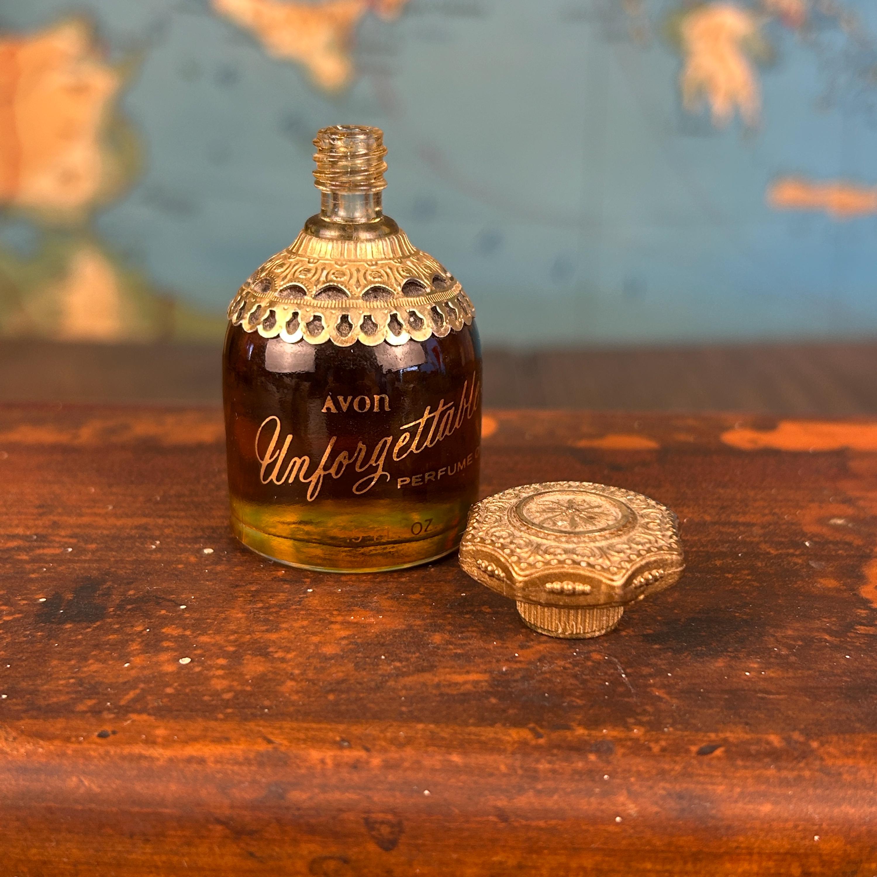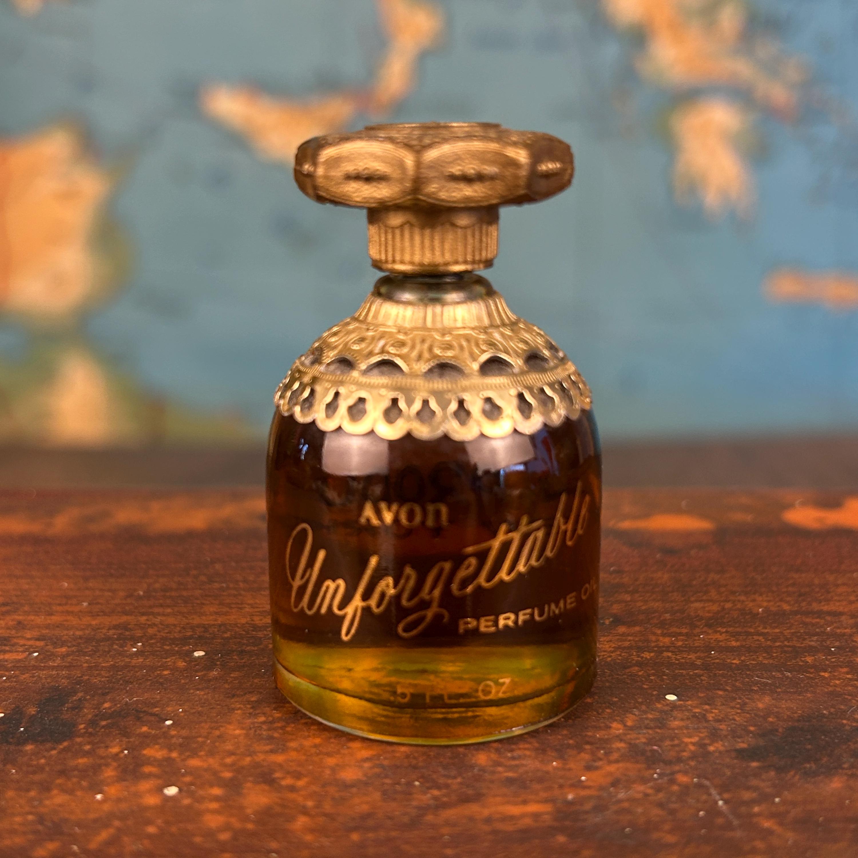 This lovely vintage Avon “Unforgettable” perfume oil is a beautiful piece of retro vanity decor, dating to the 1960s–1970s.