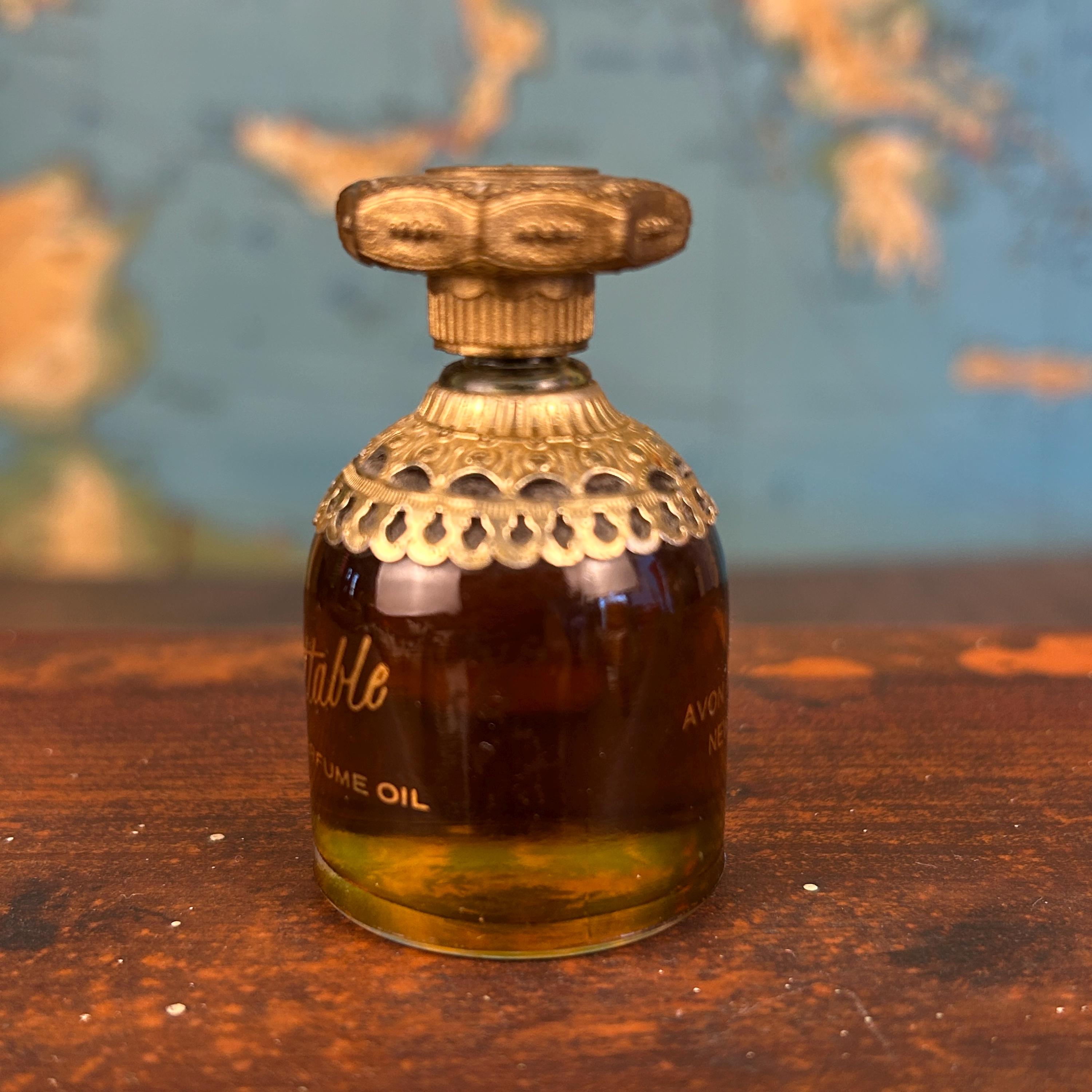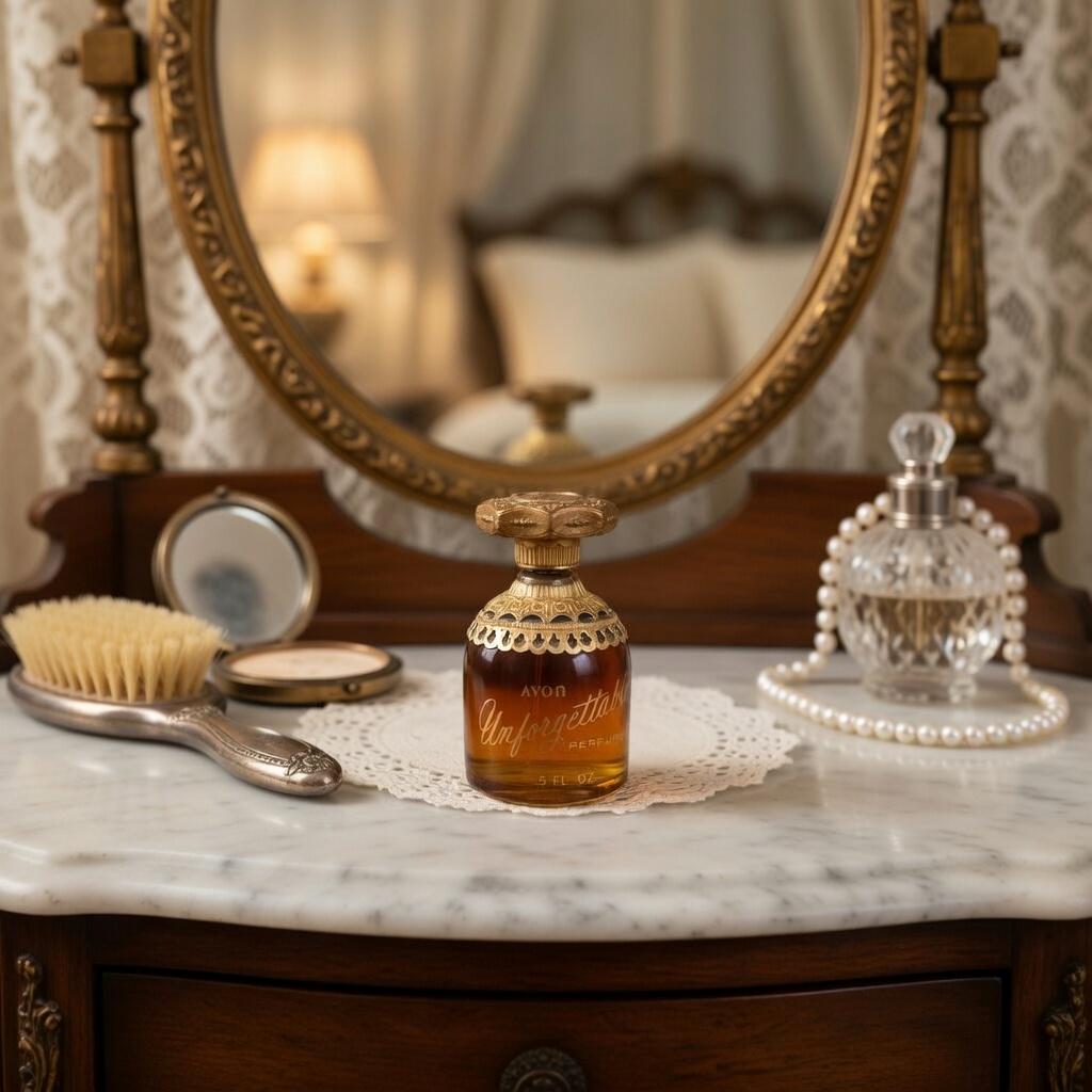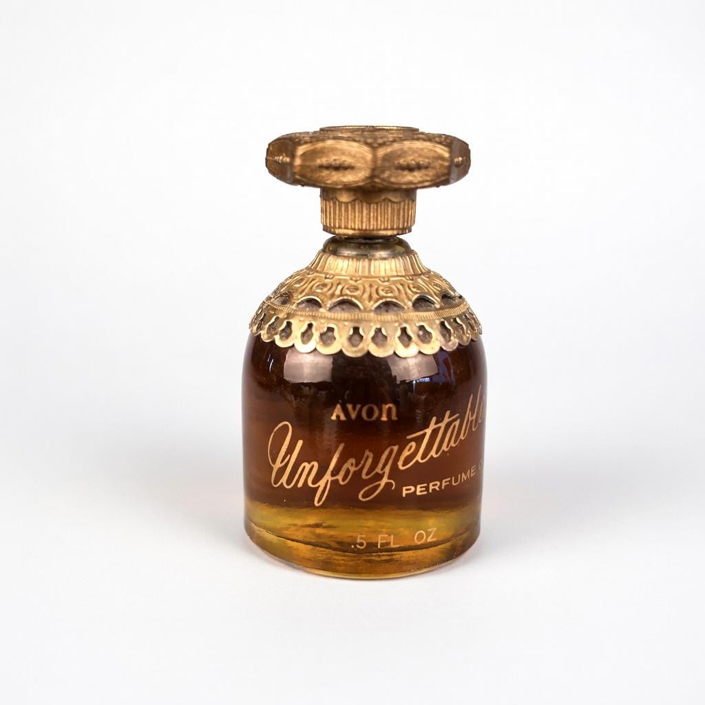 This lovely vintage Avon “Unforgettable” perfume oil is a beautiful piece of retro vanity decor, dating to the 1960s–1970s.