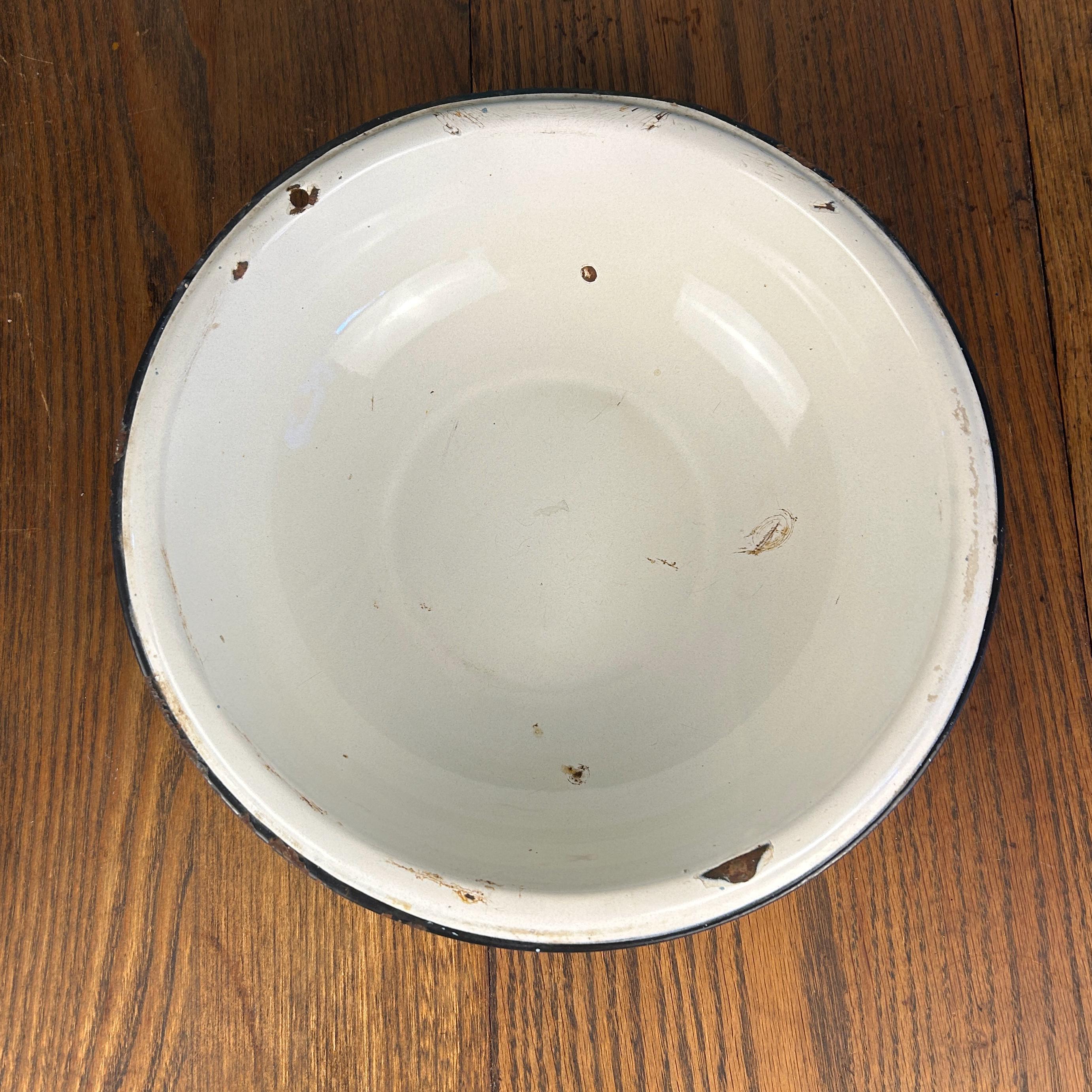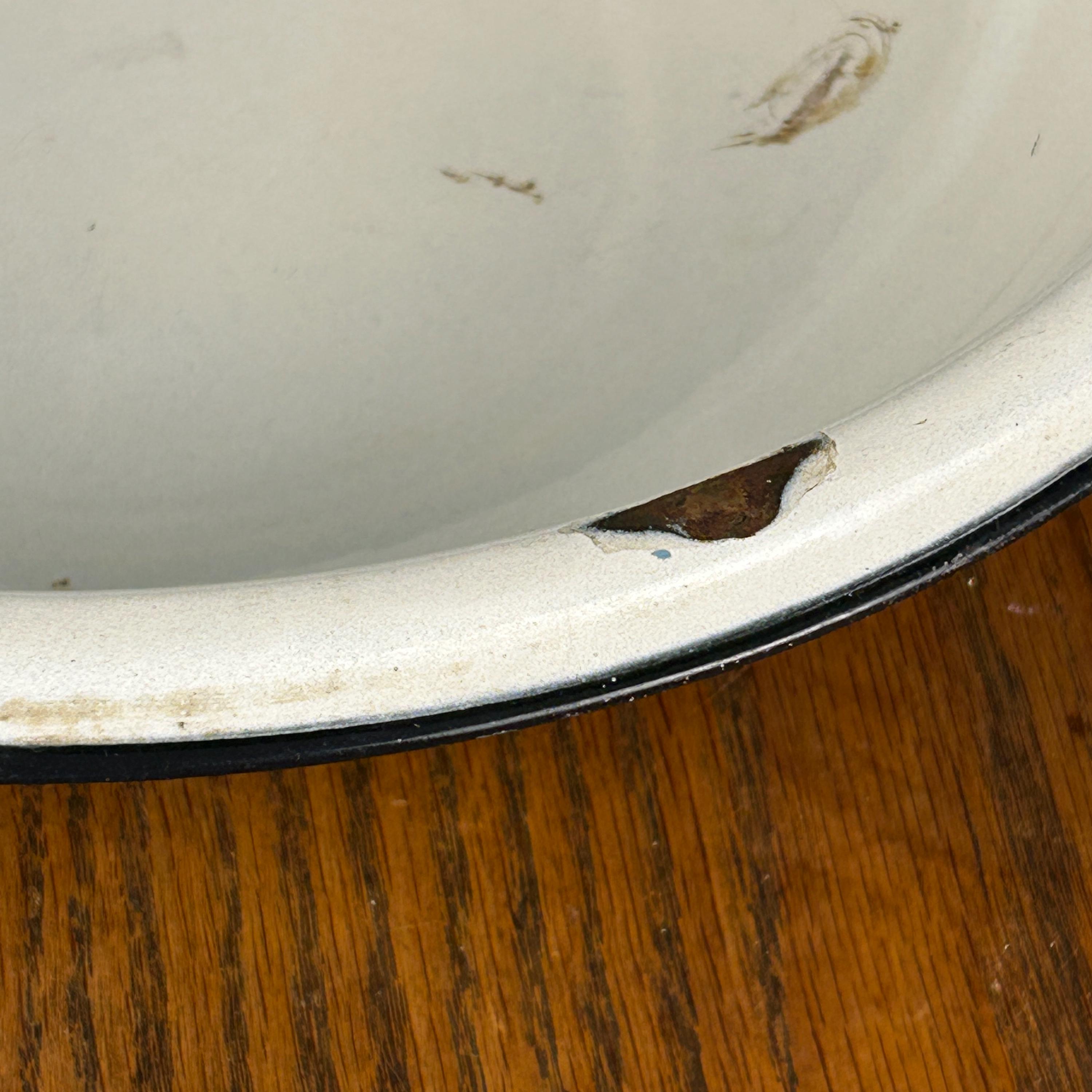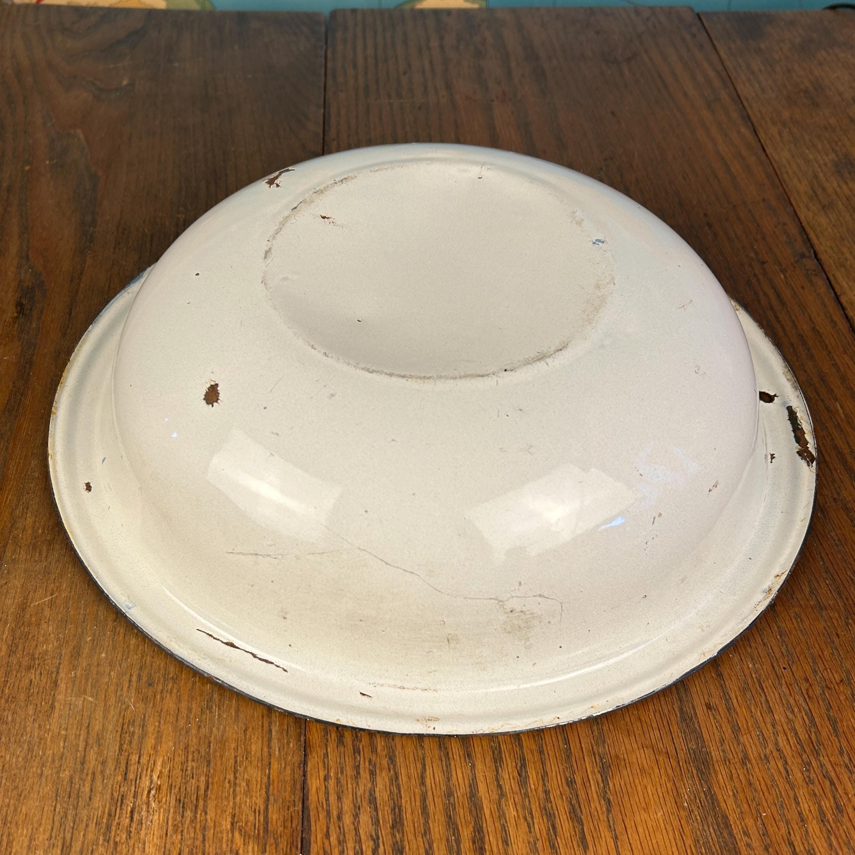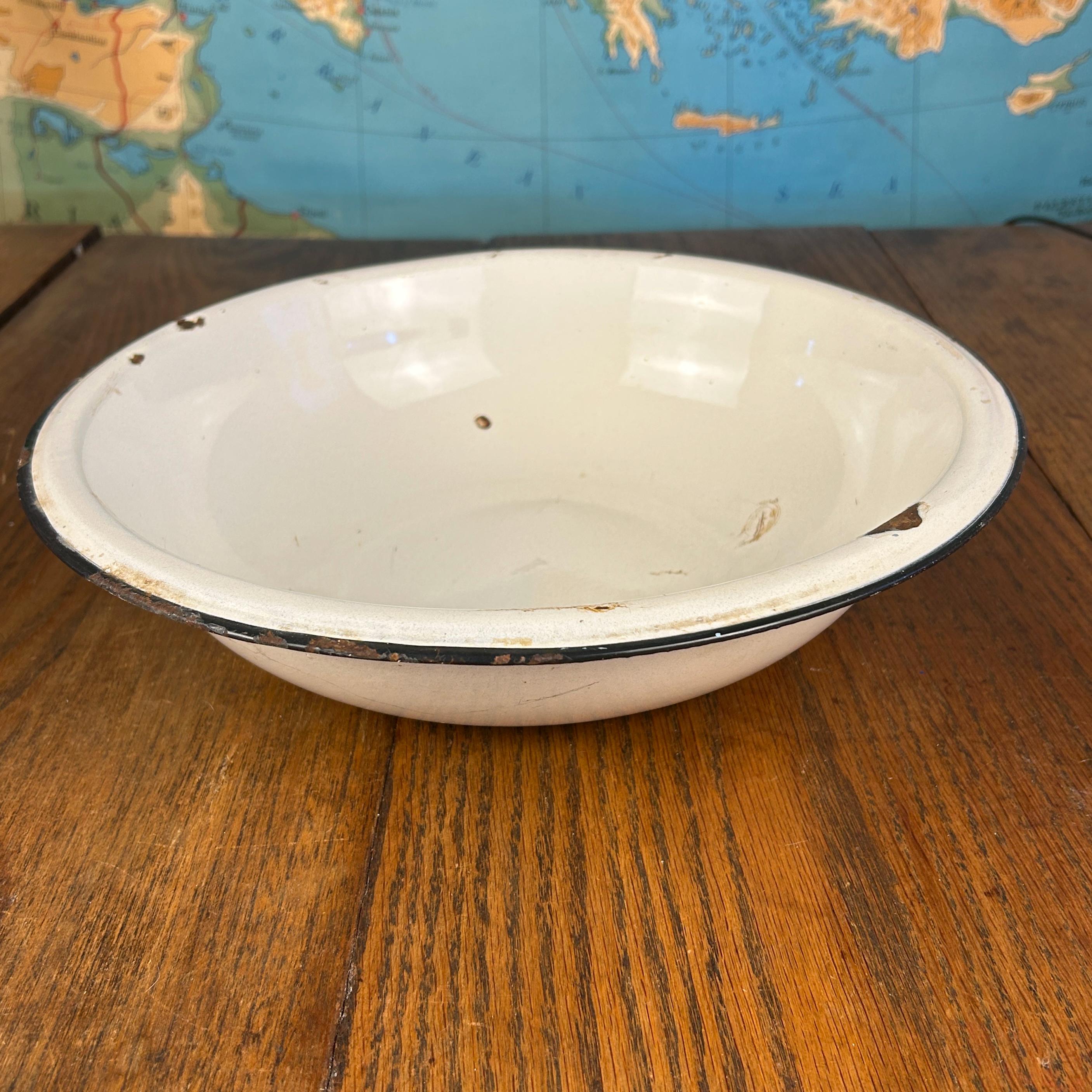 This classic vintage enamelware basin bowl, often called graniteware, is a timeless farmhouse staple with endless charm.