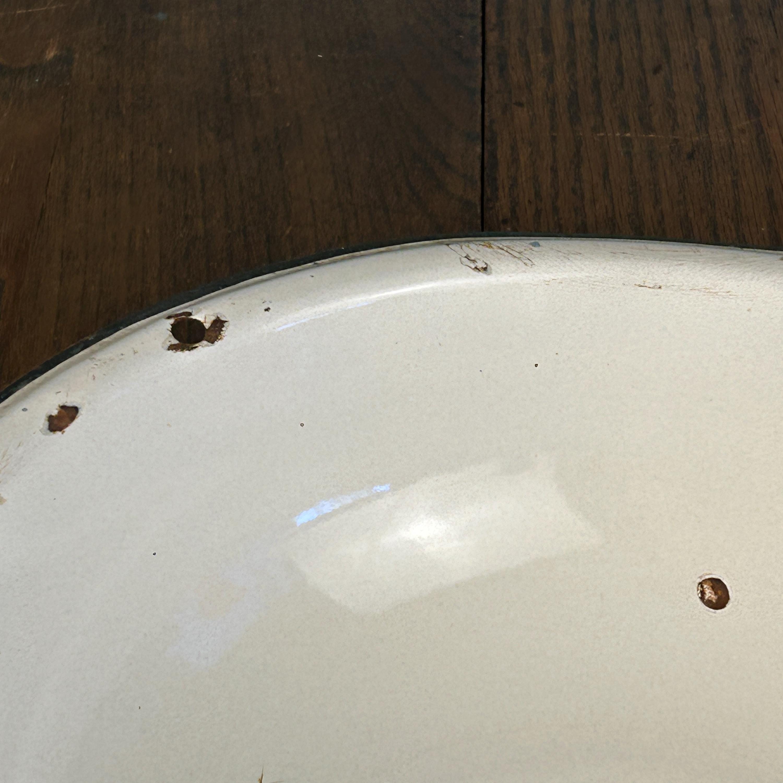 Featuring a clean white enamel interior with a contrasting blue rim, this piece has the perfectly worn look that makes vintage enamelware so loved. Originally used as a washbasin or mixing bowl, it now makes a beautiful addition to rustic kitchens, farmhouse decor, or even as a planter.
