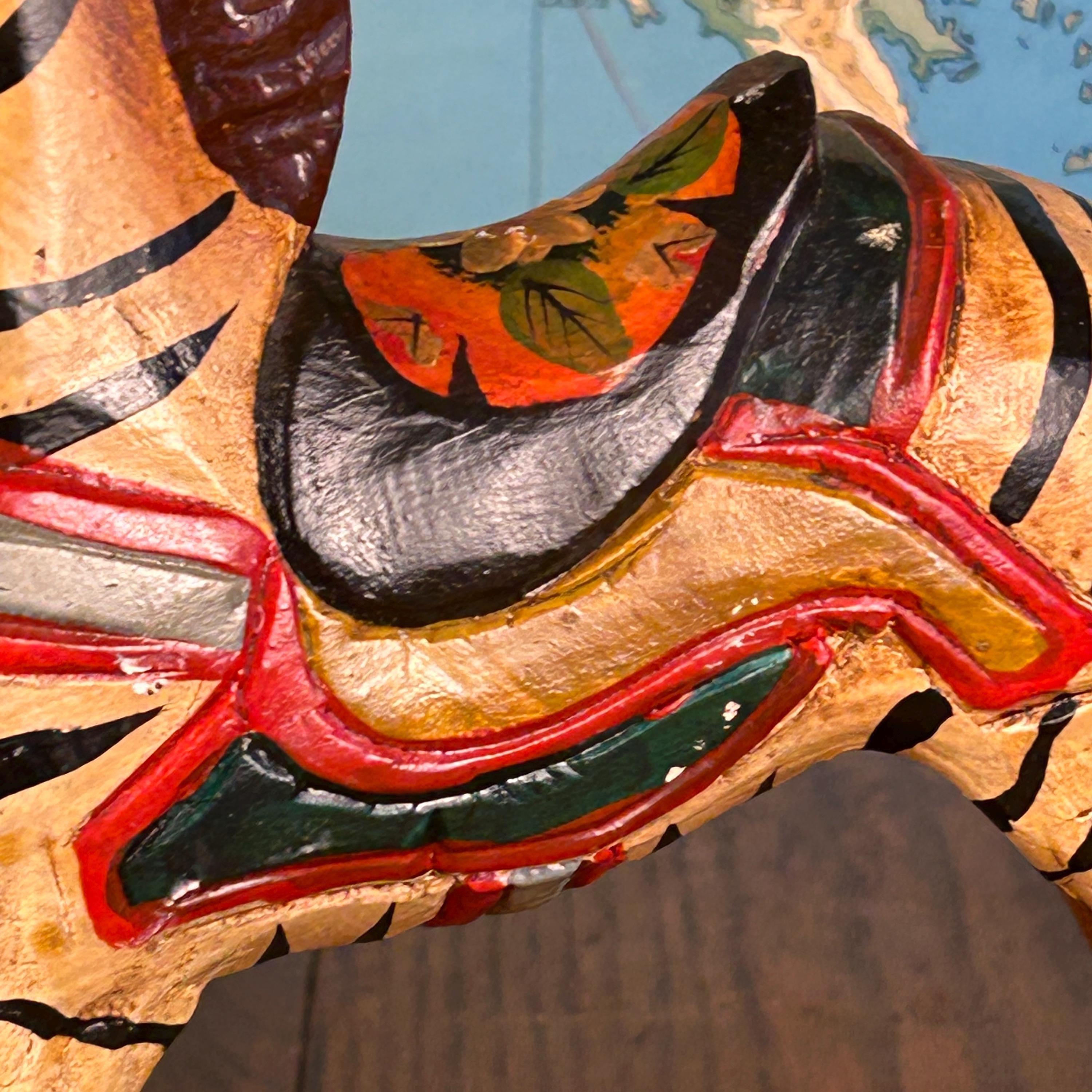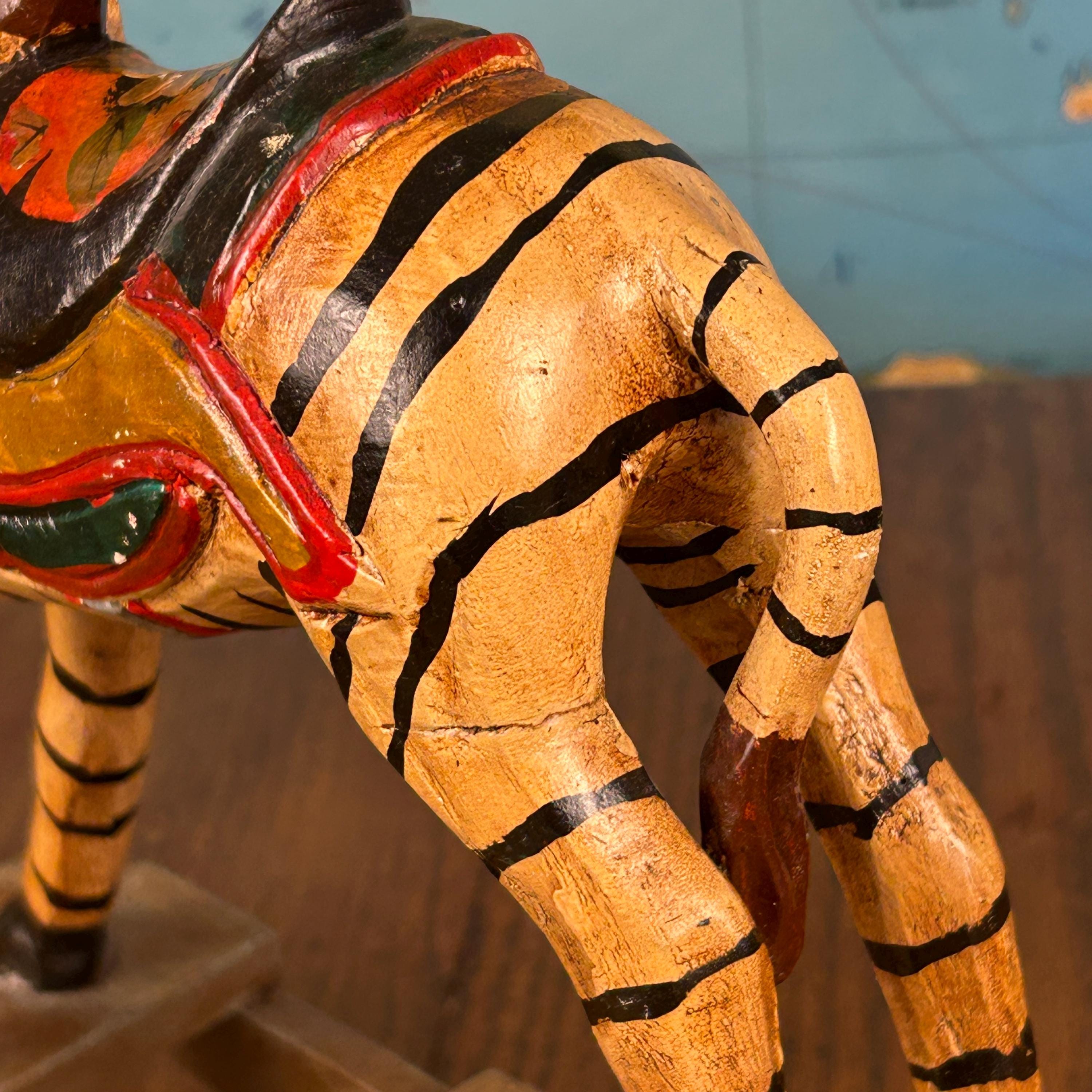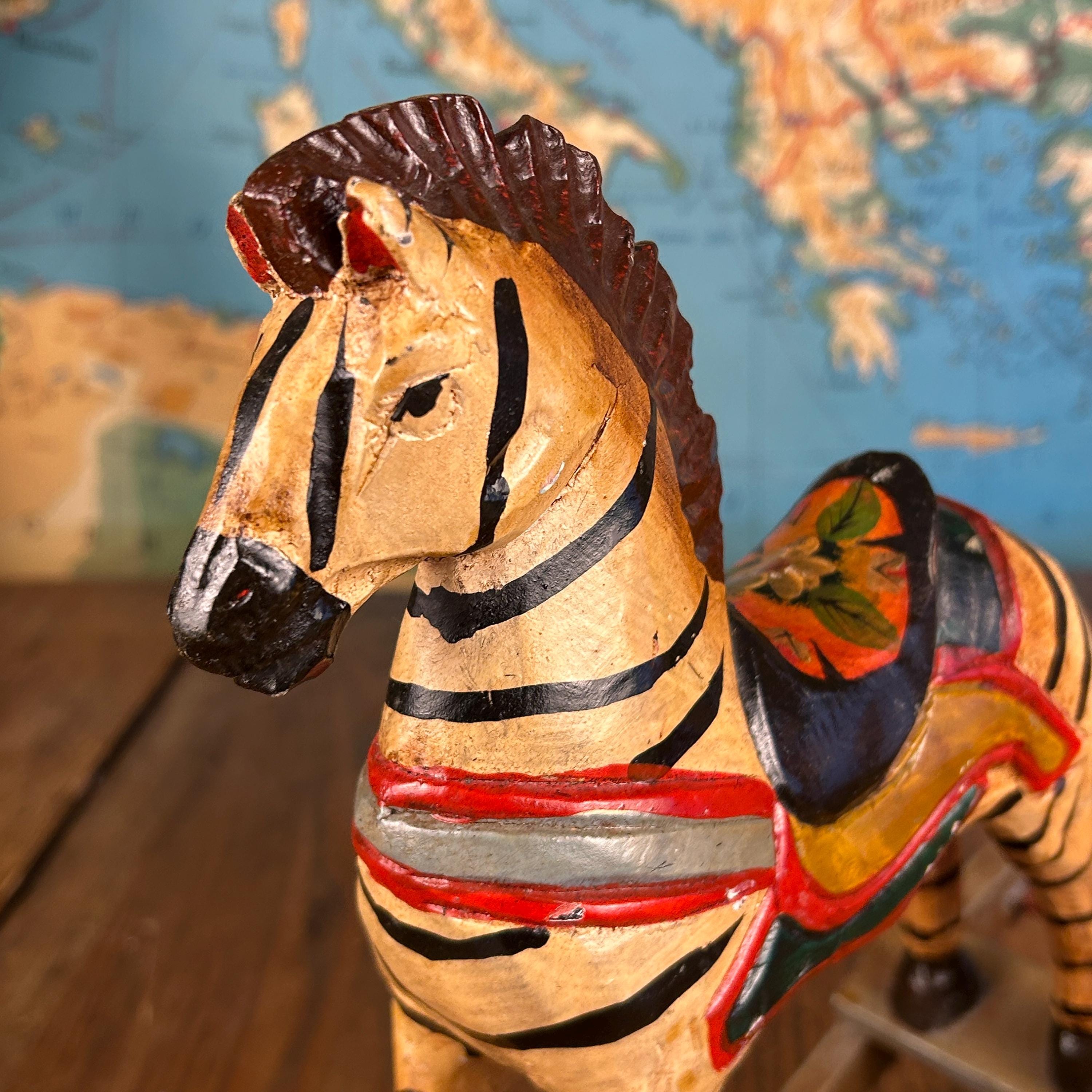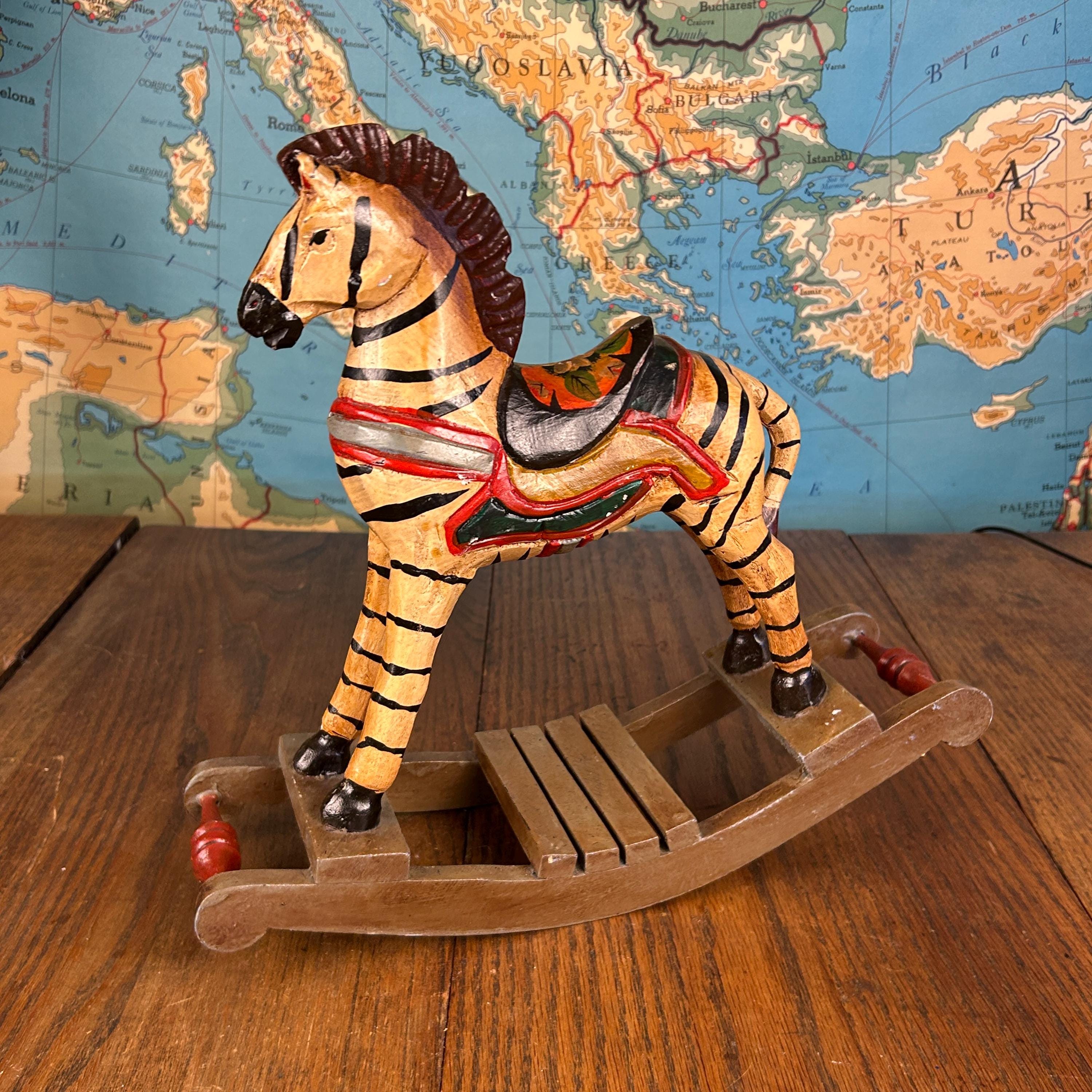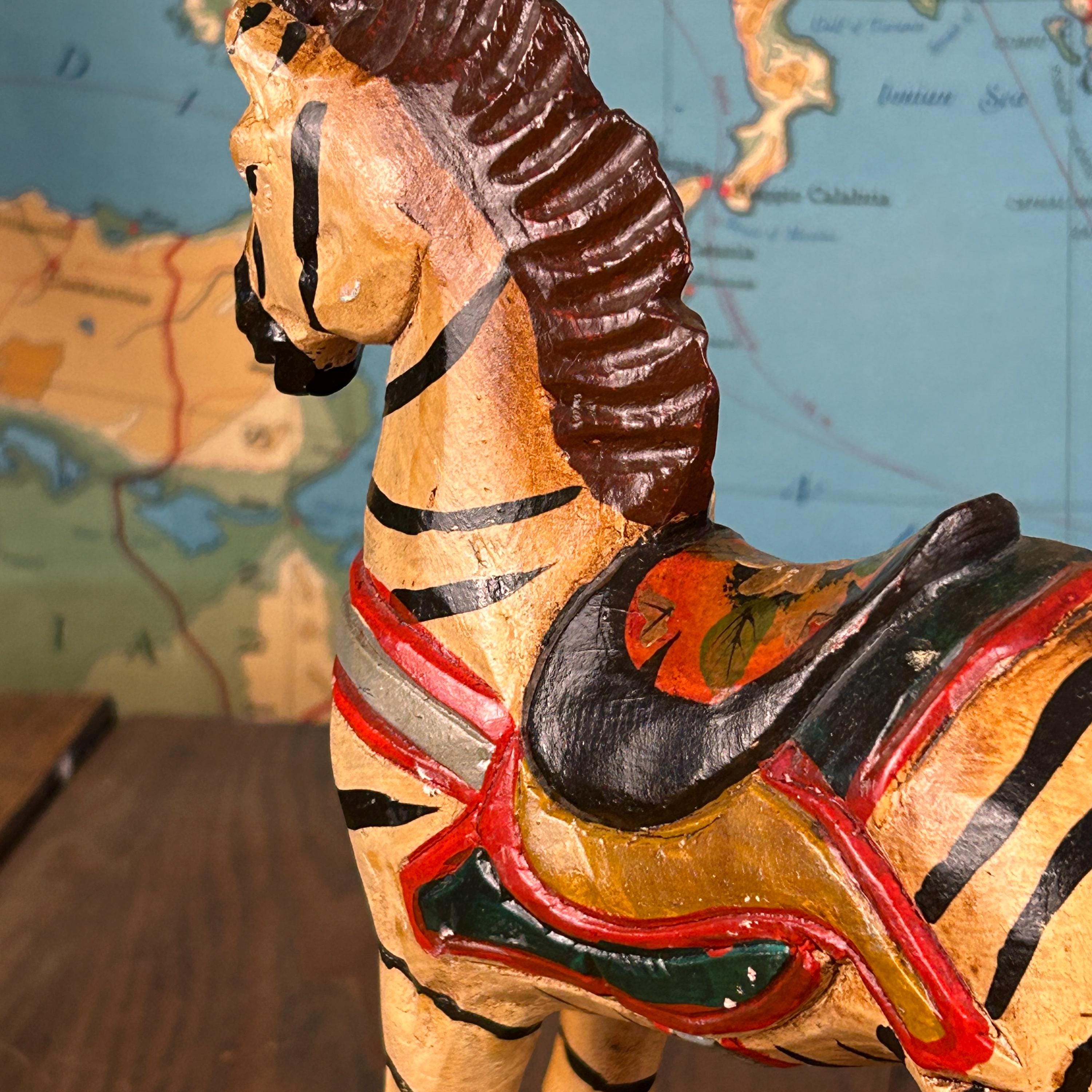 Beautifully hand-painted with bold black stripes, a carved mane, and a colorful saddle, this piece has wonderful detail and personality. Whether displayed as decor or enjoyed as a gentle toy, it brings a warm, nostalgic feel to any space.