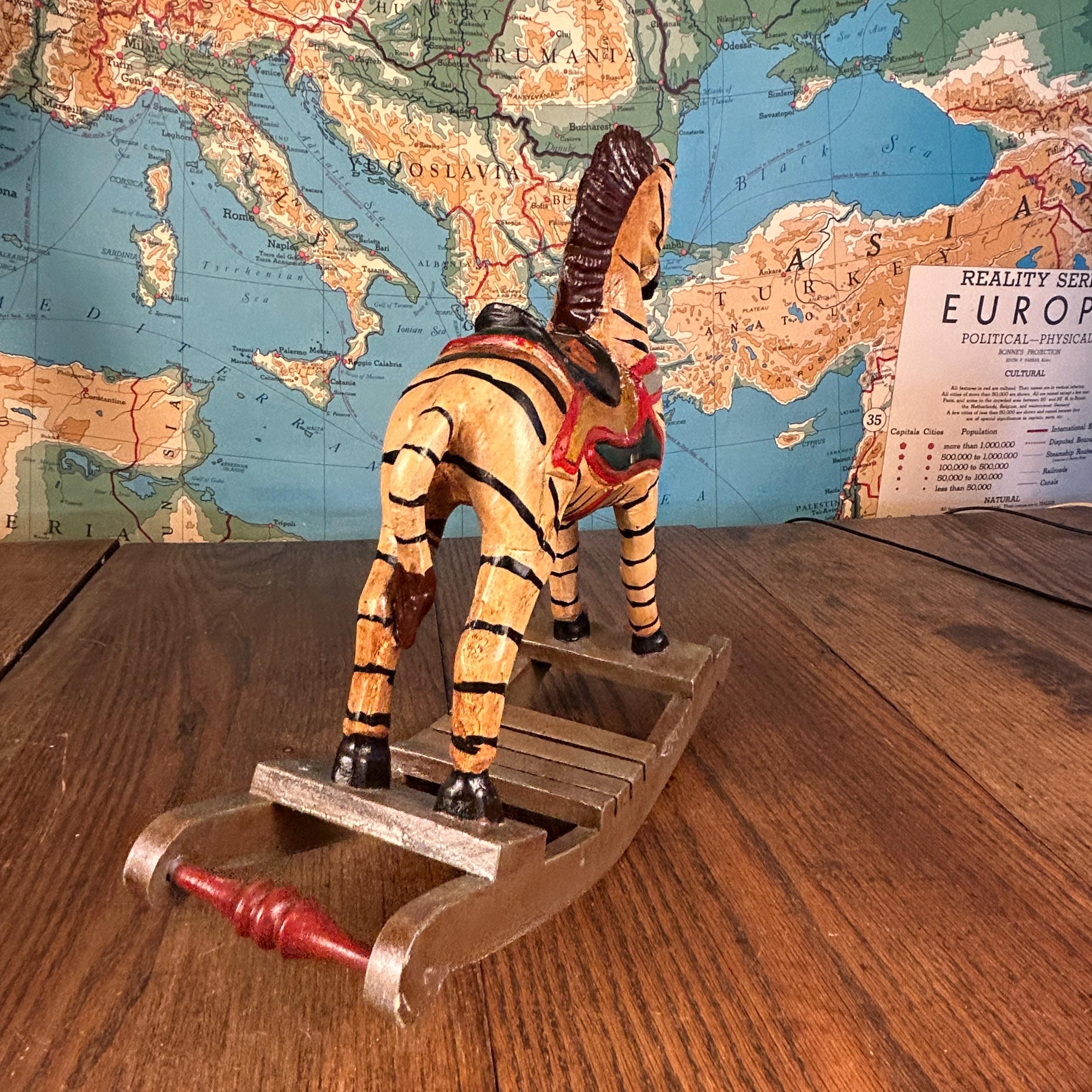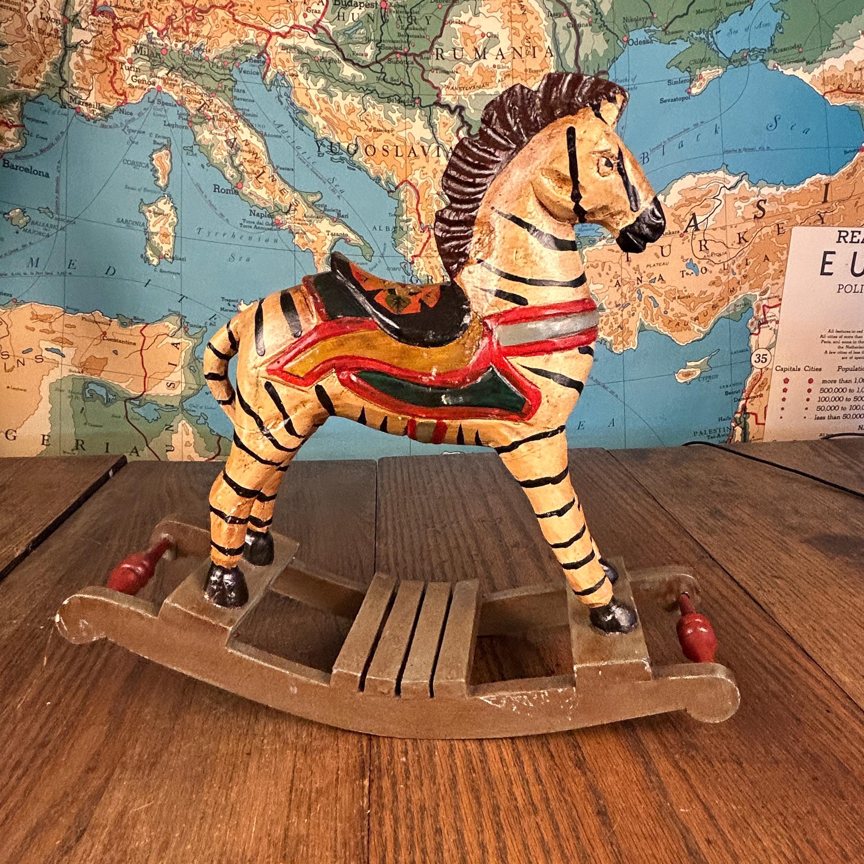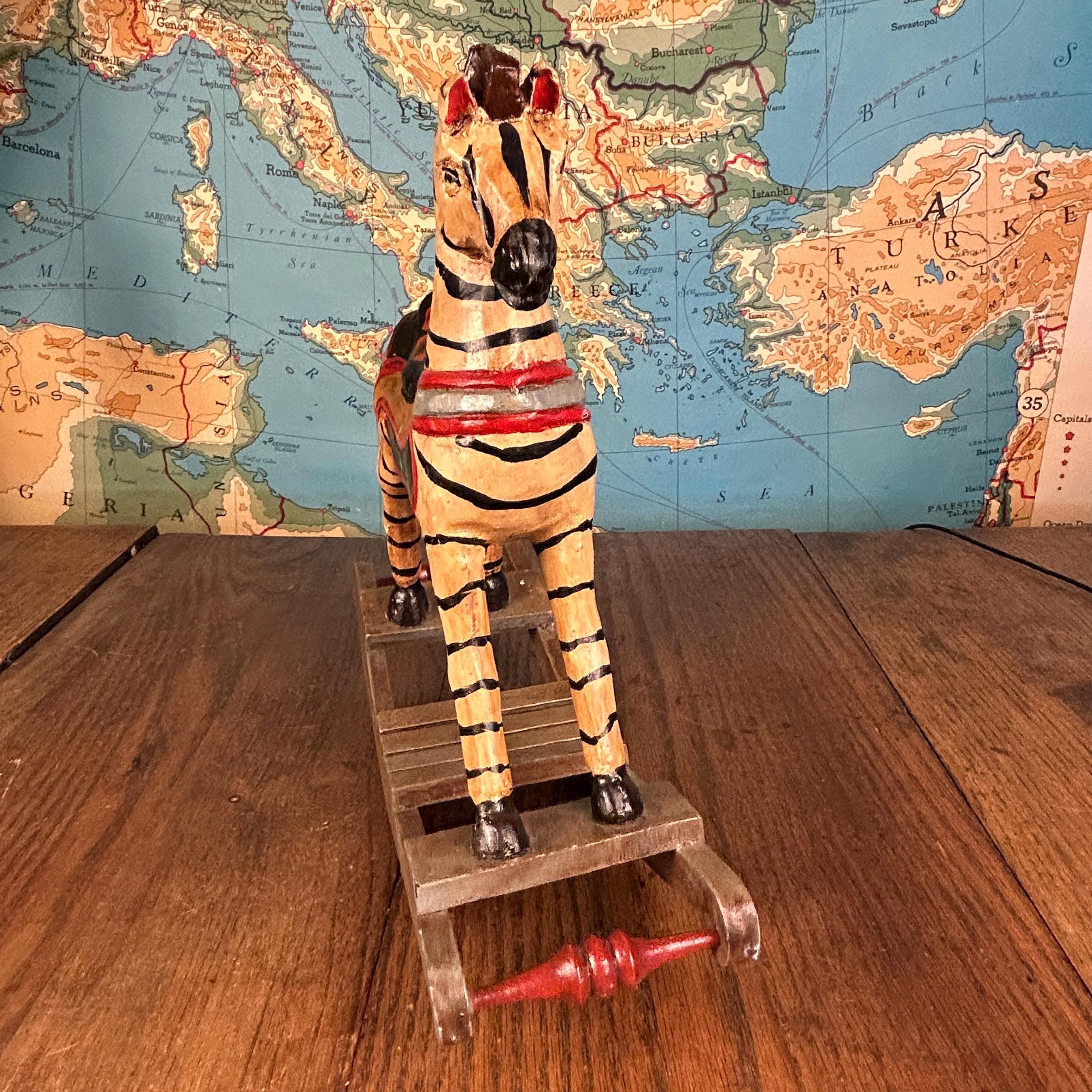 This delightful vintage hand-carved wooden rocking zebra is a charming piece of folk art that blends playful character with rustic craftsmanship.