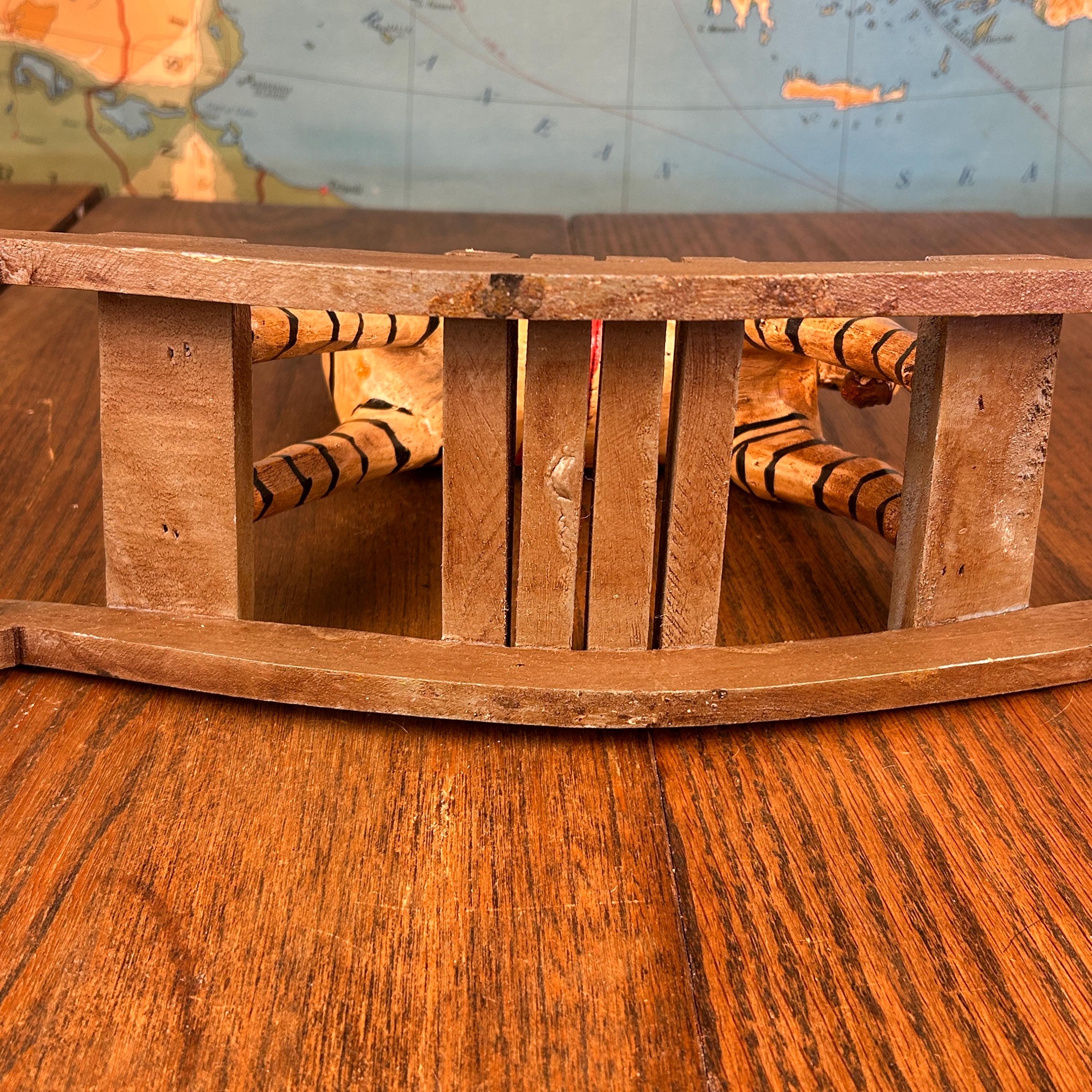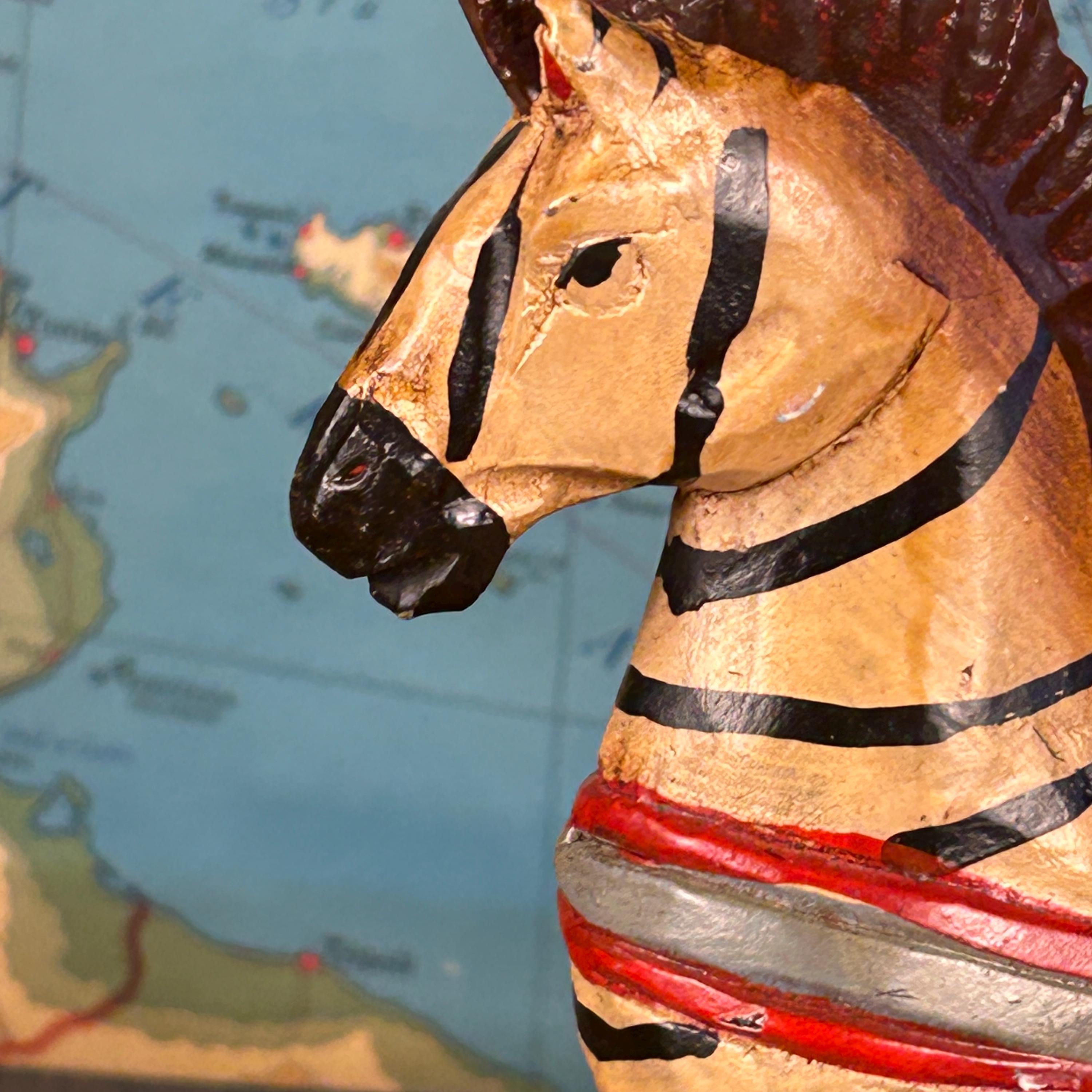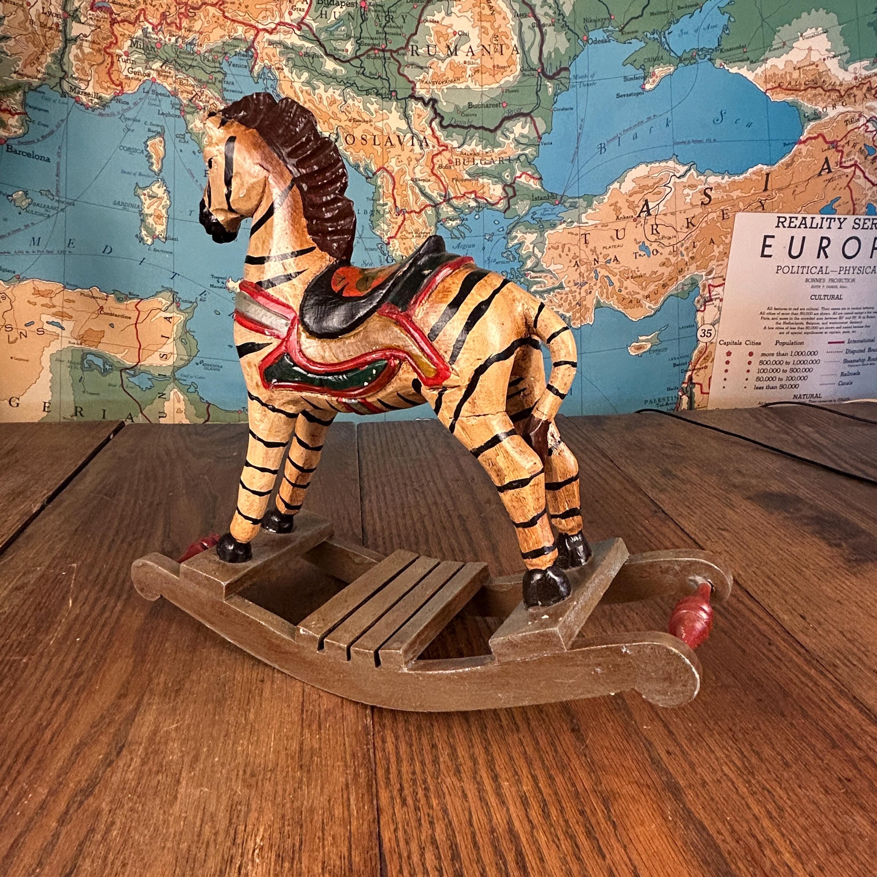 This delightful vintage hand-carved wooden rocking zebra is a charming piece of folk art that blends playful character with rustic craftsmanship.