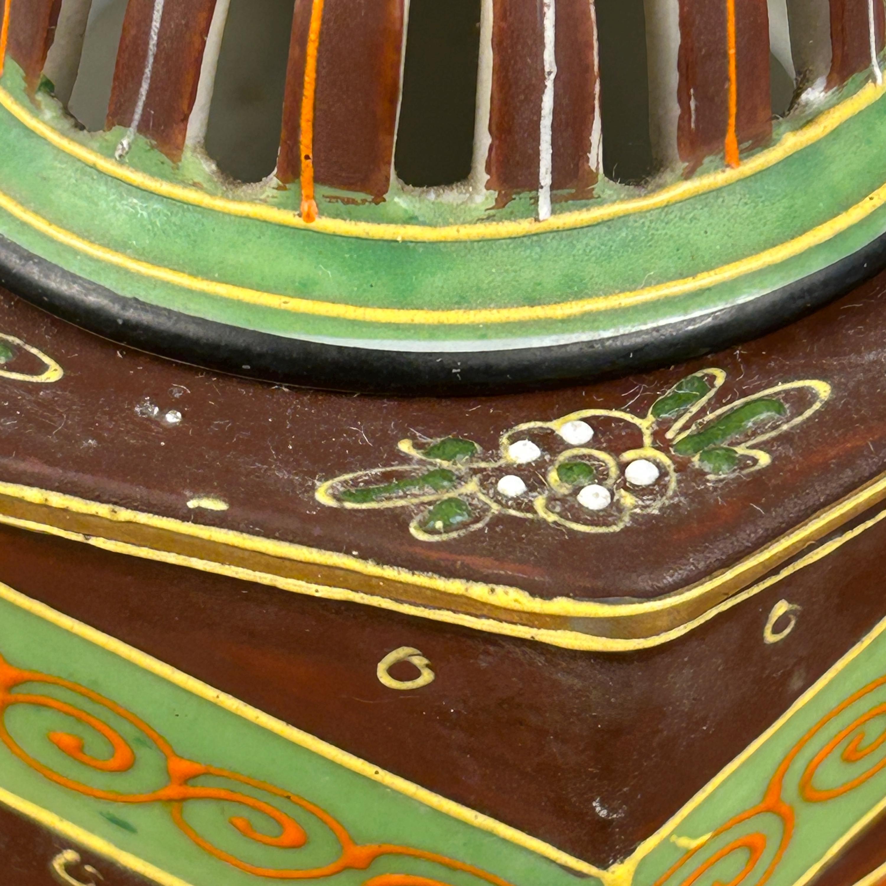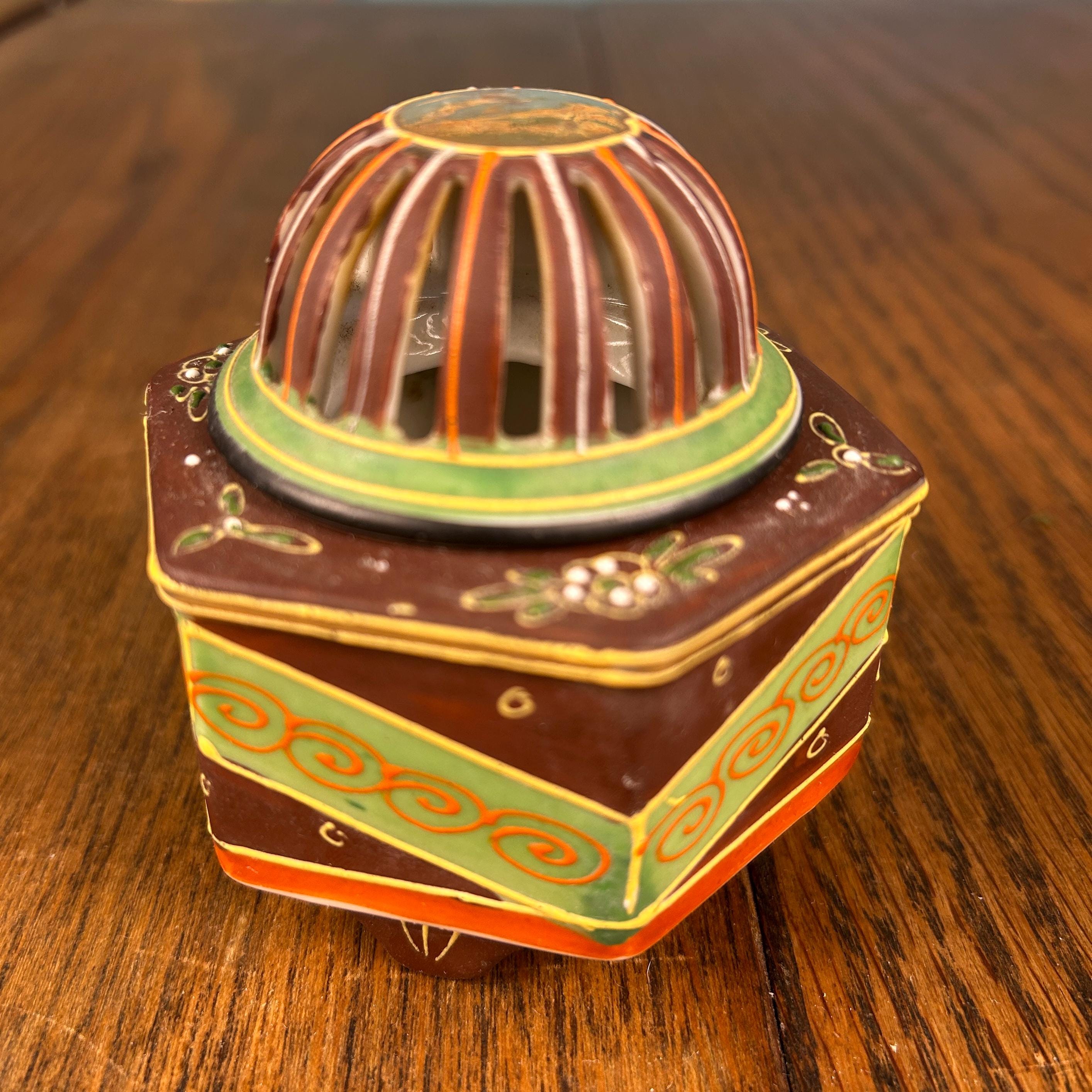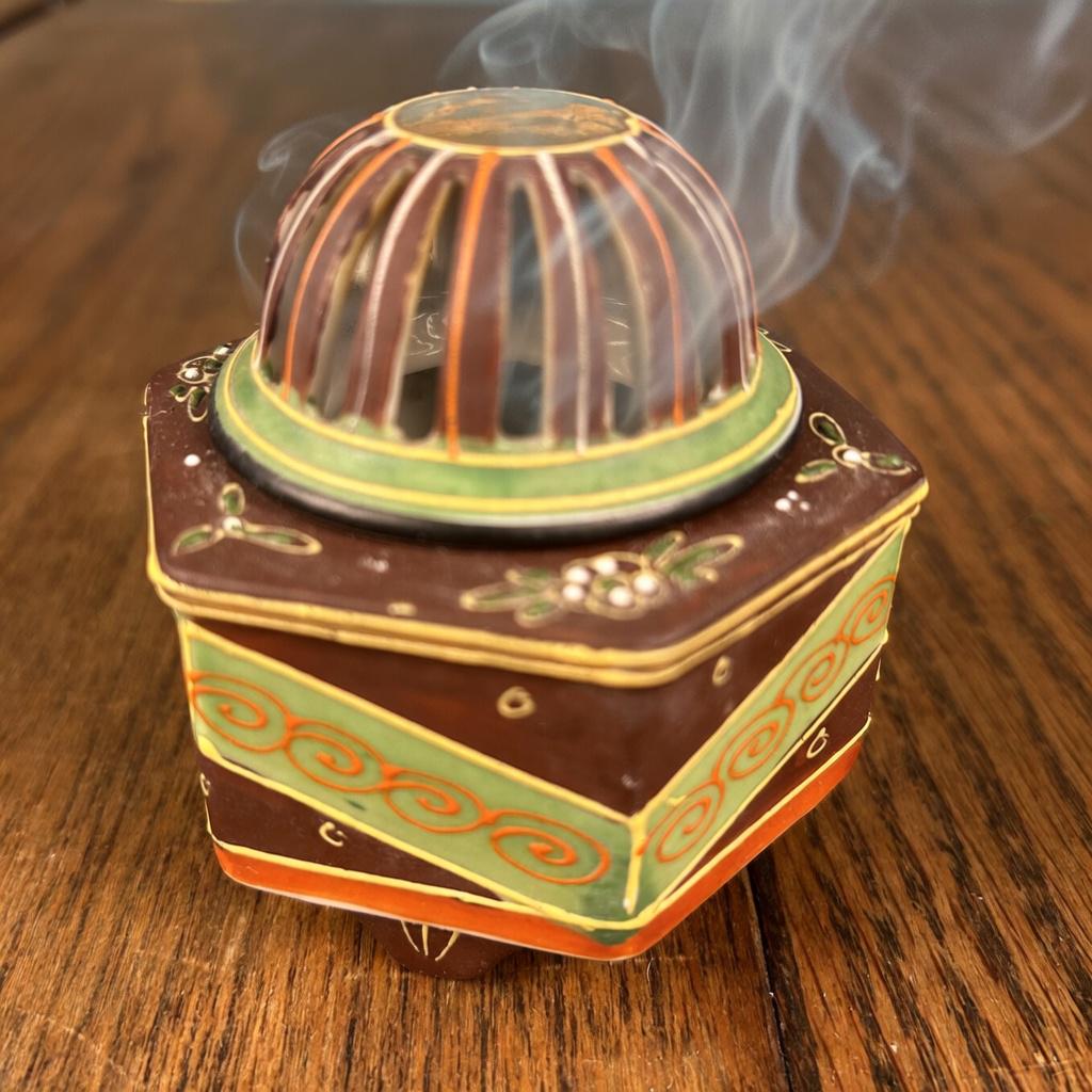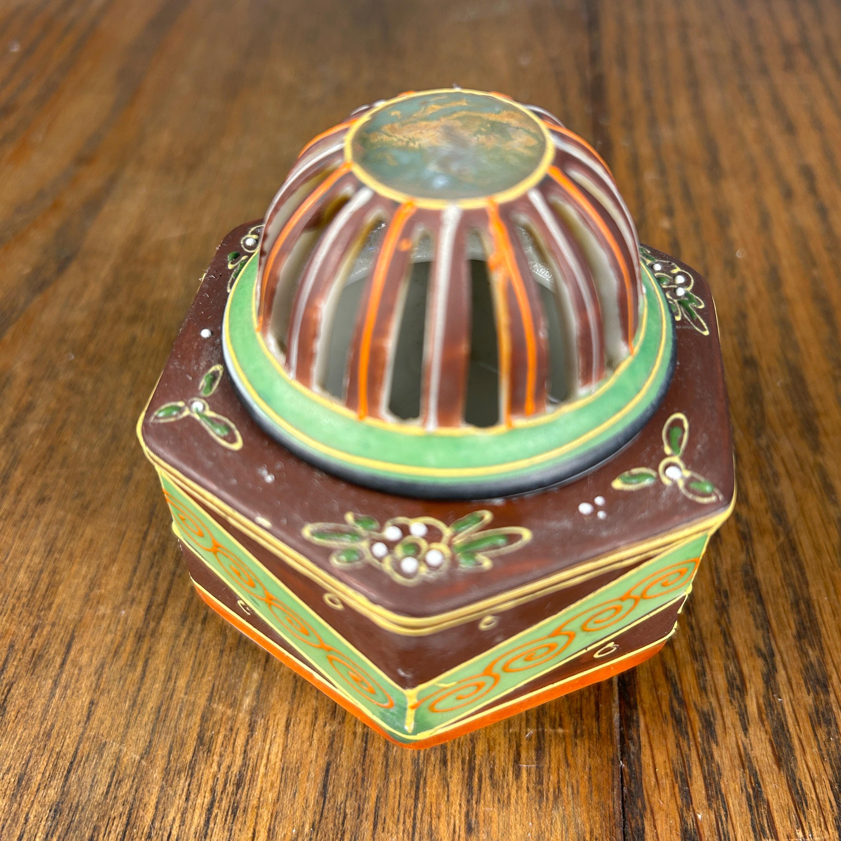 Hand-painted in rich brown, red, and green tones with gold accents, this piece also features traditional moriage detailing (raised slip decoration) that adds texture and depth. The reticulated dome lid allows incense smoke to gently escape, creating a soft, atmospheric effect when in use.