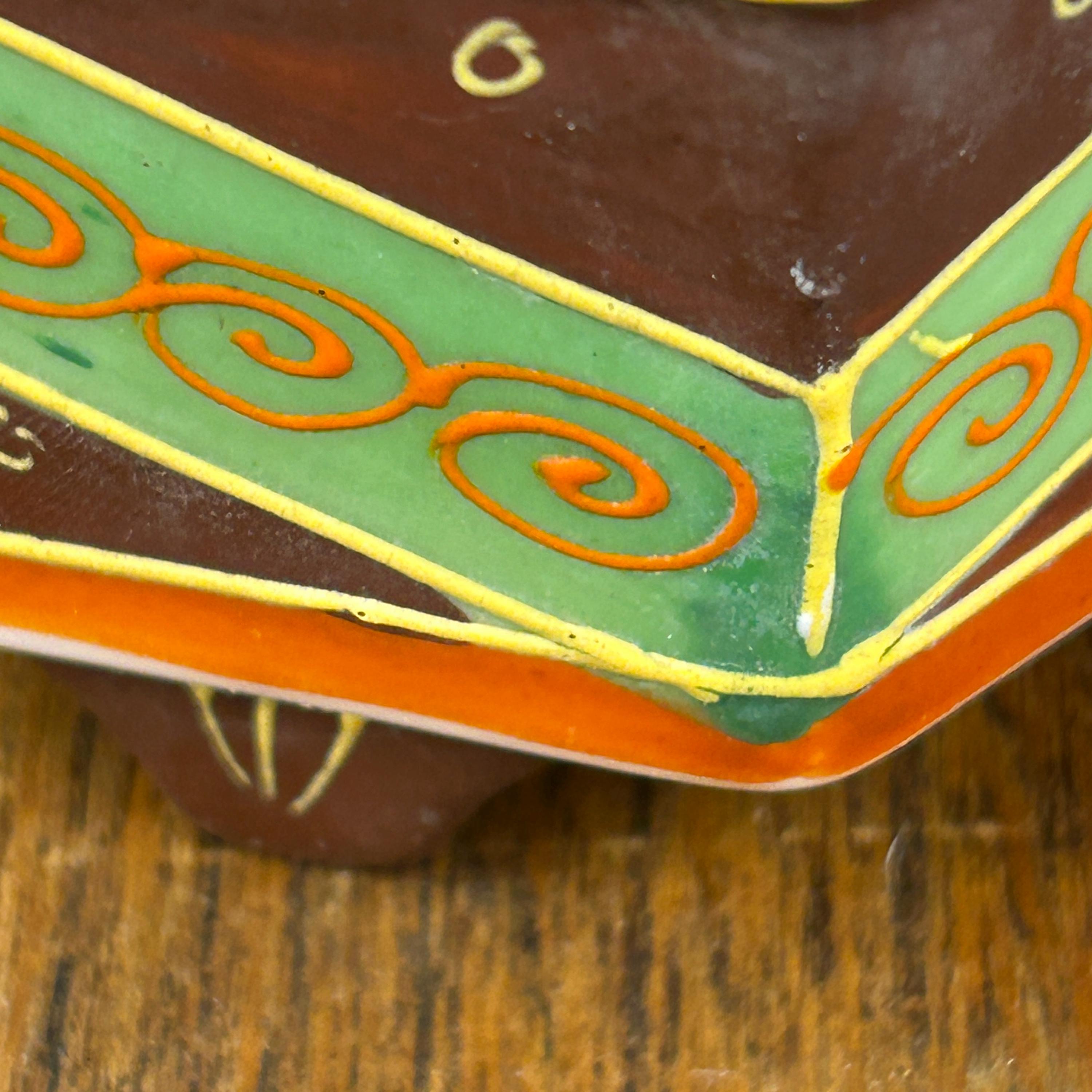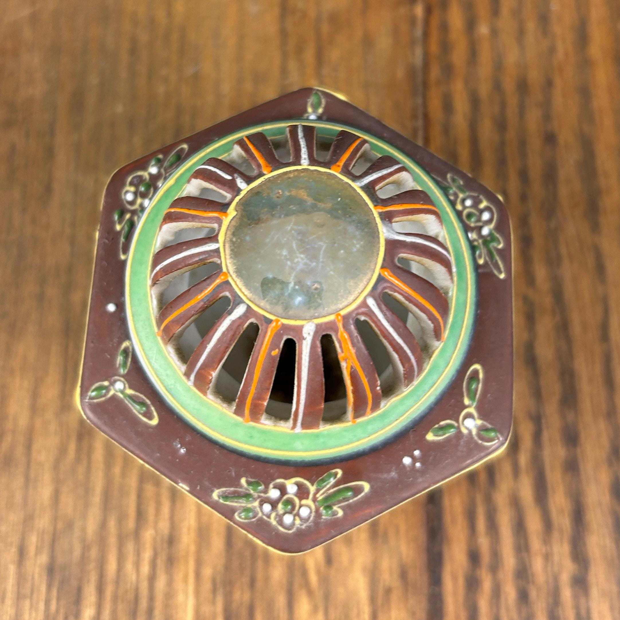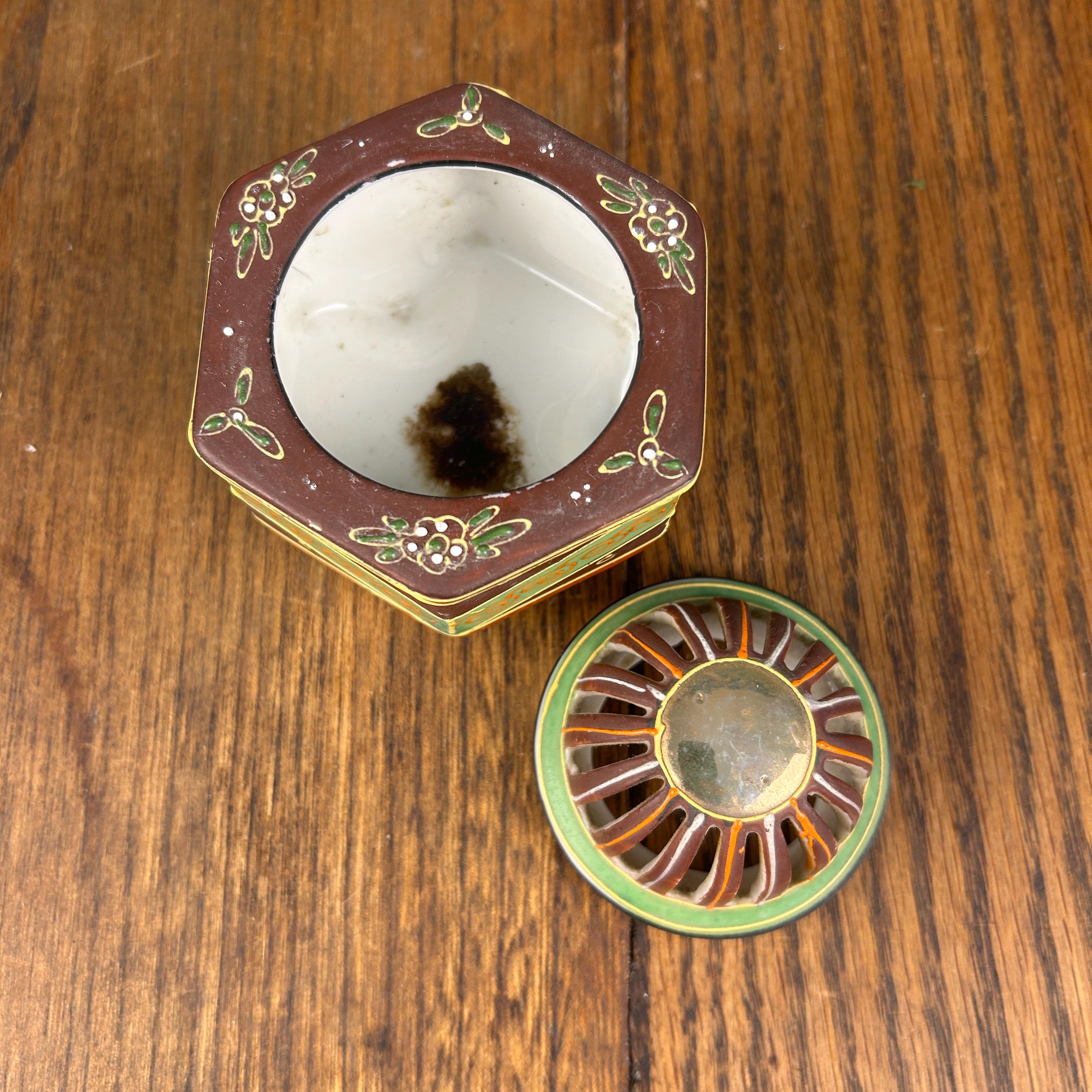 Hand-painted in rich brown, red, and green tones with gold accents, this piece also features traditional moriage detailing (raised slip decoration) that adds texture and depth. The reticulated dome lid allows incense smoke to gently escape, creating a soft, atmospheric effect when in use.
