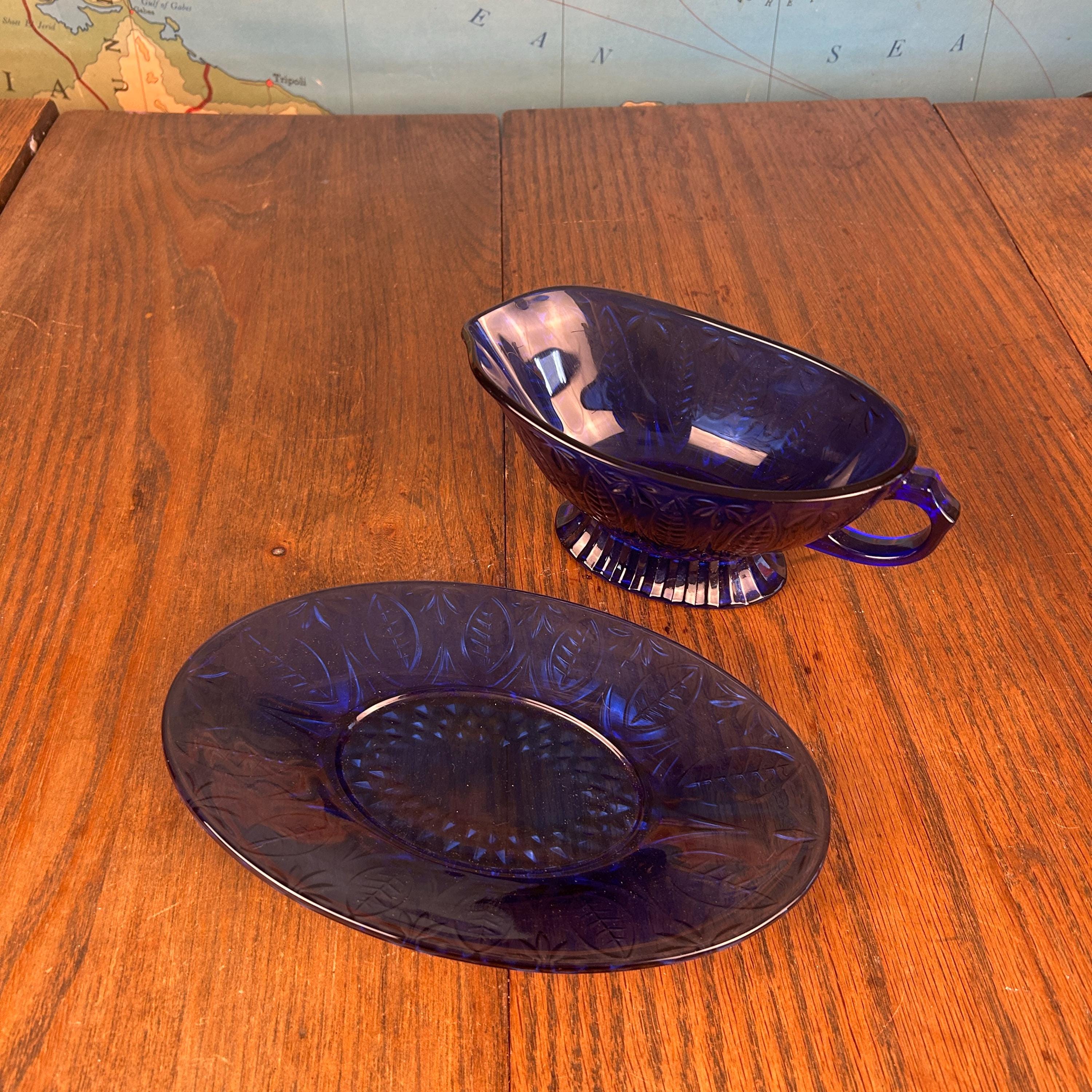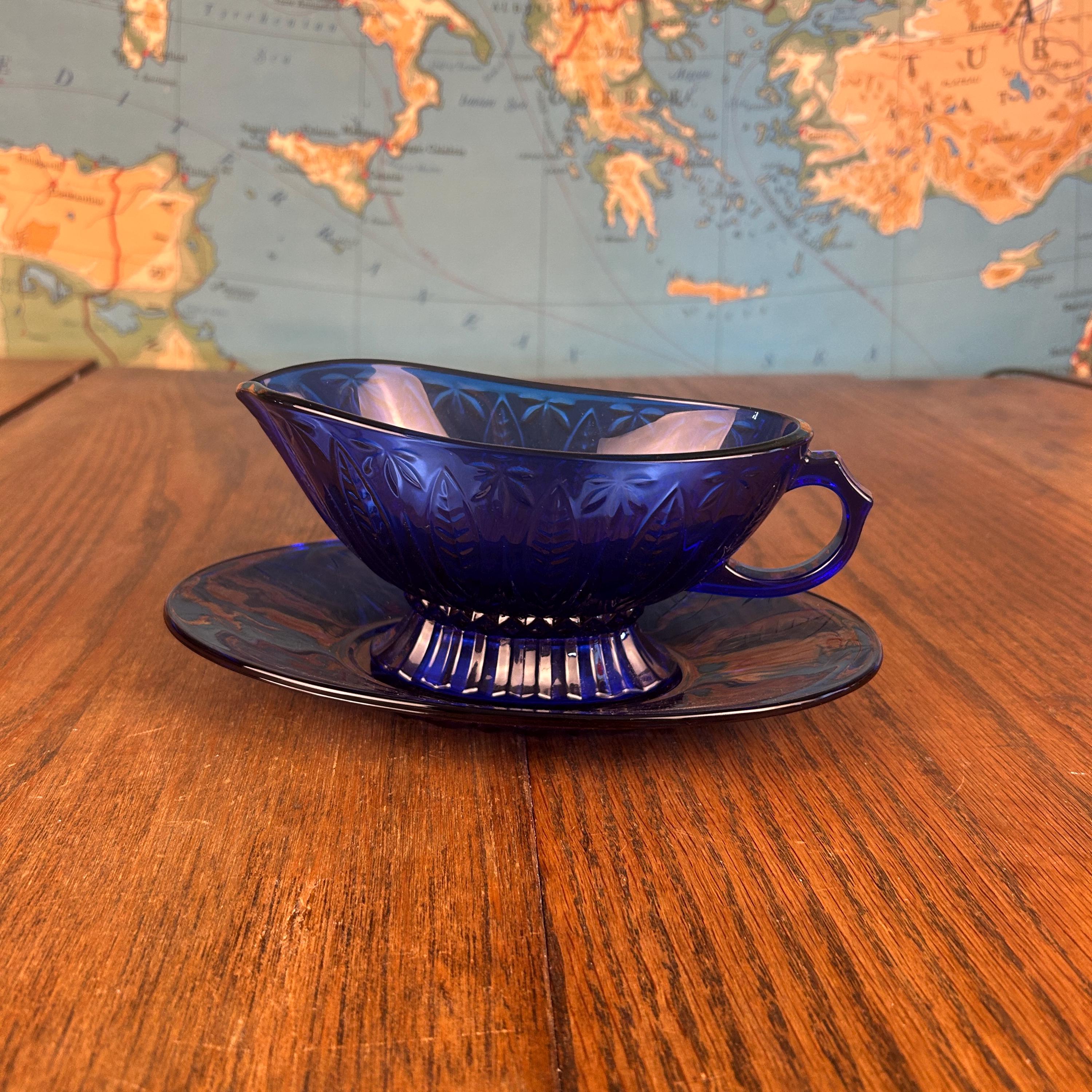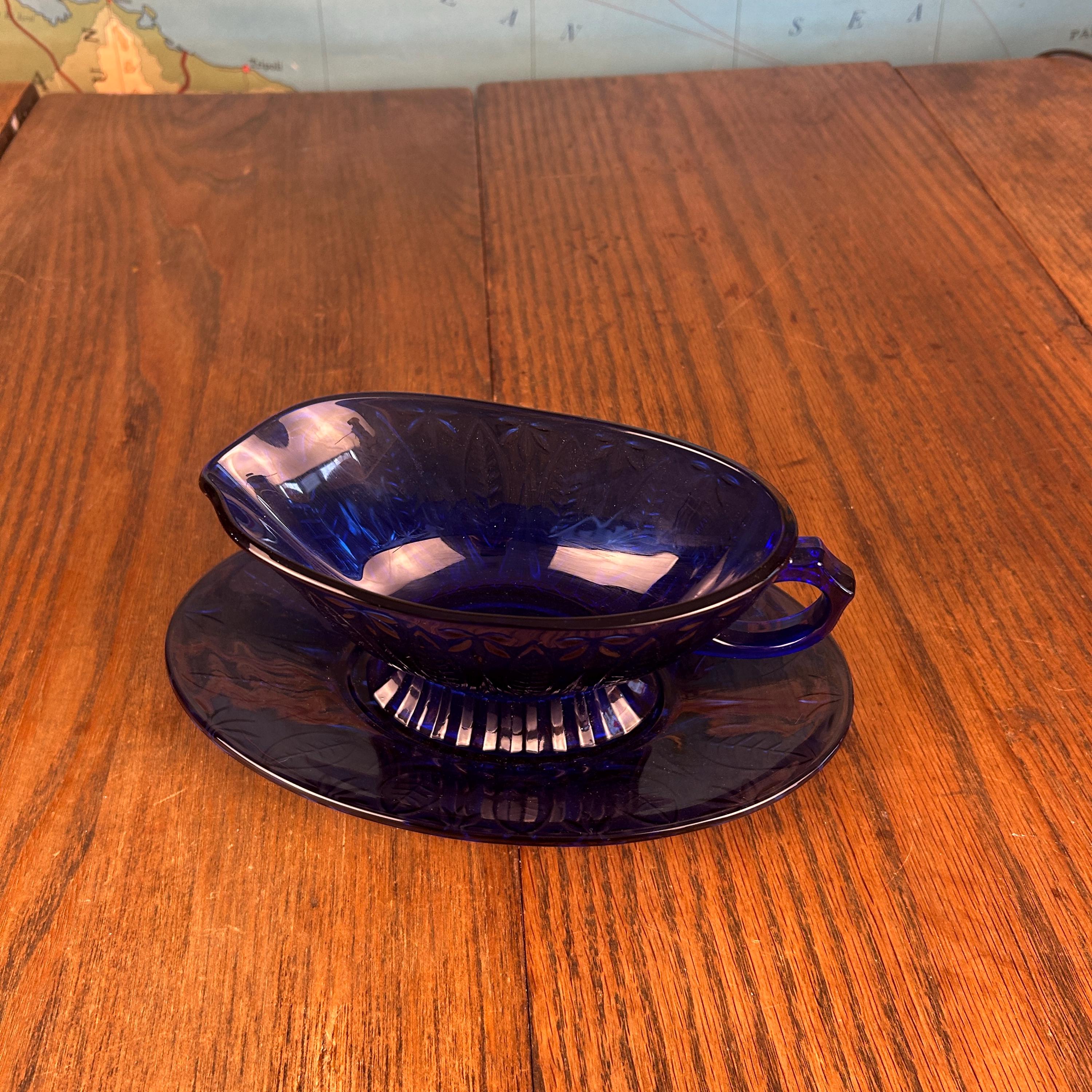The deep cobalt blue color makes this piece a standout addition to any table setting—perfect for serving gravy, sauces, or even displaying as part of a vintage glass collection.