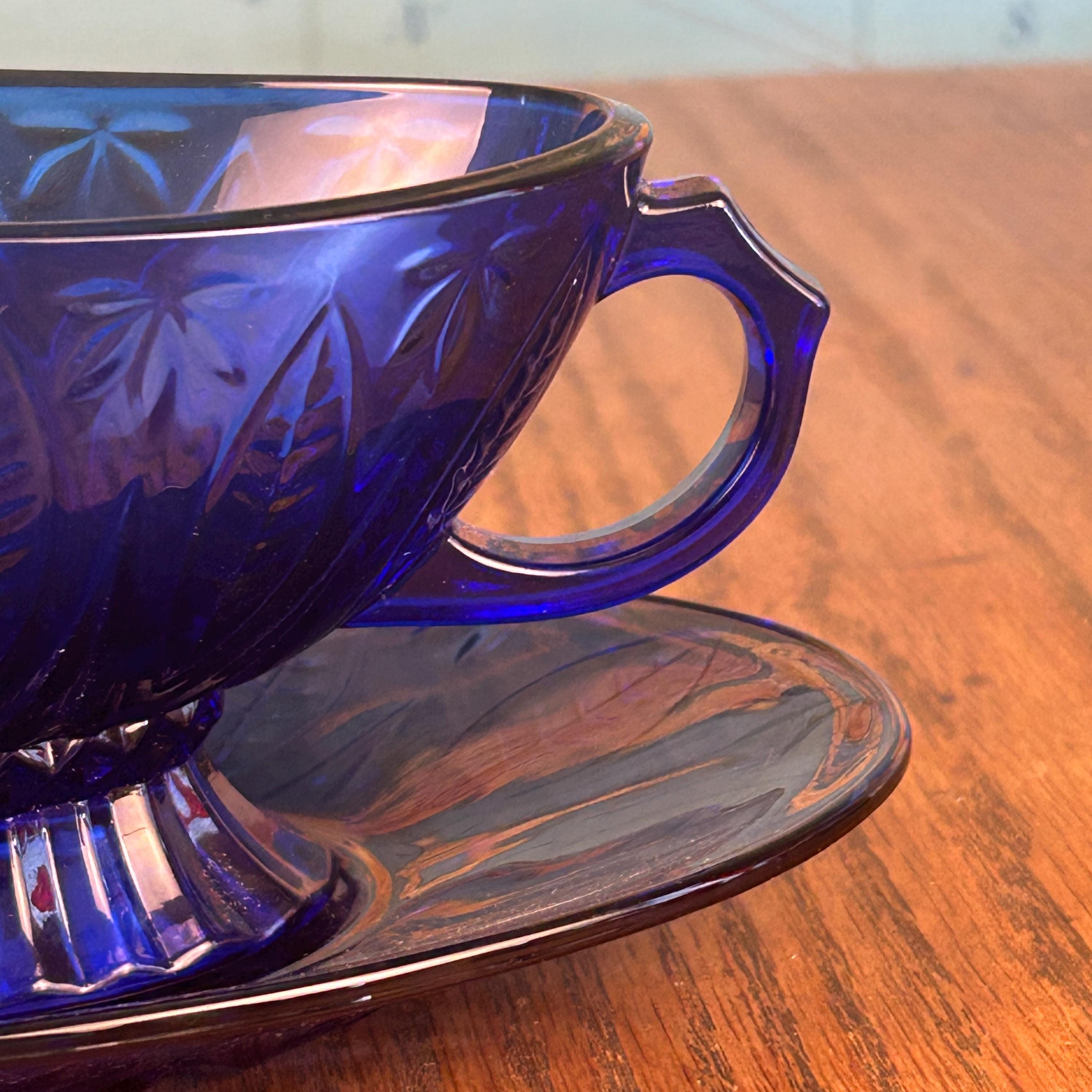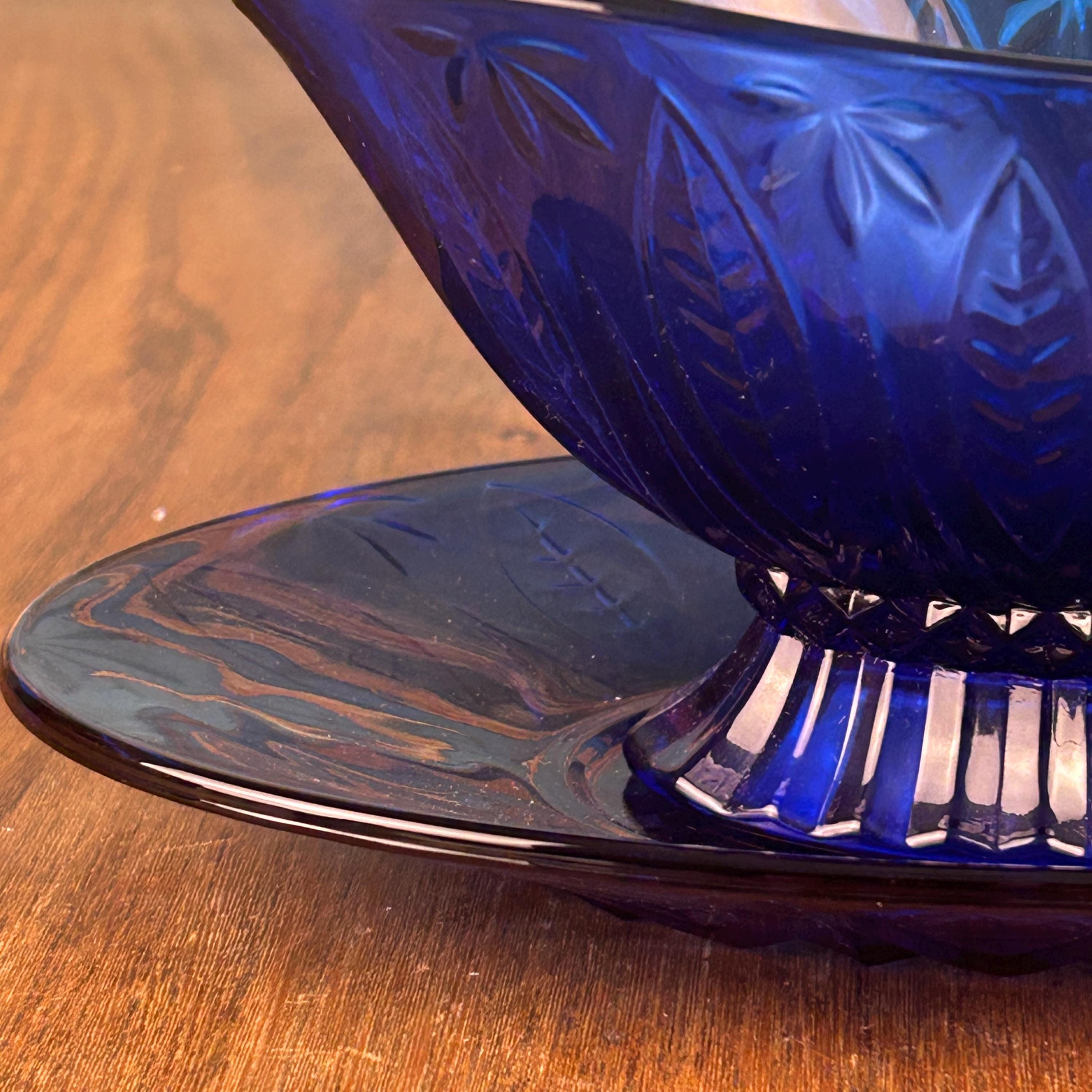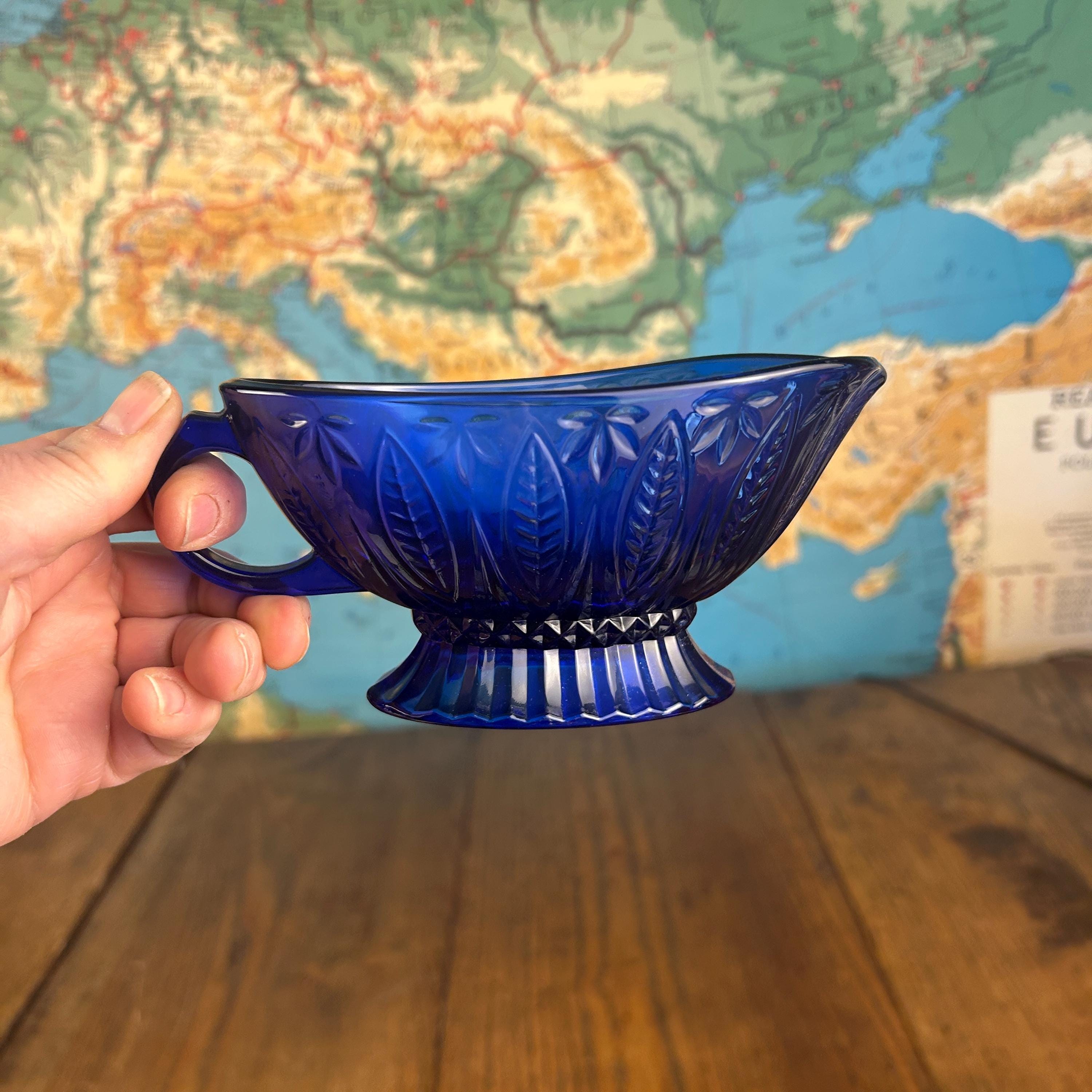 The deep cobalt blue color makes this piece a standout addition to any table setting—perfect for serving gravy, sauces, or even displaying as part of a vintage glass collection.