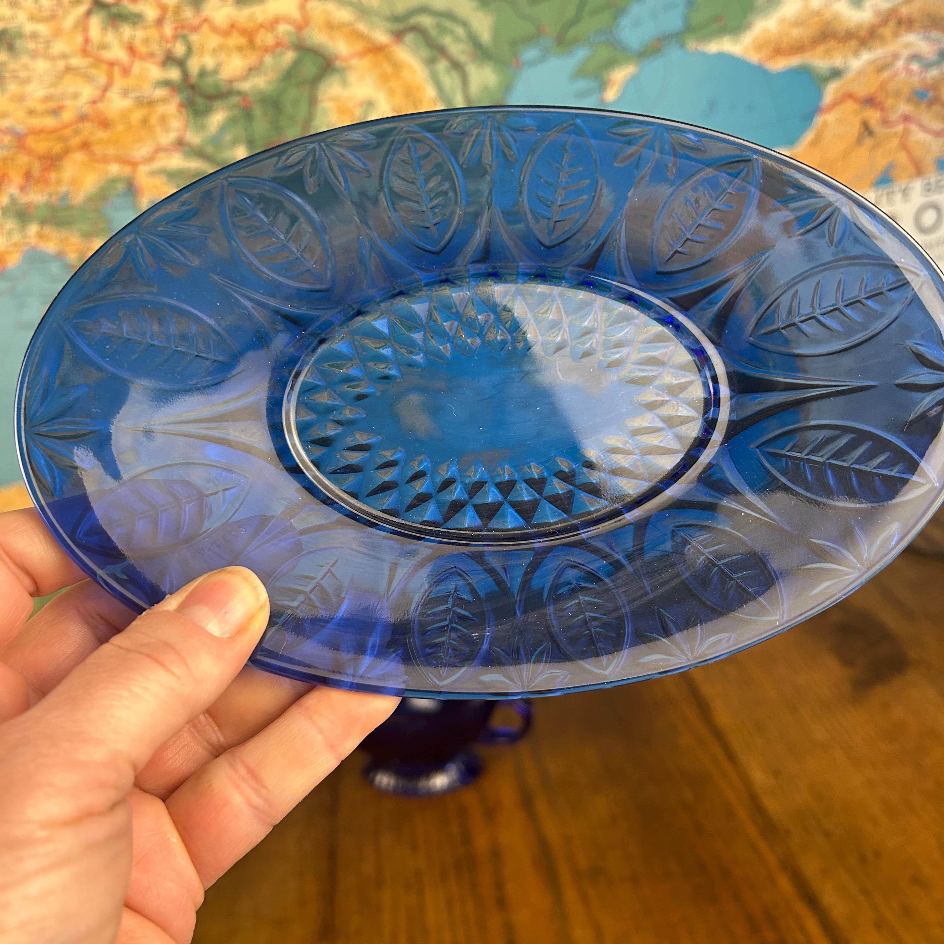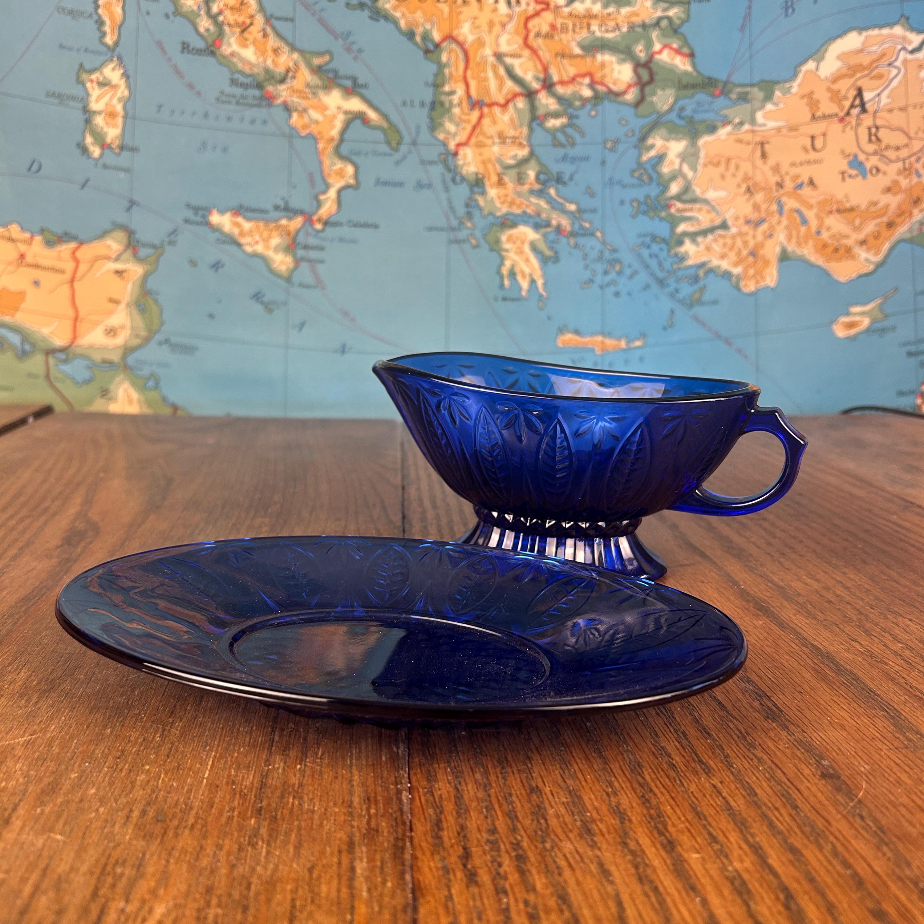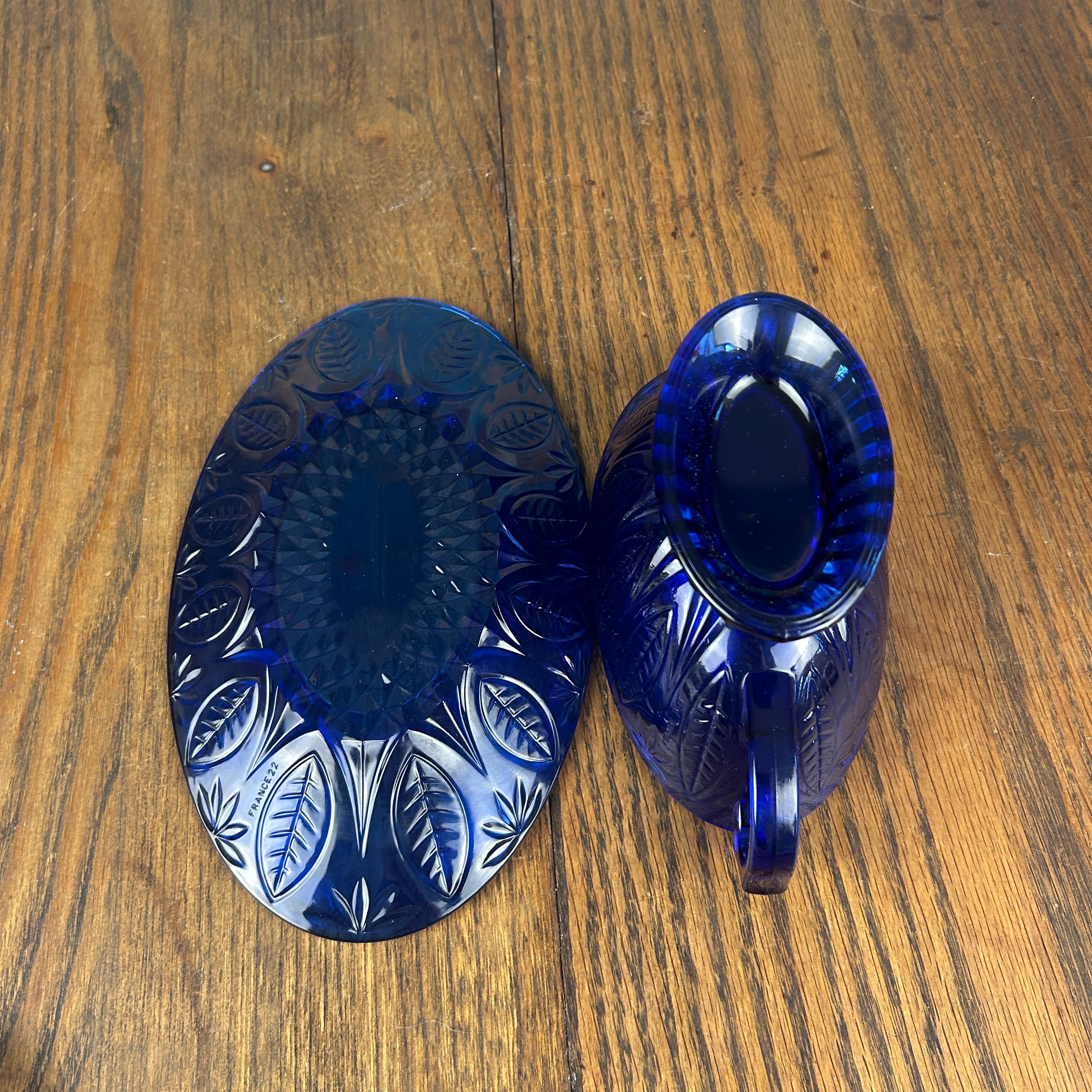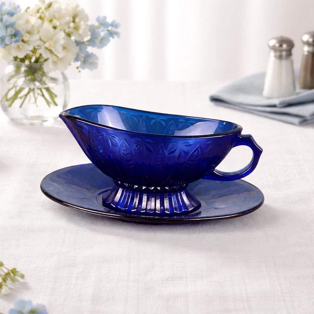Add a rich pop of color and timeless charm to your table with this beautiful vintage Avon Royal Sapphire gravy boat with matching underplate. Crafted in France from durable tempered glass, this elegant set features a classic embossed leaf pattern inspired by traditional pressed glass designs.